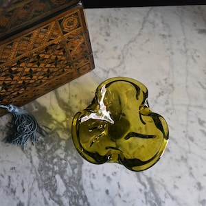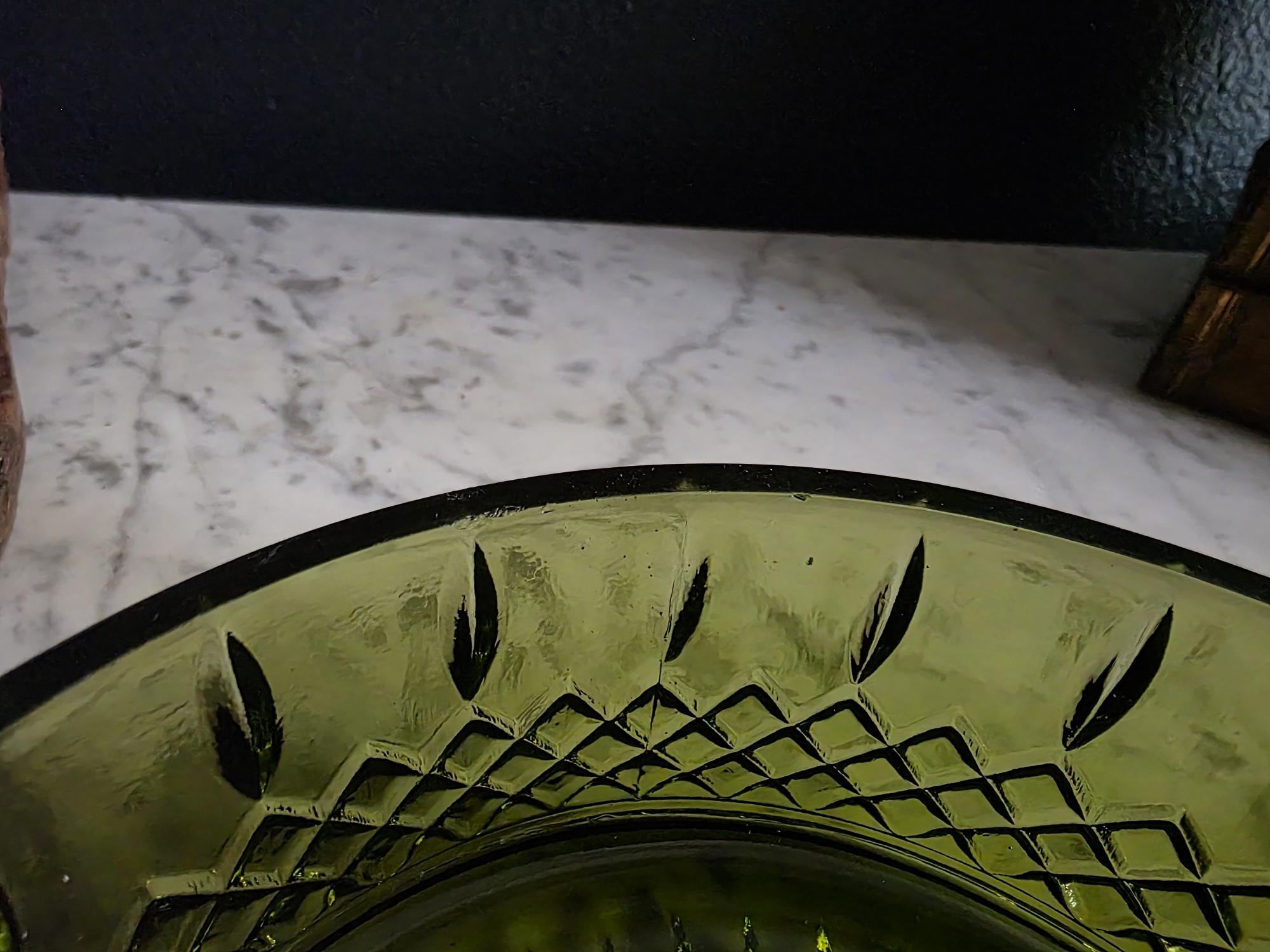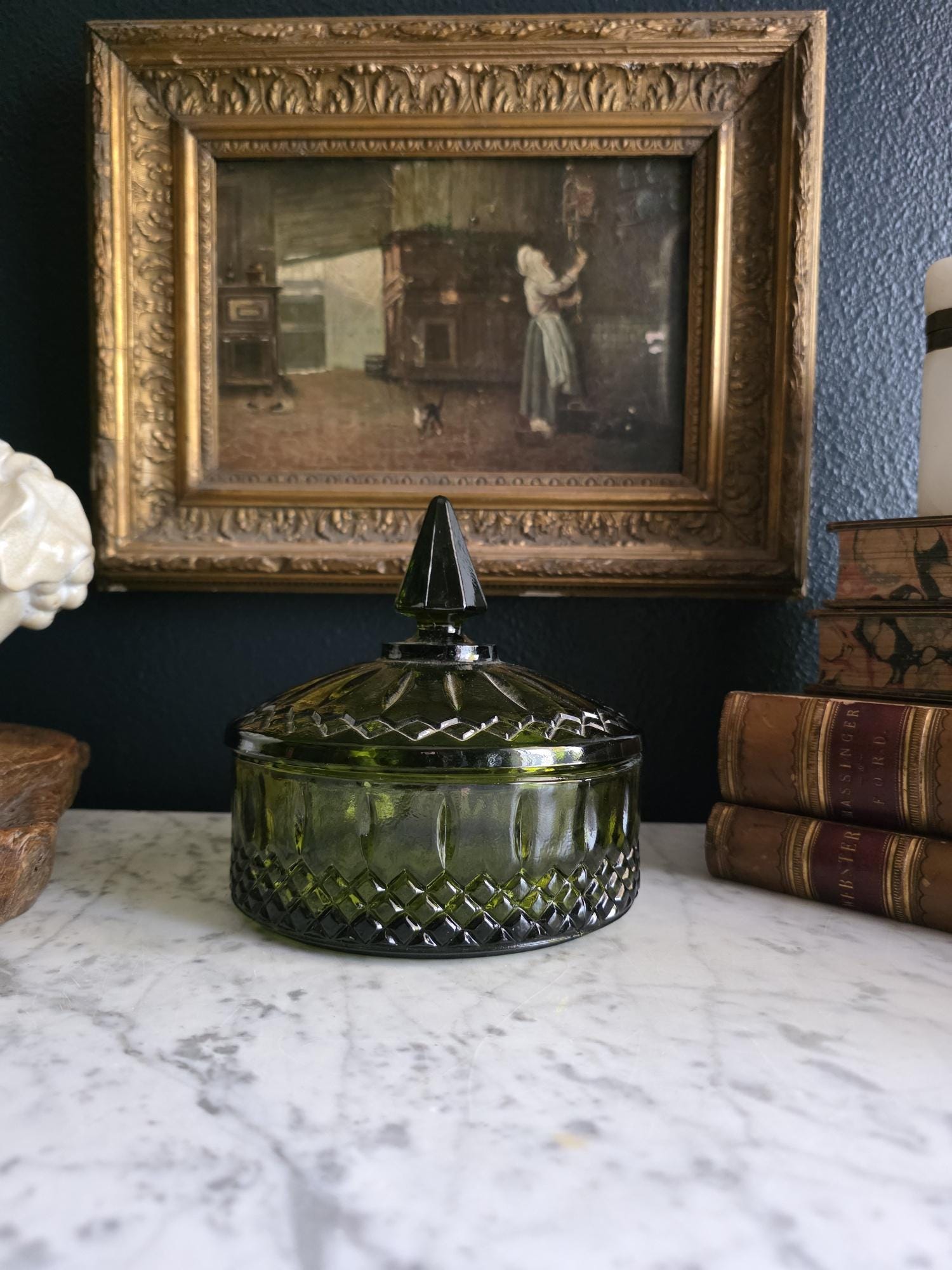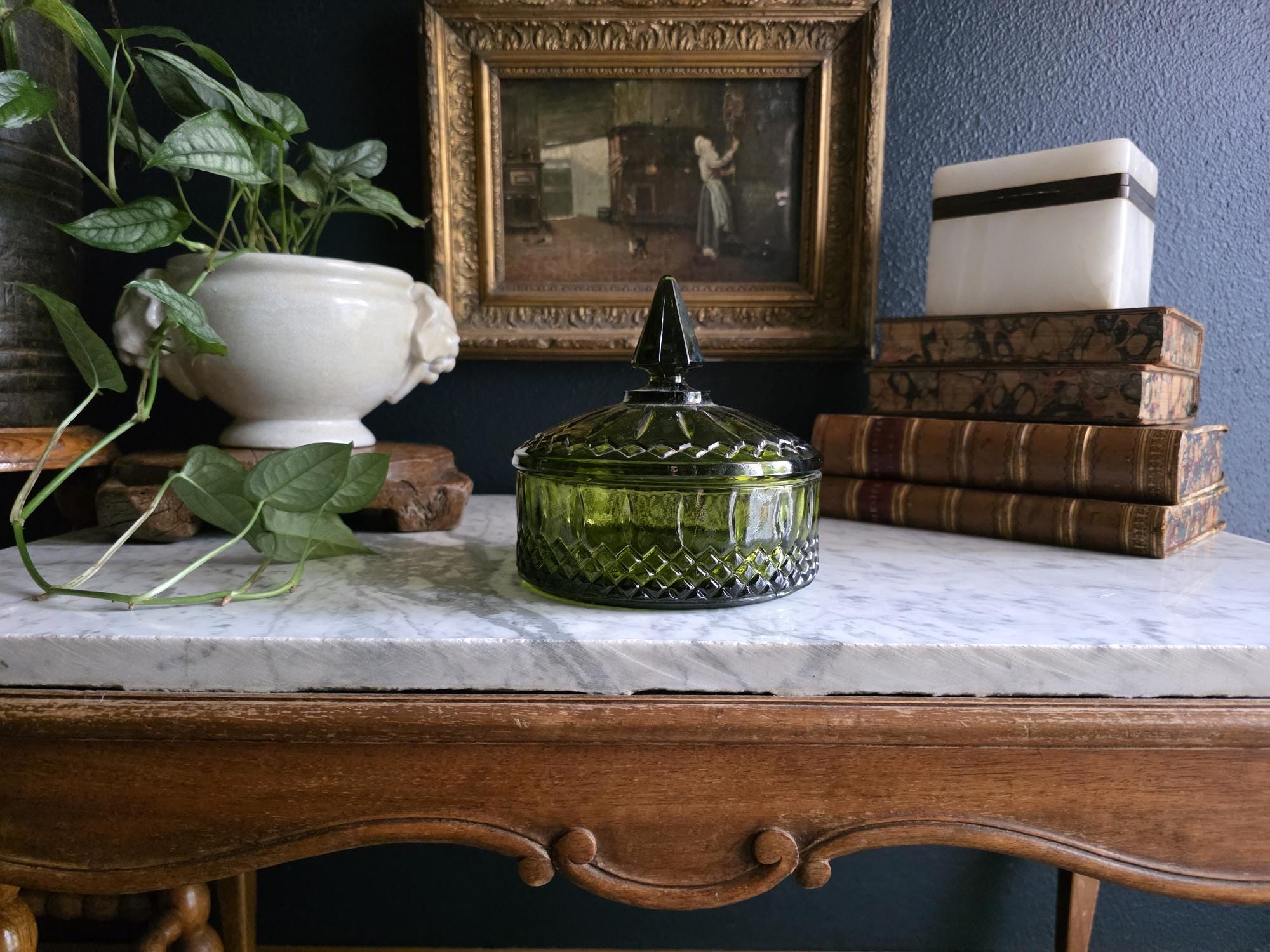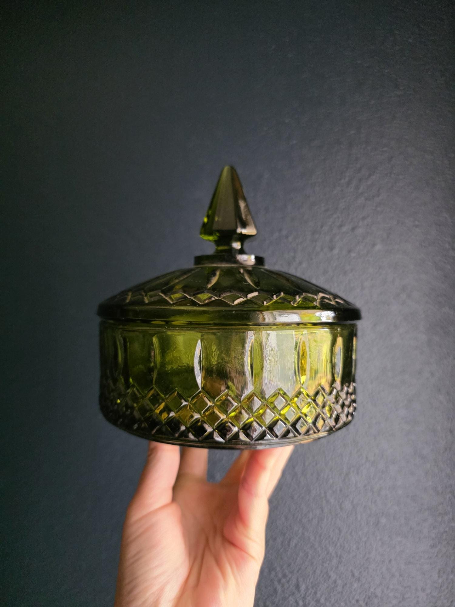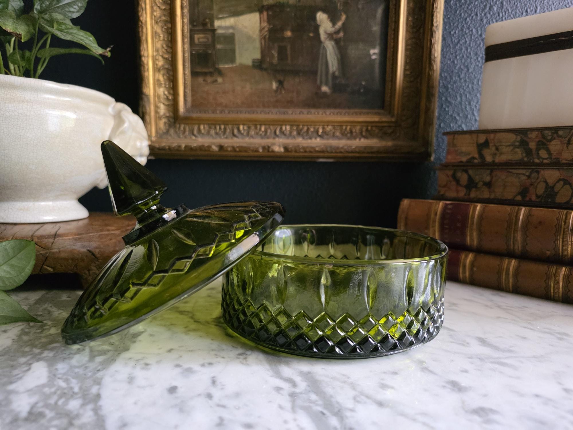 This eye-catching vintage covered dish is a perfect example of classic American pressed glass, likely produced by the Indiana Glass Company around the Mid-Century (c. 1950s–1970s). The vibrant, rich Emerald Green (sometimes called Avocado Green) hue makes this piece a striking decorative accent.