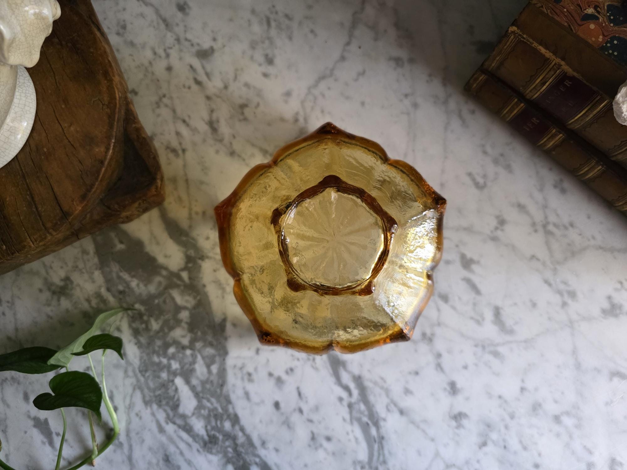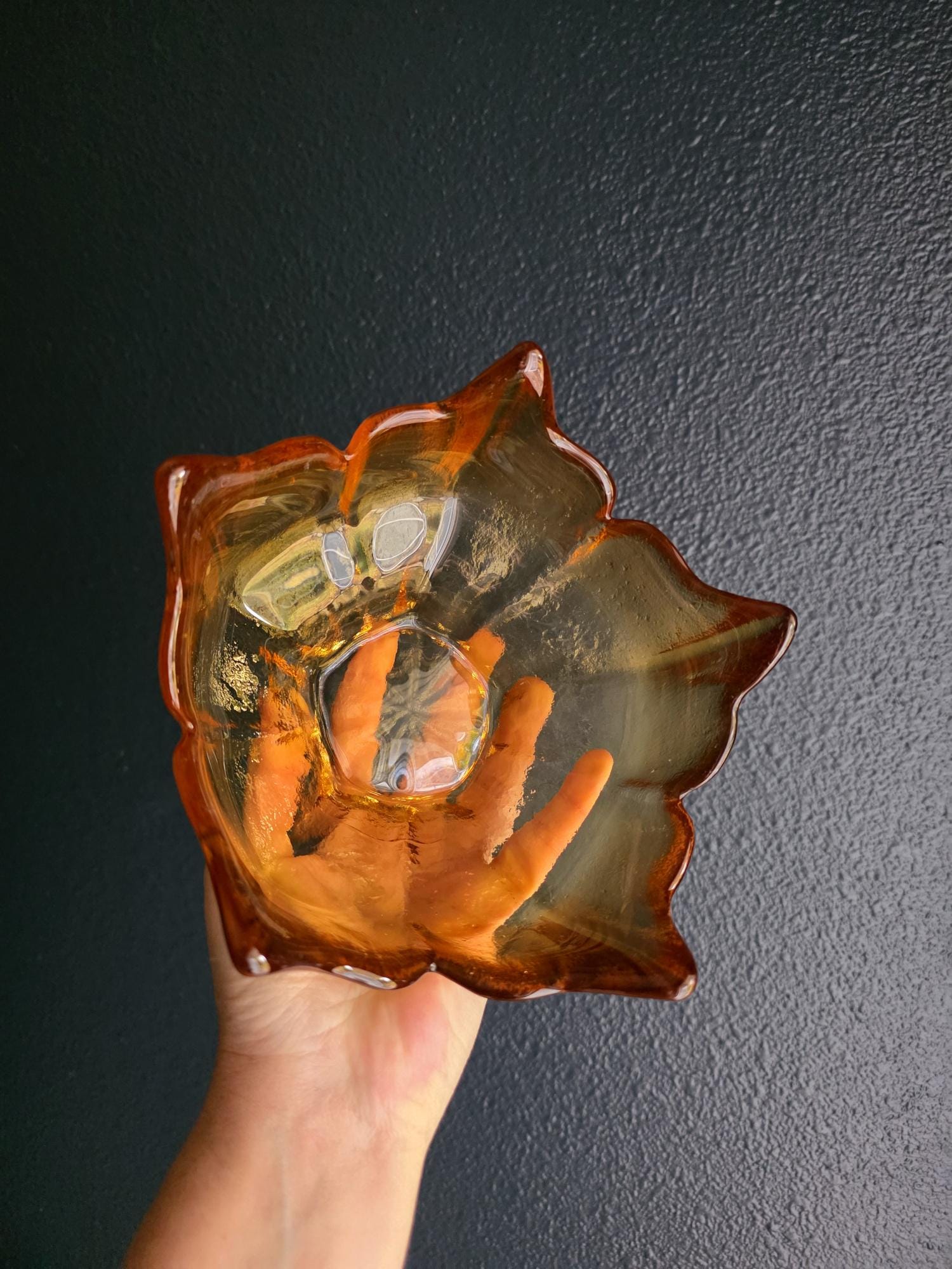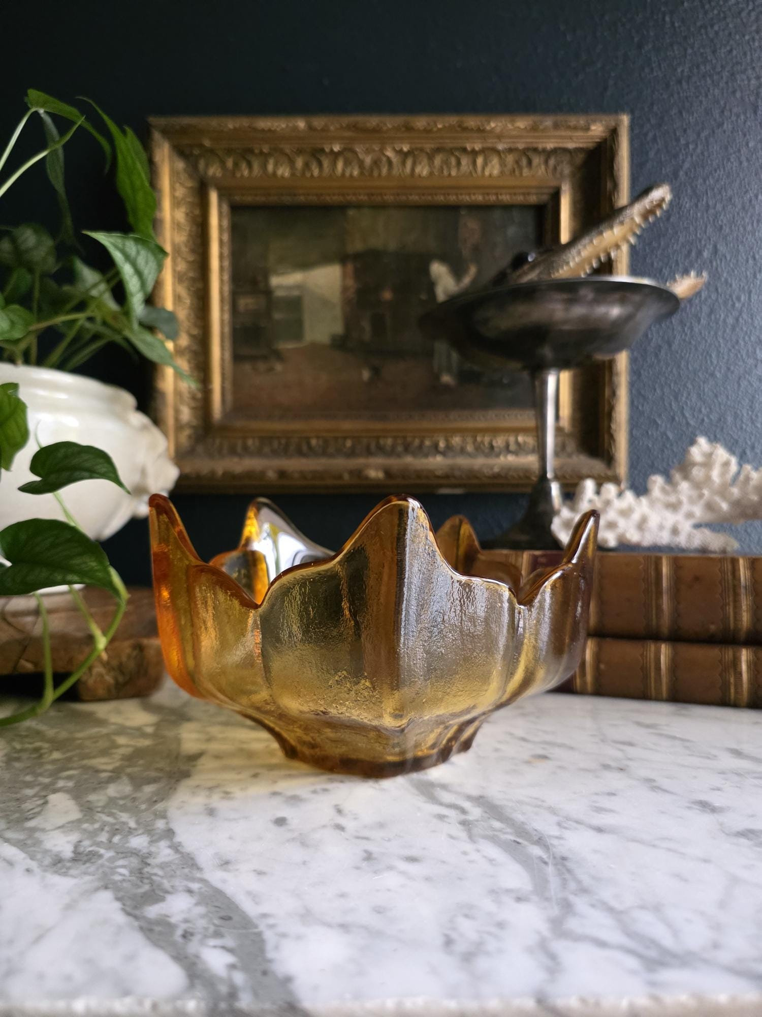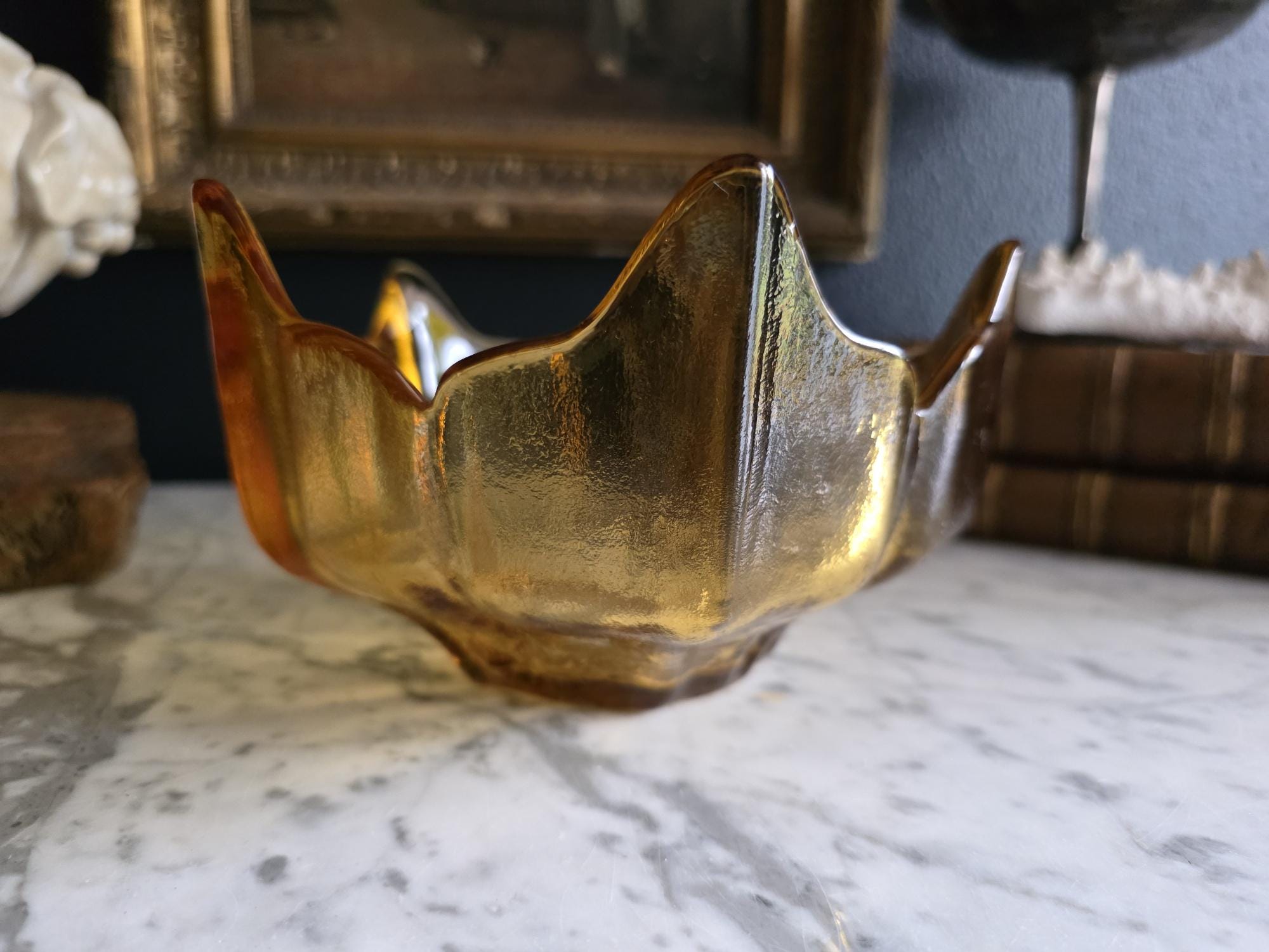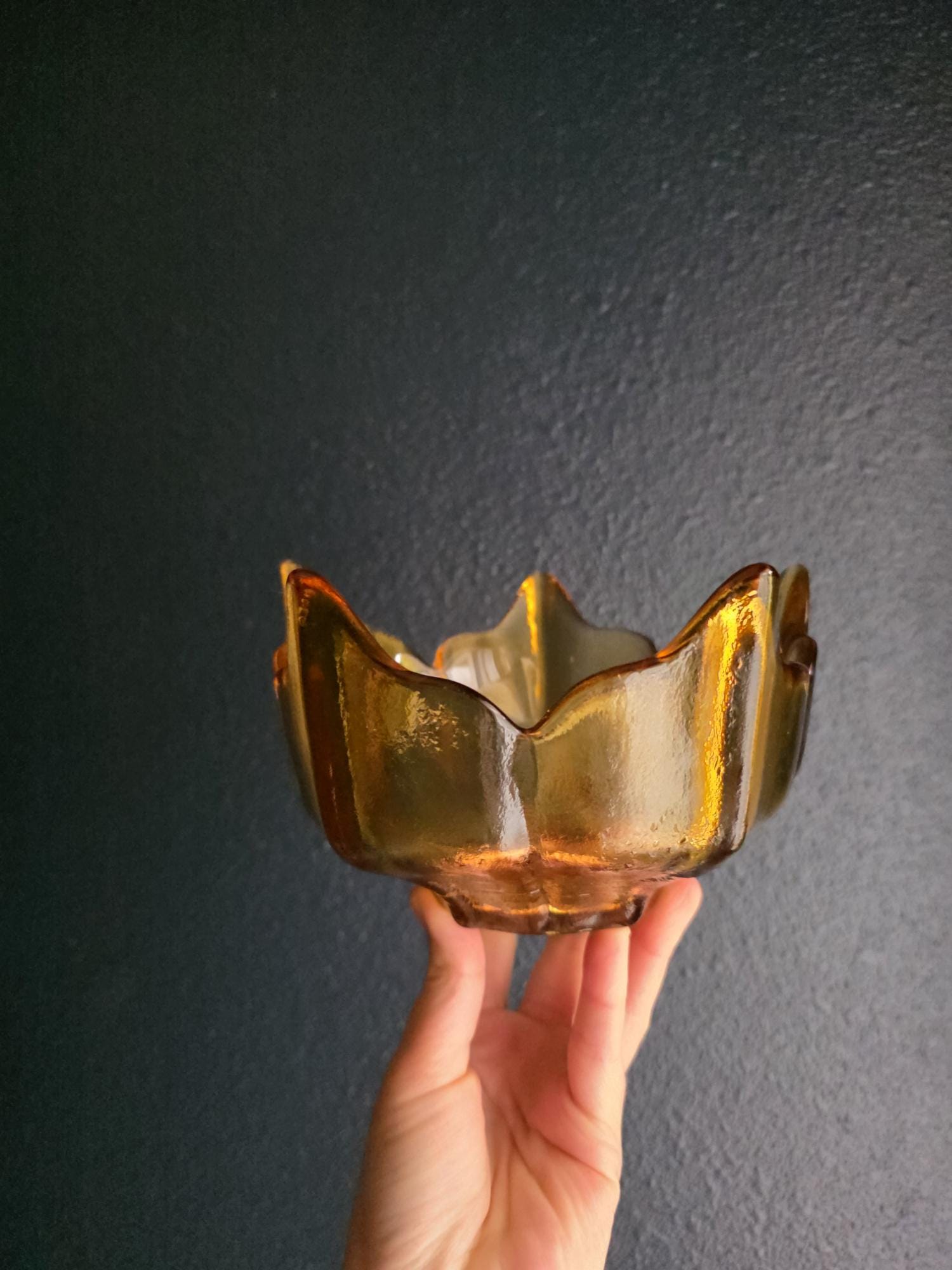 This stunning piece is an authentic vintage Viking Glass Lotus Bowl, part of the highly celebrated Epic Line designed in the Mid-Century Modern (MCM) era (circa 1960s). The piece is rendered in a warm, inviting Ombre Honey Amber color that glows beautifully in the light.