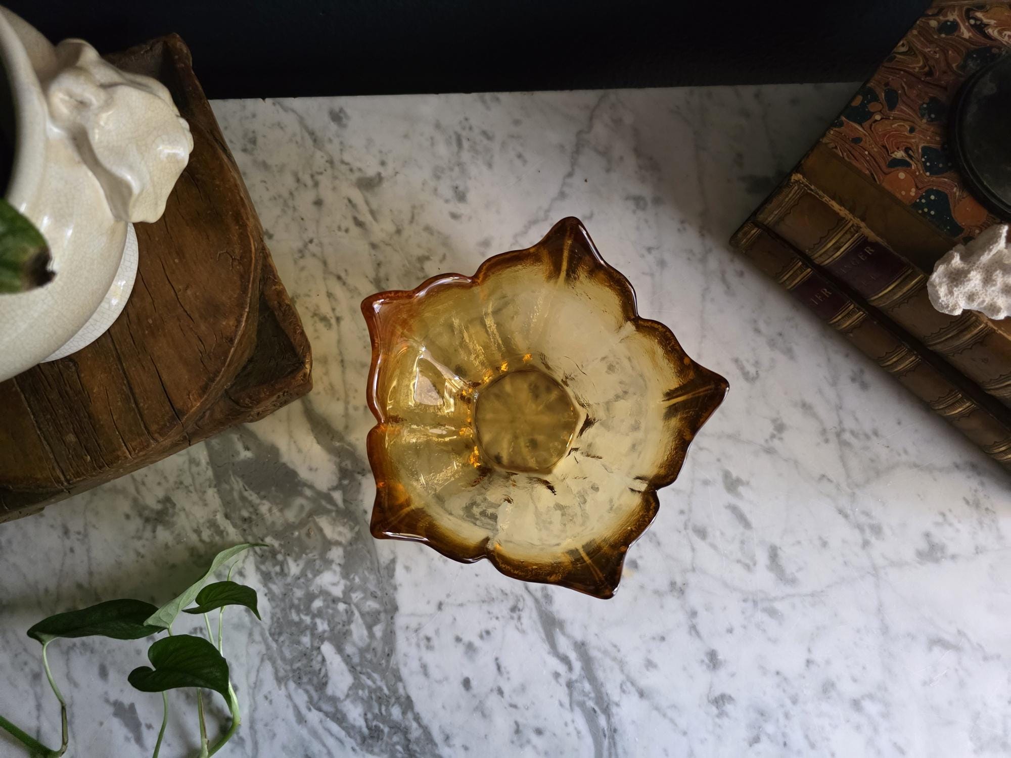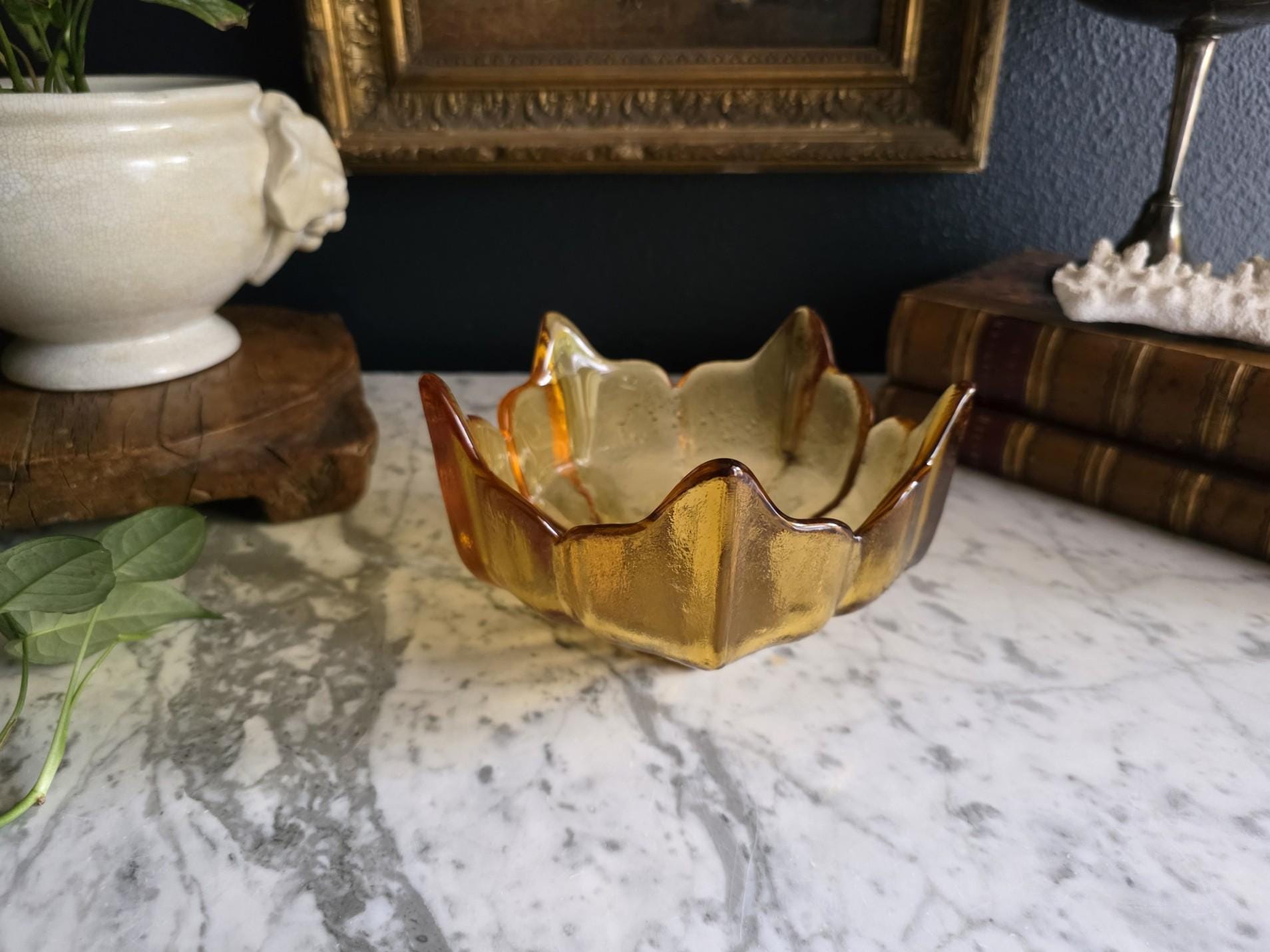 The bowl’s signature design features a dramatically scalloped rim, expertly sculpted to resemble the open petals of a Lotus Flower. Its heavy, high-quality pressed glass construction and organic shape make it a quintessential piece of American MCM art glass.