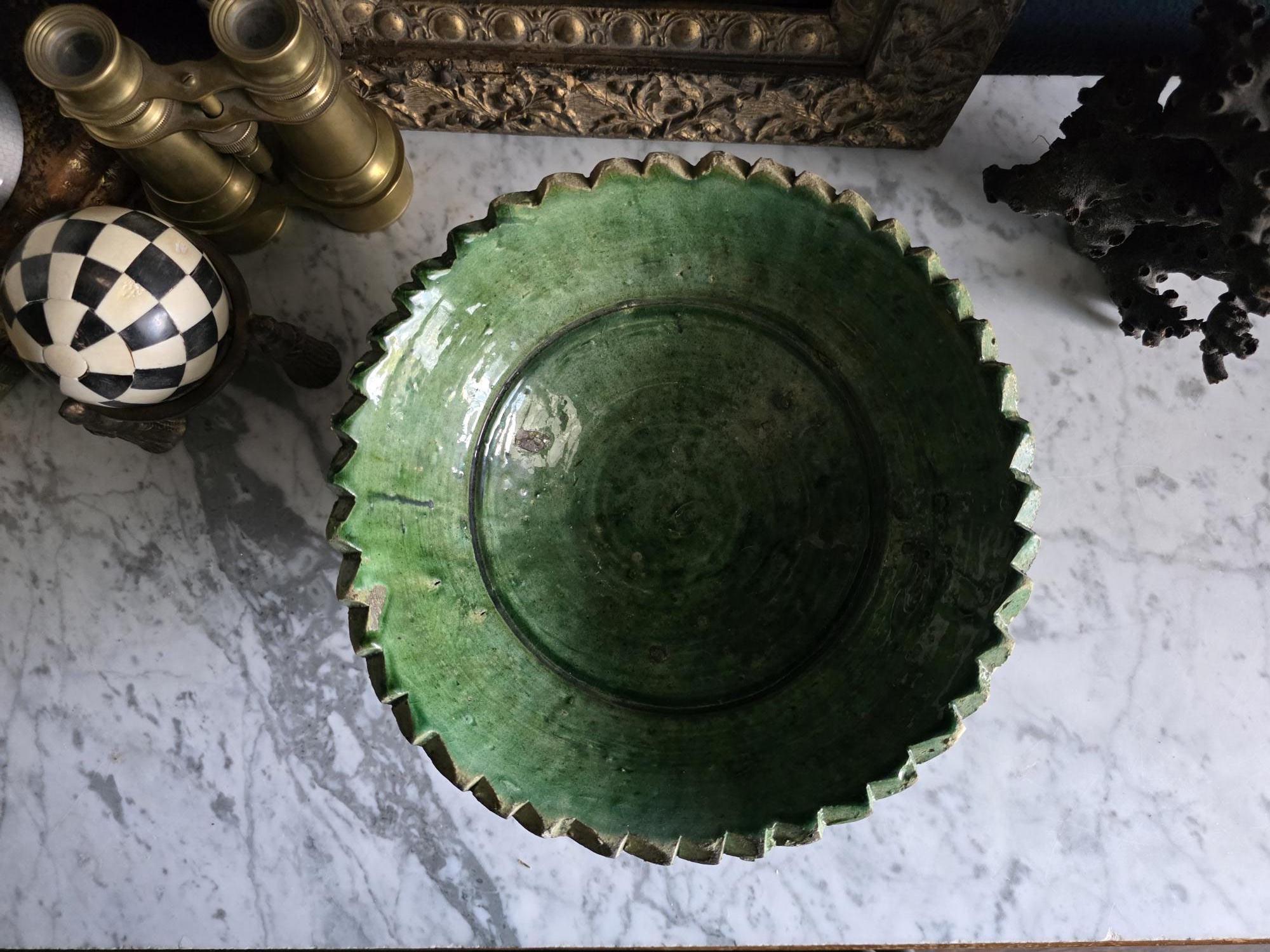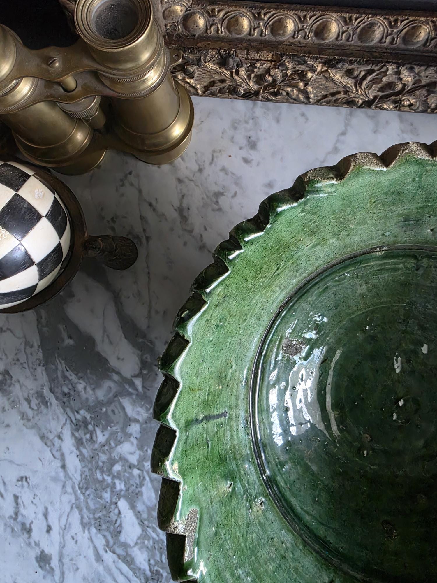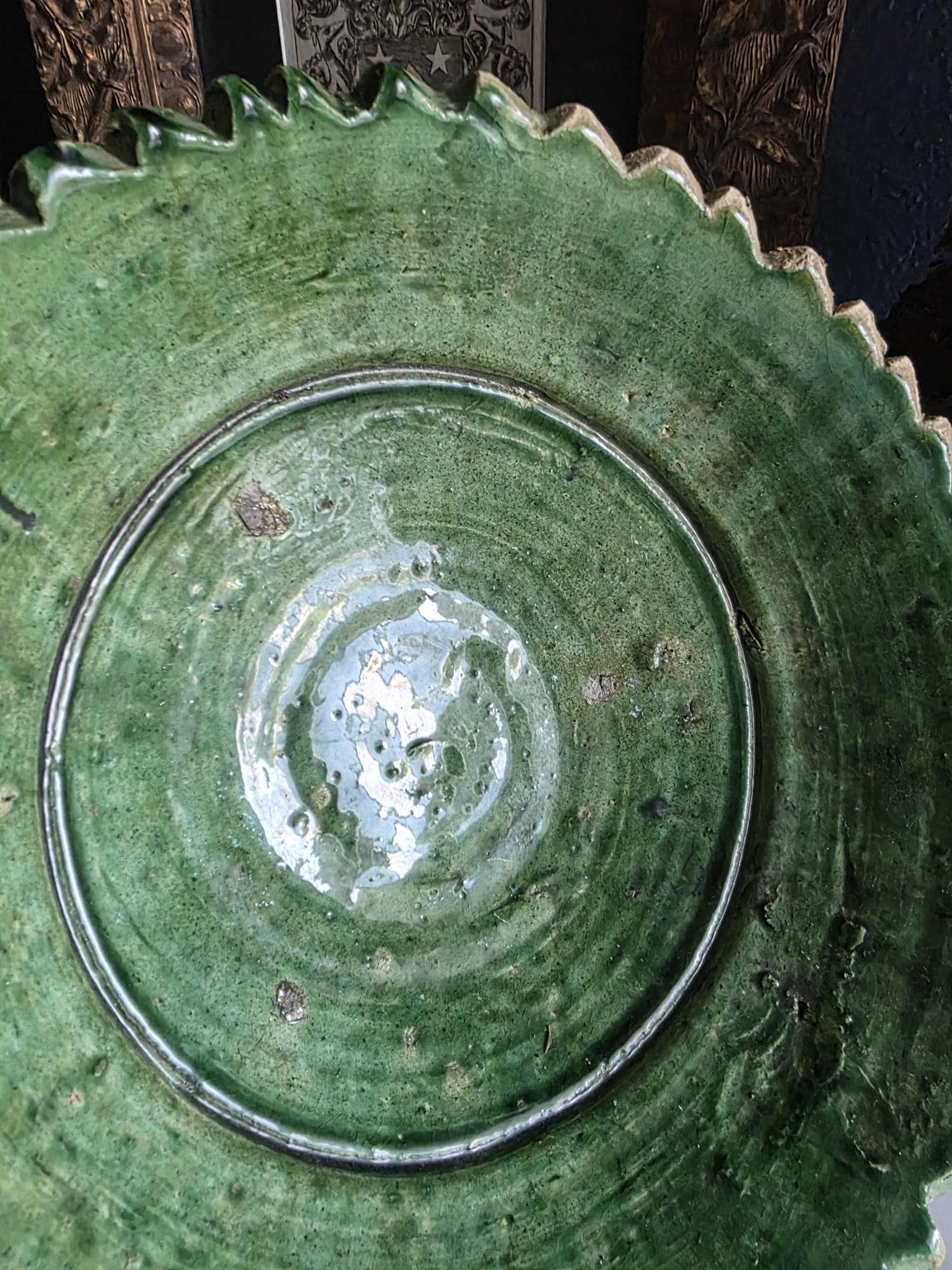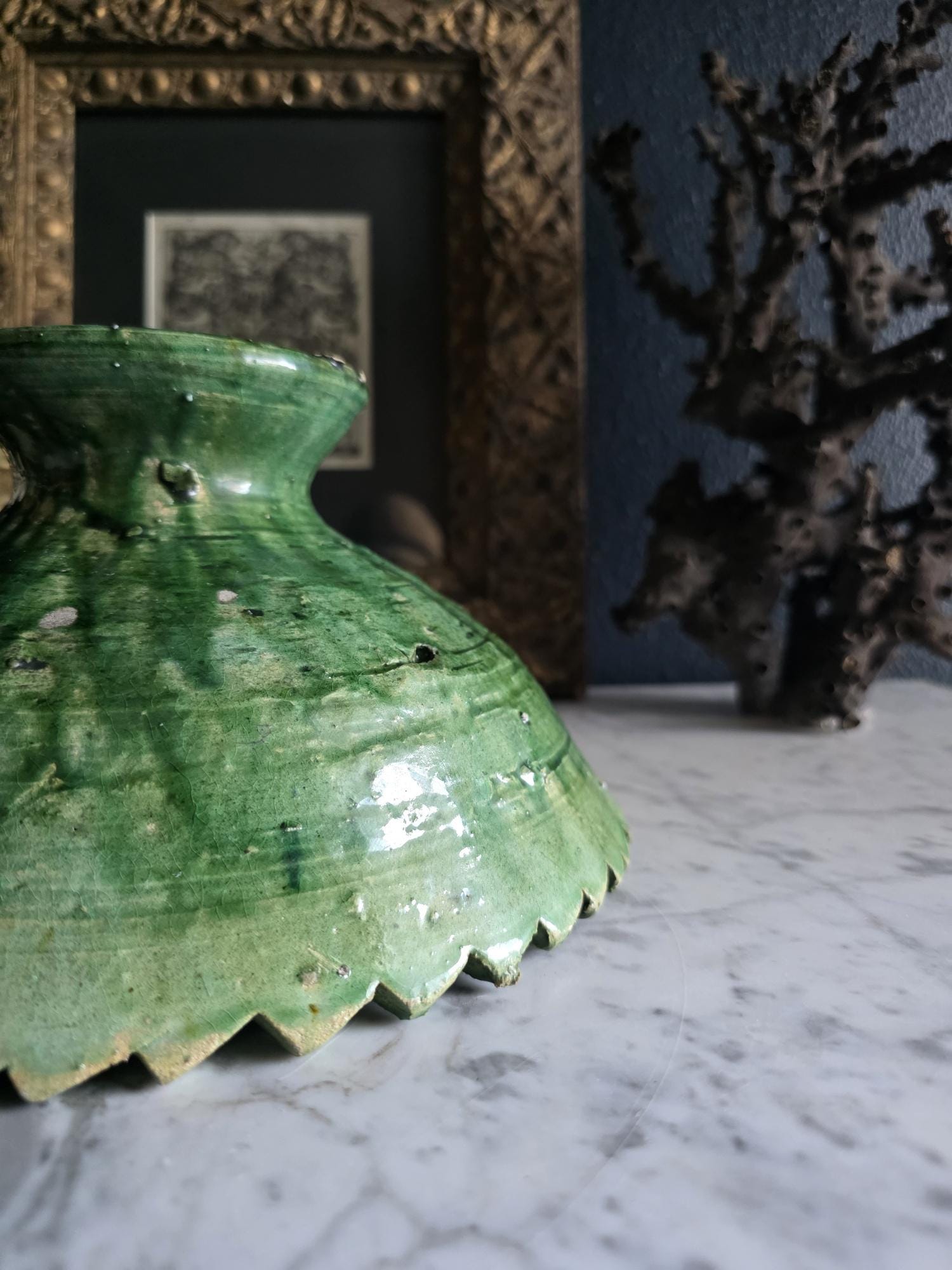 What sets this piece apart is its intentional, rustic beauty. The glossy, rich moss-green glaze is the signature of Tamegroute pottery, achieved through a unique mineral composition of local clay and copper oxide fired in traditional wood-fired kilns. The color shifts organically from deep emerald to olive, ensuring no two pieces are exactly alike. Further highlighting its handcrafted origin is the beautifully imperfect "sawtooth" or ruffled rim, a dramatic detail that emphasizes its wabi-sabi aesthetic. Due to the high-heat firing process, authentic Tamegroute pottery displays unique variations that are celebrated as part of its charm. These might include crazing, minor glaze runs, color spots, or small kiln marks on the base—these are the unmistakable signatures of a truly handcrafted piece.