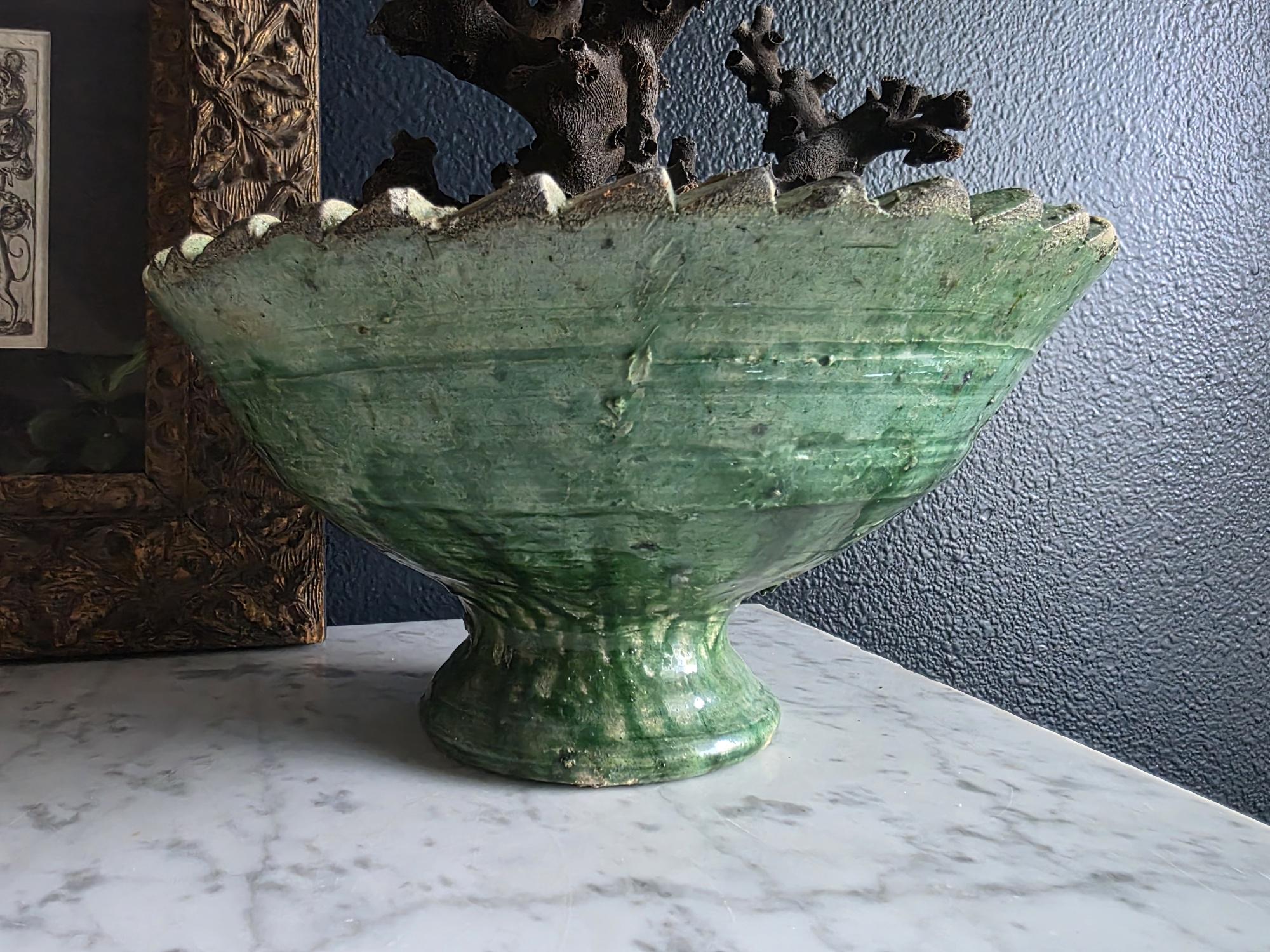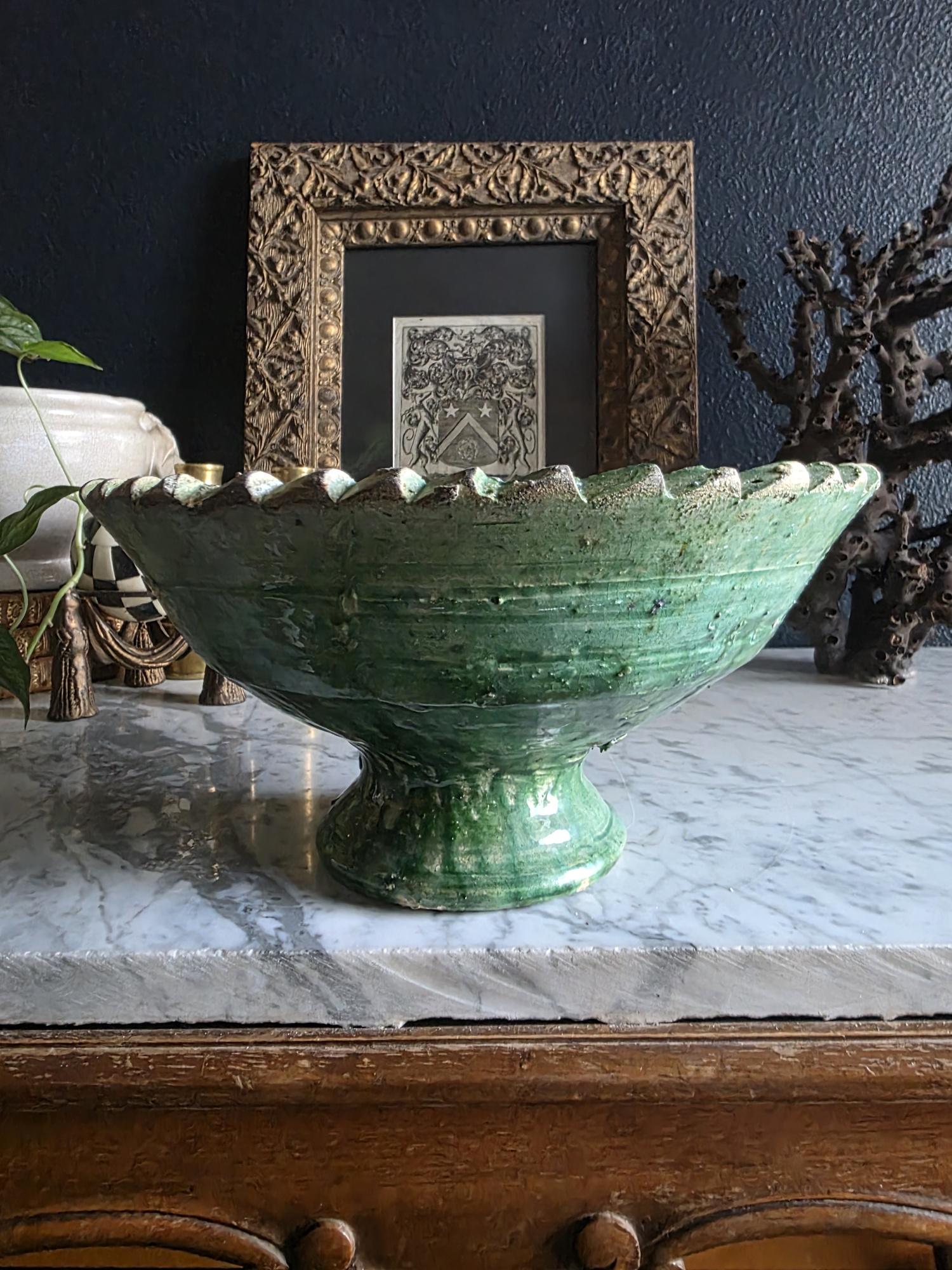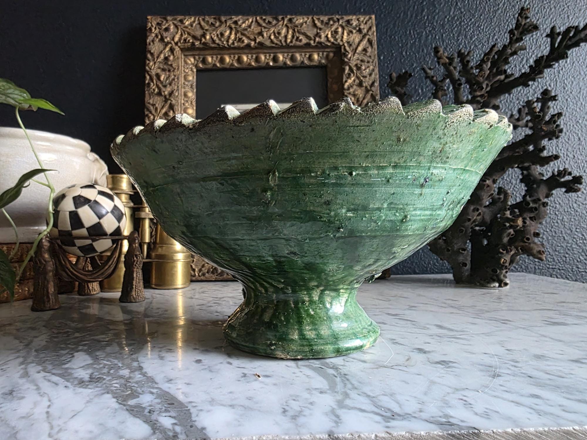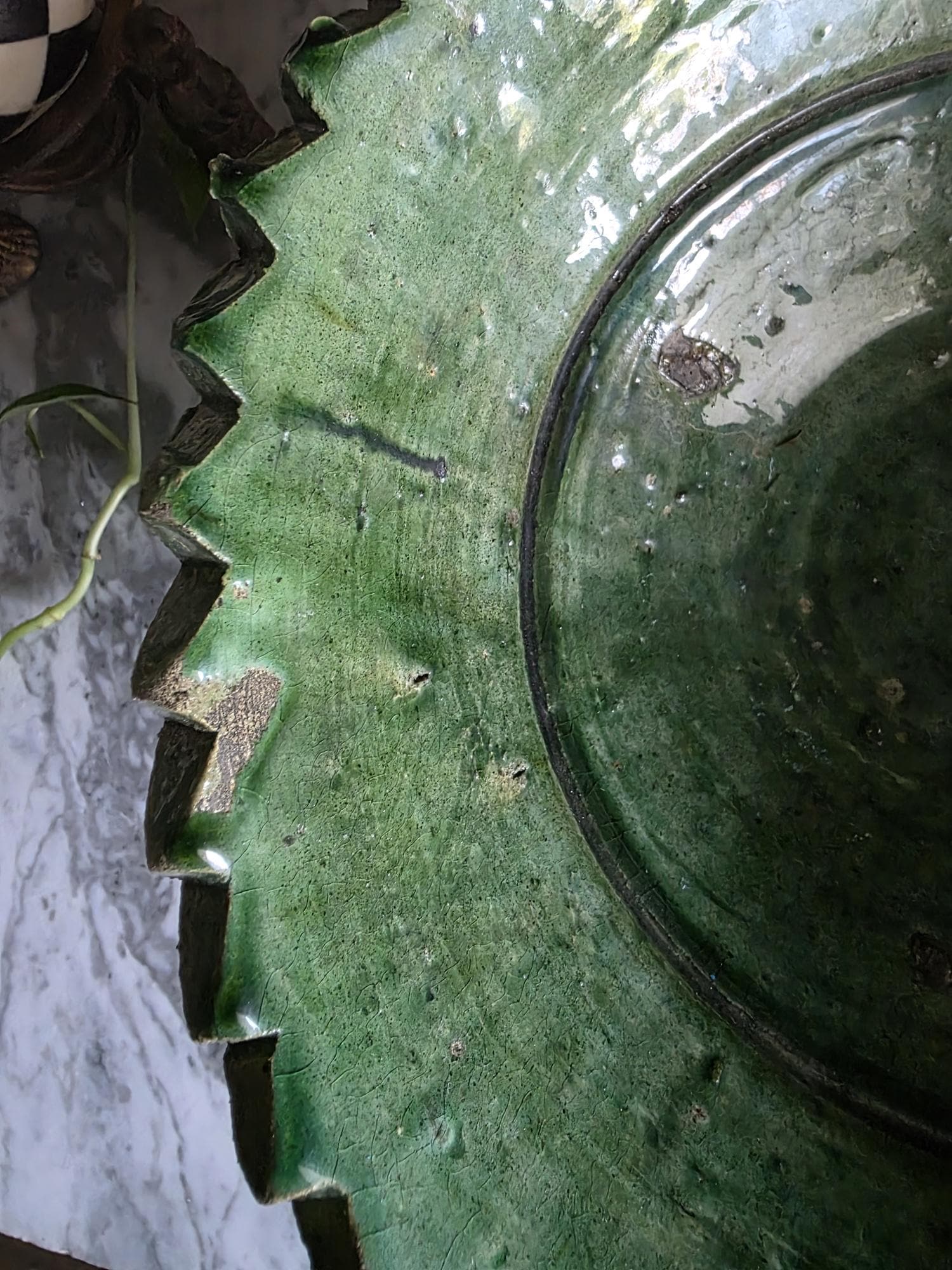 What sets this piece apart is its intentional, rustic beauty. The glossy, rich moss-green glaze is the signature of Tamegroute pottery, achieved through a unique mineral composition of local clay and copper oxide fired in traditional wood-fired kilns. The color shifts organically from deep emerald to olive, ensuring no two pieces are exactly alike. Further highlighting its handcrafted origin is the beautifully imperfect "sawtooth" or ruffled rim, a dramatic detail that emphasizes its wabi-sabi aesthetic. Due to the high-heat firing process, authentic Tamegroute pottery displays unique variations that are celebrated as part of its charm. These might include crazing, minor glaze runs, color spots, or small kiln marks on the base—these are the unmistakable signatures of a truly handcrafted piece.