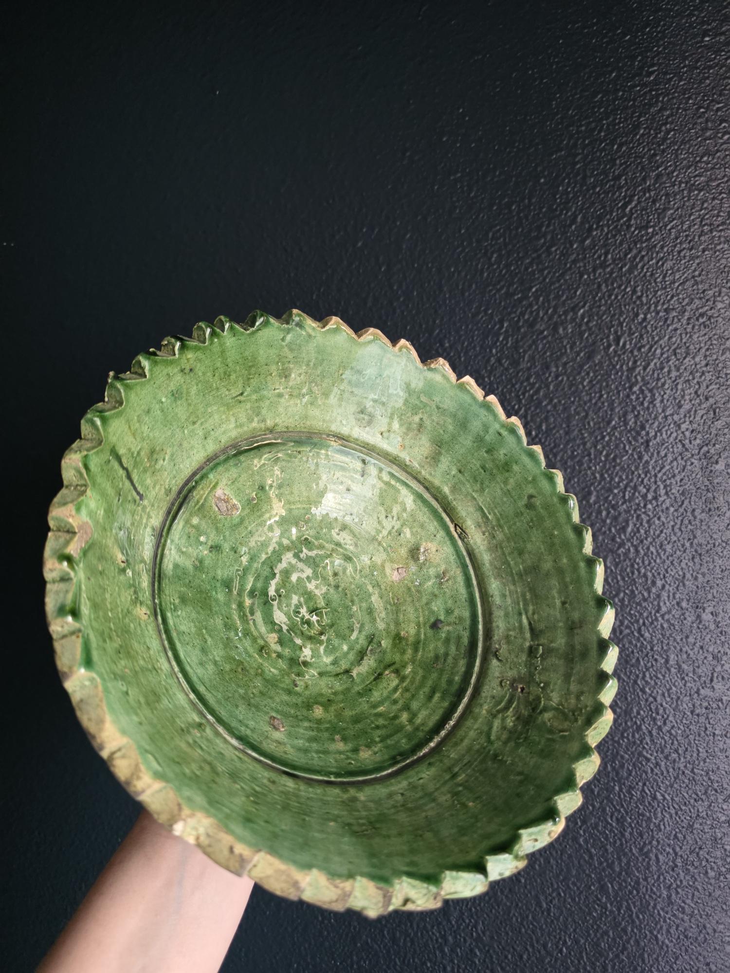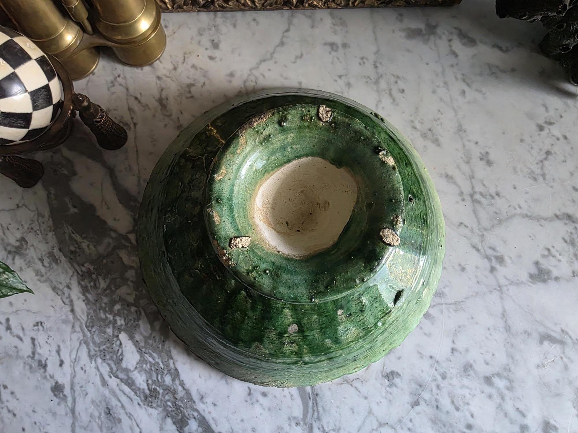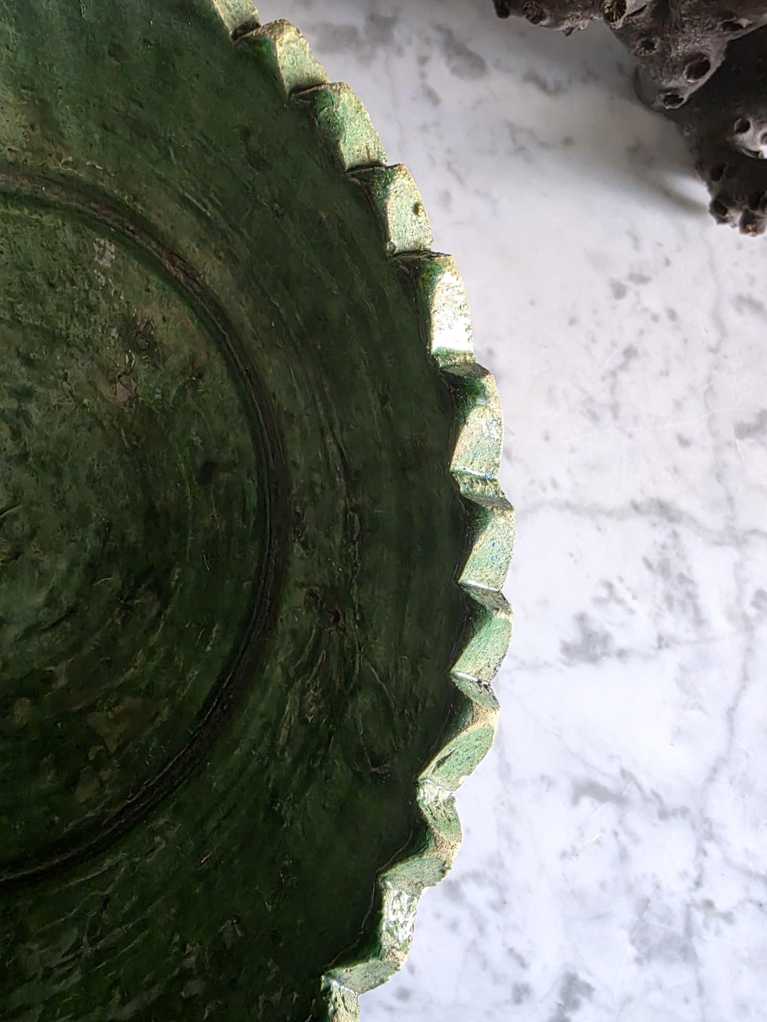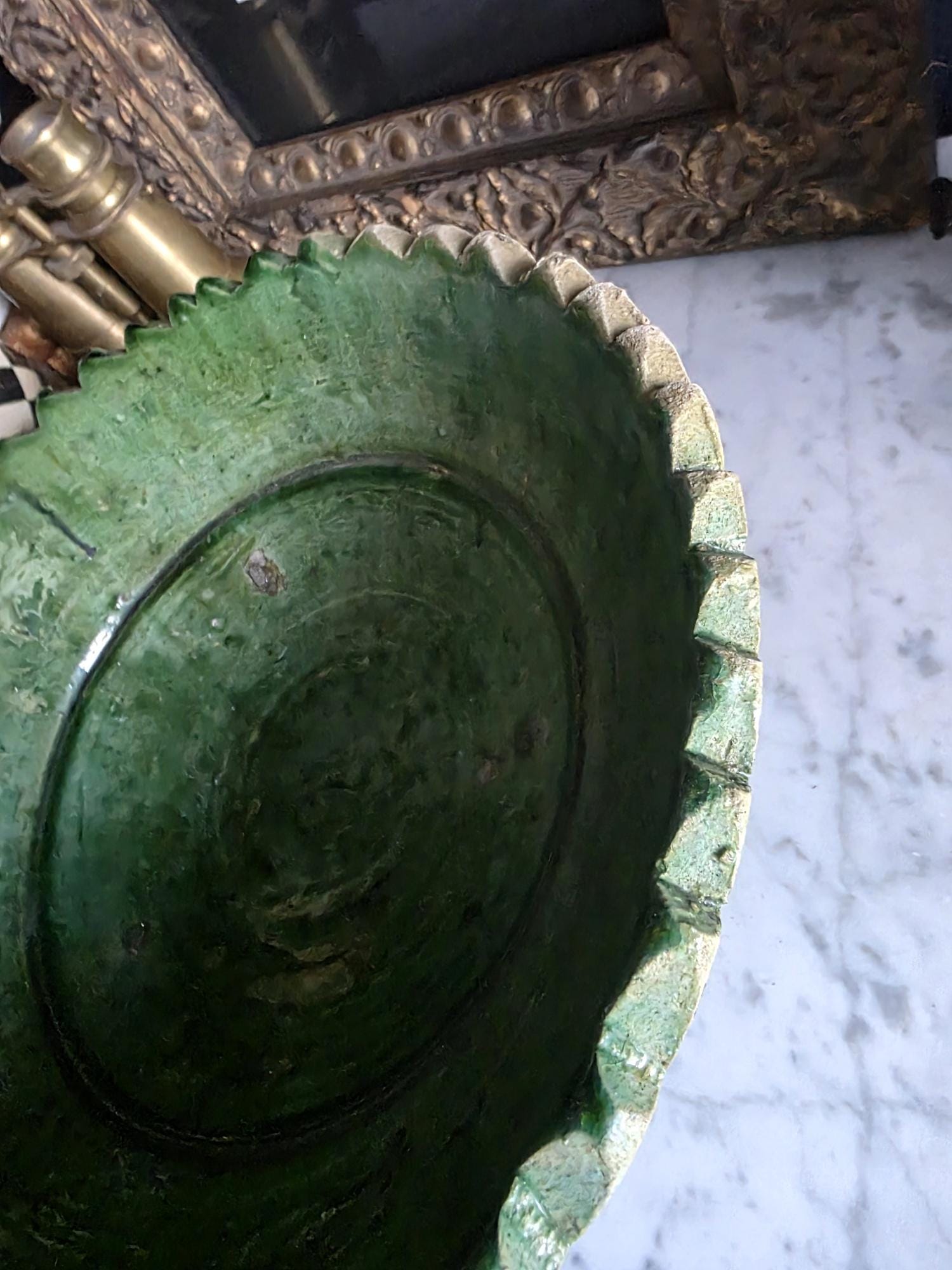 What sets this piece apart is its intentional, rustic beauty. The glossy, rich moss-green glaze is the signature of Tamegroute pottery, achieved through a unique mineral composition of local clay and copper oxide fired in traditional wood-fired kilns. The color shifts organically from deep emerald to olive, ensuring no two pieces are exactly alike. Further highlighting its handcrafted origin is the beautifully imperfect "sawtooth" or ruffled rim, a dramatic detail that emphasizes its wabi-sabi aesthetic. Due to the high-heat firing process, authentic Tamegroute pottery displays unique variations that are celebrated as part of its charm. These might include crazing, minor glaze runs, color spots, or small kiln marks on the base—these are the unmistakable signatures of a truly handcrafted piece.