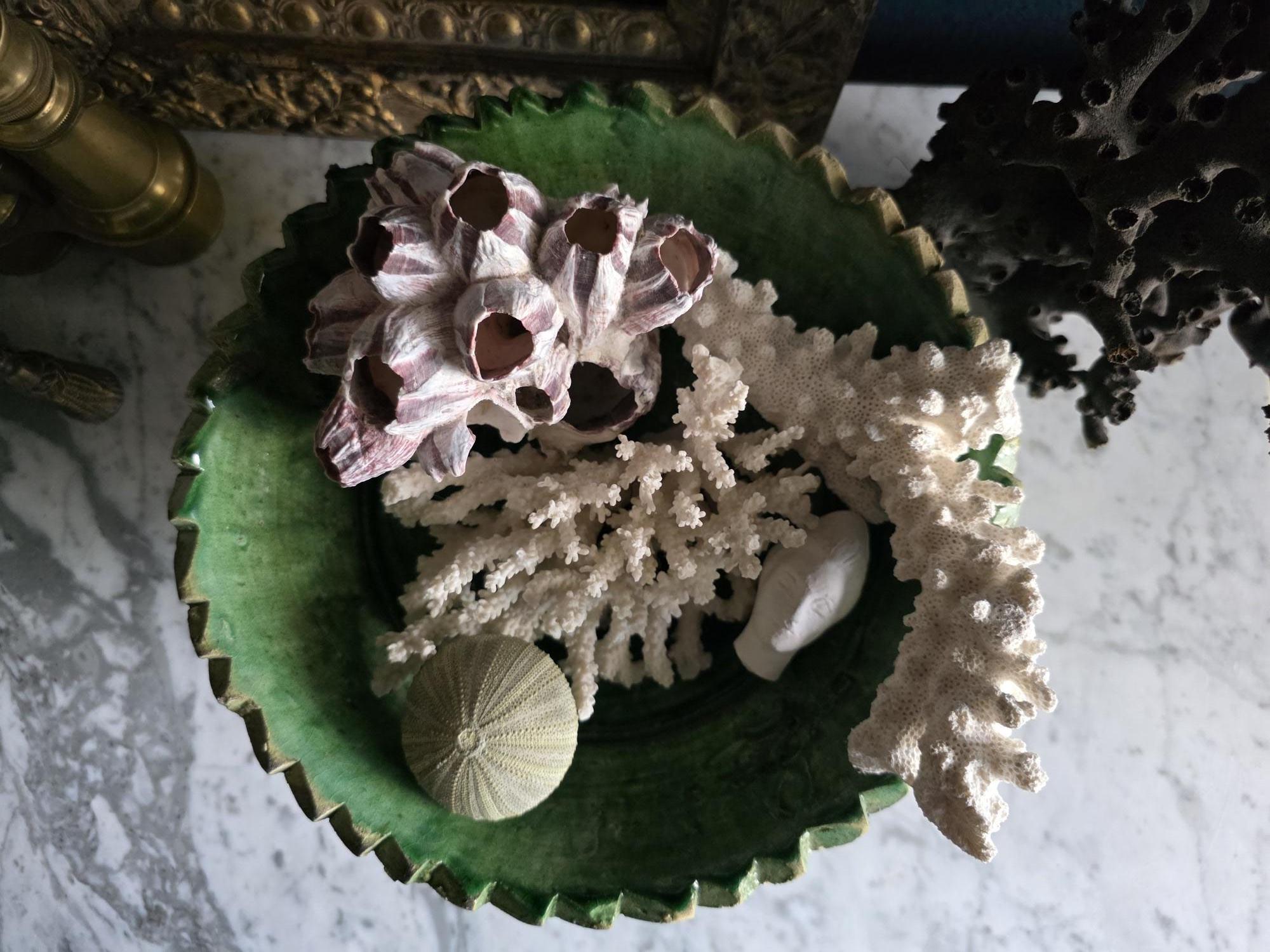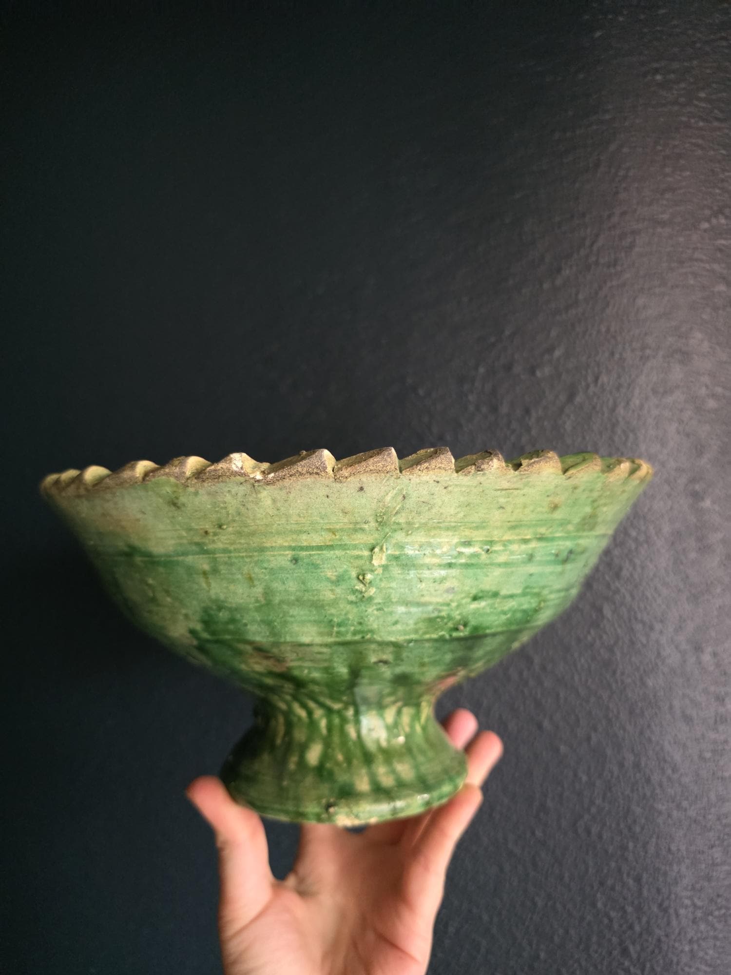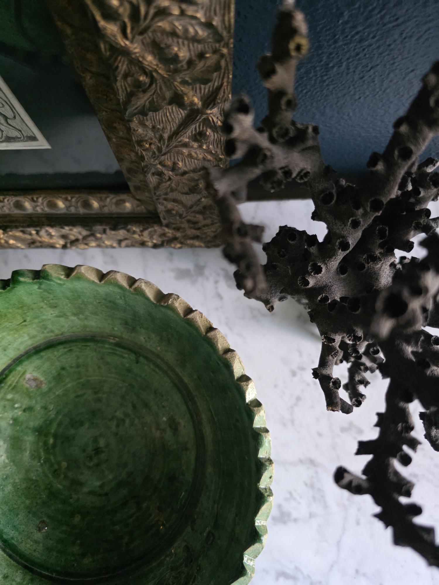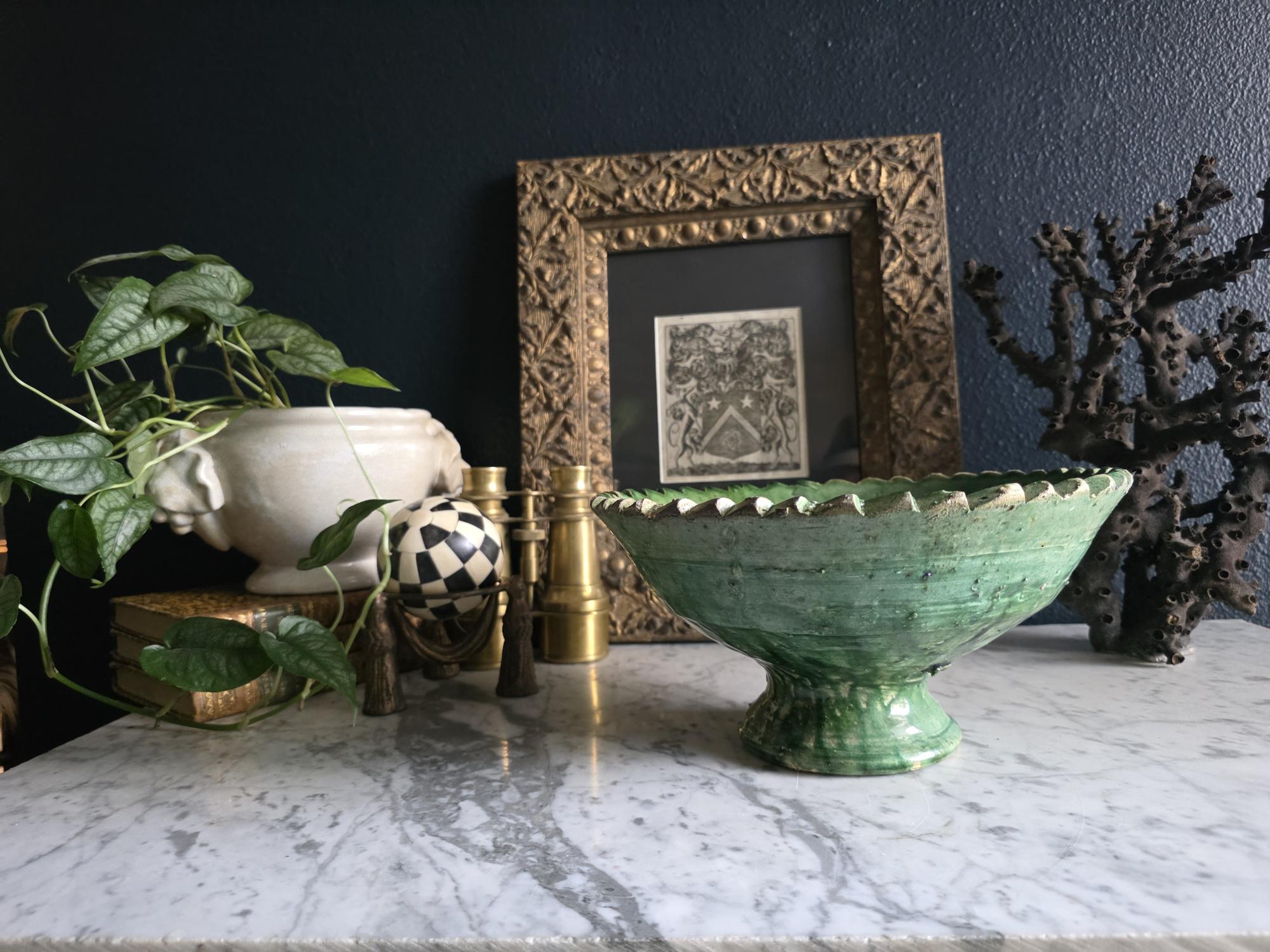 What sets this piece apart is its intentional, rustic beauty. The glossy, rich moss-green glaze is the signature of Tamegroute pottery, achieved through a unique mineral composition of local clay and copper oxide fired in traditional wood-fired kilns. The color shifts organically from deep emerald to olive, ensuring no two pieces are exactly alike. Further highlighting its handcrafted origin is the beautifully imperfect "sawtooth" or ruffled rim, a dramatic detail that emphasizes its wabi-sabi aesthetic. Due to the high-heat firing process, authentic Tamegroute pottery displays unique variations that are celebrated as part of its charm. These might include crazing, minor glaze runs, color spots, or small kiln marks on the base—these are the unmistakable signatures of a truly handcrafted piece.
