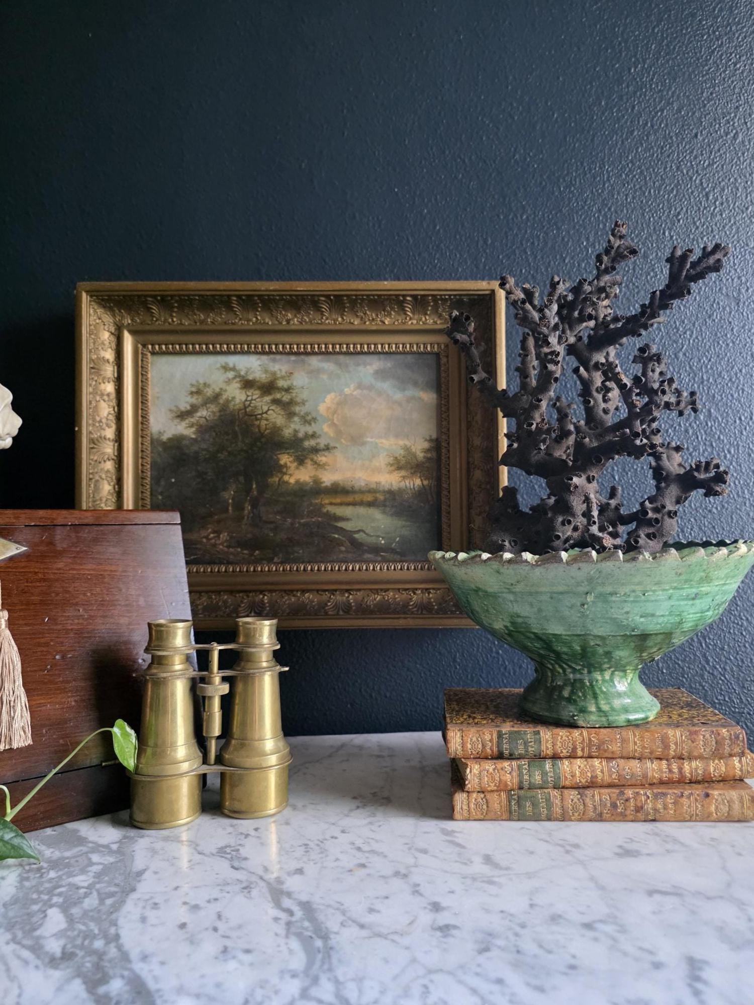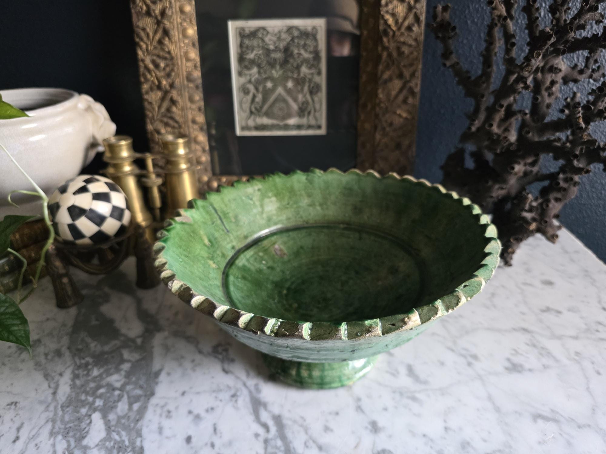 Elevated on a pedestal base, this compote is designed to be a centerpiece. It's the perfect size for displaying fresh fruit, holding decorative items like dried botanicals or coral, or simply adding a warm, rustic element to your interiors. This piece is in excellent vintage condition, consistent with its handmade, rustic nature. While Tamegroute pottery is typically food-safe, we recommend lining the bowl or using it for dry foods and decorative display to best preserve its authentic, porous surface.