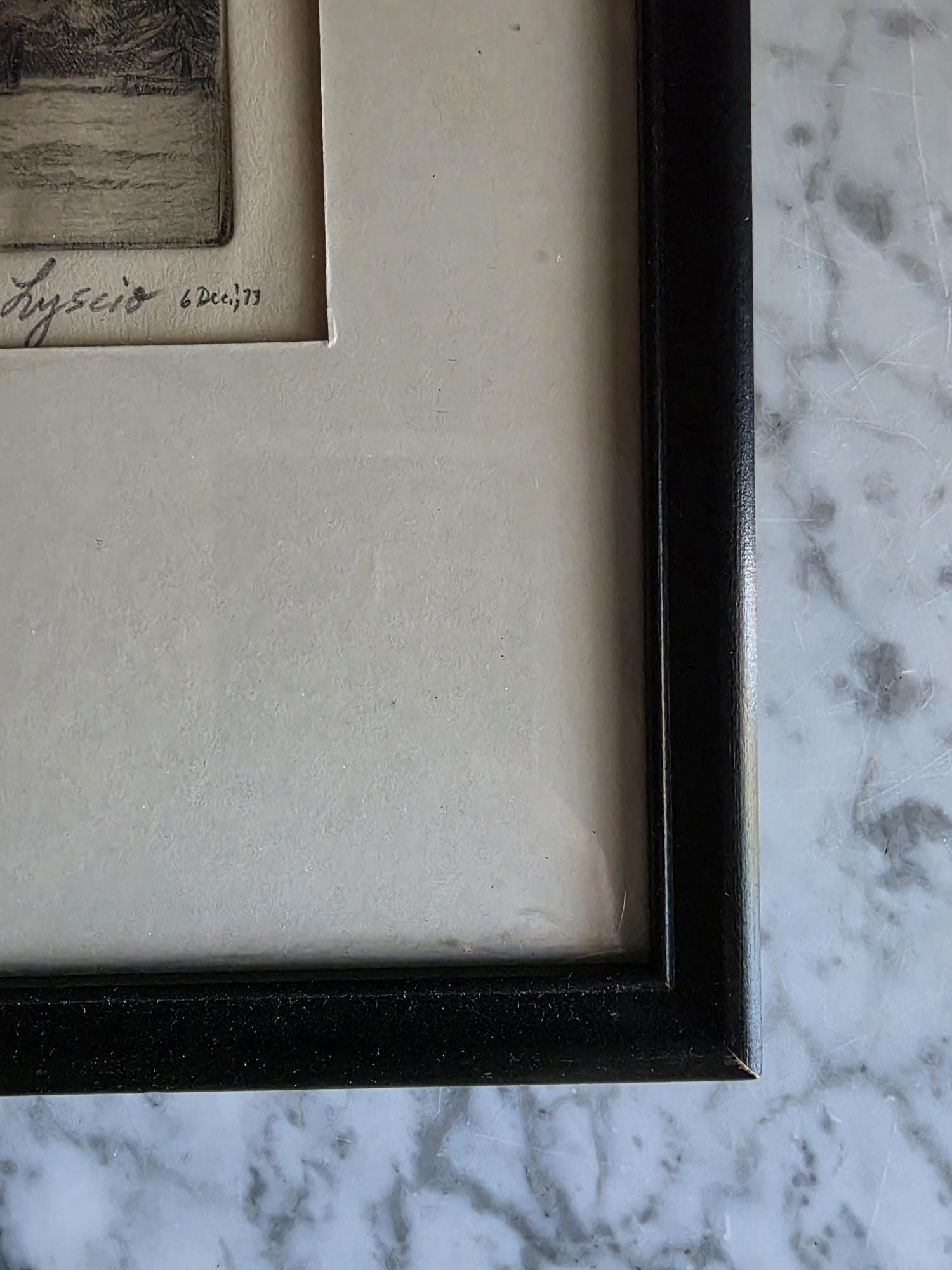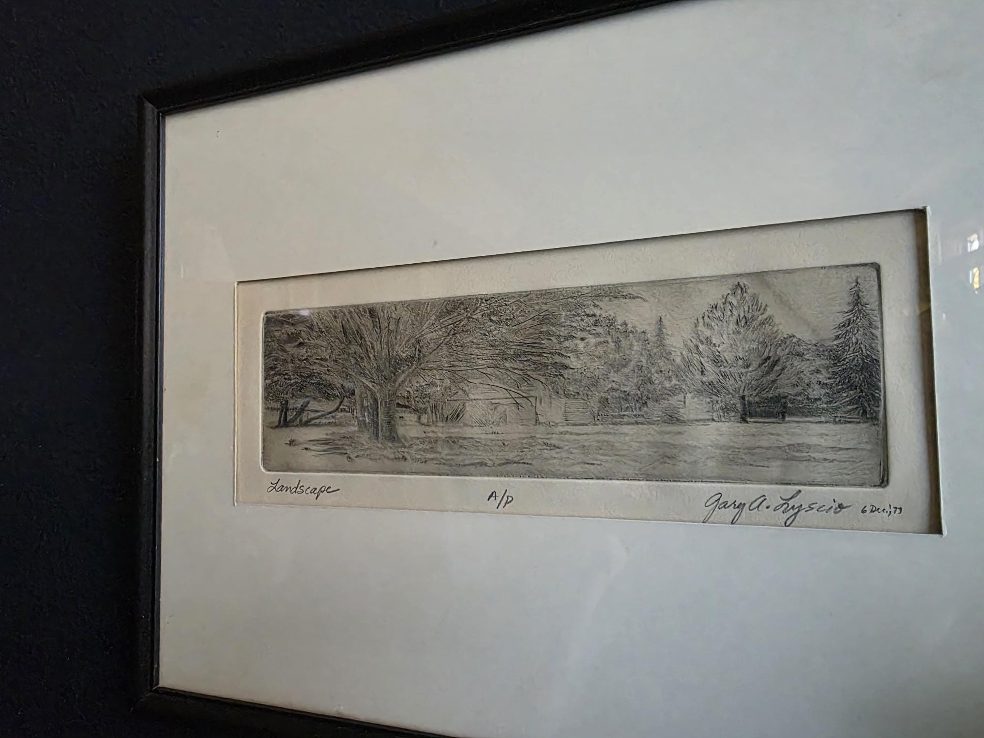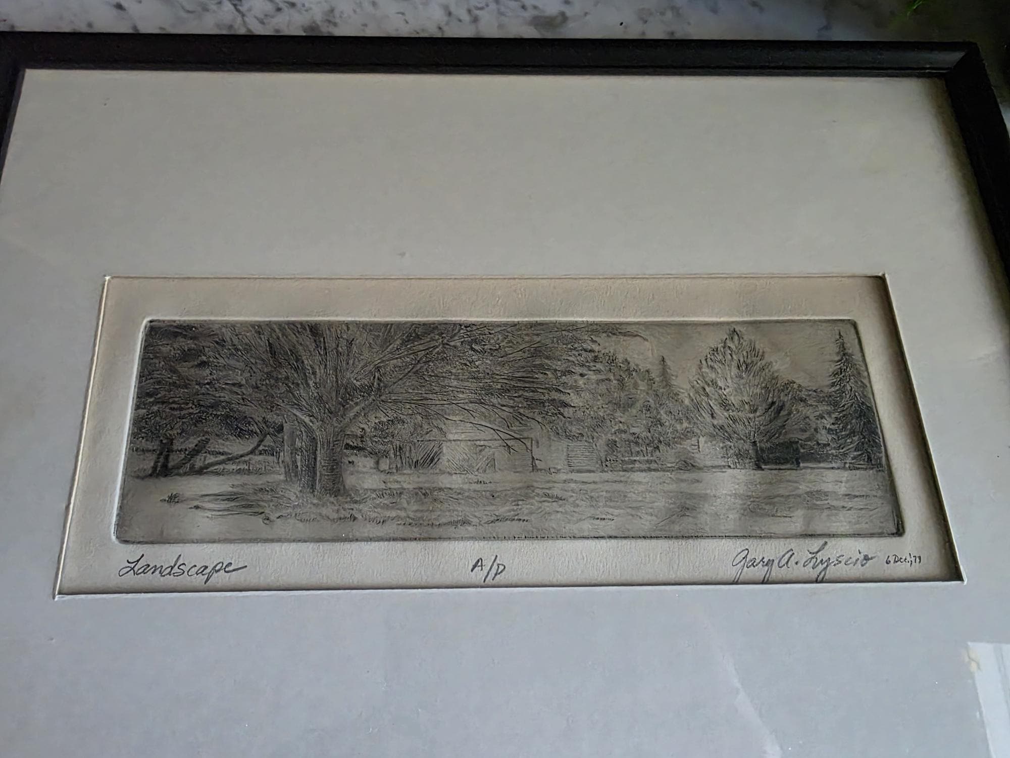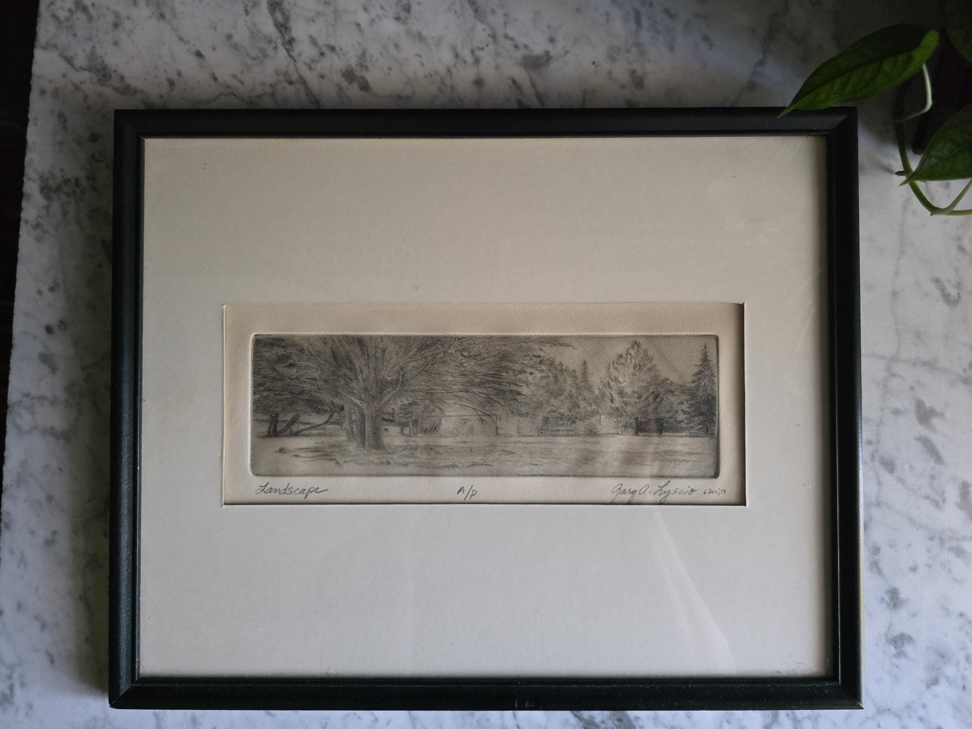 This is a beautiful and original piece of late 20th-century American printmaking: an Artist's Proof (A/P) titled "Landscape," hand-signed and dated December 6, 1973, by artist Gary A. Lyscio.