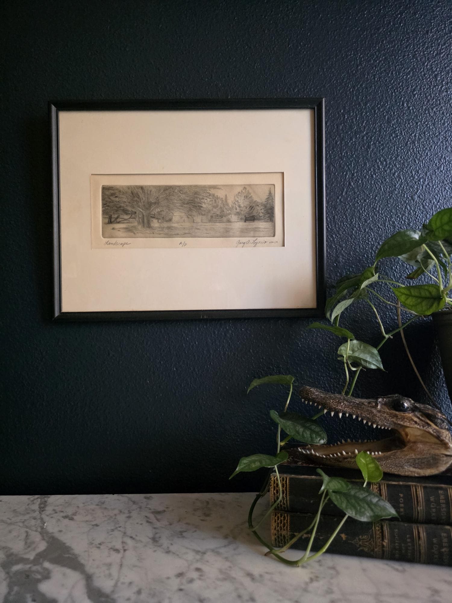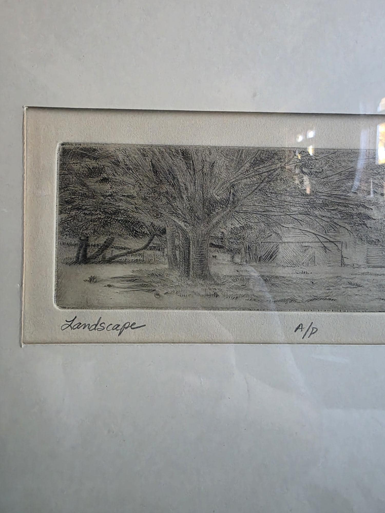 The work captures a contemplative panoramic view of a rural landscape dominated by large, old-growth trees and a subtle structure in the background. As an Artist's Proof, this print was personally approved and pulled by the artist outside of the main edition, making it a unique and desirable collector's item. It is presented in excellent, ready-to-hang condition, professionally matted in cream and housed in a sleek black frame.