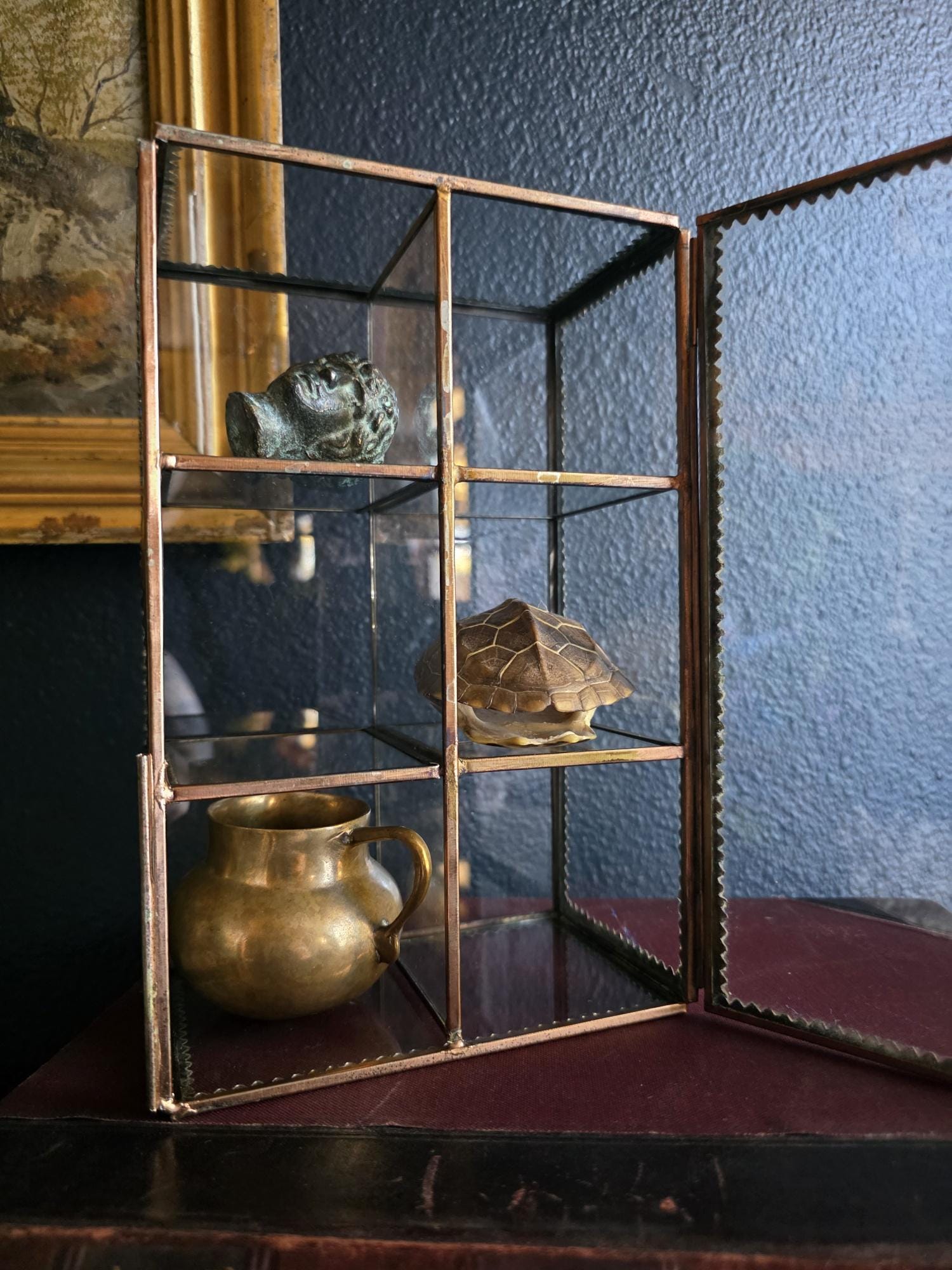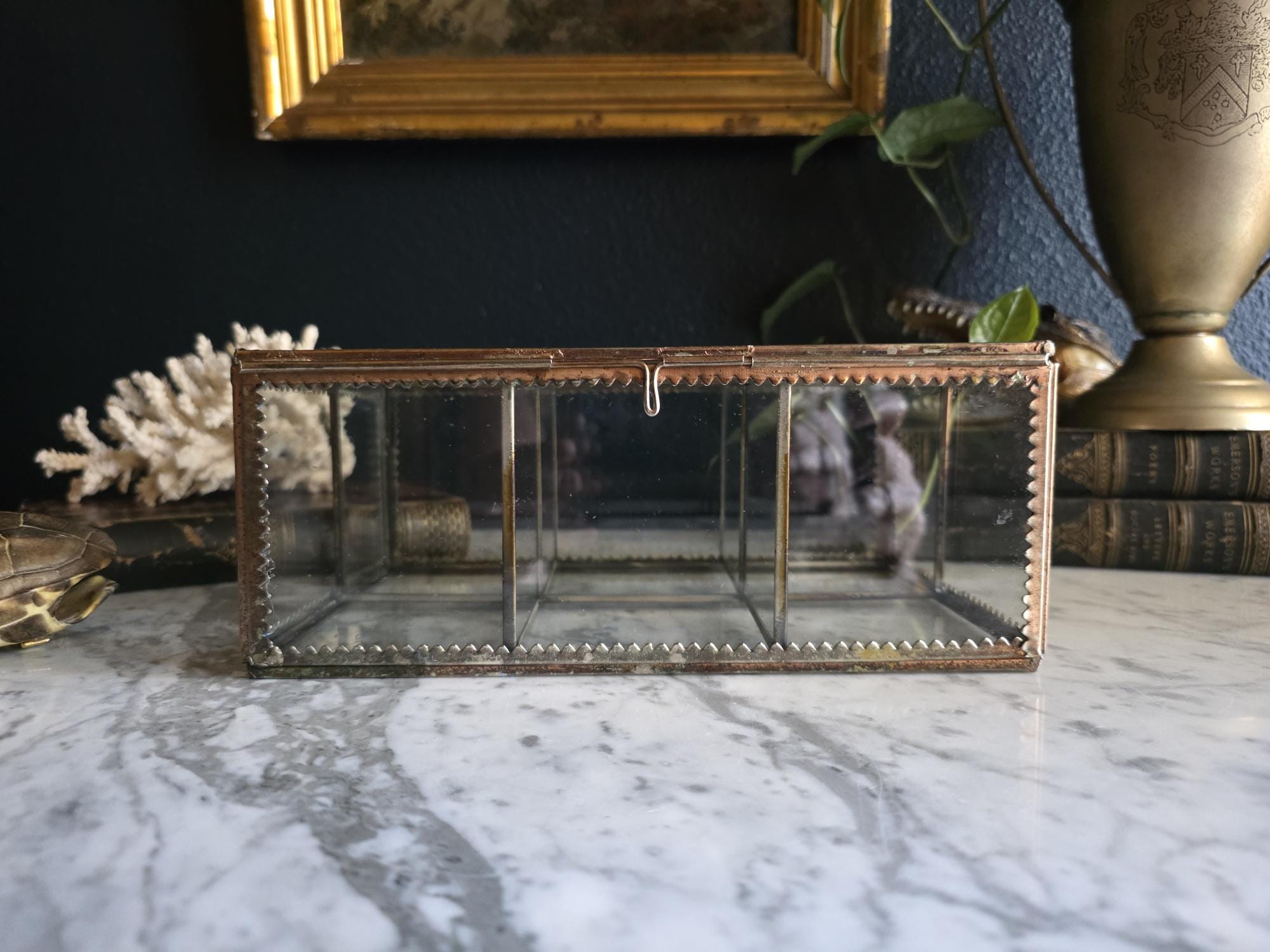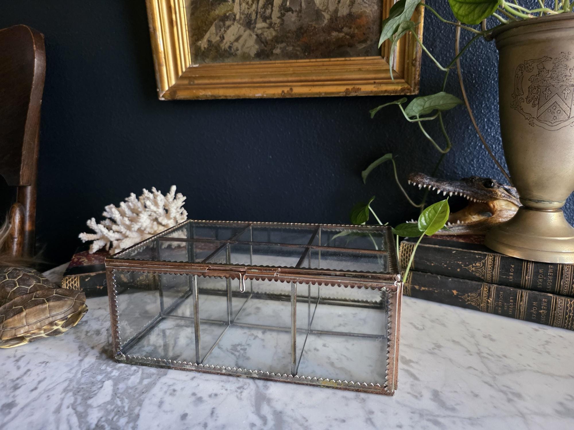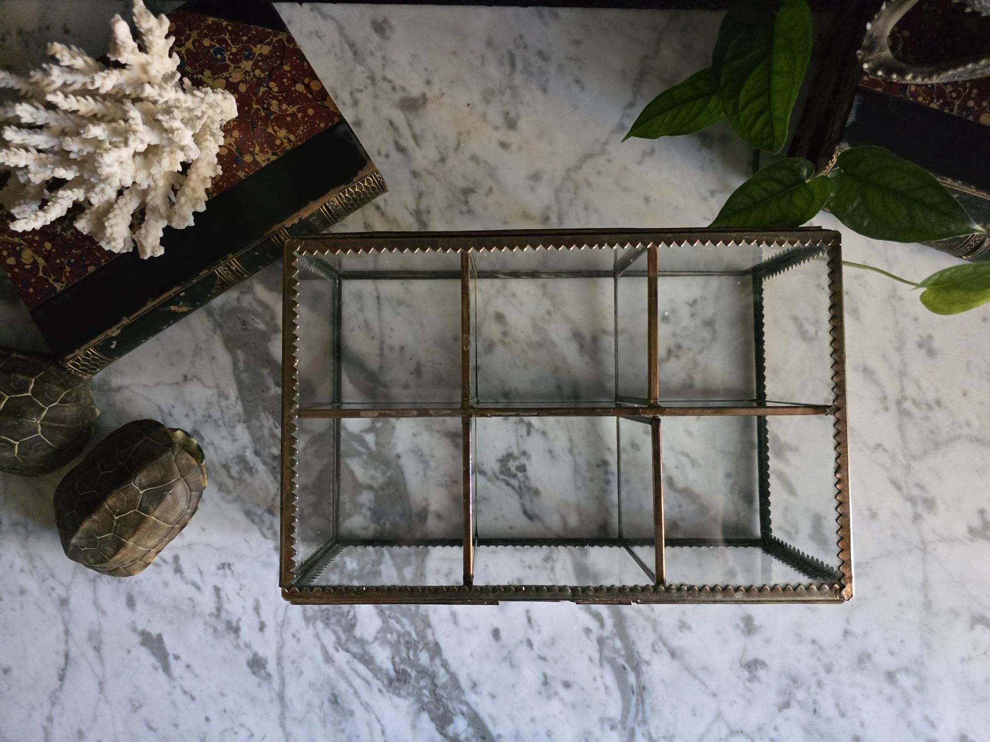 This is a stunning and uniquely versatile vintage display piece perfect for collectors seeking a curated, "Cabinet of Curiosities" look. The box is constructed from clear glass panels meticulously framed in metal with minor patina, immediately recognizable for its detailed sawtooth or scalloped edging along the frame, lending a sophisticated, collected quality. The piece offers exceptional flexibility: it can be used laid flat as a compartmentalized apothecary-style box with six sections, ideal for organizing jewelry, stones, or small trinkets. Alternatively, it transforms when stood upright into a miniature tiered curio cabinet with three shelves, perfect for dramatically showcasing crystals, miniature sculptures, or cherished specimens. This rare, two-in-one functionality and intricate metal detailing make it a sophisticated and desirable addition to any modern, eclectic, or Wunderkammer-inspired display on a vanity, bookshelf, or console table.