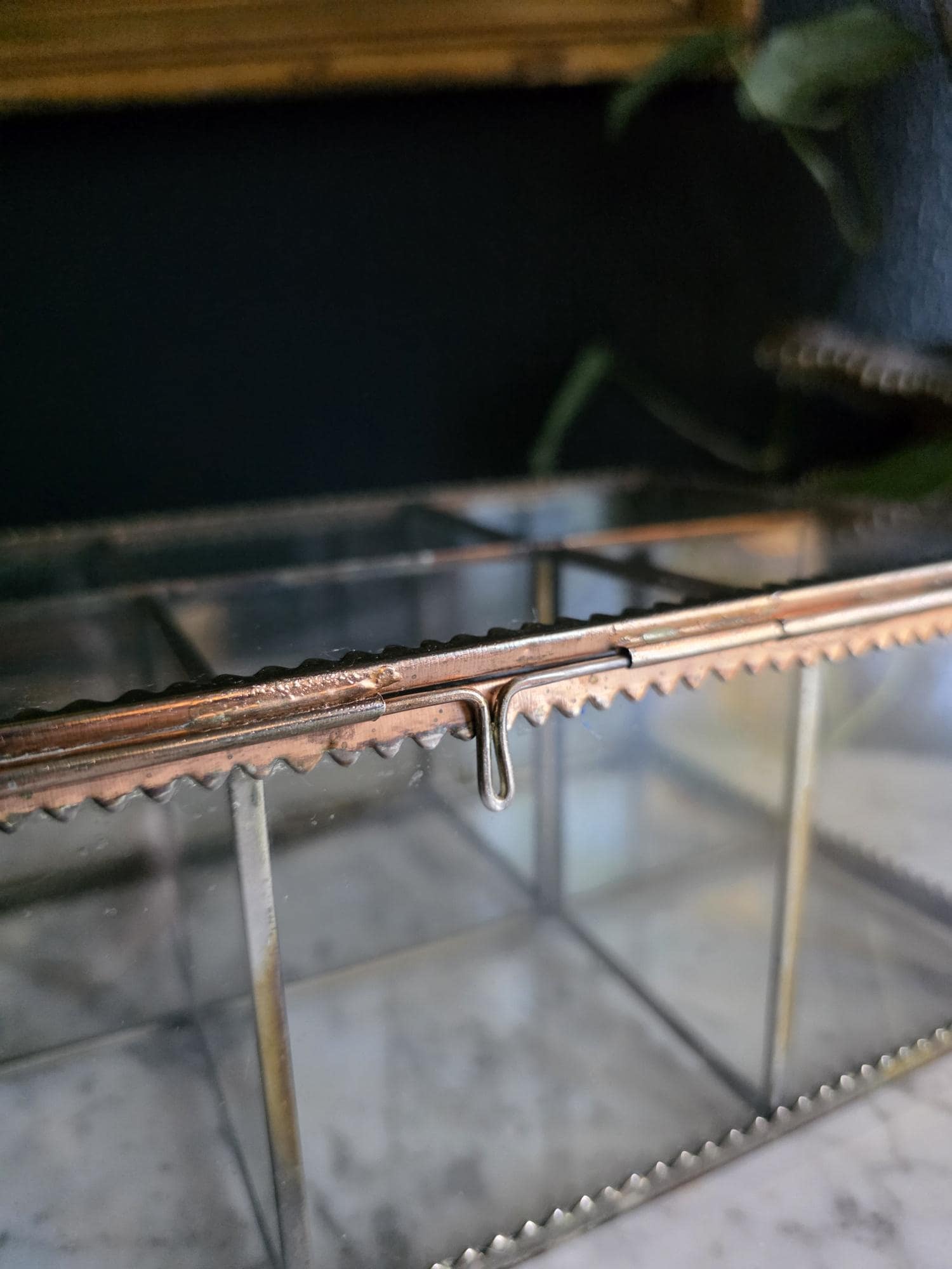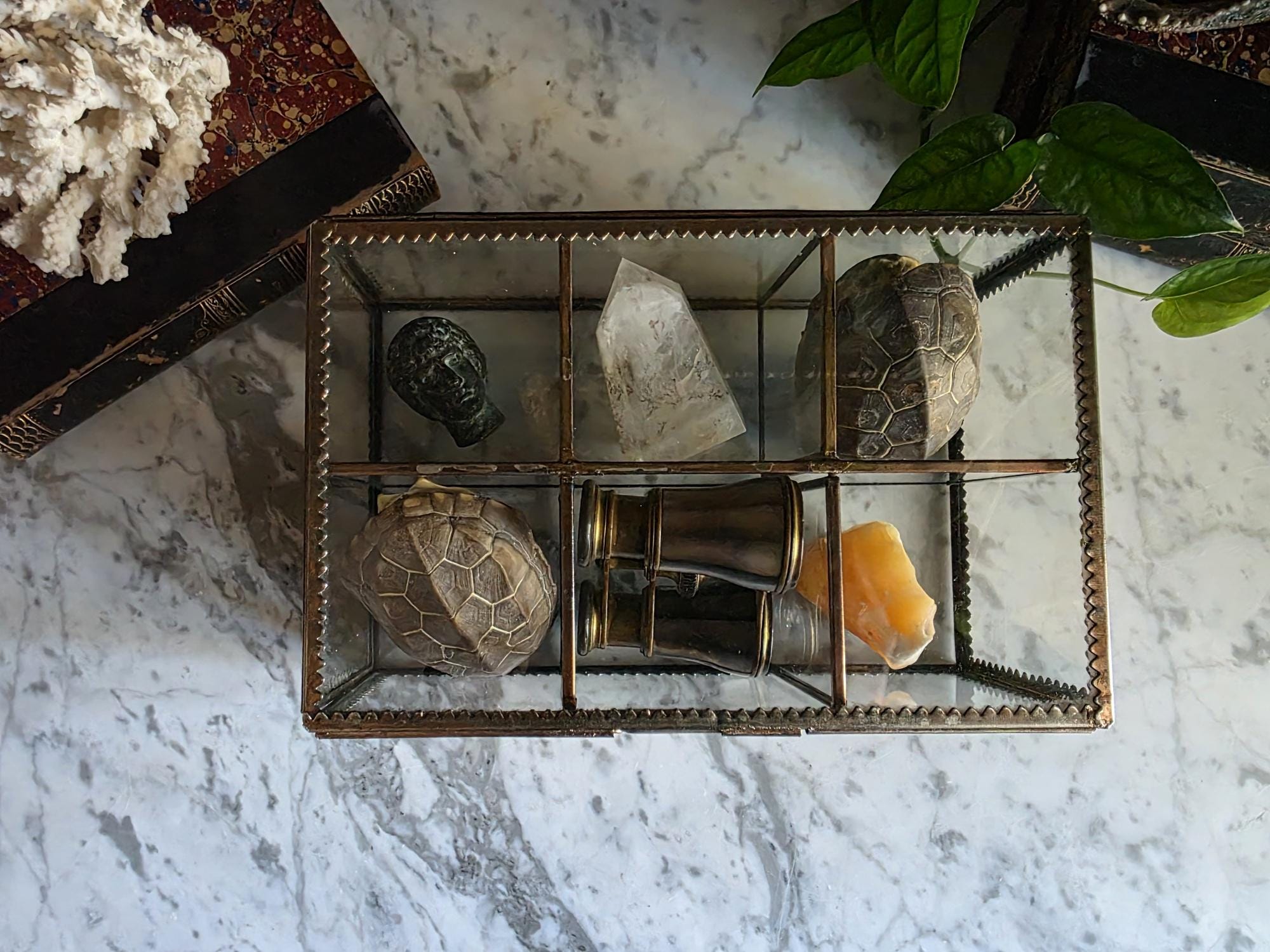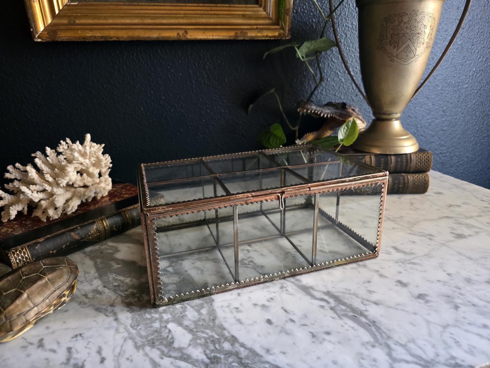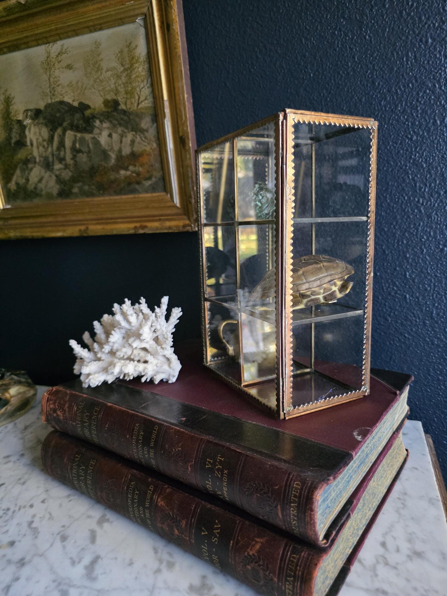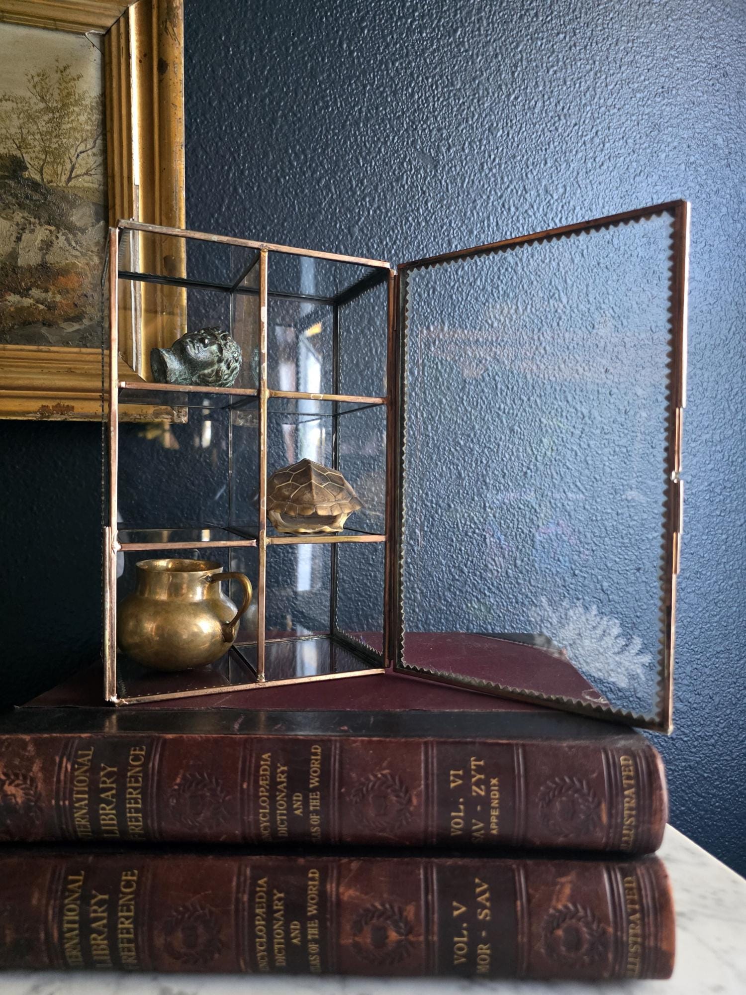 This is a stunning and uniquely versatile vintage display piece perfect for collectors seeking a curated, "Cabinet of Curiosities" look. The box is constructed from clear glass panels meticulously framed in metal with minor patina, immediately recognizable for its detailed sawtooth or scalloped edging along the frame, lending a sophisticated, collected quality. The piece offers exceptional flexibility: it can be used laid flat as a compartmentalized apothecary-style box with six sections, ideal for organizing jewelry, stones, or small trinkets. Alternatively, it transforms when stood upright into a miniature tiered curio cabinet with three shelves, perfect for dramatically showcasing crystals, miniature sculptures, or cherished specimens. This rare, two-in-one functionality and intricate metal detailing make it a sophisticated and desirable addition to any modern, eclectic, or Wunderkammer-inspired display on a vanity, bookshelf, or console table.