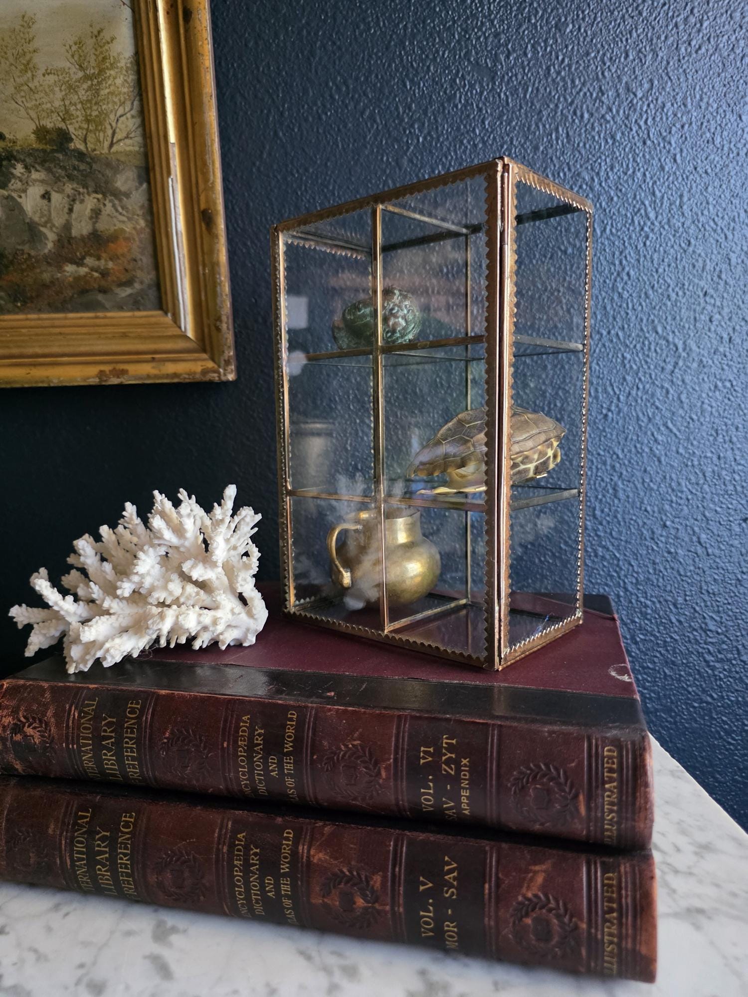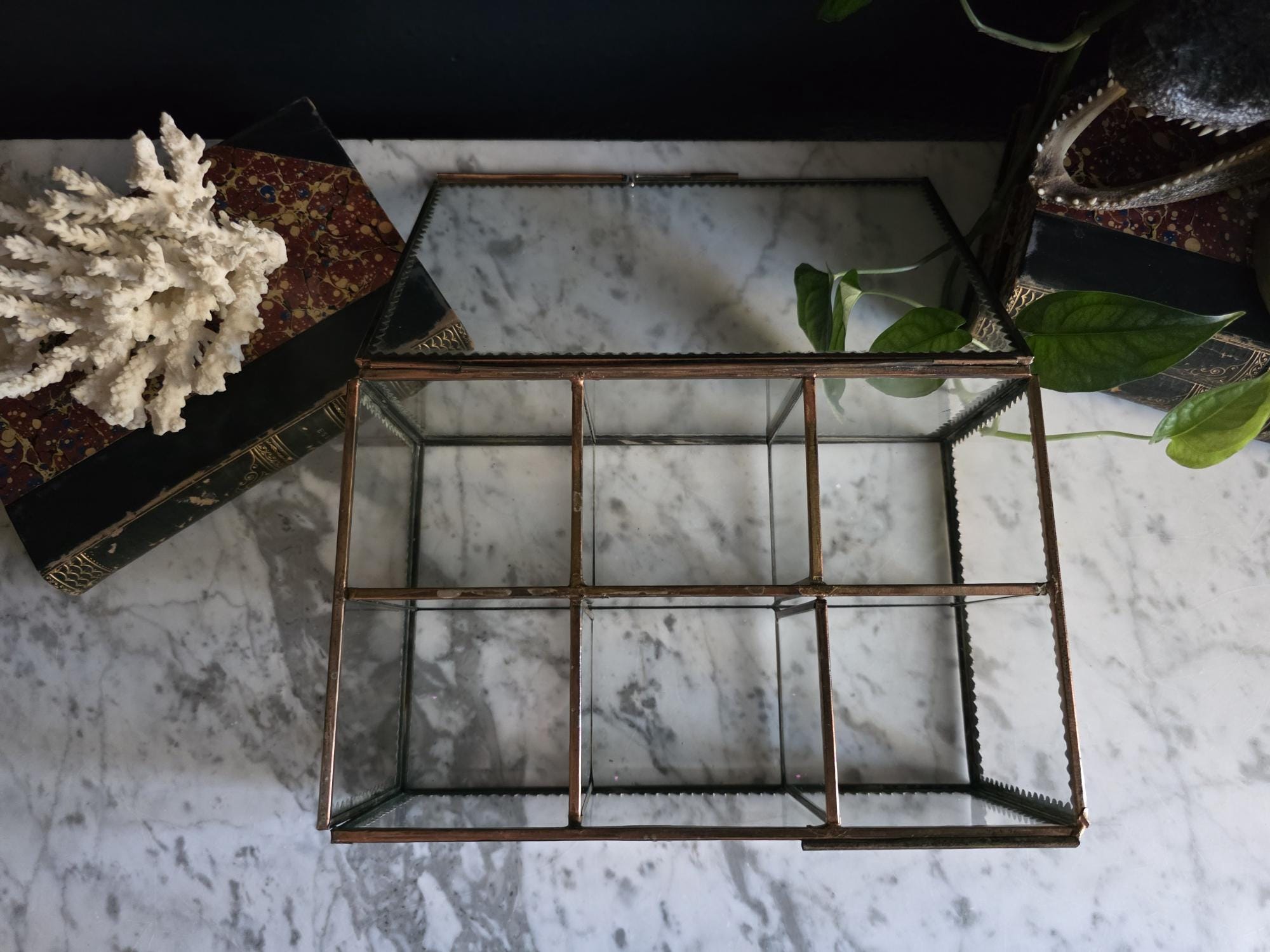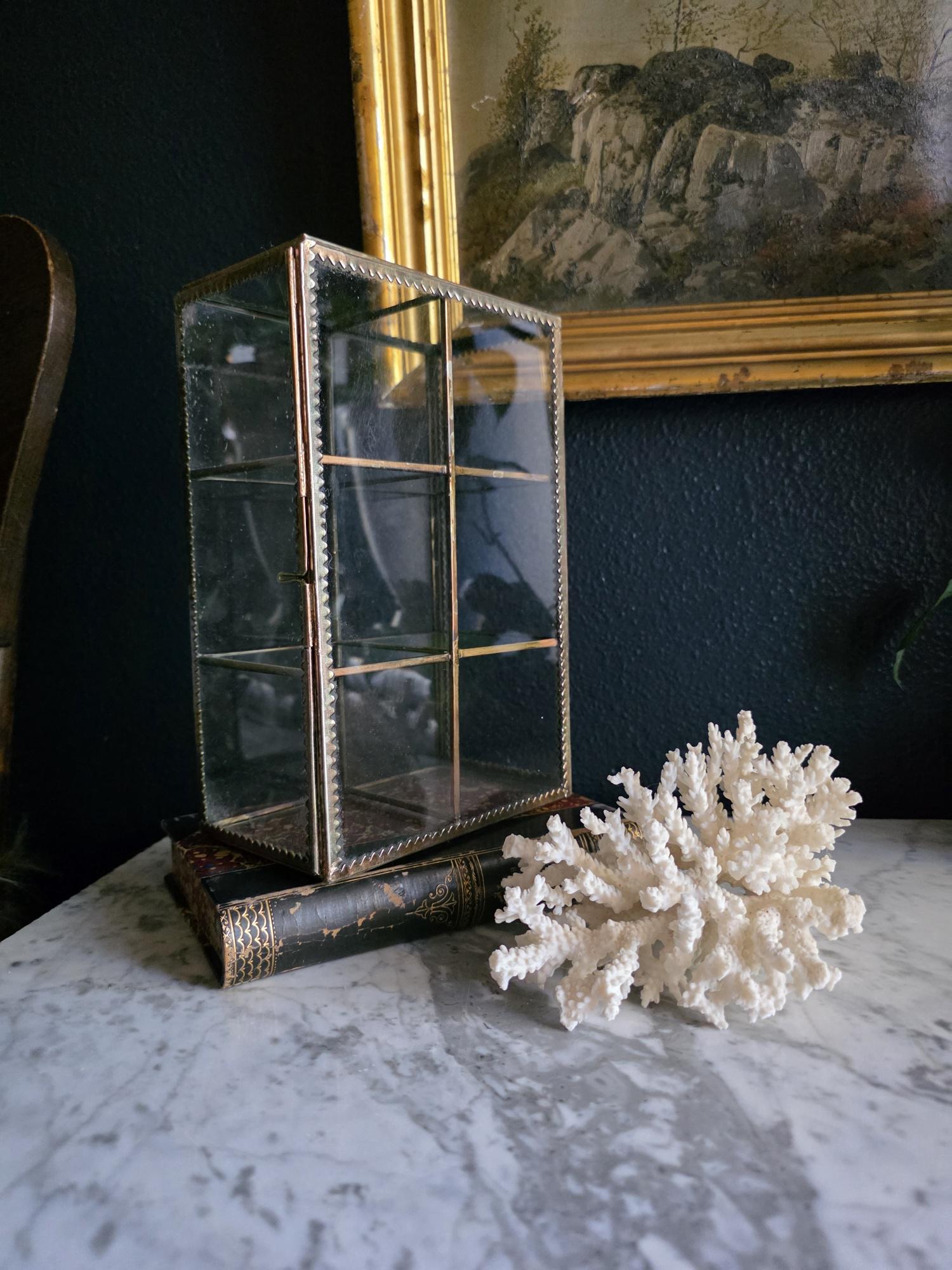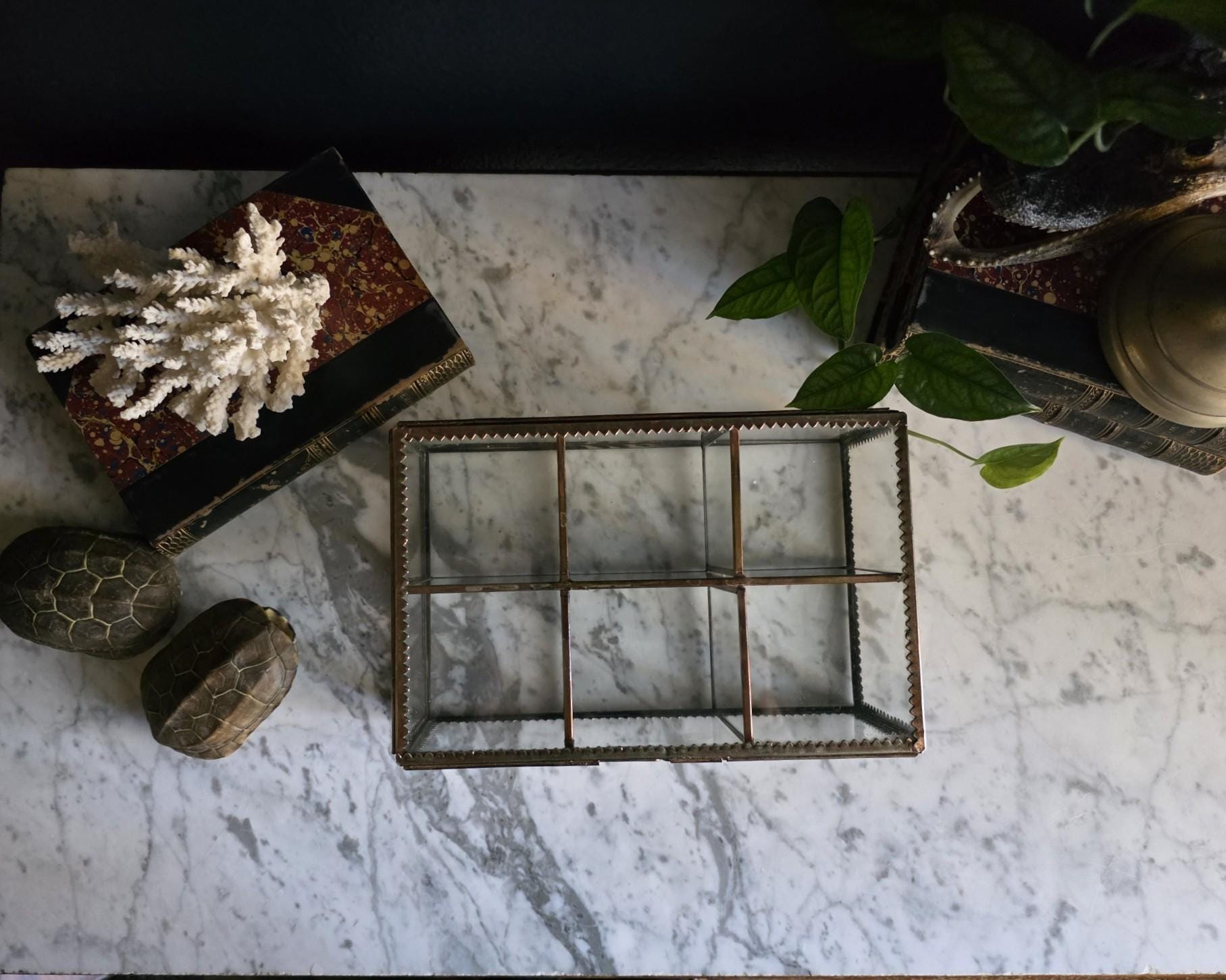 This is a stunning and uniquely versatile vintage display piece perfect for collectors seeking a curated, "Cabinet of Curiosities" look. The box is constructed from clear glass panels meticulously framed in metal with minor patina, immediately recognizable for its detailed sawtooth or scalloped edging along the frame, lending a sophisticated, collected quality. The piece offers exceptional flexibility: it can be used laid flat as a compartmentalized apothecary-style box with six sections, ideal for organizing jewelry, stones, or small trinkets. Alternatively, it transforms when stood upright into a miniature tiered curio cabinet with three shelves, perfect for dramatically showcasing crystals, miniature sculptures, or cherished specimens. This rare, two-in-one functionality and intricate metal detailing make it a sophisticated and desirable addition to any modern, eclectic, or Wunderkammer-inspired display on a vanity, bookshelf, or console table.