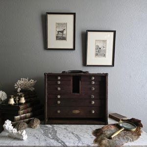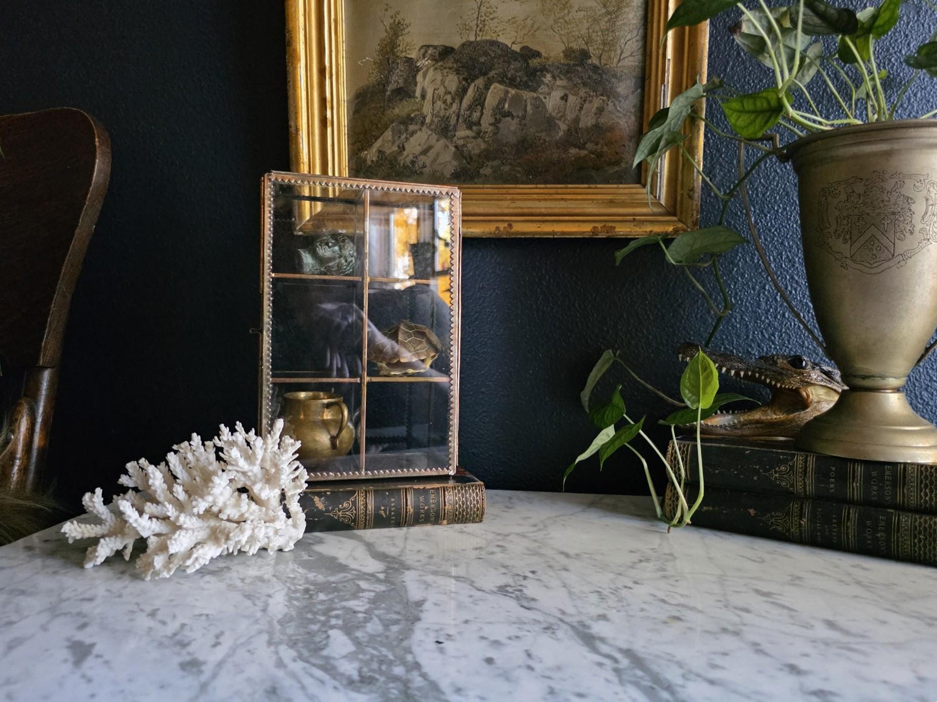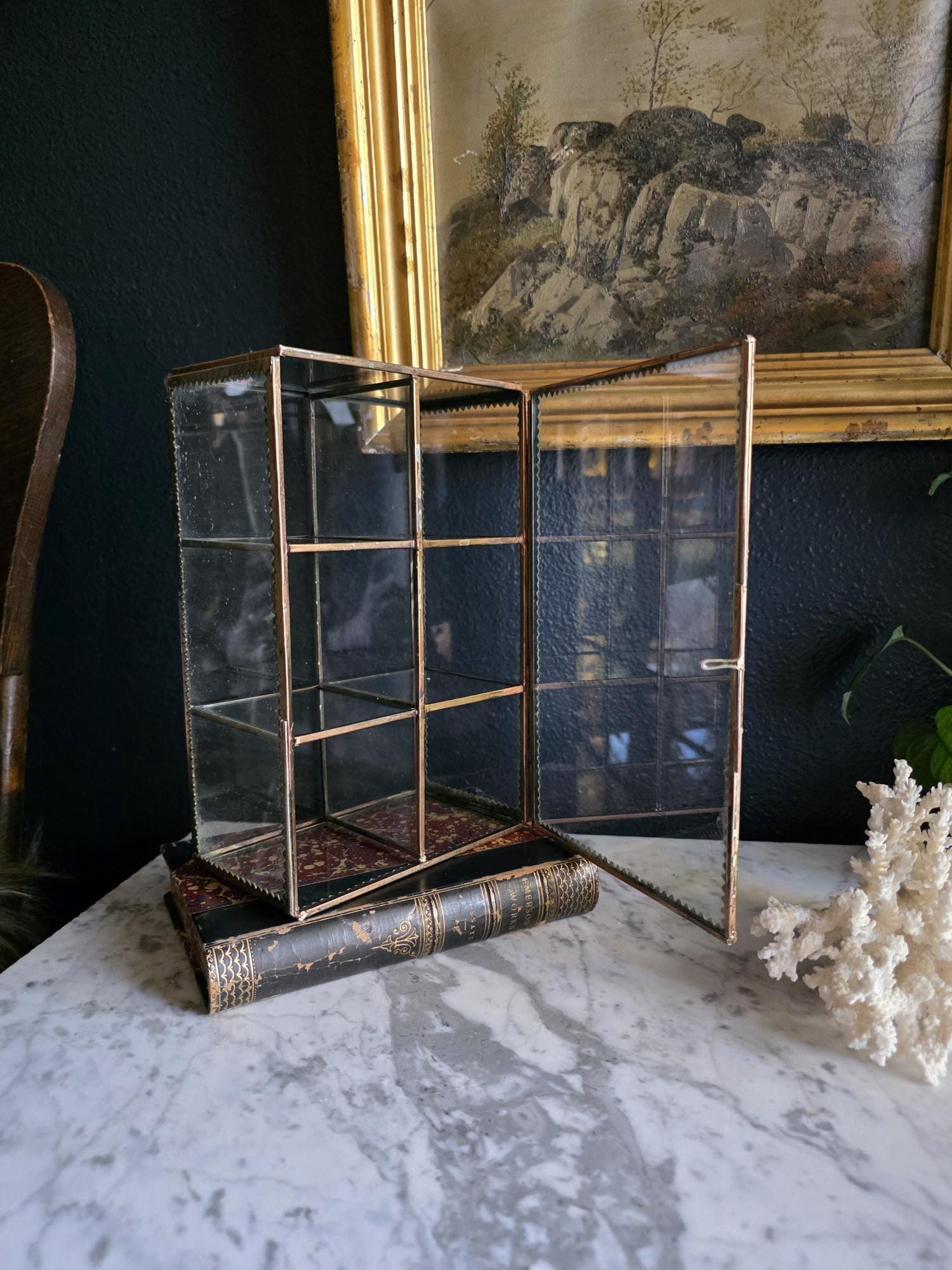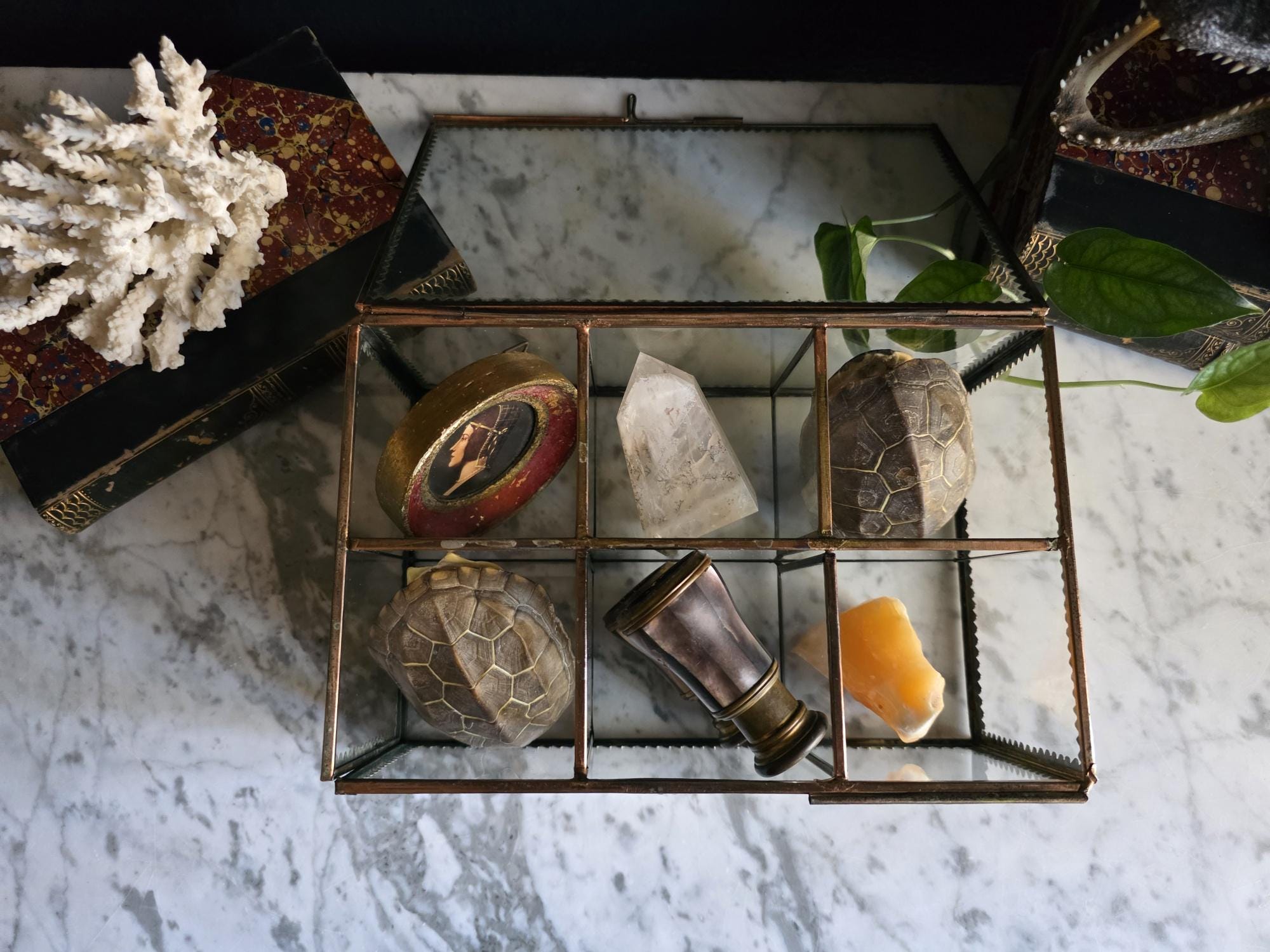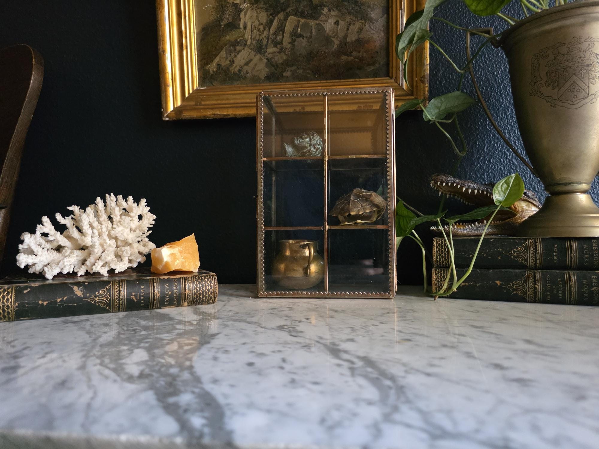 This is a stunning and uniquely versatile vintage display piece perfect for collectors seeking a curated, "Cabinet of Curiosities" look. The box is constructed from clear glass panels meticulously framed in metal with minor patina, immediately recognizable for its detailed sawtooth or scalloped edging along the frame, lending a sophisticated, collected quality. The piece offers exceptional flexibility: it can be used laid flat as a compartmentalized apothecary-style box with six sections, ideal for organizing jewelry, stones, or small trinkets. Alternatively, it transforms when stood upright into a miniature tiered curio cabinet with three shelves, perfect for dramatically showcasing crystals, miniature sculptures, or cherished specimens. This rare, two-in-one functionality and intricate metal detailing make it a sophisticated and desirable addition to any modern, eclectic, or Wunderkammer-inspired display on a vanity, bookshelf, or console table.