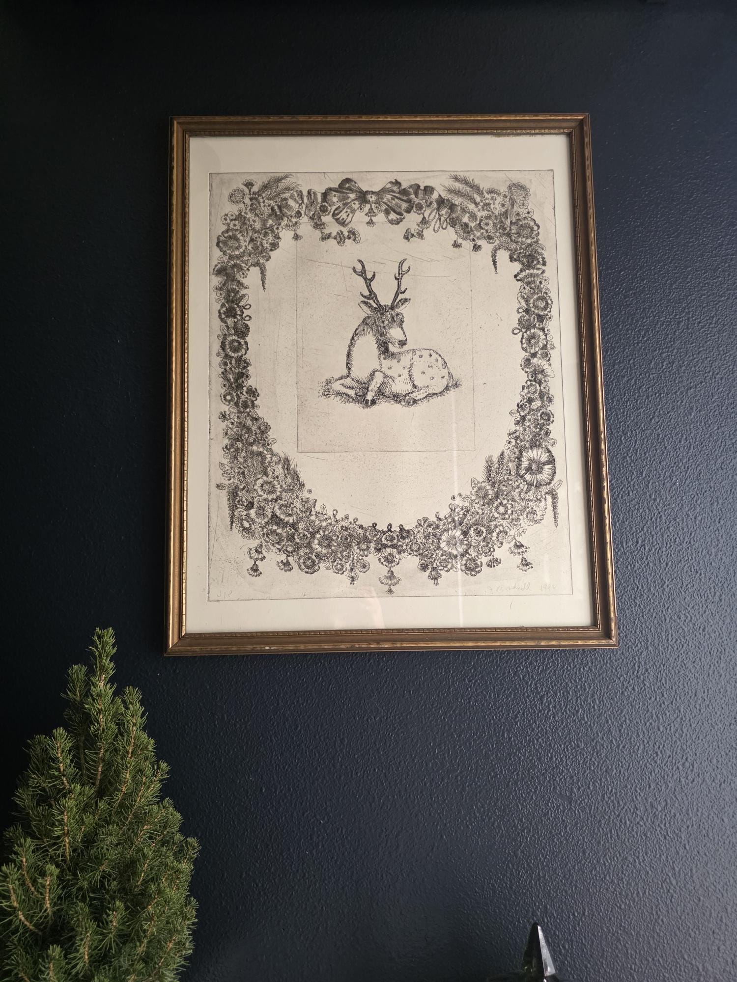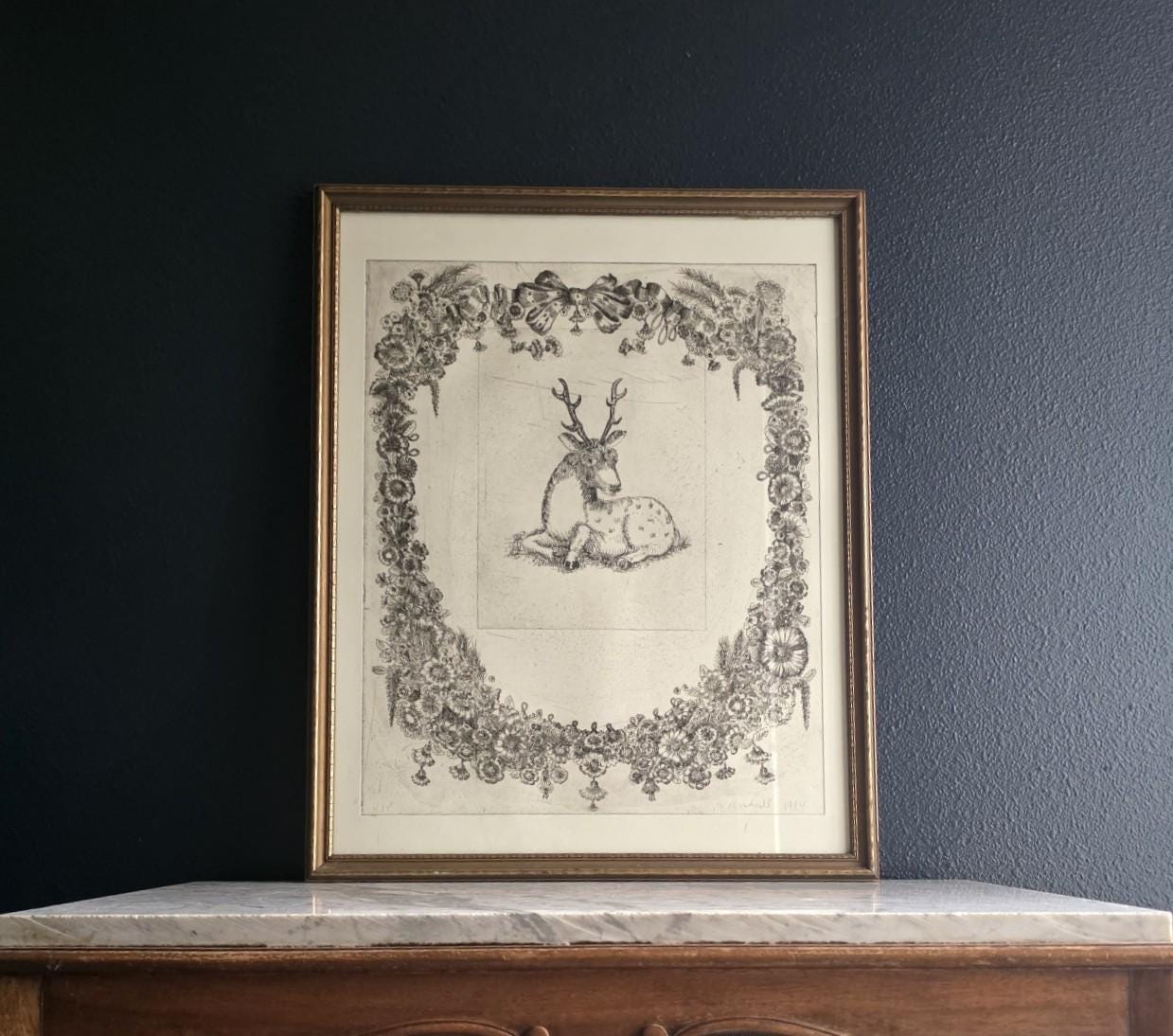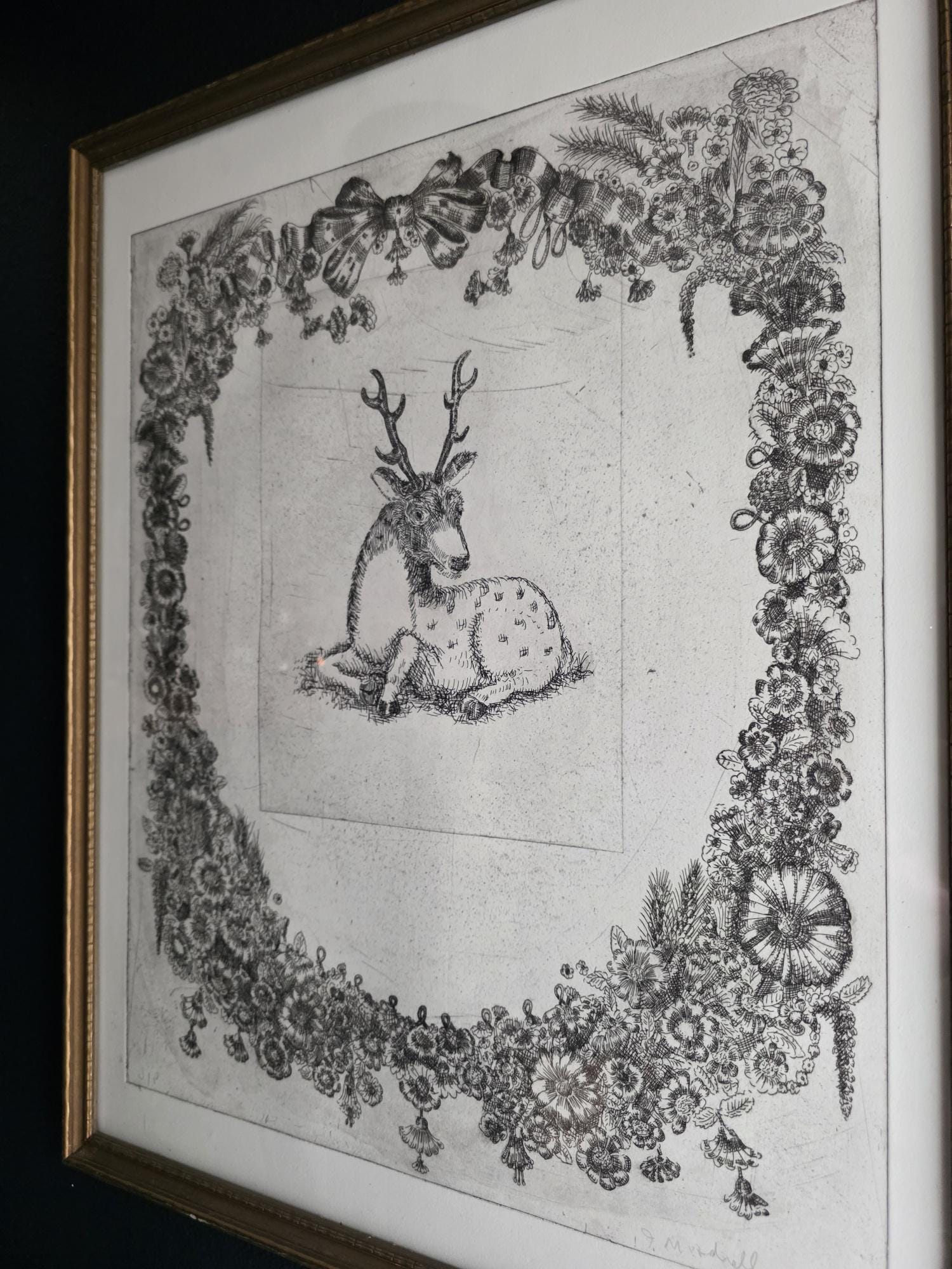 The print is an intaglio print (likely an etching or drypoint), characterized by the fine, linear detail and the visible impression mark from the metal plate. The elaborate ornamentation of the surrounding wreath—complete with lush flowers, bows, and tassels—creates a dramatic contrast with the simply rendered stag at the center.