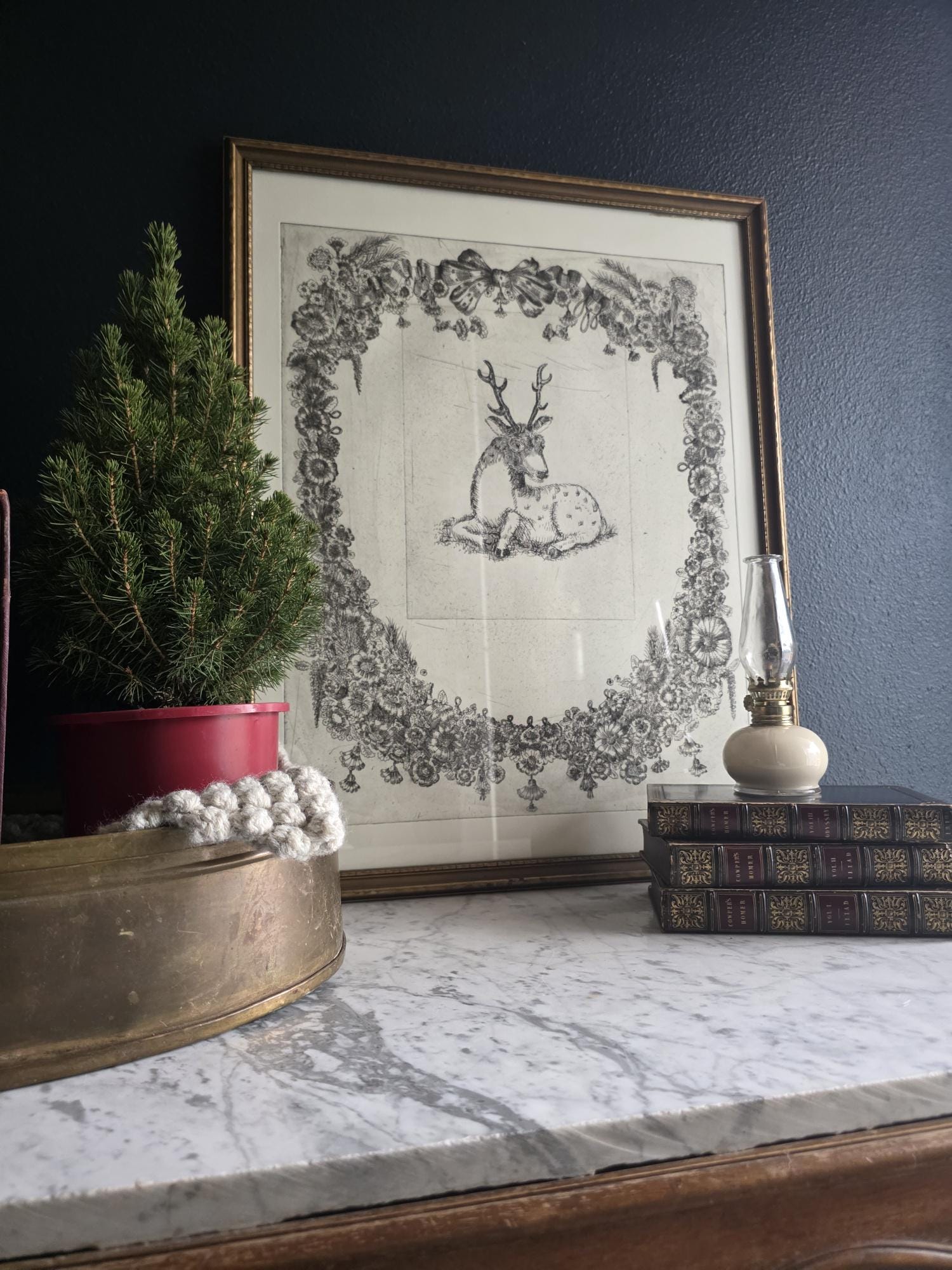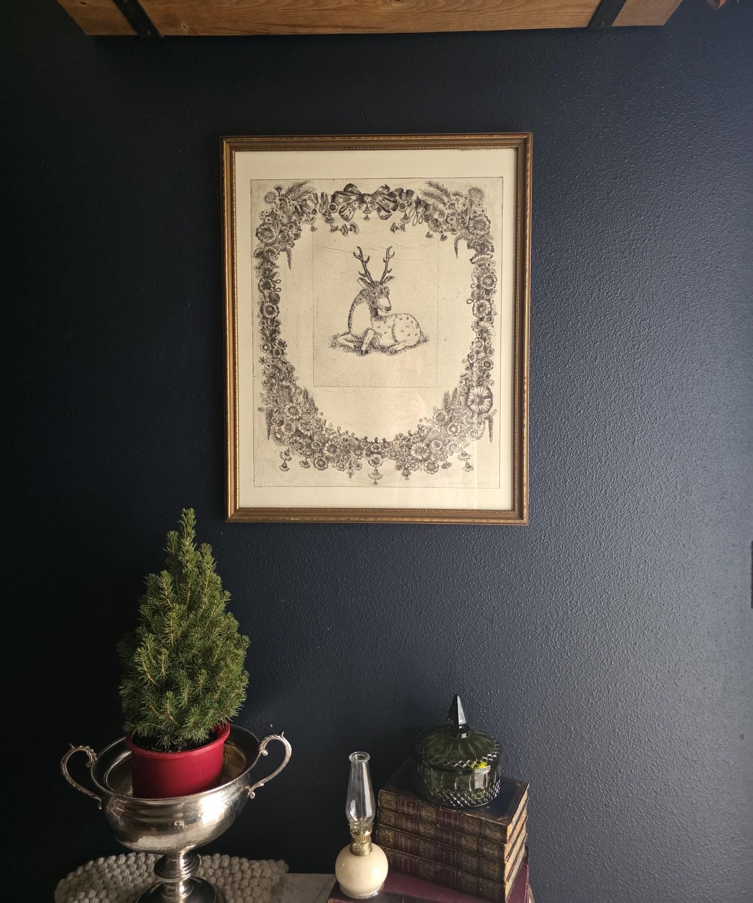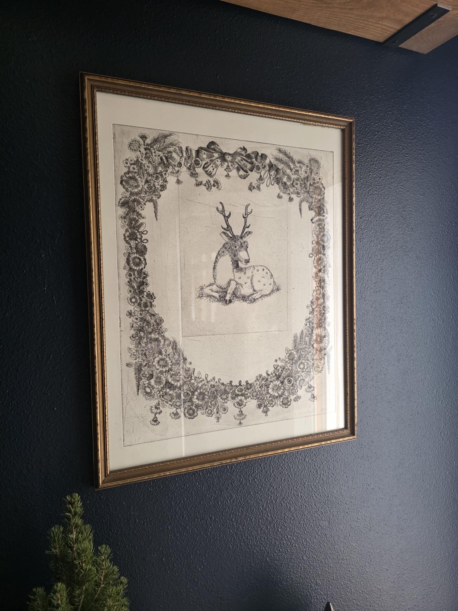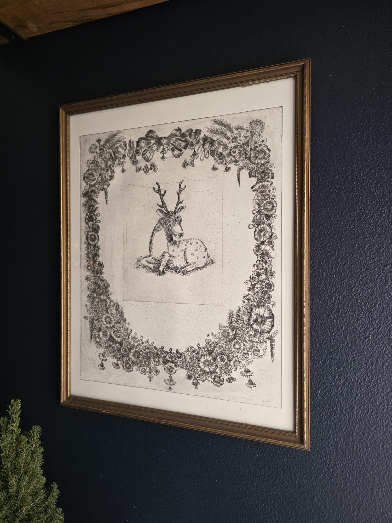 The print is an intaglio print (likely an etching or drypoint), characterized by the fine, linear detail and the visible impression mark from the metal plate. The elaborate ornamentation of the surrounding wreath—complete with lush flowers, bows, and tassels—creates a dramatic contrast with the simply rendered stag at the center.