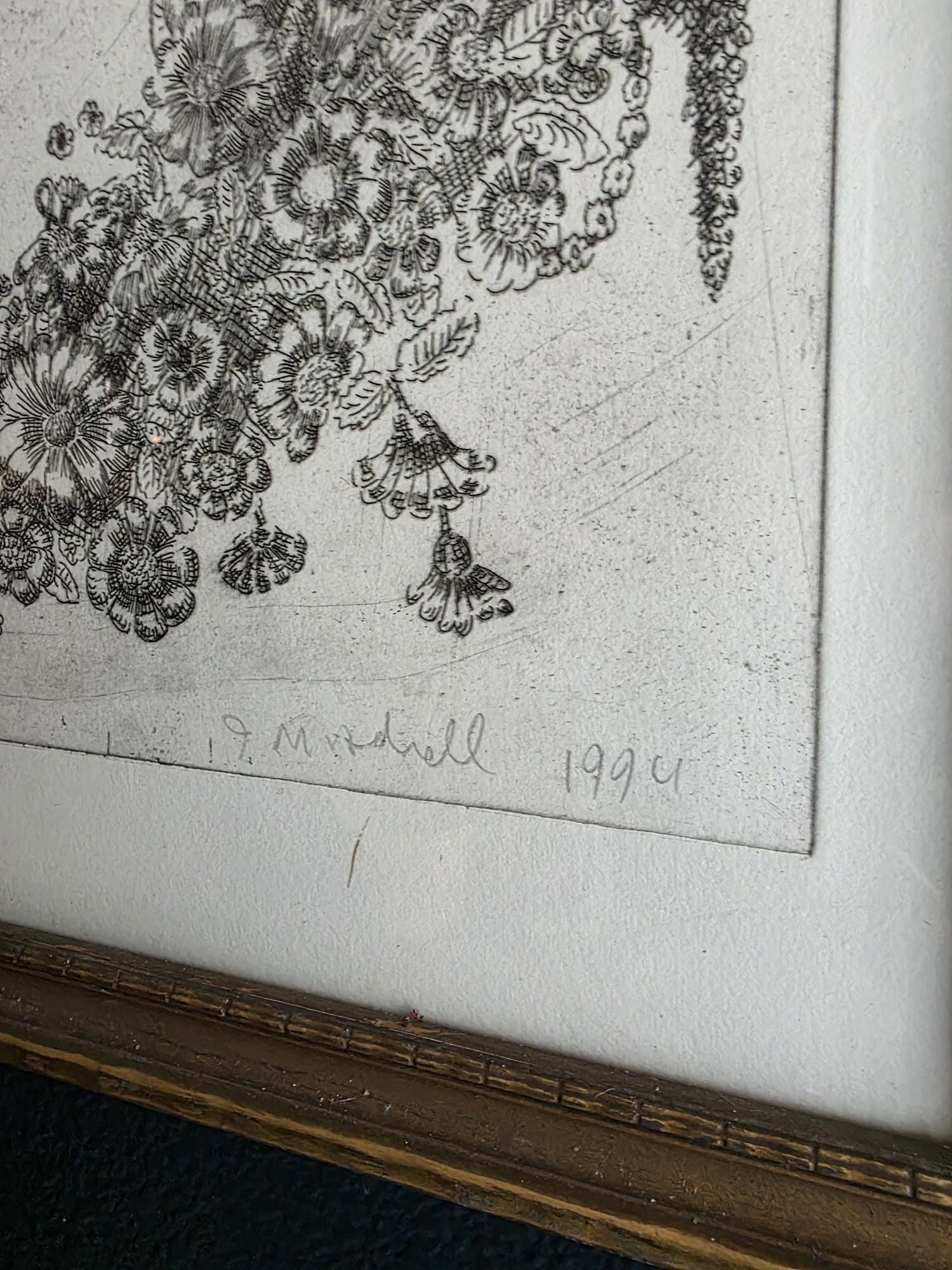 This artwork is hand-signed in pencil in the lower right corner and dated 1994. The signature is challenging to decipher, but it appears to read "T. Mitchell", "T. Mirdrell," or a very similar variation. The unique notation in the lower left is "J/P", which confirms this piece is a specialized Proof impression pulled before or outside of the standard numbered edition, making it a desirable collector's item. The print is handsomely presented in a classic gold-toned wood frame with matting, ready to display.