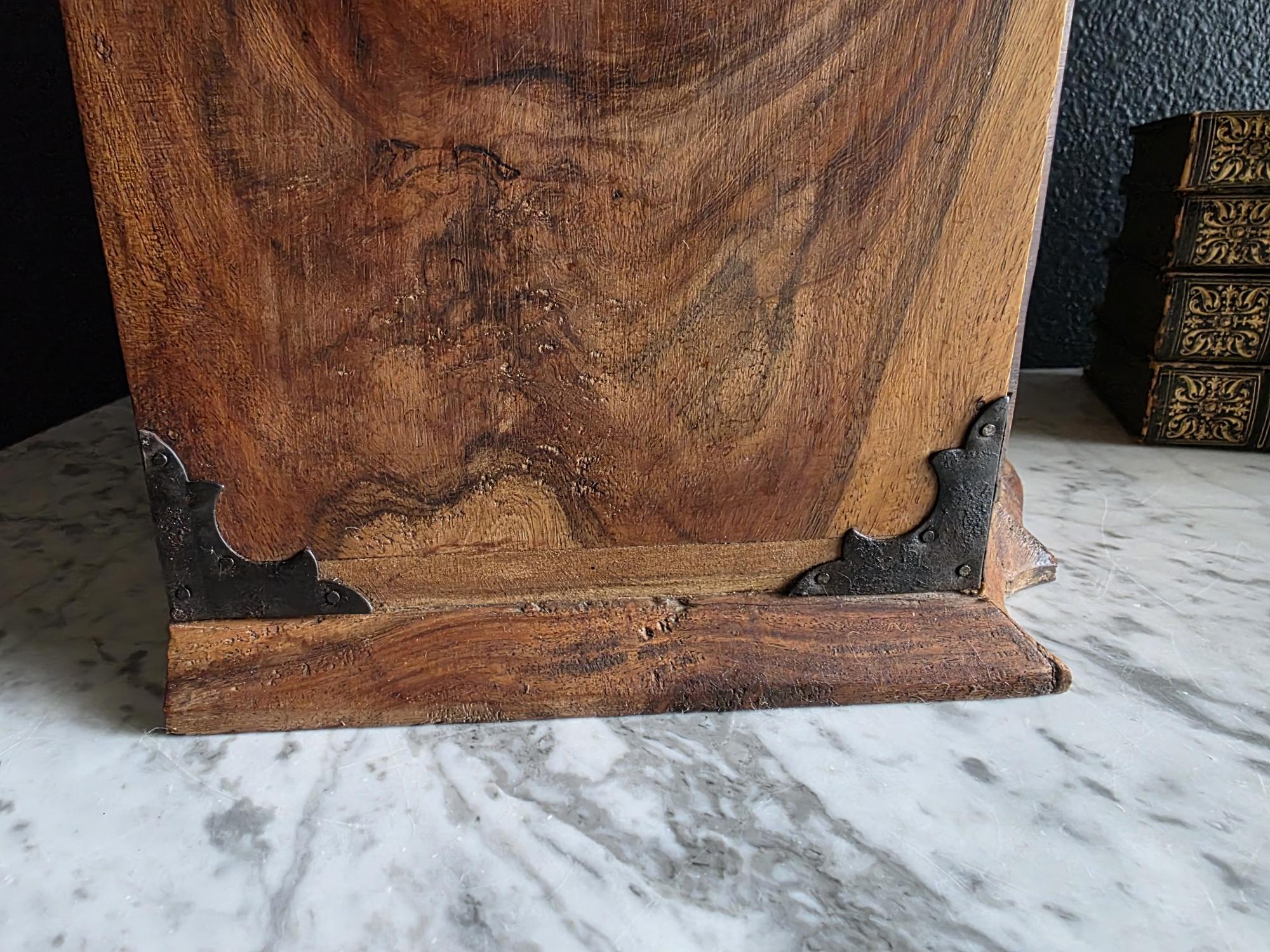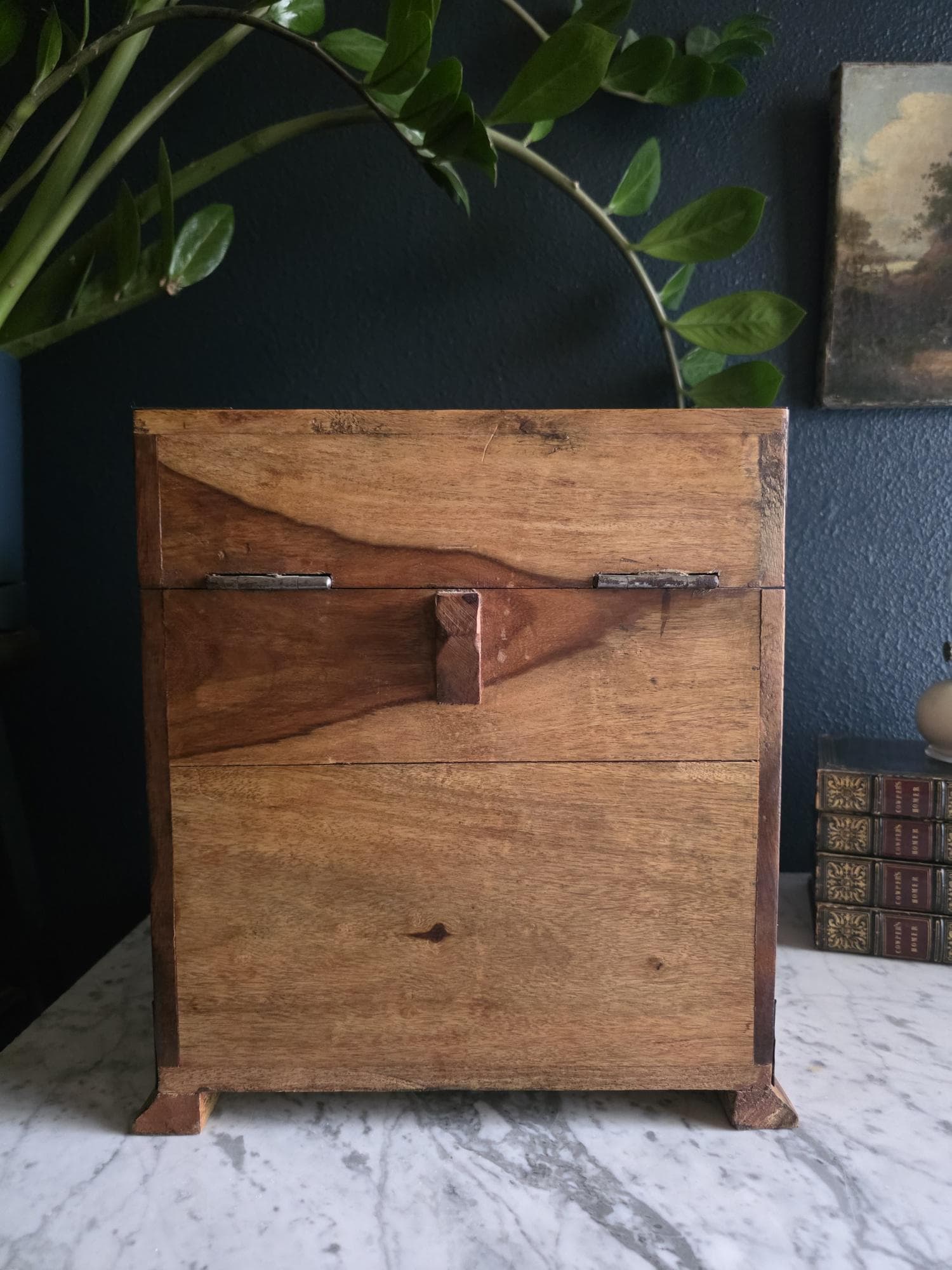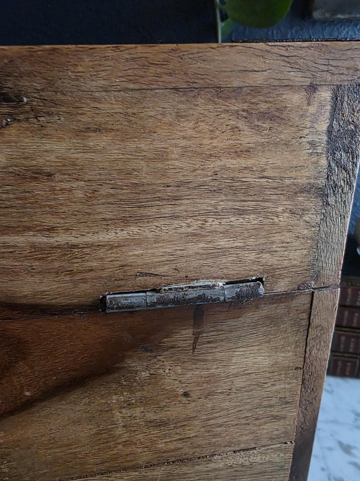 Disclosures: Hardware shows signs of age and rust. Large checking or compression crack on one side of the box. Common with aged wood. Watermark type staining on top of box. General knicks, scratches and dings to surface.