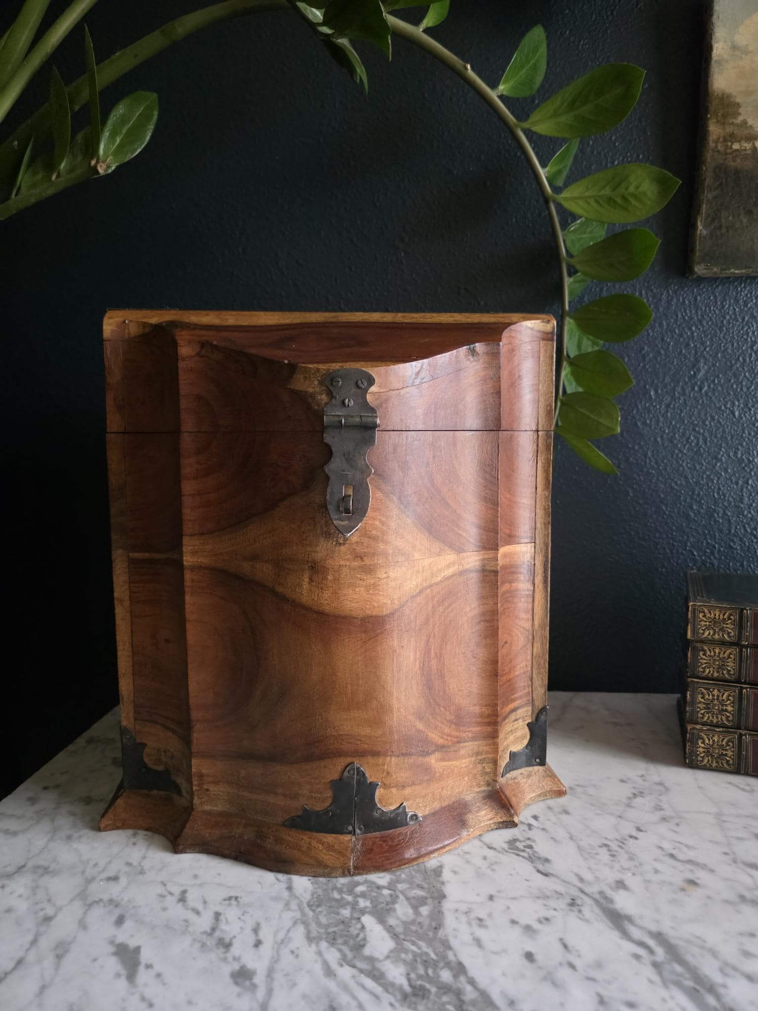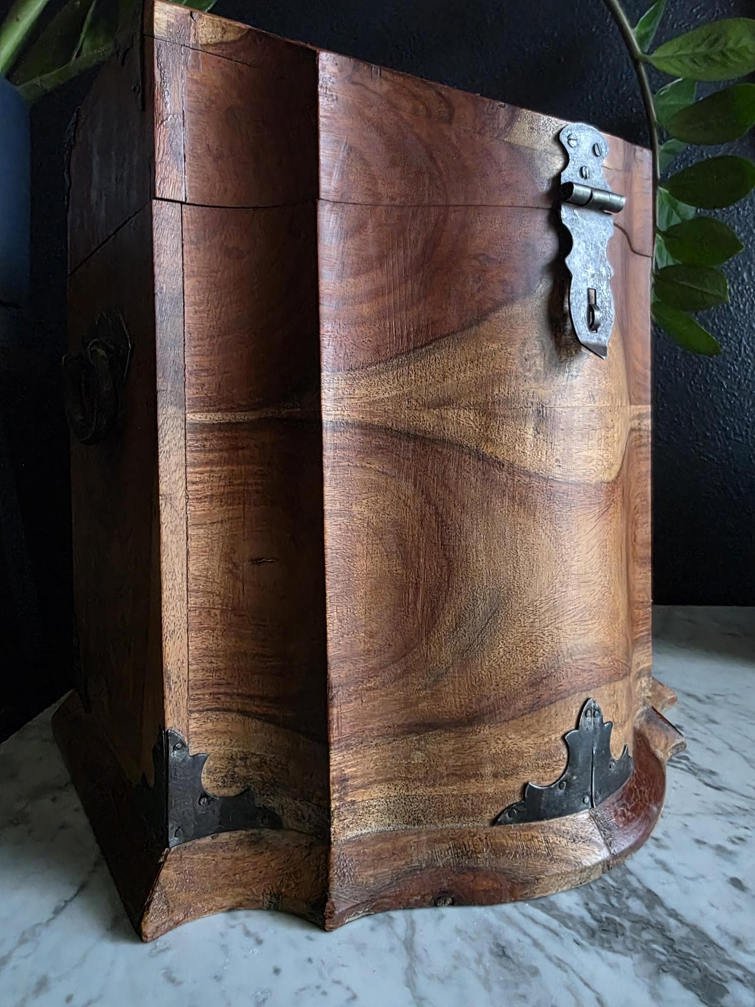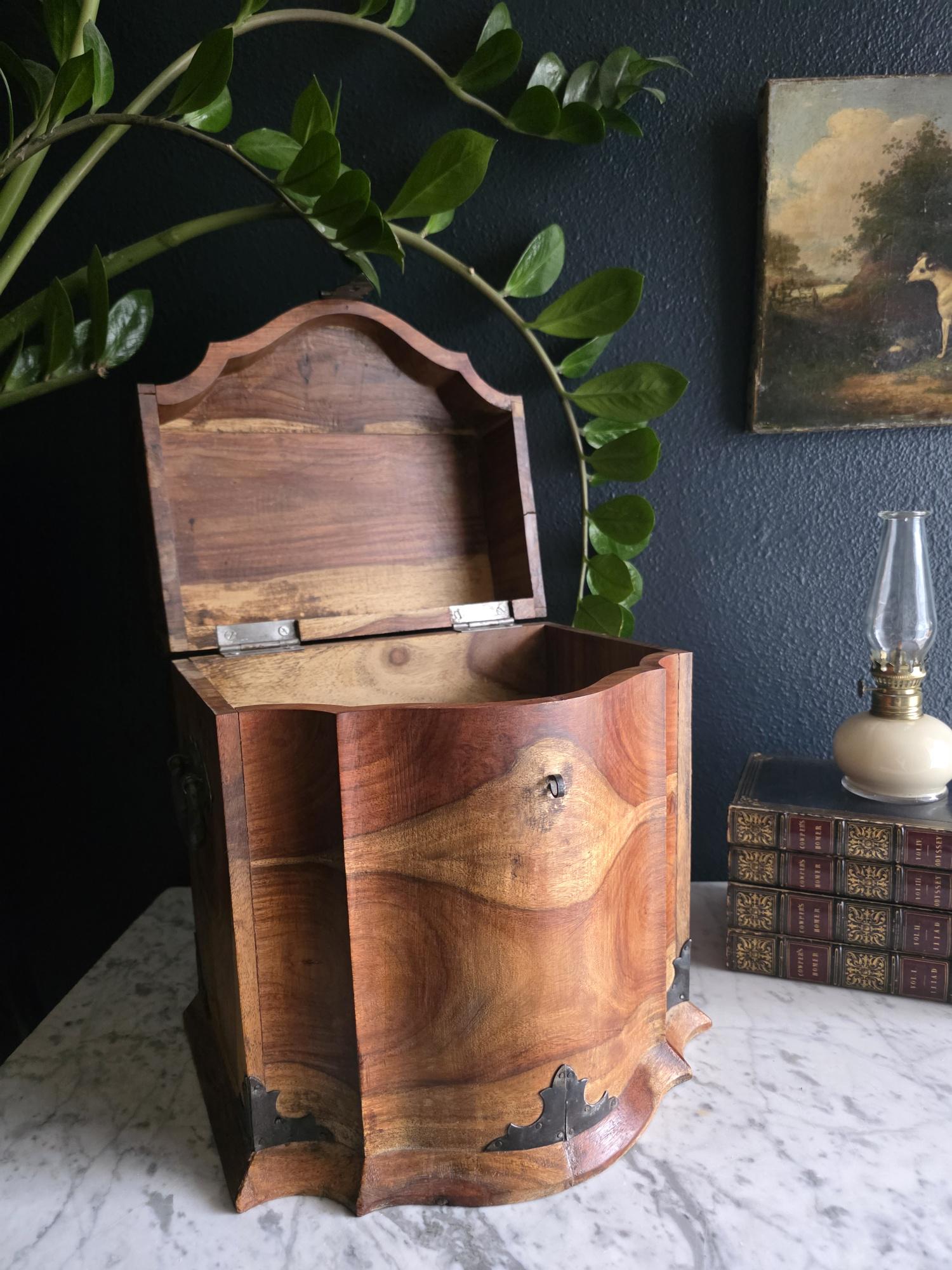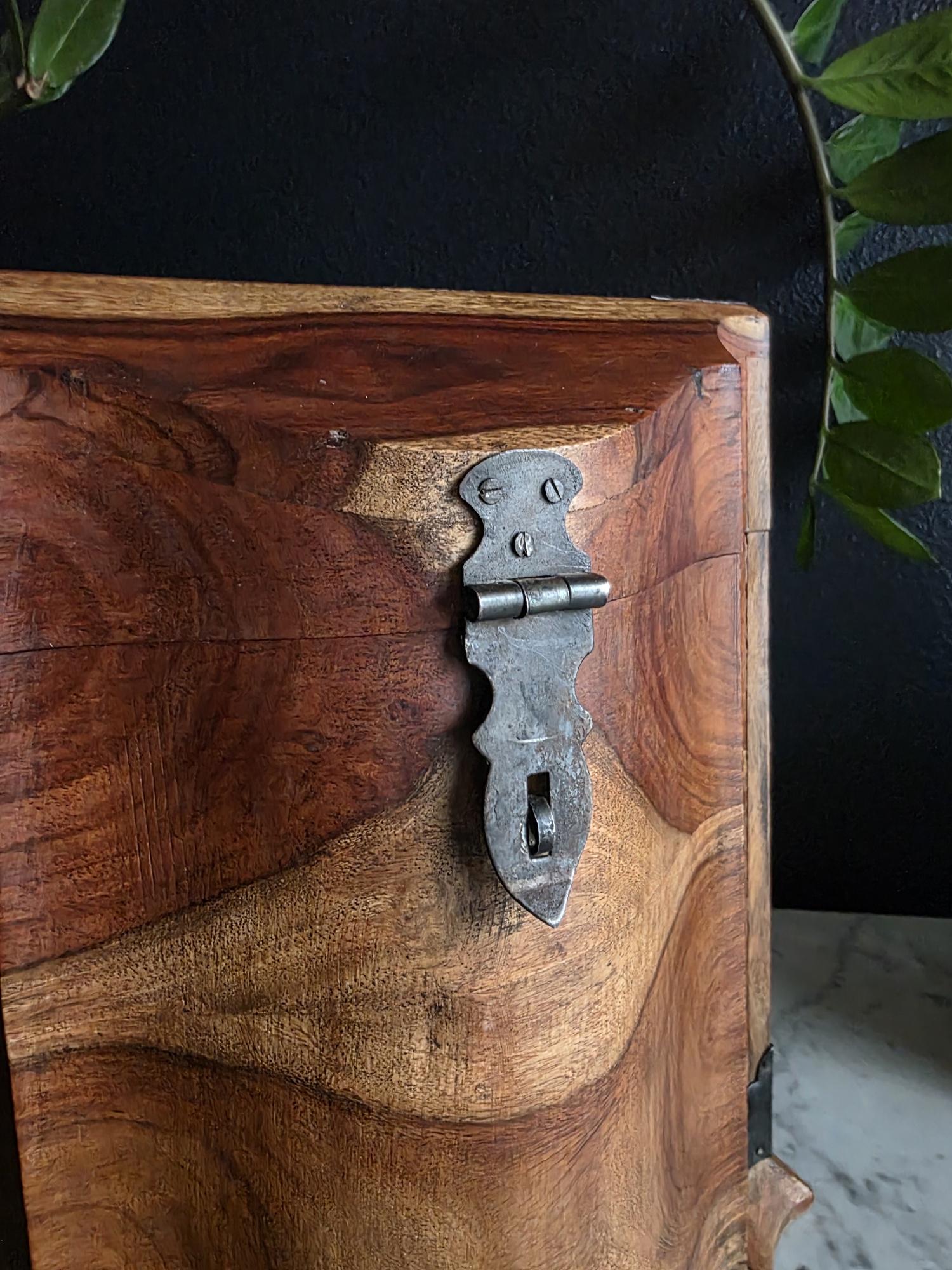 This is an exceptionally handsome and large Vintage Storage Caddy distinguished by its unique scalloped silhouette, rich color, and captivating wood grain. The piece is crafted from solid wood, likely Sheesham (Indian Rosewood), which features an incredibly active and striking wood grain that gives the chest depth and character. The highly decorative profile, with its scalloped and curved edges on the lid and base, is reminiscent of Rococo or Chippendale-style furniture. The caddy has a desirable vintage age (likely mid to late 20th century) and is complemented by rustic, matte-black Aged Iron Hardware, including decorative corner brackets, functional hinged carrying handles, and a classic locking hasp on the front. This unique chest is perfect as a decorative storage solution for documents, keepsakes, or as a stylish accent piece for an entryway or bedside.