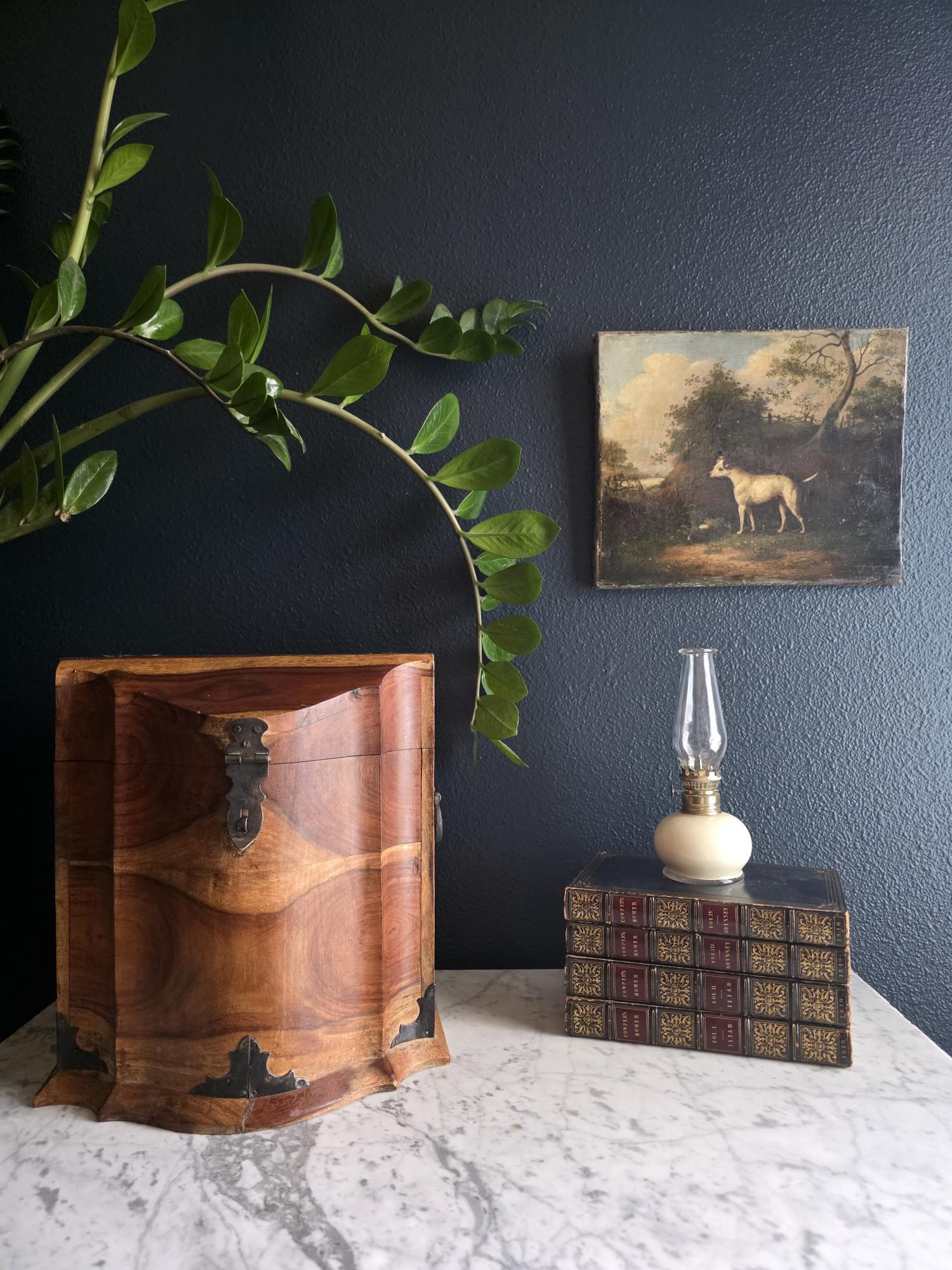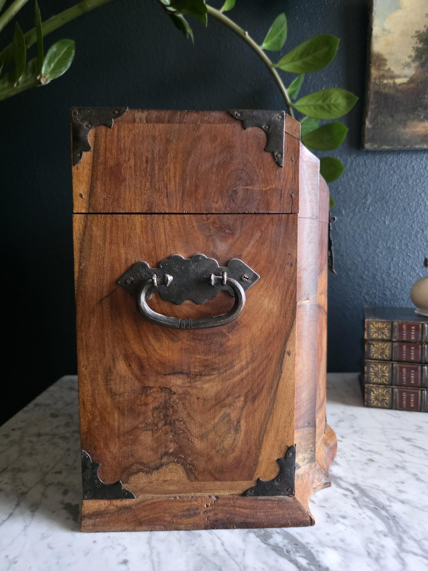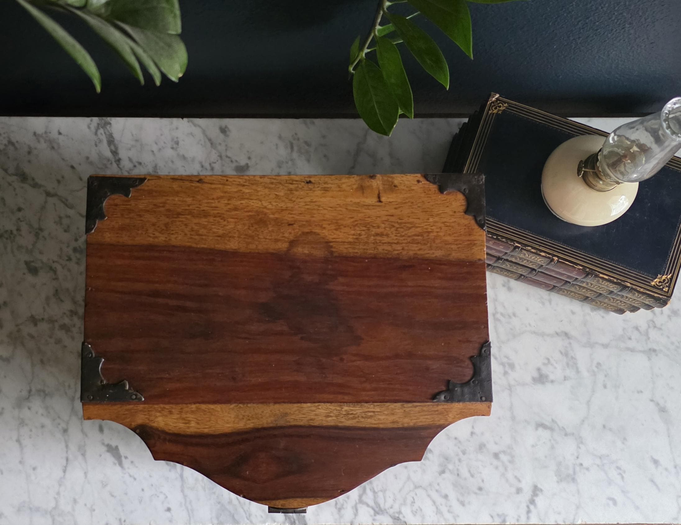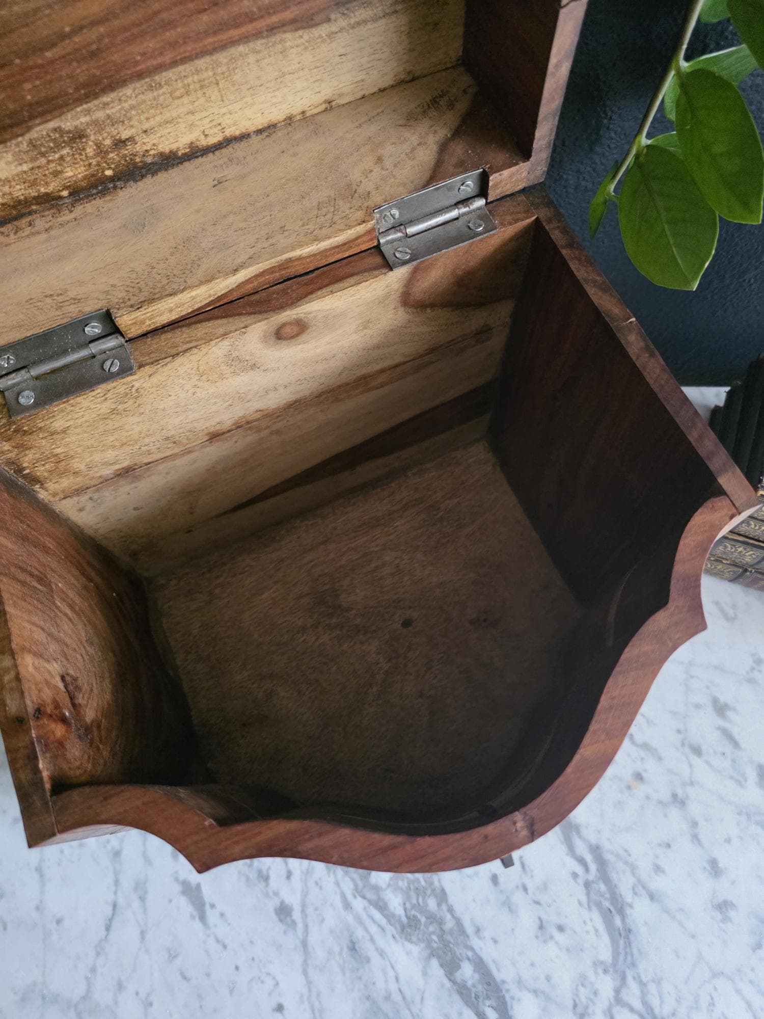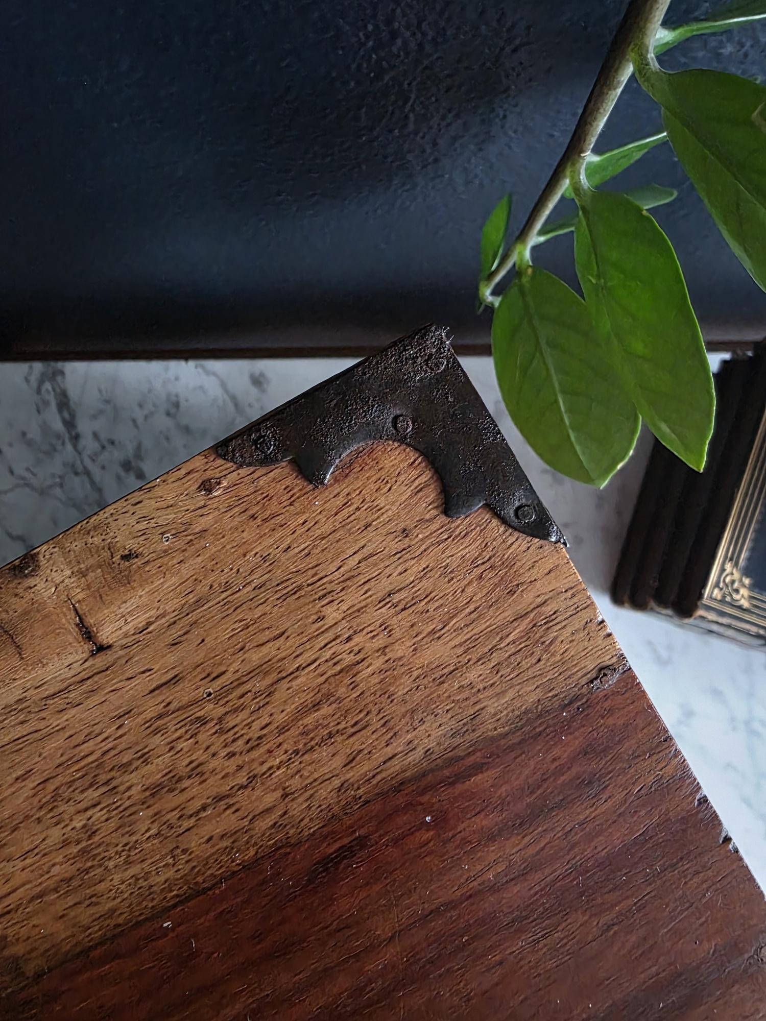 This is an exceptionally handsome and large Vintage Storage Caddy distinguished by its unique scalloped silhouette, rich color, and captivating wood grain. The piece is crafted from solid wood, likely Sheesham (Indian Rosewood), which features an incredibly active and striking wood grain that gives the chest depth and character. The highly decorative profile, with its scalloped and curved edges on the lid and base, is reminiscent of Rococo or Chippendale-style furniture. The caddy has a desirable vintage age (likely mid to late 20th century) and is complemented by rustic, matte-black Aged Iron Hardware, including decorative corner brackets, functional hinged carrying handles, and a classic locking hasp on the front. This unique chest is perfect as a decorative storage solution for documents, keepsakes, or as a stylish accent piece for an entryway or bedside.
