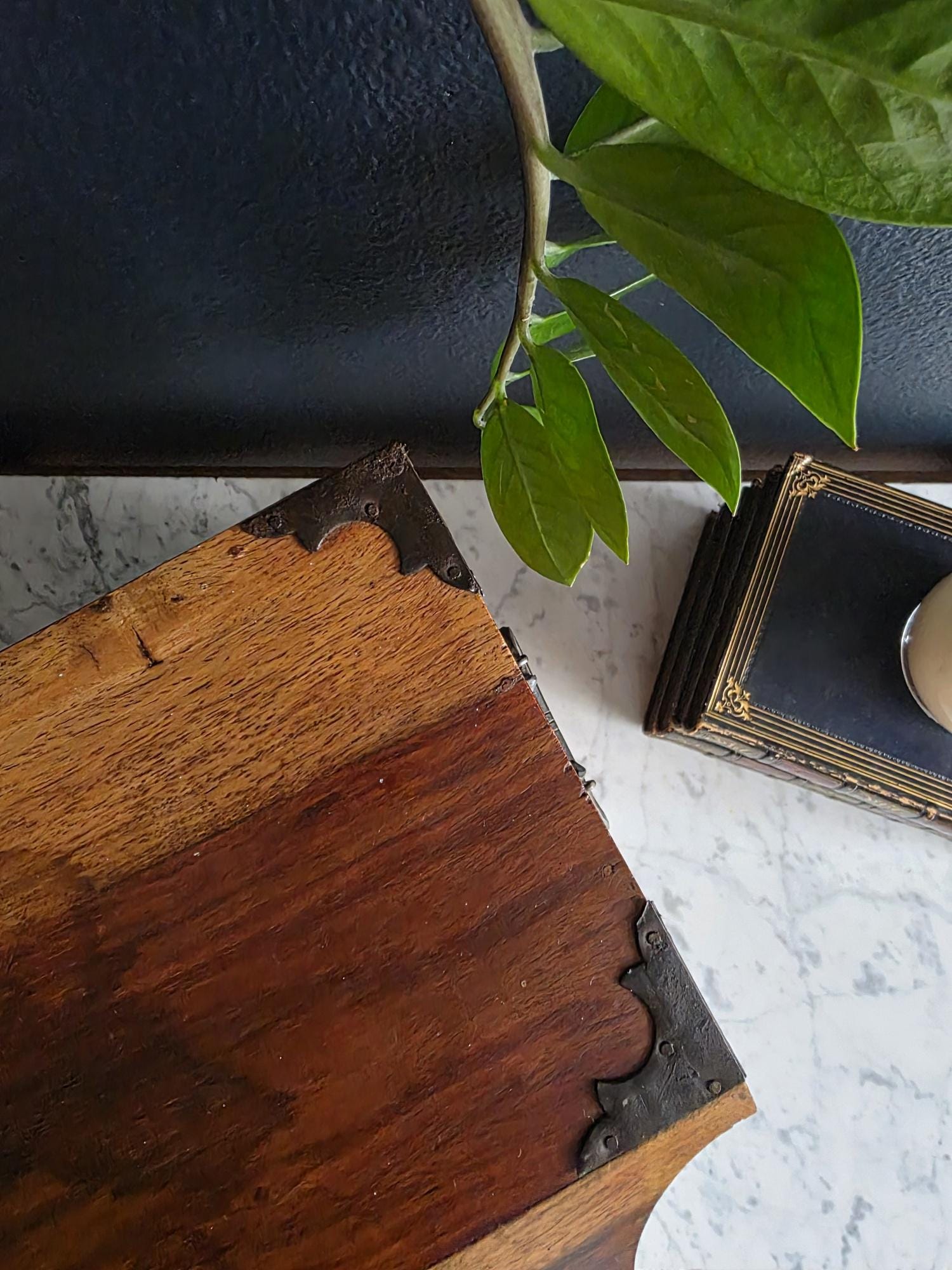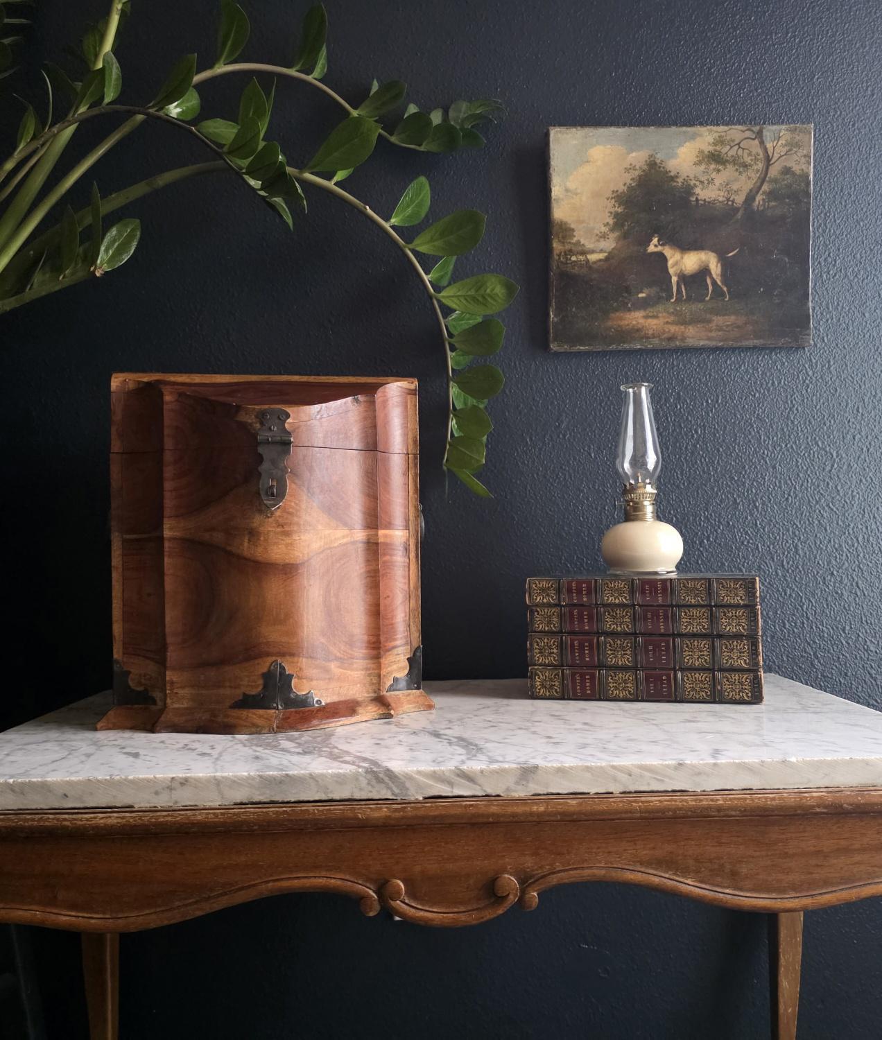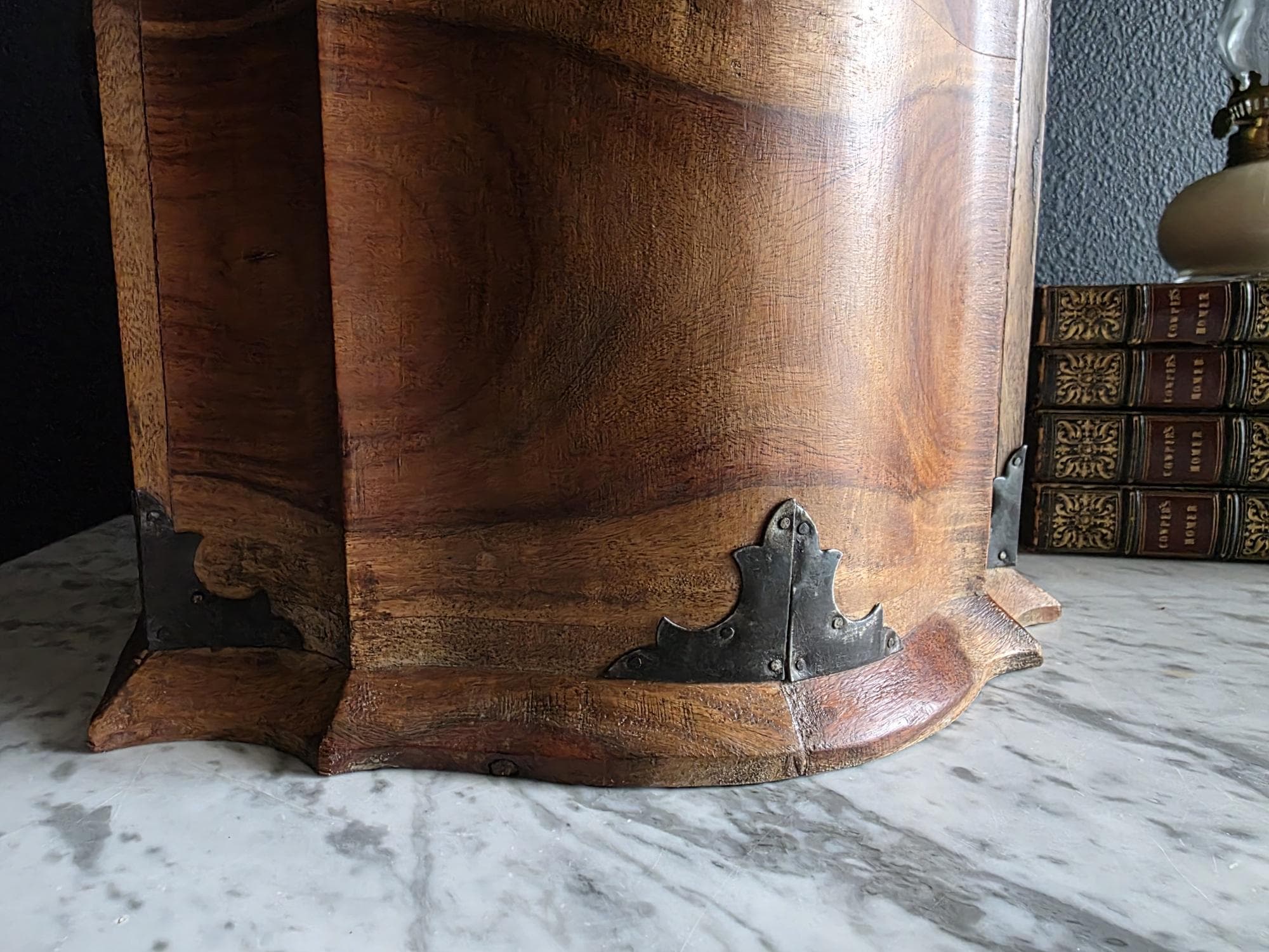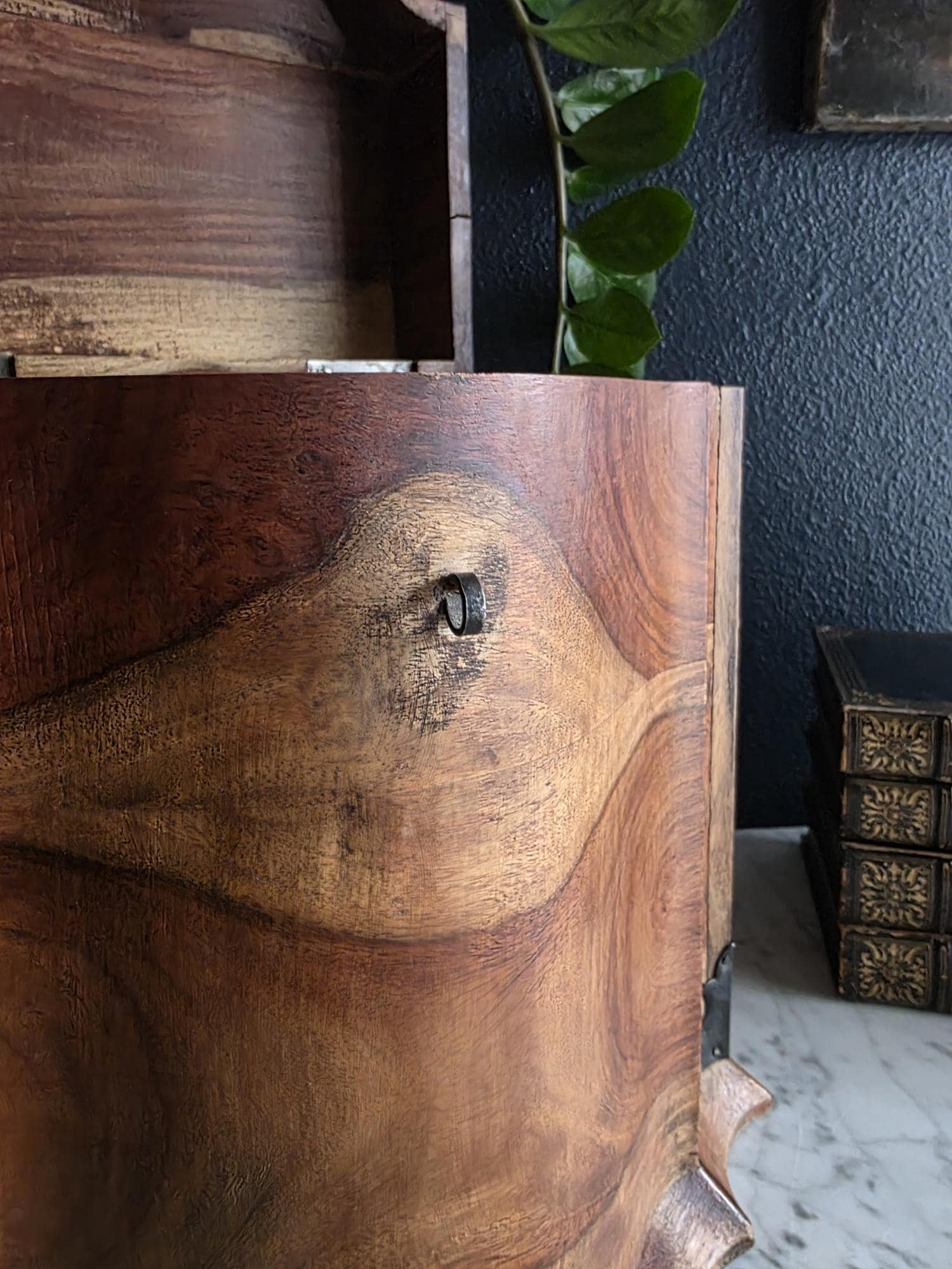 This is an exceptionally handsome and large Vintage Storage Caddy distinguished by its unique scalloped silhouette, rich color, and captivating wood grain. The piece is crafted from solid wood, likely Sheesham (Indian Rosewood), which features an incredibly active and striking wood grain that gives the chest depth and character. The highly decorative profile, with its scalloped and curved edges on the lid and base, is reminiscent of Rococo or Chippendale-style furniture. The caddy has a desirable vintage age (likely mid to late 20th century) and is complemented by rustic, matte-black Aged Iron Hardware, including decorative corner brackets, functional hinged carrying handles, and a classic locking hasp on the front. This unique chest is perfect as a decorative storage solution for documents, keepsakes, or as a stylish accent piece for an entryway or bedside.