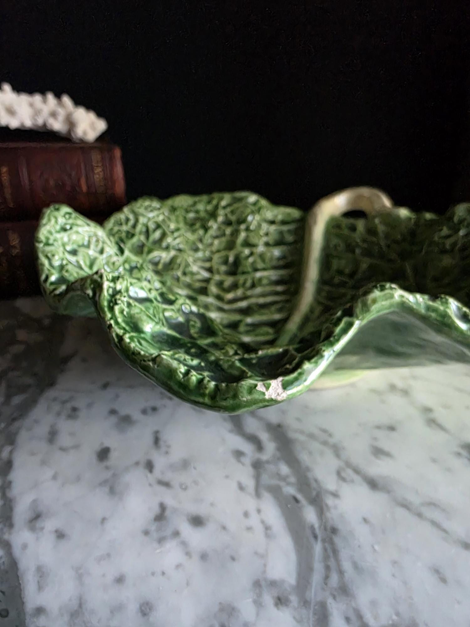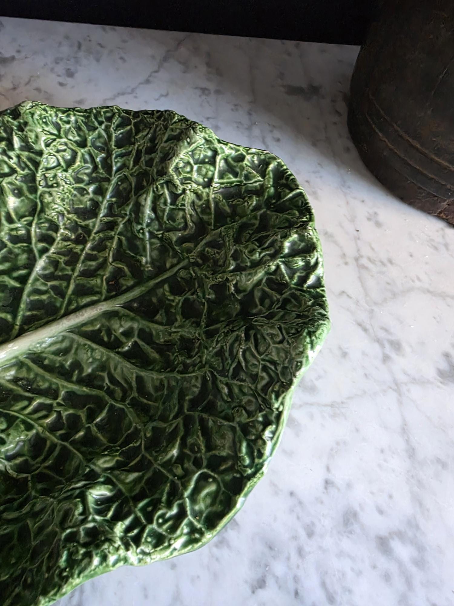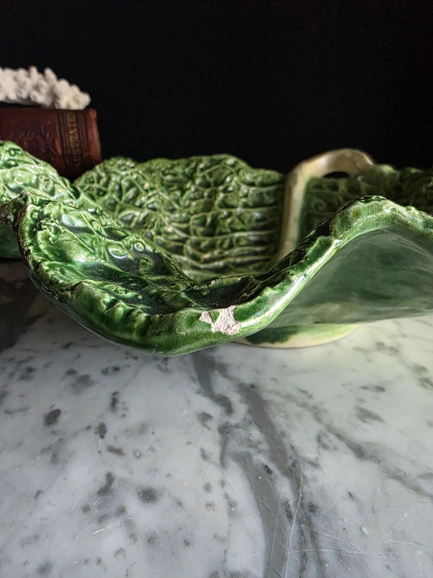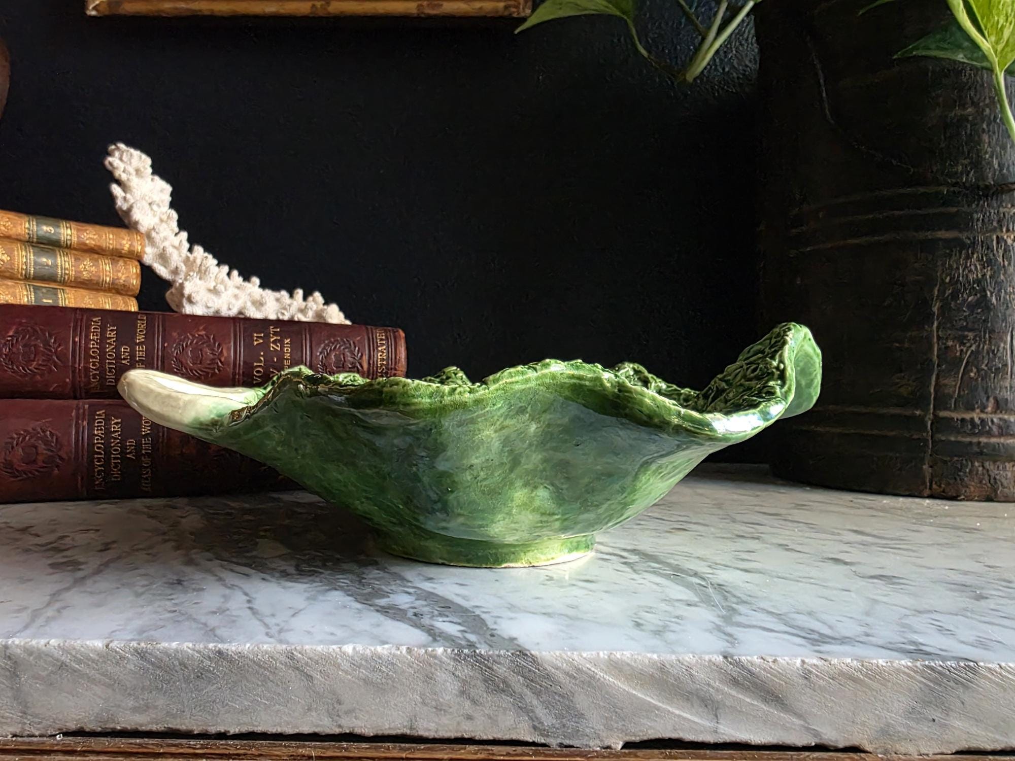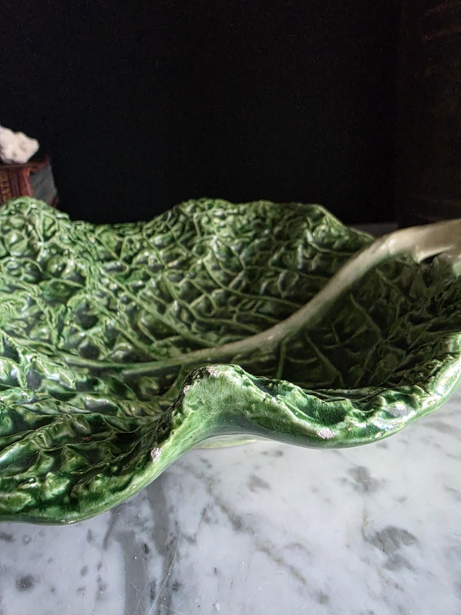 Discover this exceptional piece of vintage Portuguese earthenware, showcasing a stunning interpretation of the classic Cabbage Ware style. Unlike smoother, more common examples, this shallow serving dish is defined by its dramatic, highly textured surface, meticulously molded to replicate the deep crinkles and prominent veins of a ruffled cabbage or savoy leaf. The rich, variegated green glaze pools beautifully into the deep crevices, creating shadows and highlights that give the piece incredible depth and realism, making it a standout decorative object or serving platter.