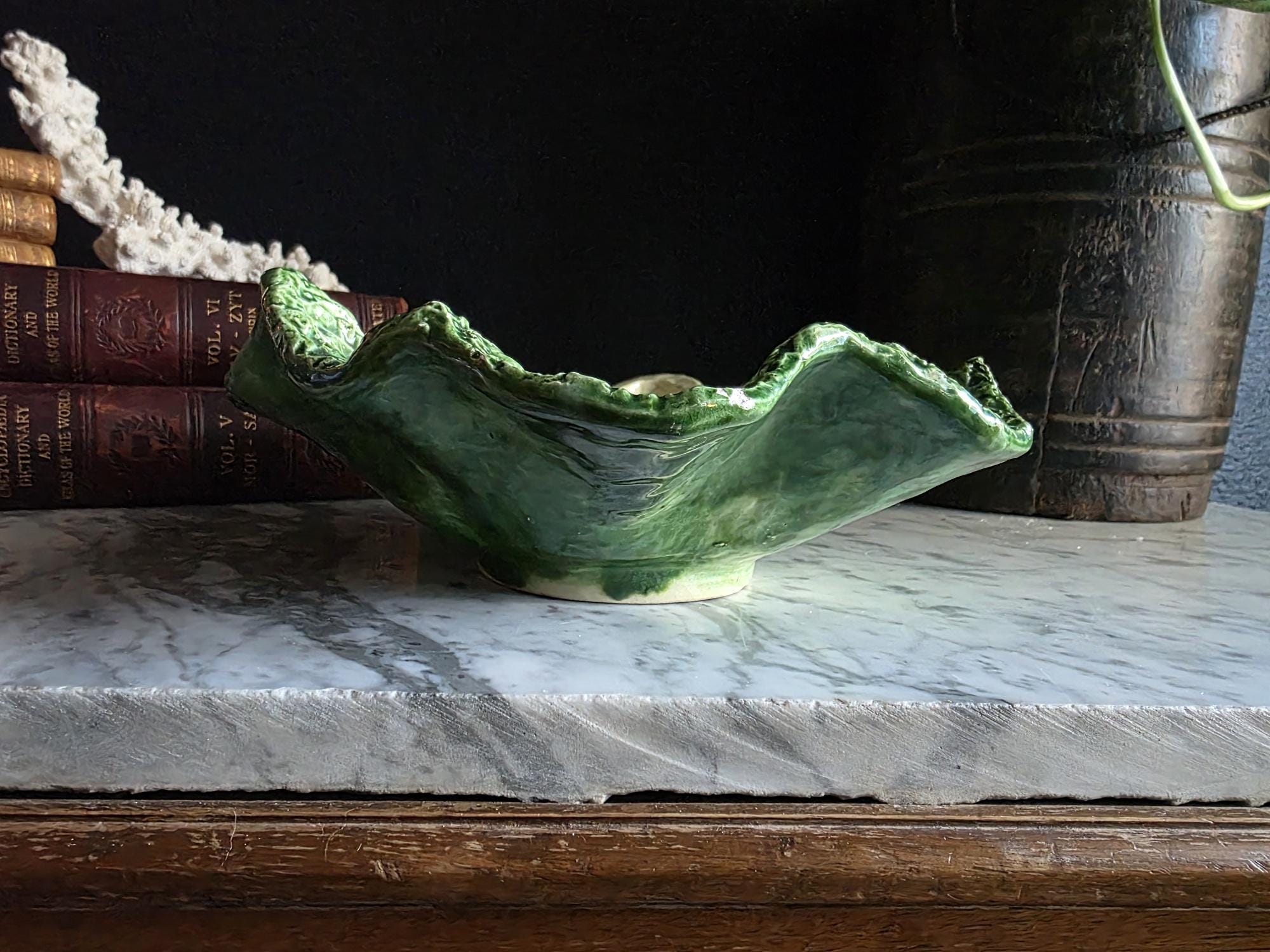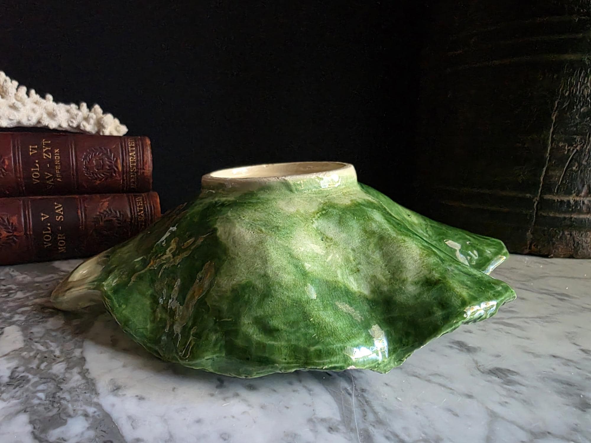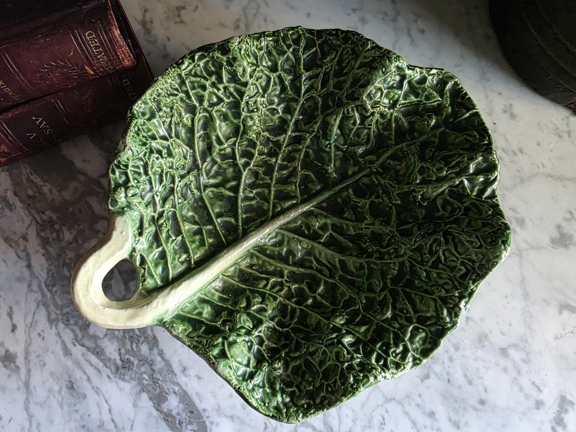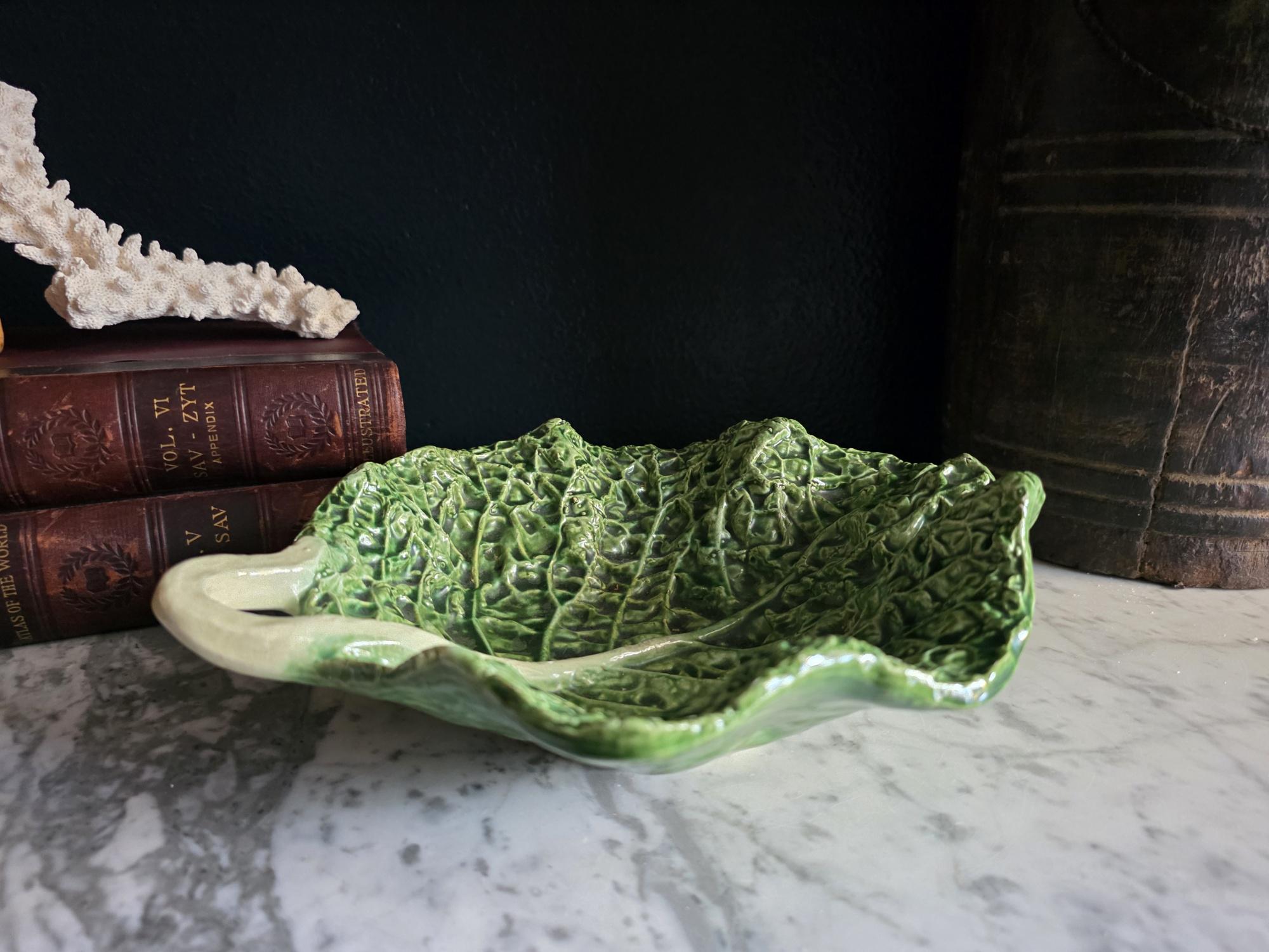 Discover this exceptional piece of vintage Portuguese earthenware, showcasing a stunning interpretation of the classic Cabbage Ware style. Unlike smoother, more common examples, this shallow serving dish is defined by its dramatic, highly textured surface, meticulously molded to replicate the deep crinkles and prominent veins of a ruffled cabbage or savoy leaf. The rich, variegated green glaze pools beautifully into the deep crevices, creating shadows and highlights that give the piece incredible depth and realism, making it a standout decorative object or serving platter.