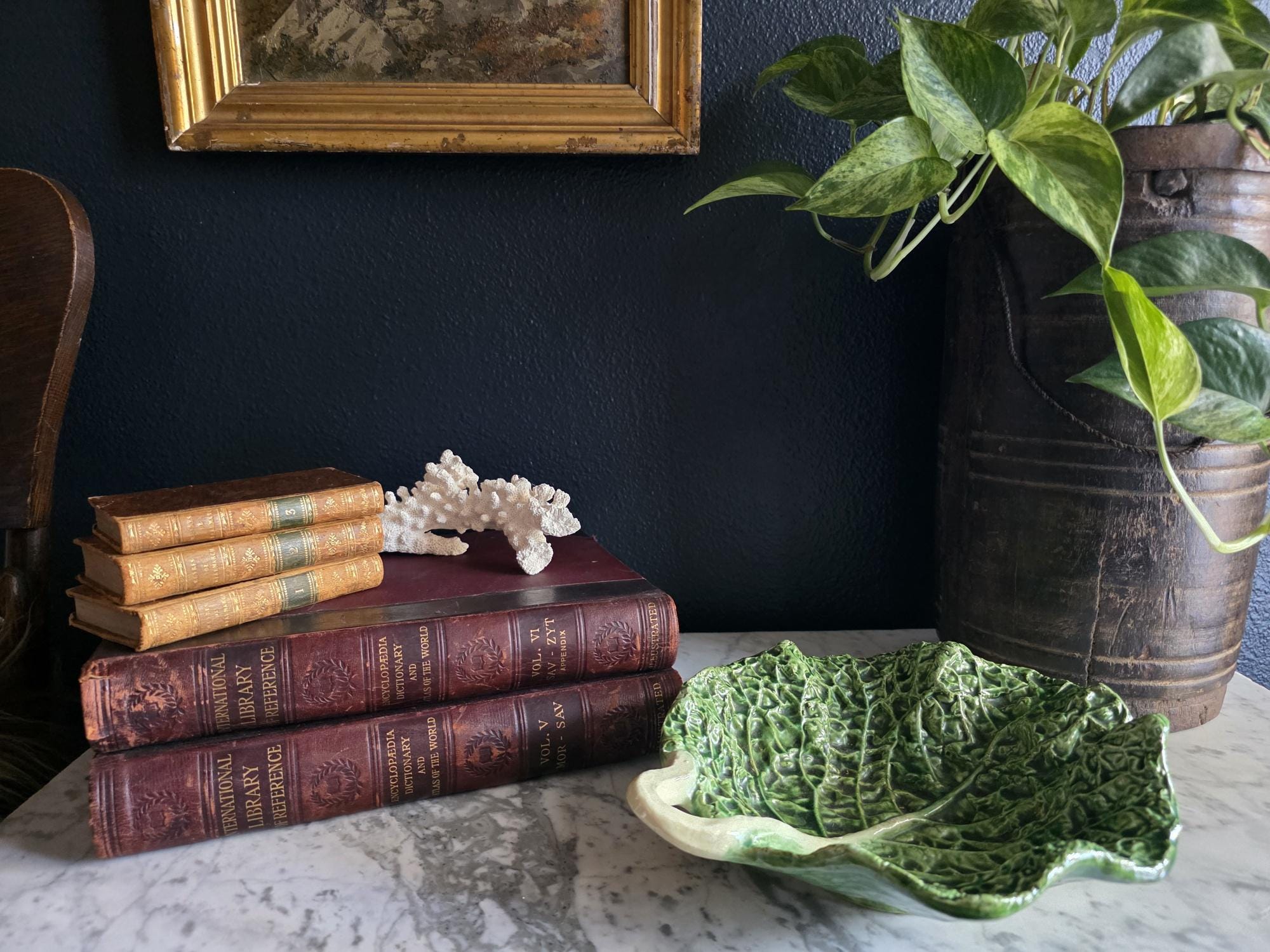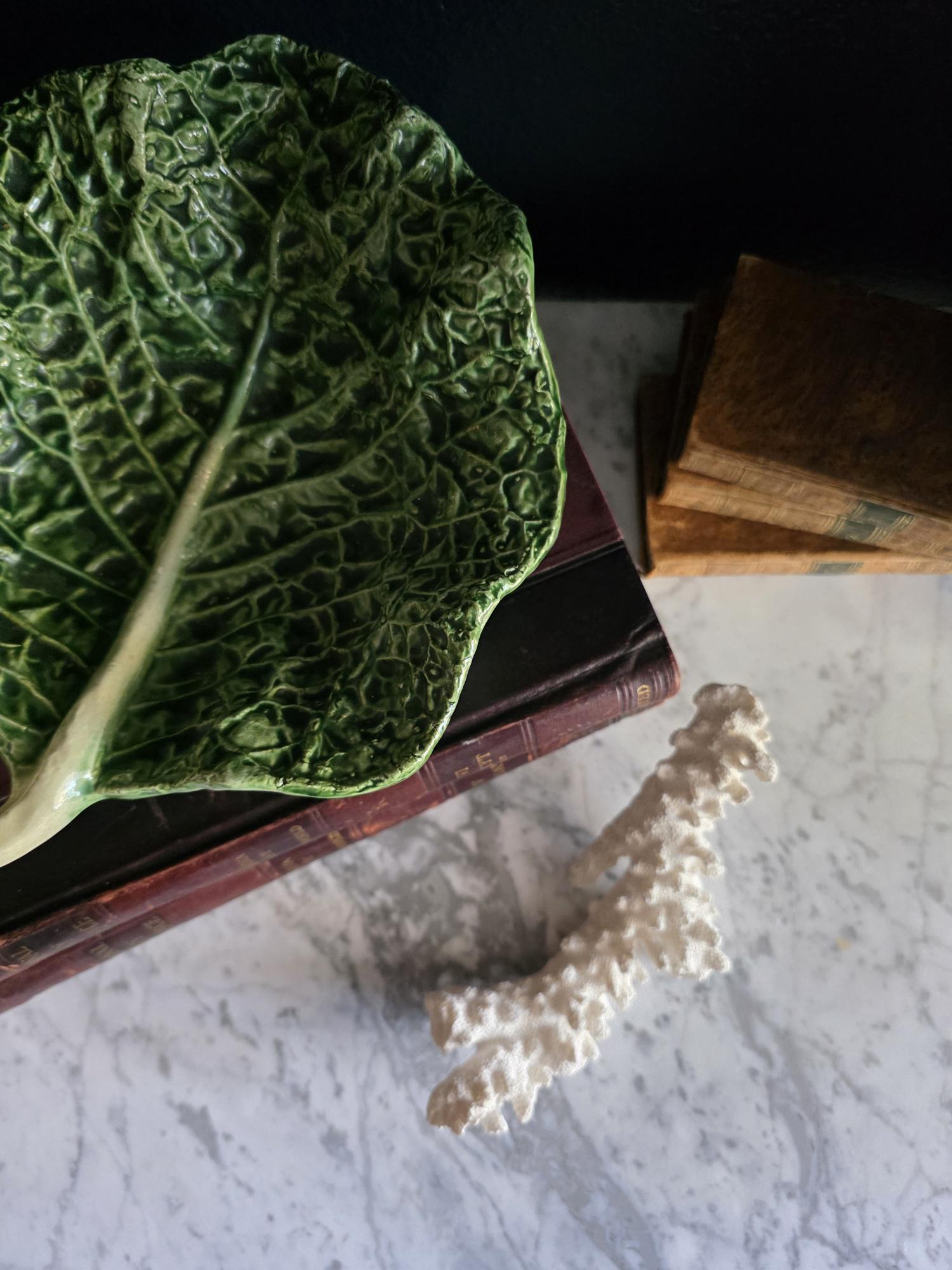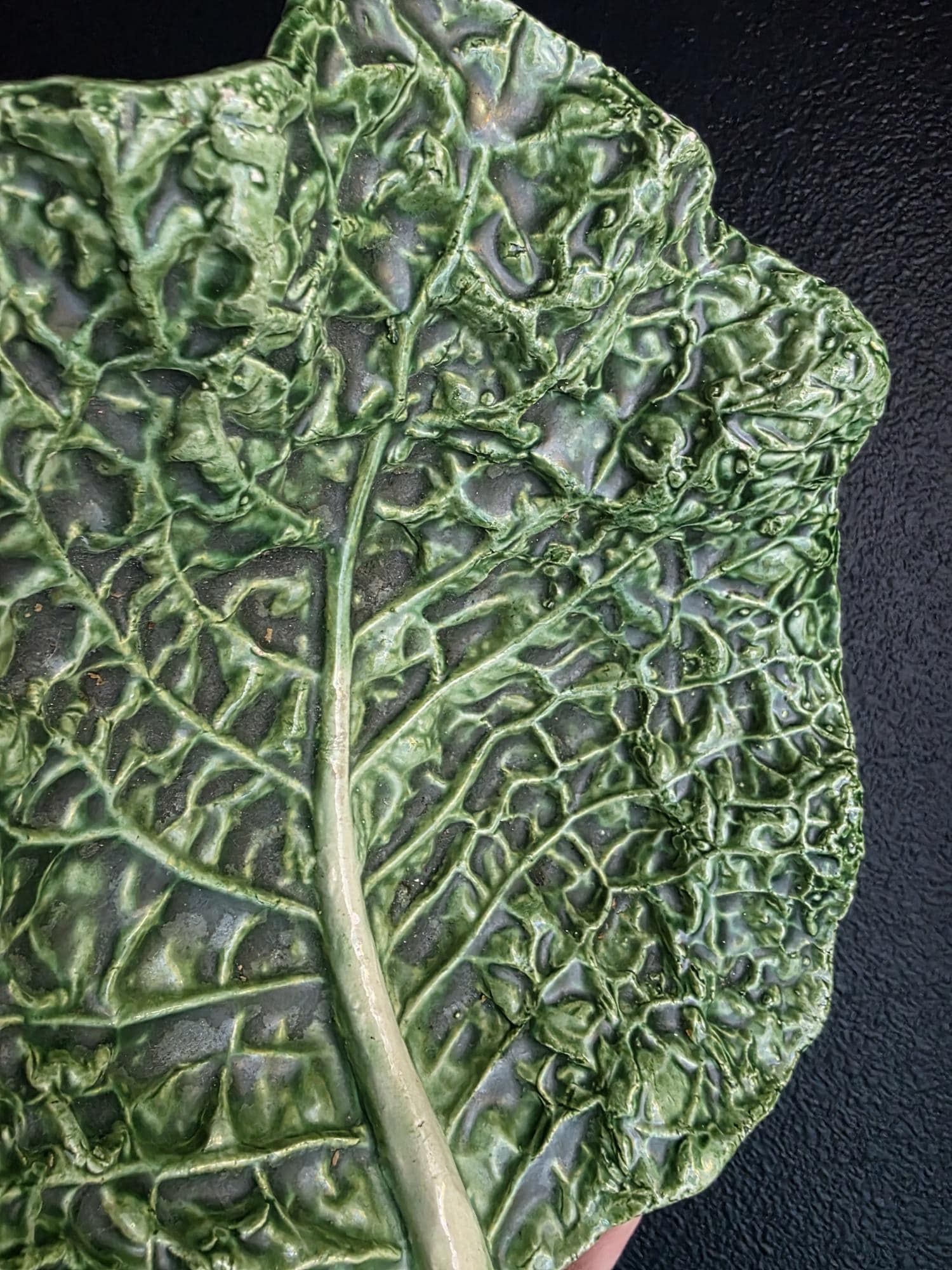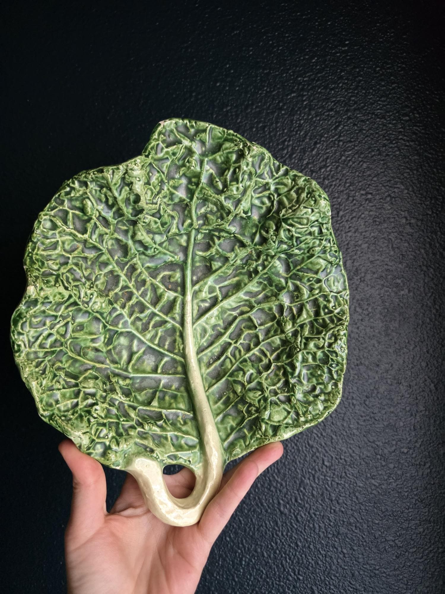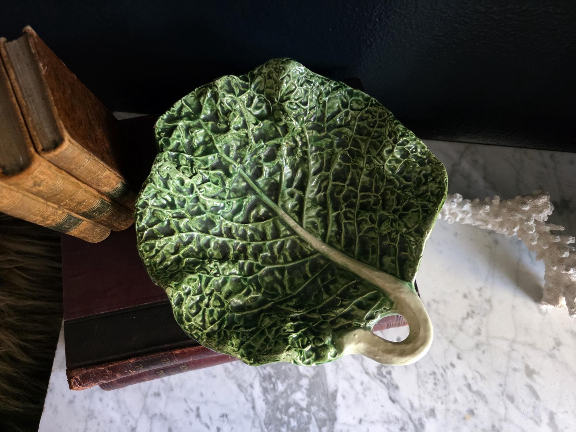 Discover this exceptional piece of vintage Portuguese earthenware, showcasing a stunning interpretation of the classic Cabbage Ware style. Unlike smoother, more common examples, this shallow serving dish is defined by its dramatic, highly textured surface, meticulously molded to replicate the deep crinkles and prominent veins of a ruffled cabbage or savoy leaf. The rich, variegated green glaze pools beautifully into the deep crevices, creating shadows and highlights that give the piece incredible depth and realism, making it a standout decorative object or serving platter.