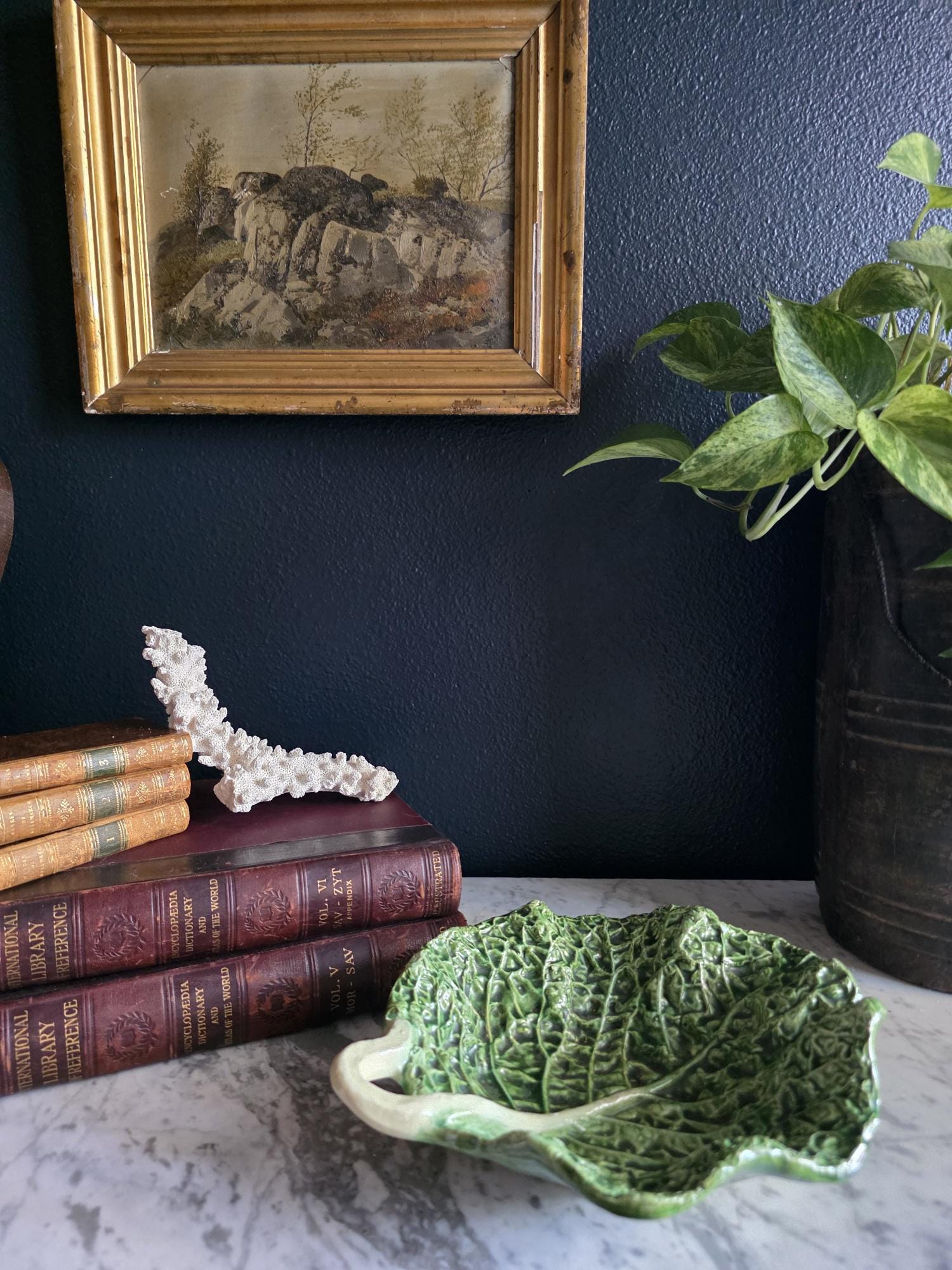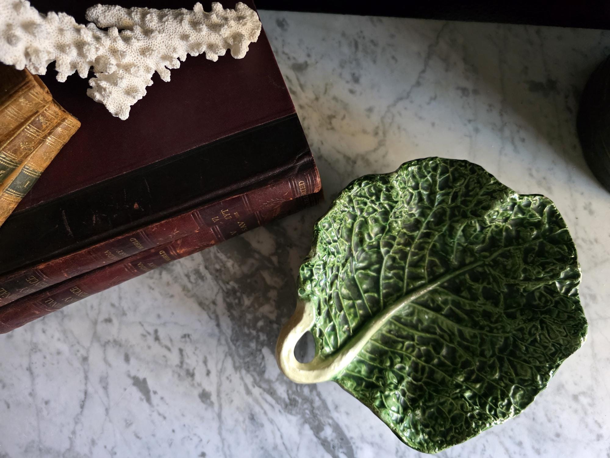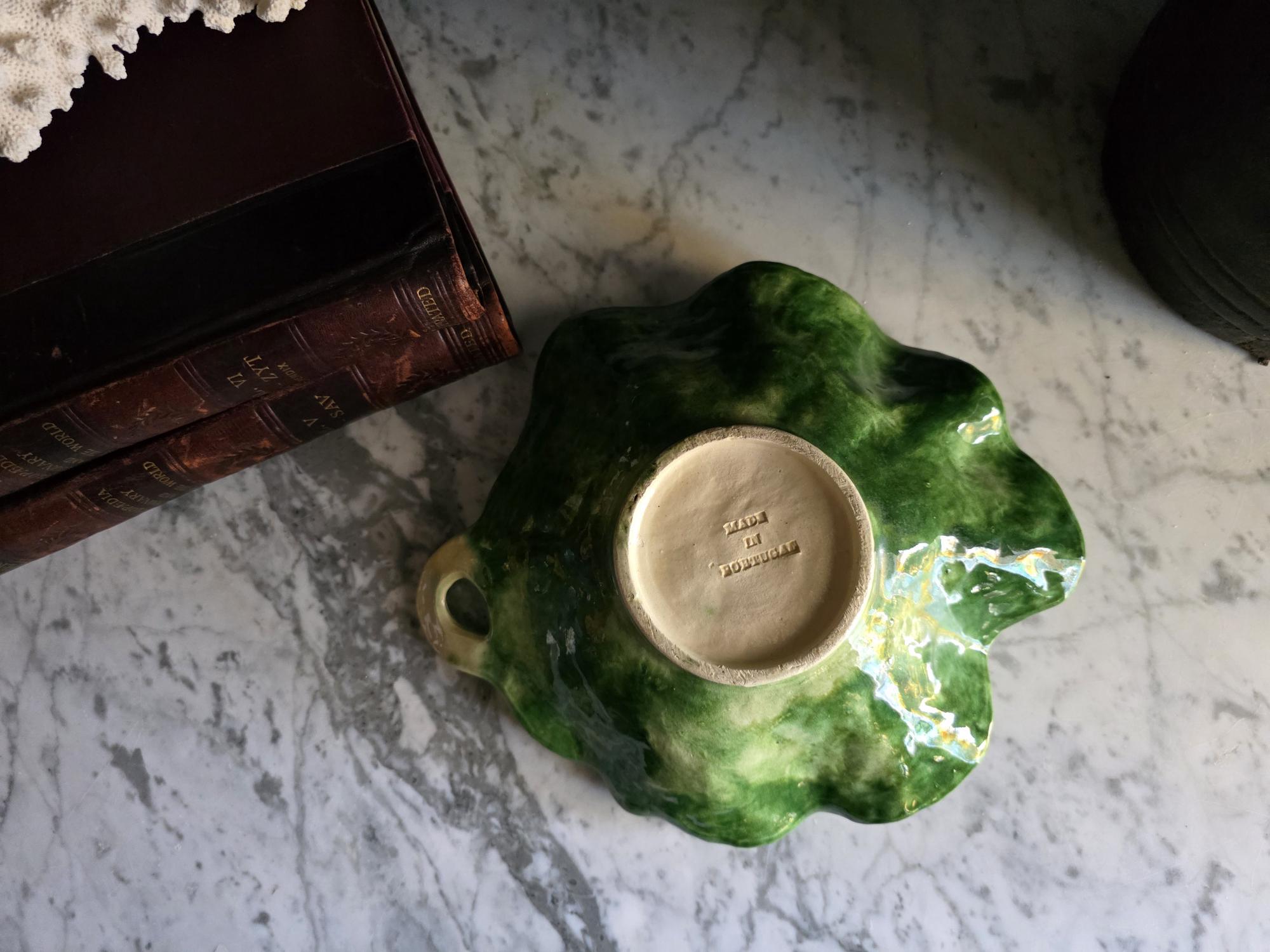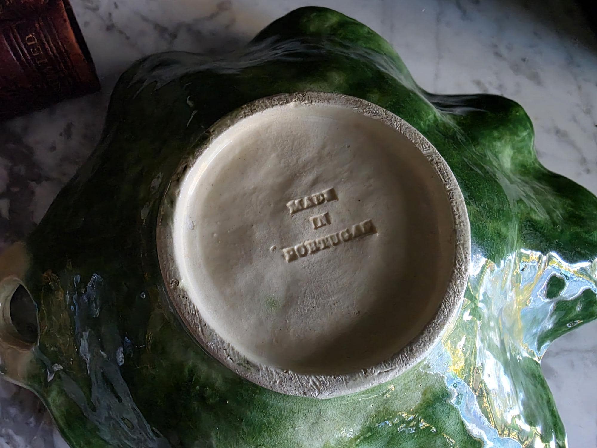 Stamped "MADE IN PORTUGAL" on the base, this dish is part of the tradition of high-quality Majolica and Palissy-style ceramics produced in the region during the mid-20th century (c. 1950s–1980s). It features a subtle, creamy white stem or handle, completing the organic look. Packed with charming, well-loved character. Perfect for serving, using at a catch-all dish, or simply displaying as a unique, sculptural accent piece in a kitchen, dining room, or curio cabinet.