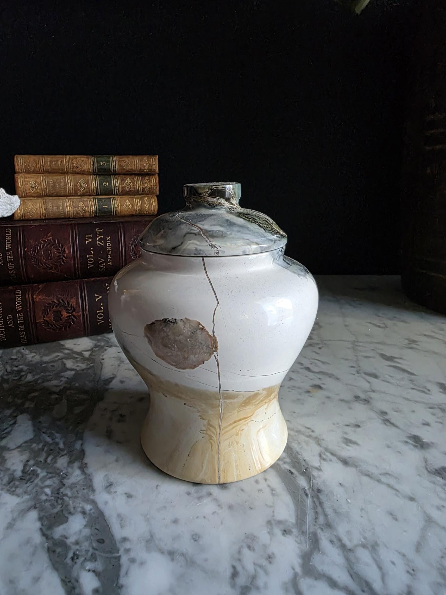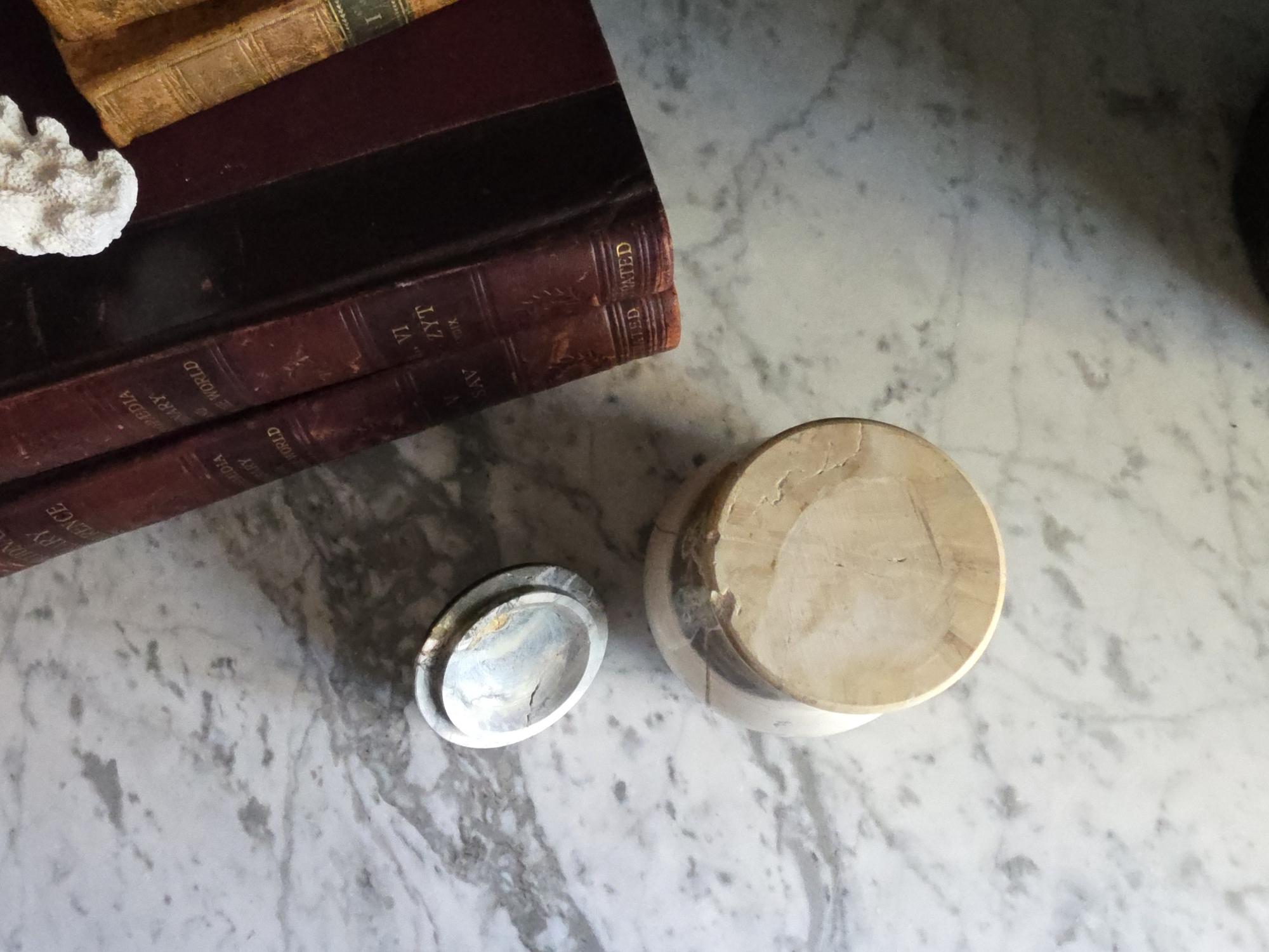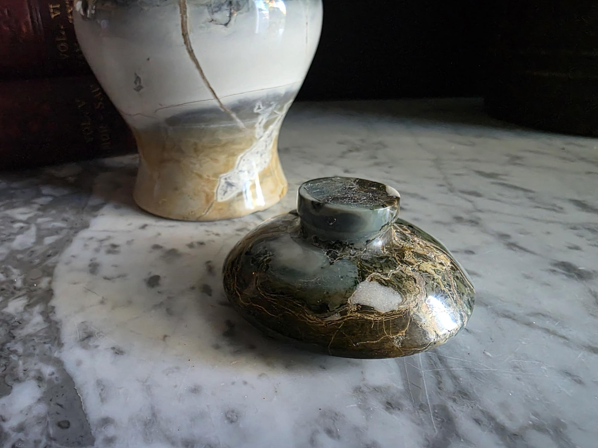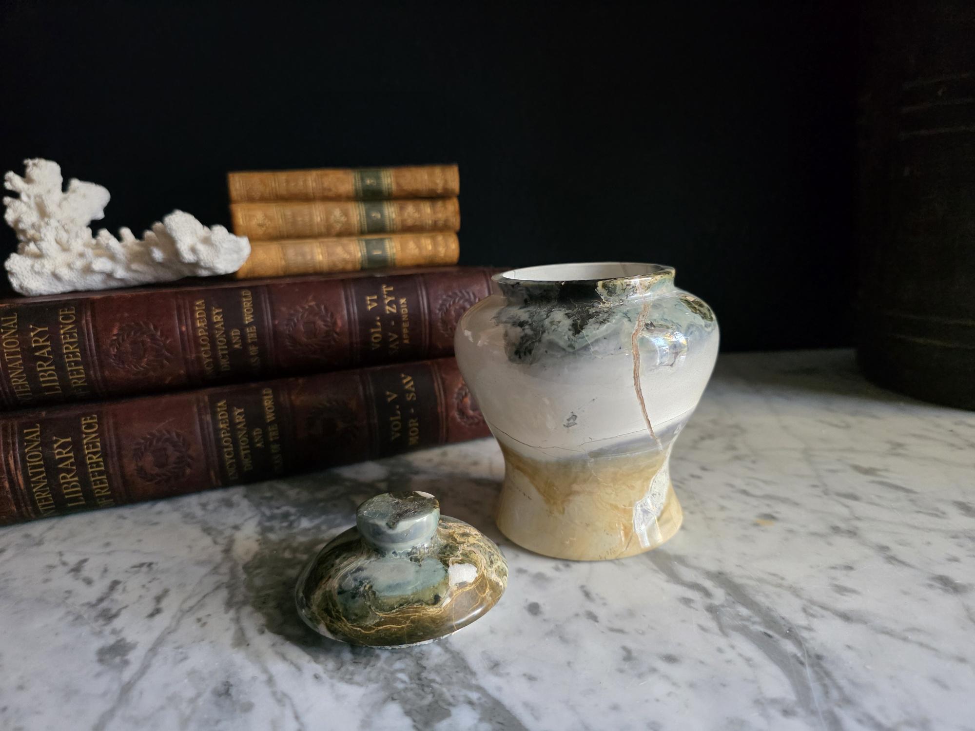 Please note that as a natural stone product, this vessel showcases the raw history of the material. The surface displays prominent natural fissures, crystalline inclusions, and distinct vertical veining that are inherent to the rock structure. These characteristics are not defects but rather the "birthmarks" of the stone, adding to its rustic, brutalist charm and vintage appeal. It is the perfect size for use as a jewelry keeper, a discreet storage jar for small keepsakes, or simply as a sophisticated, heavy paperweight.