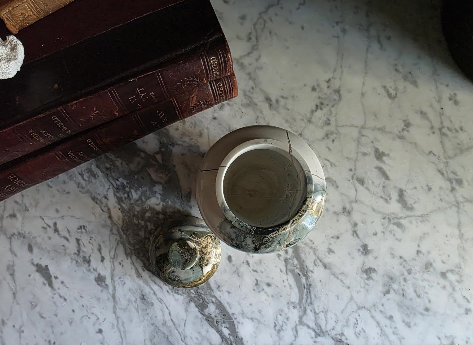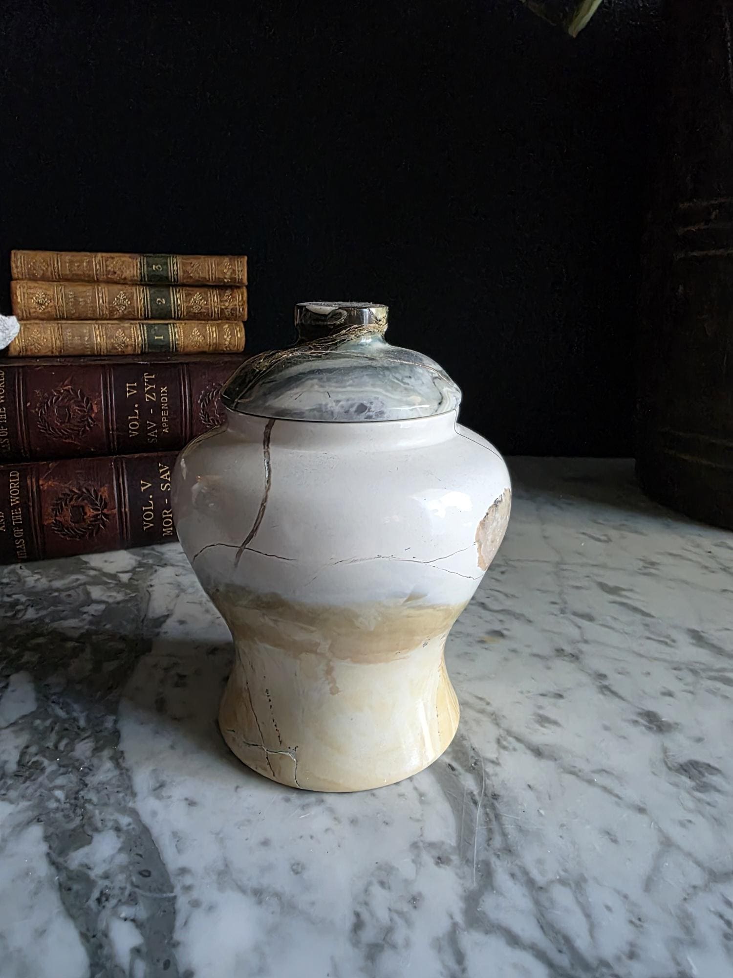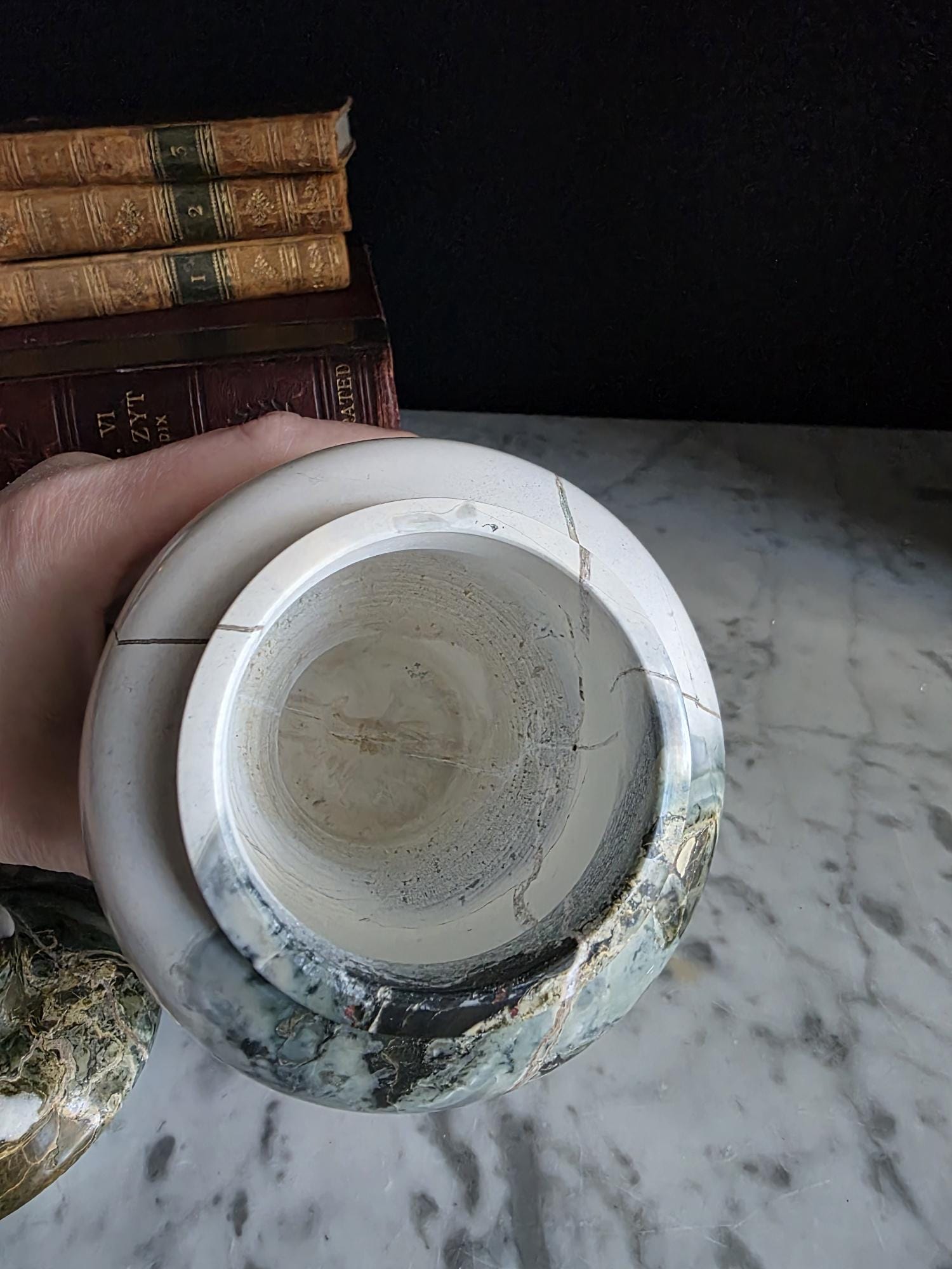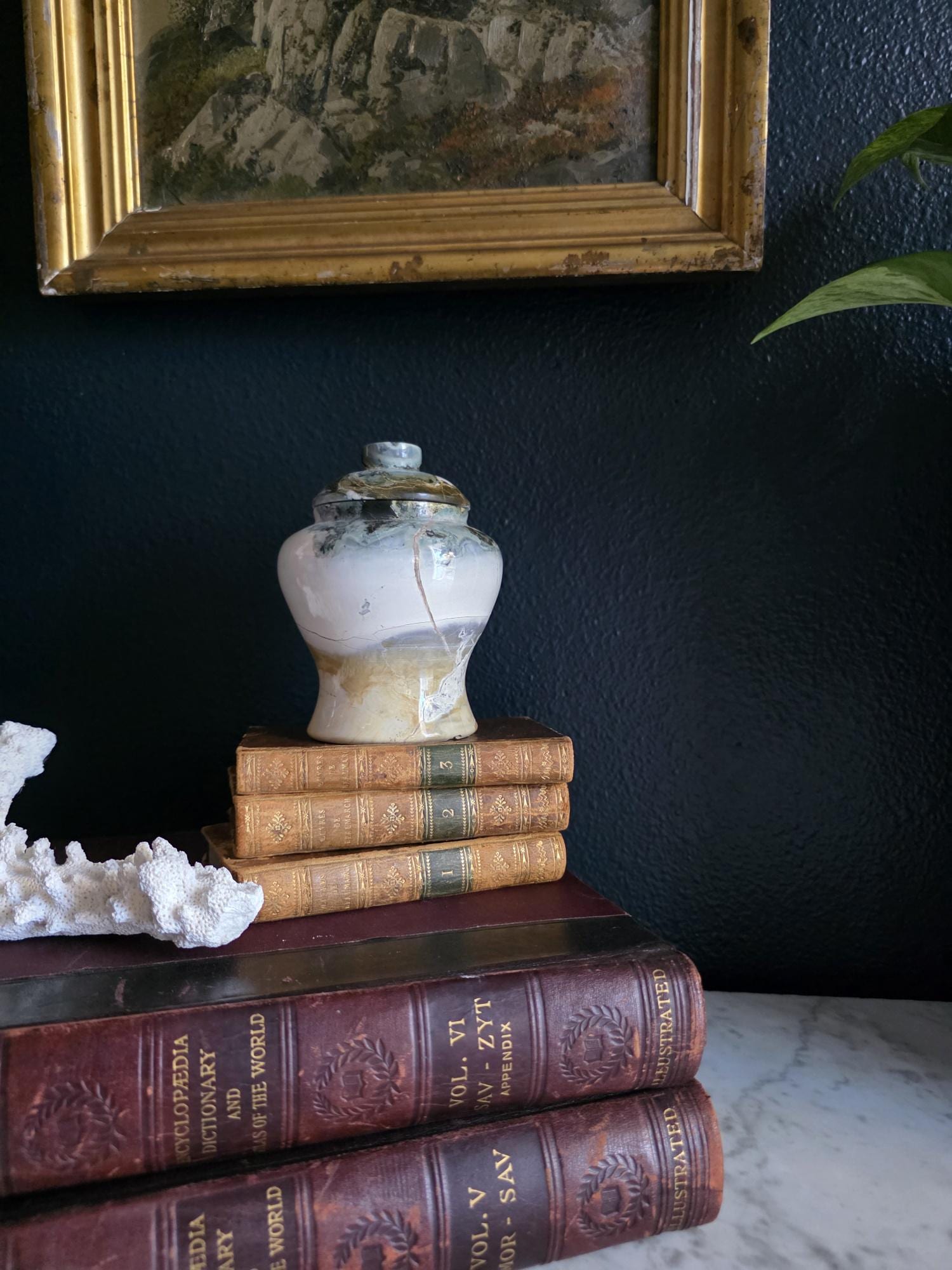 Please note that as a natural stone product, this vessel showcases the raw history of the material. The surface displays prominent natural fissures, crystalline inclusions, and distinct vertical veining that are inherent to the rock structure. These characteristics are not defects but rather the "birthmarks" of the stone, adding to its rustic, brutalist charm and vintage appeal. It is the perfect size for use as a jewelry keeper, a discreet storage jar for small keepsakes, or simply as a sophisticated, heavy paperweight.