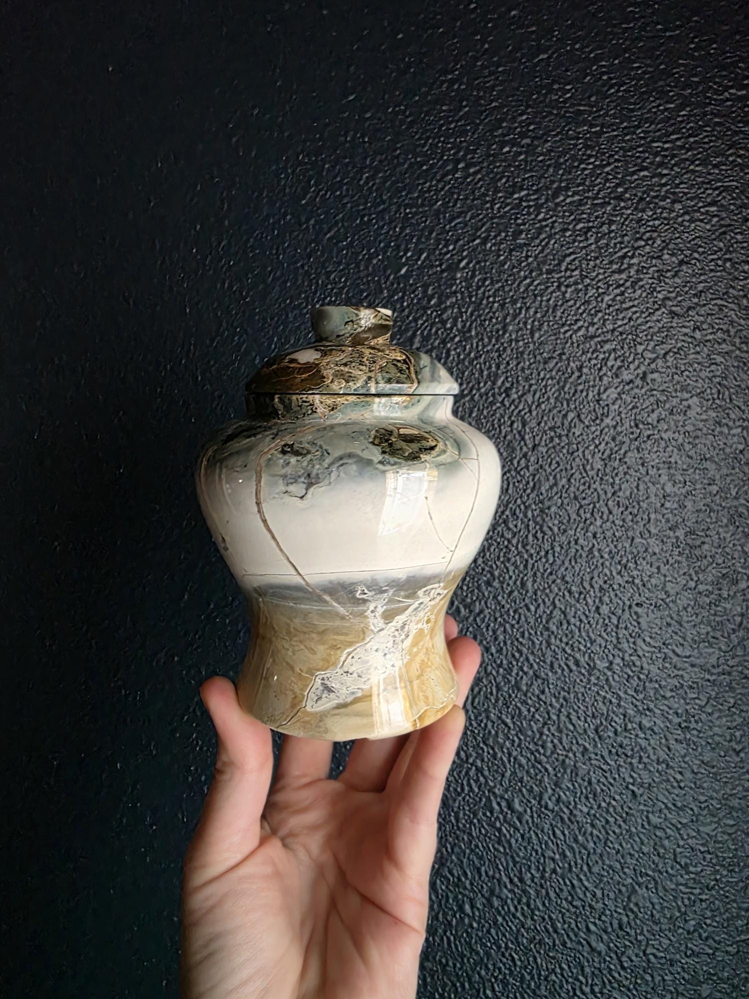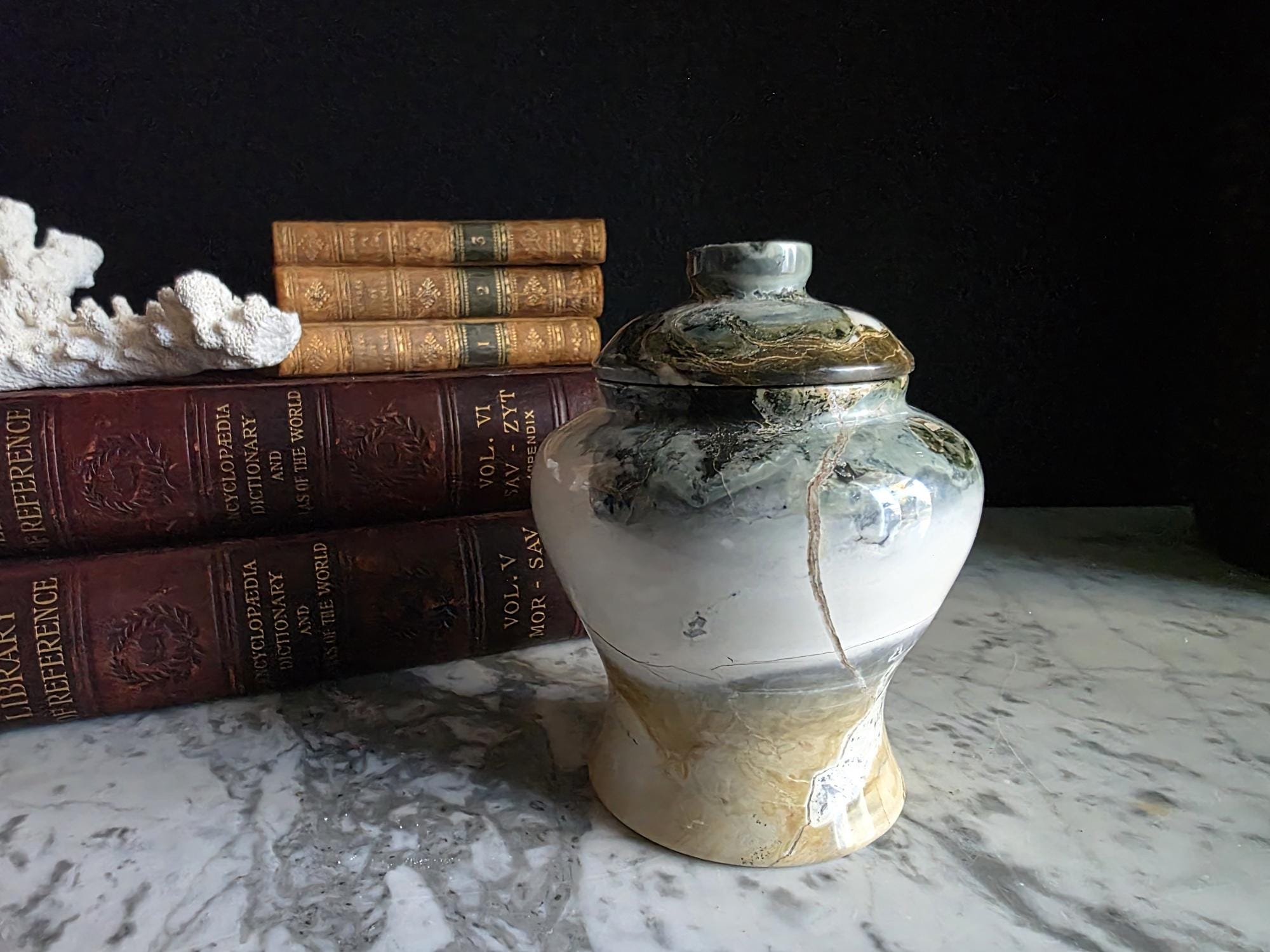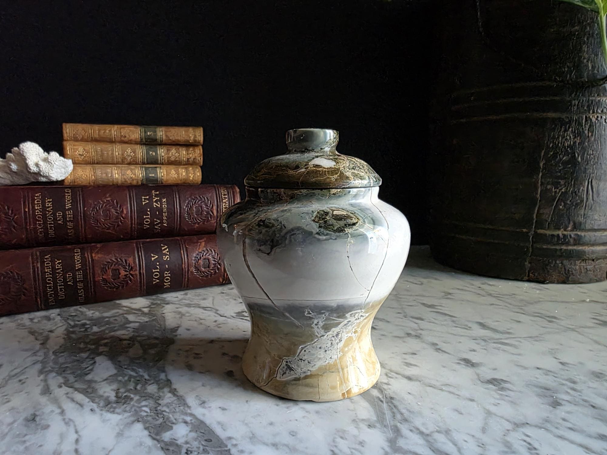 Substantial in weight and smooth to the touch, the jar features a classic ginger jar silhouette with a fitted lid. Because it is carved from natural rock, every angle offers a new perspective, revealing swirling patterns and organic motifs that resemble a topographic map. It serves not just as a container, but as a standalone piece of lapidary sculpture that brings an earthy, grounding presence to any room, whether placed on a bookshelf, a desk, or a mantle.