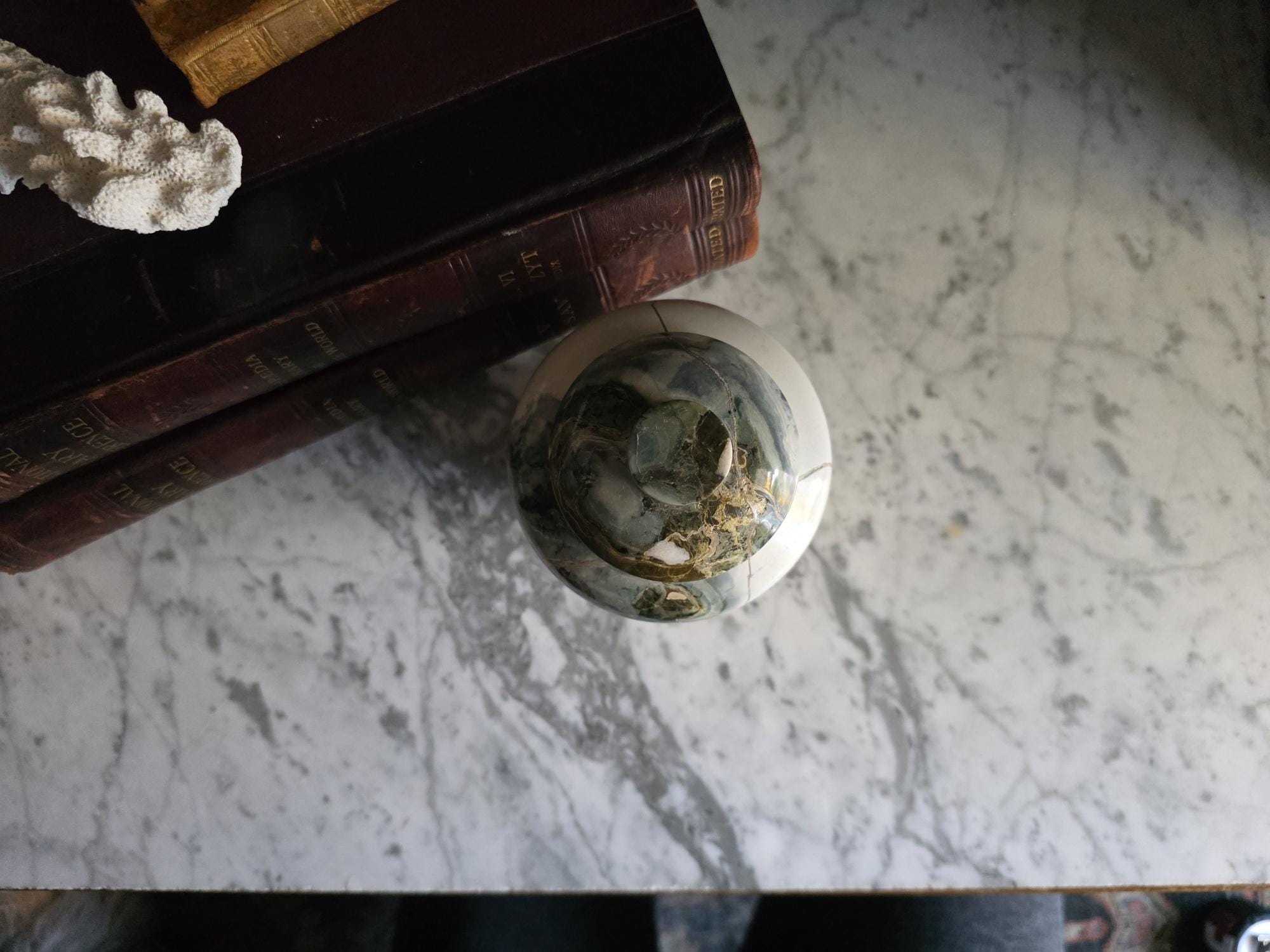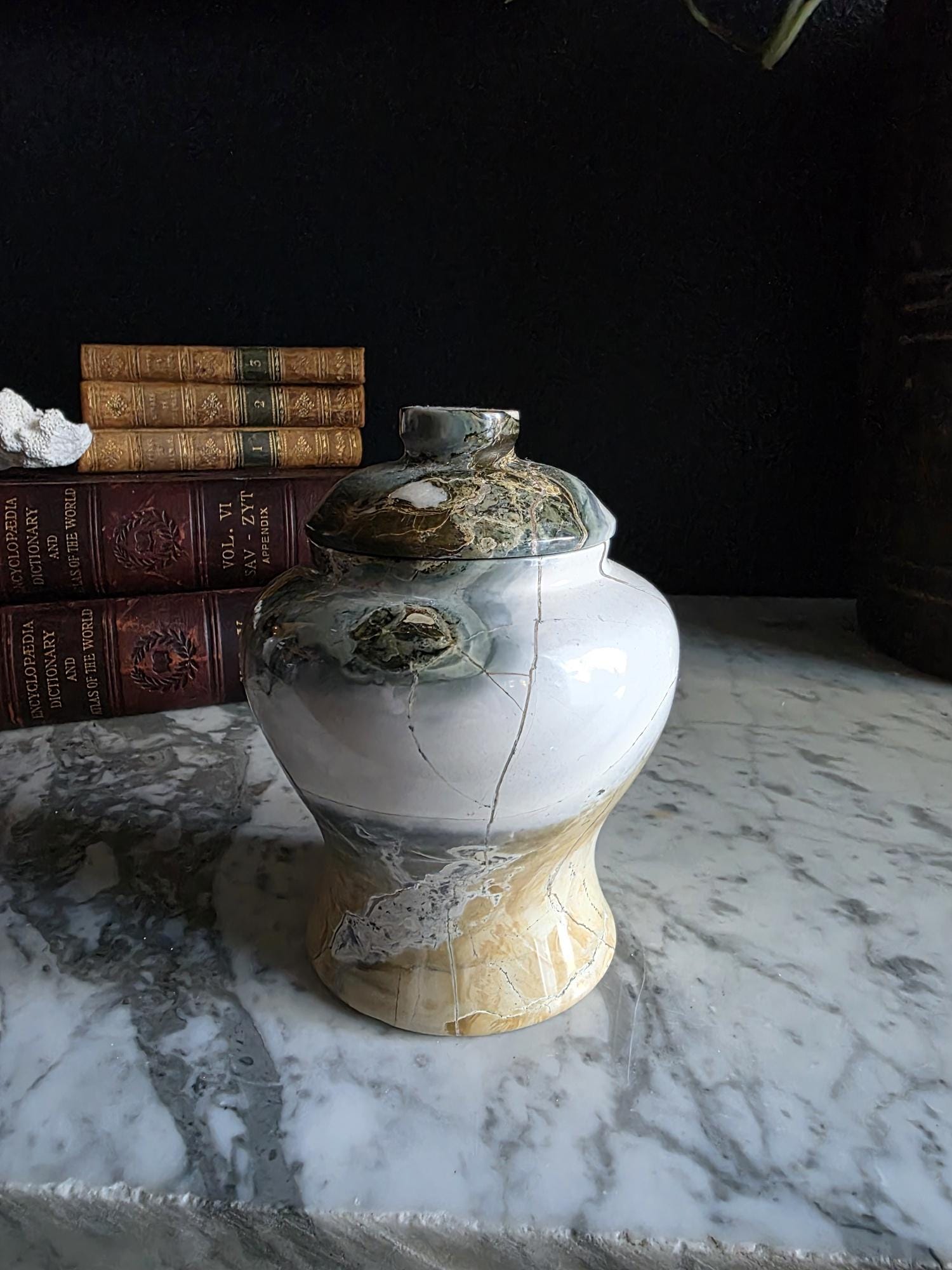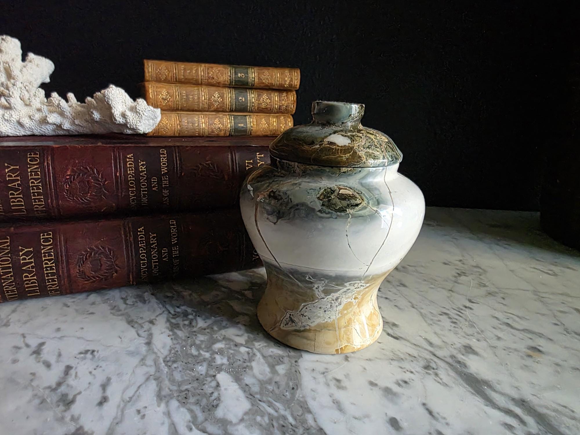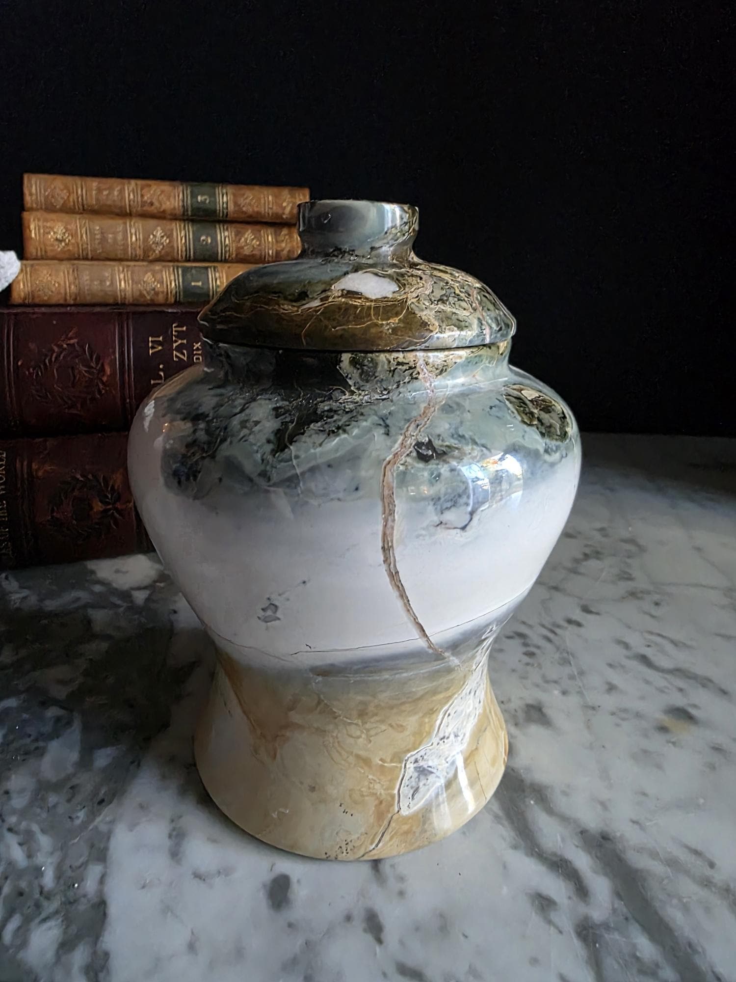 Substantial in weight and smooth to the touch, the jar features a classic ginger jar silhouette with a fitted lid. Because it is carved from natural rock, every angle offers a new perspective, revealing swirling patterns and organic motifs that resemble a topographic map. It serves not just as a container, but as a standalone piece of lapidary sculpture that brings an earthy, grounding presence to any room, whether placed on a bookshelf, a desk, or a mantle.