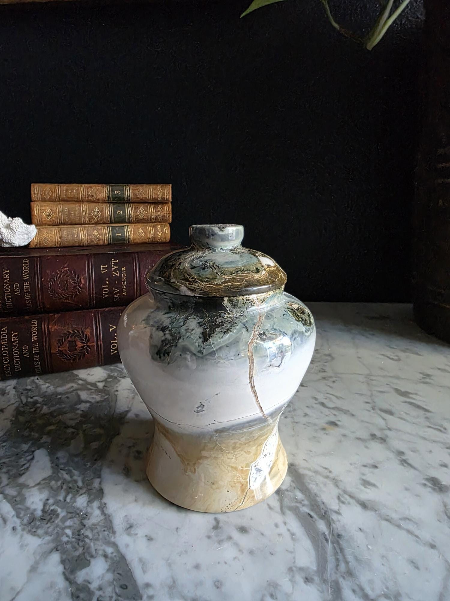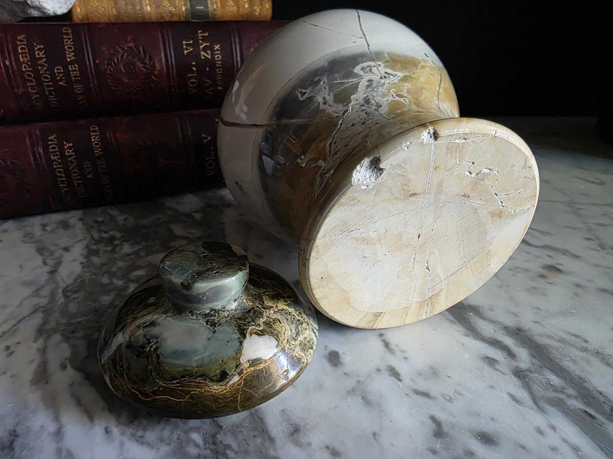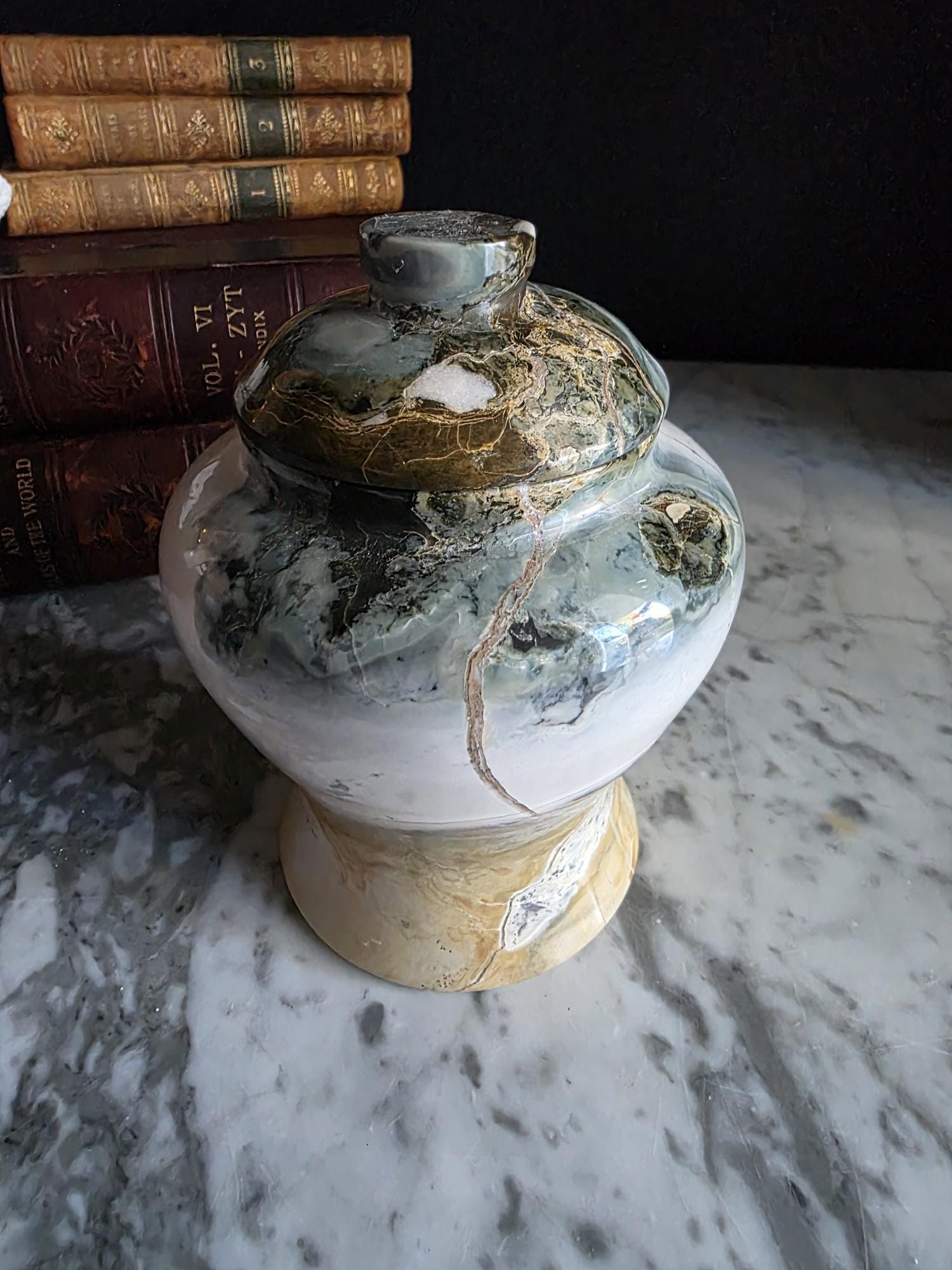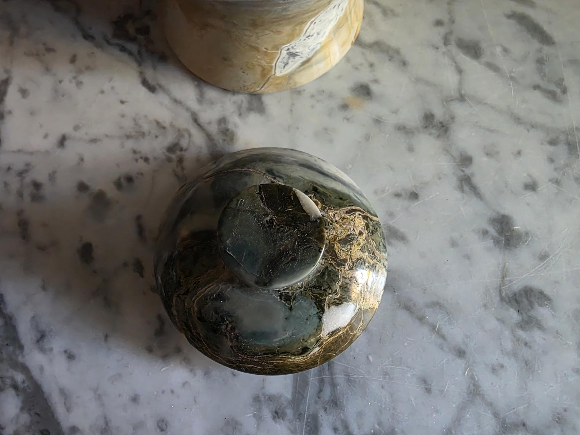 Elevate your home decor with this exquisite hand-turned lidded jar, expertly crafted from solid jasper stone. This piece is a testament to natural artistry, featuring a stunning "landscape" color palette that transitions from a sandy beige and creamy white base to a dramatic, mossy green and charcoal cap. The stone has been polished to a high gloss, allowing the light to catch the subtle variations and intricate banding that make this specific type of jasper—likely Polychrome or Desert Jasper.