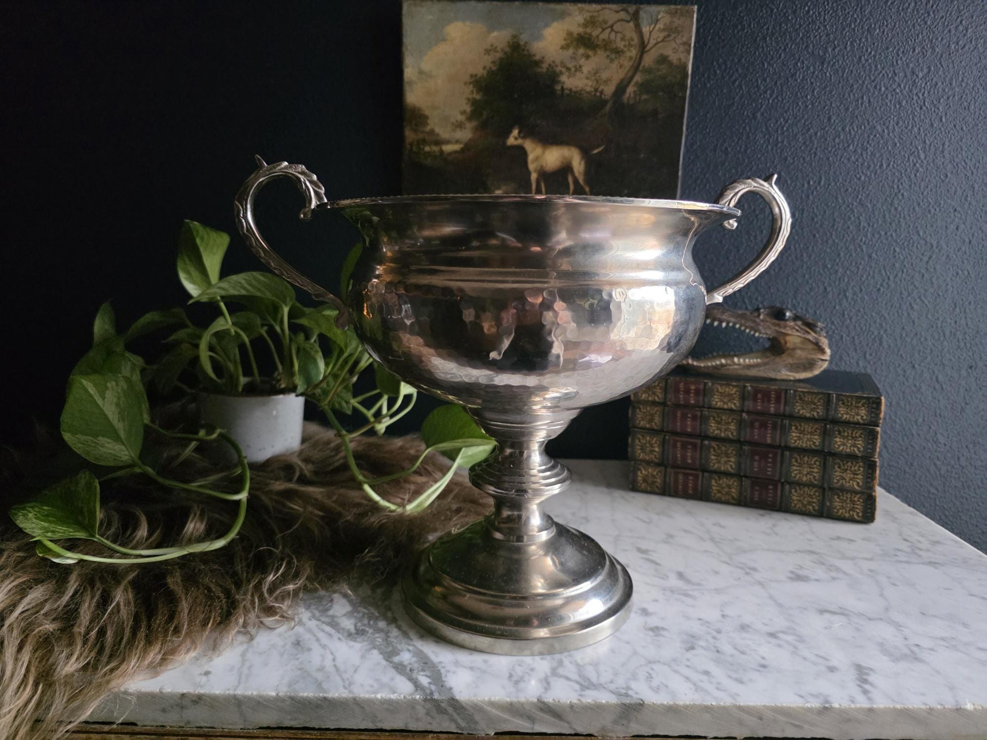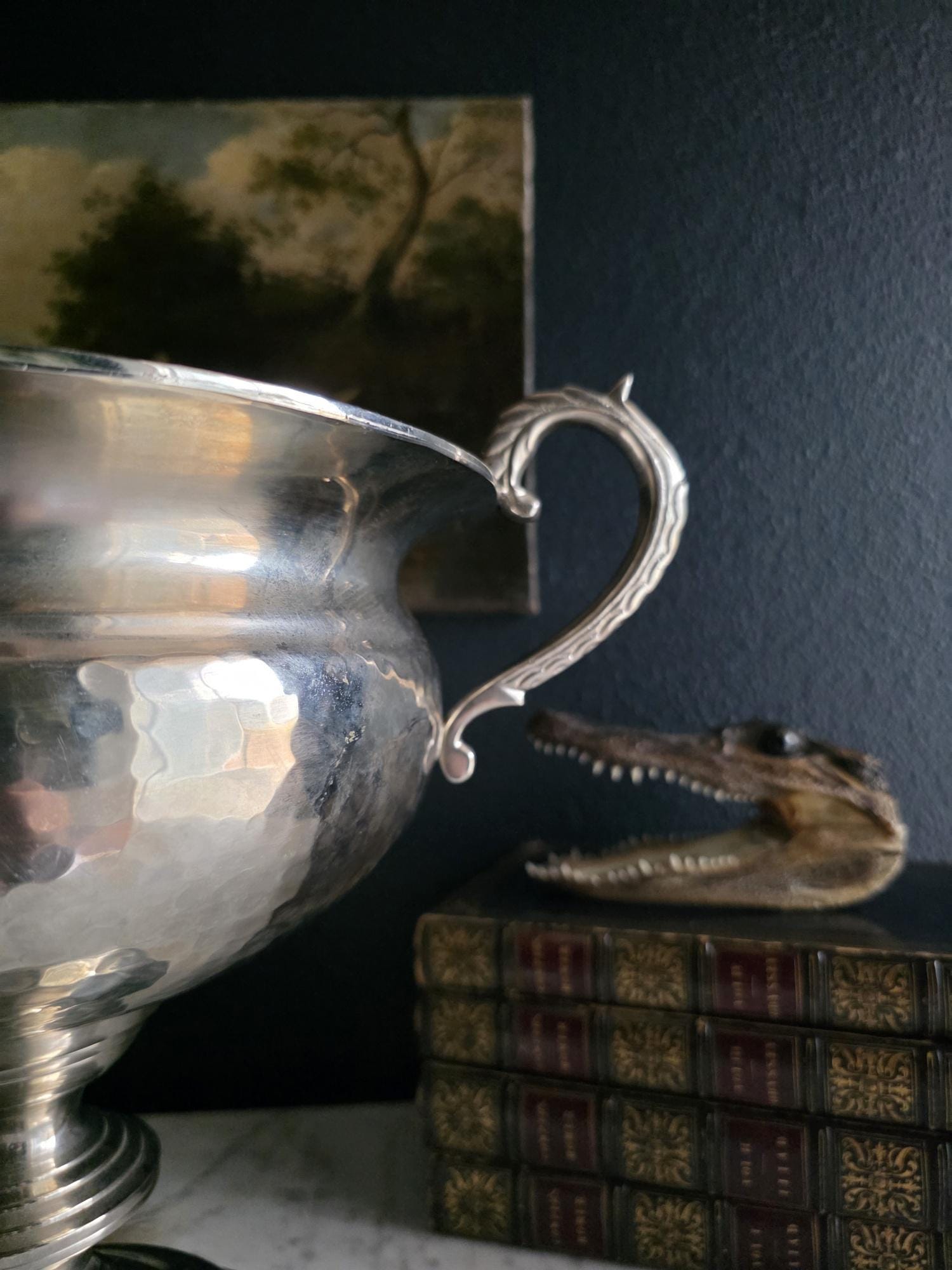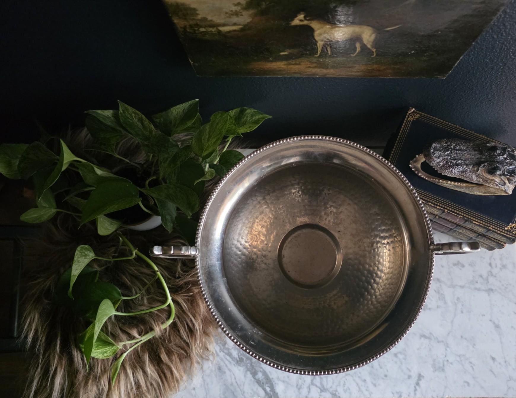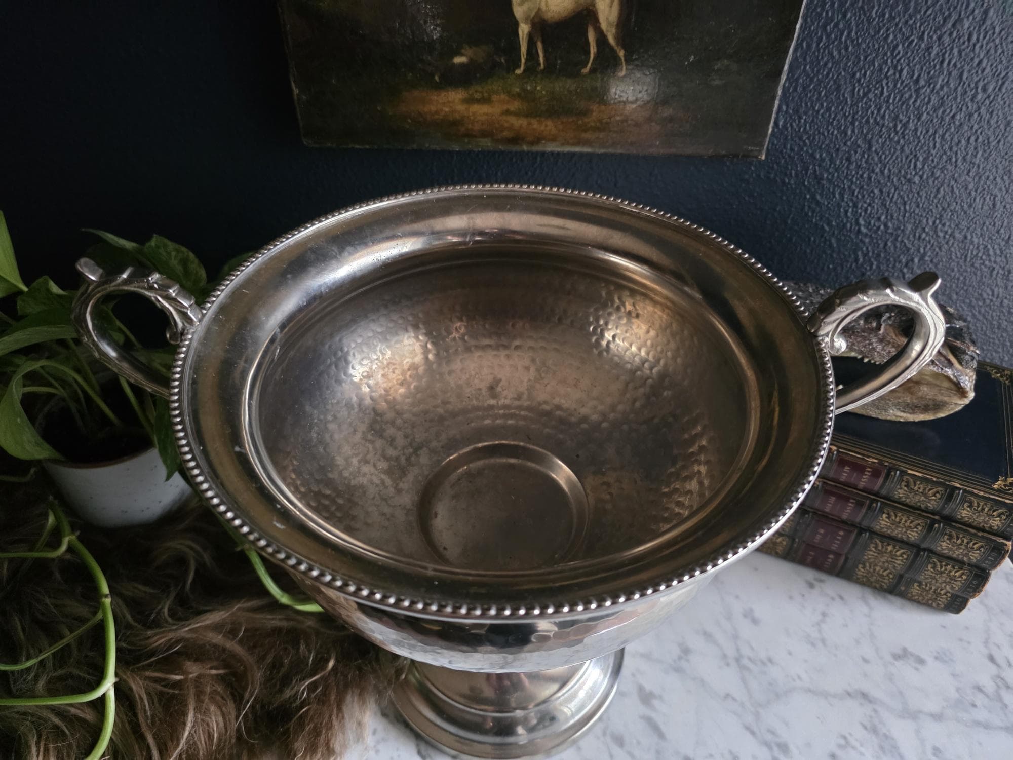 This Bombay Company Silver Plate Pedestal Bowl is a refined statement piece from the distinguished Bombay Holloware line. This specific design is a sought-after Scalloped and Hammered Centerpiece Bowl, characterized by its artisanal hand-hammered texture that creates a sophisticated play of light across its surface. The bowl’s classic silhouette is elevated by ornate, scrolled handles and a delicate beaded rim, embodying the "grandmillennial" and traditional English estate aesthetic that the brand is known for.