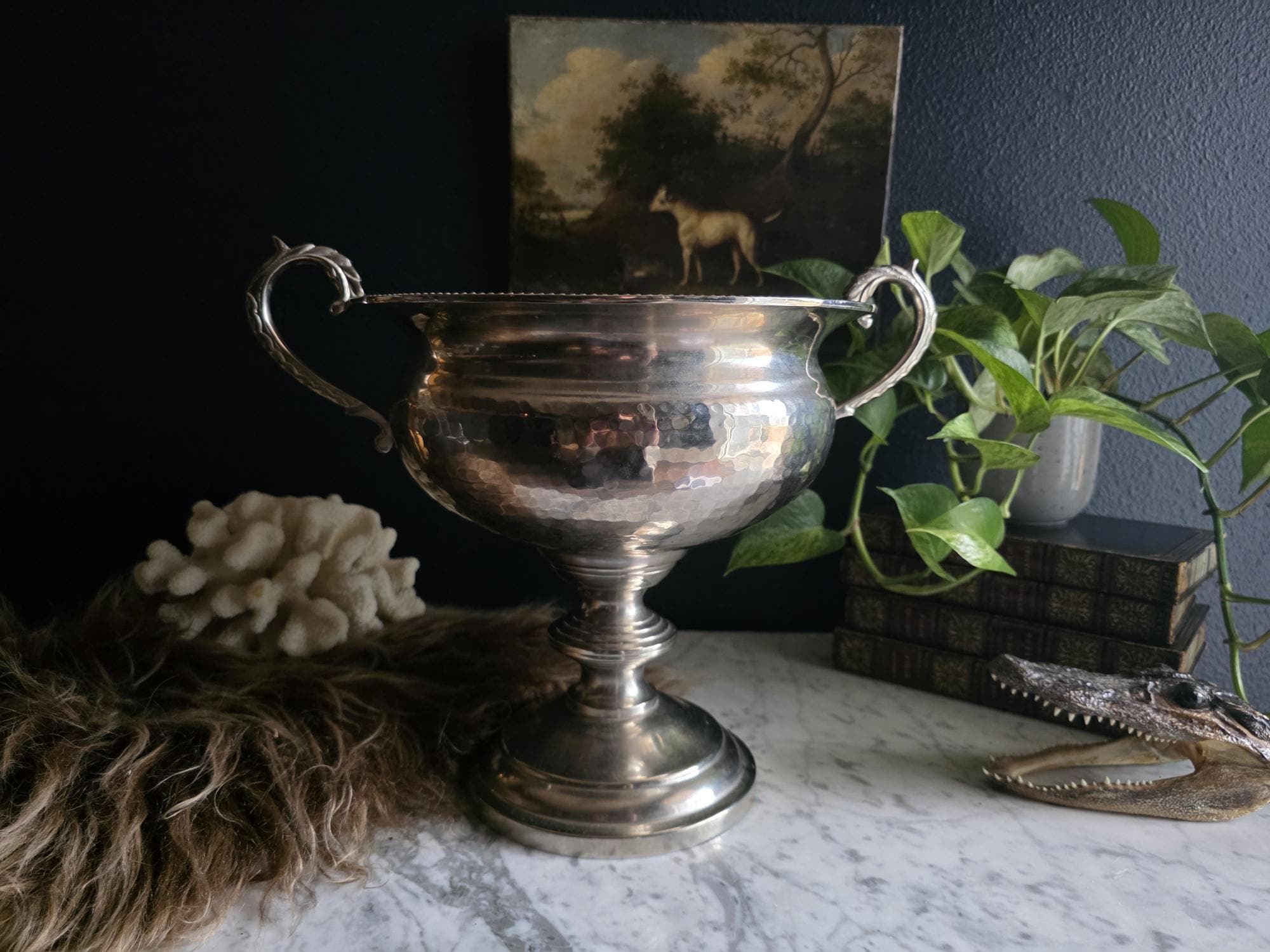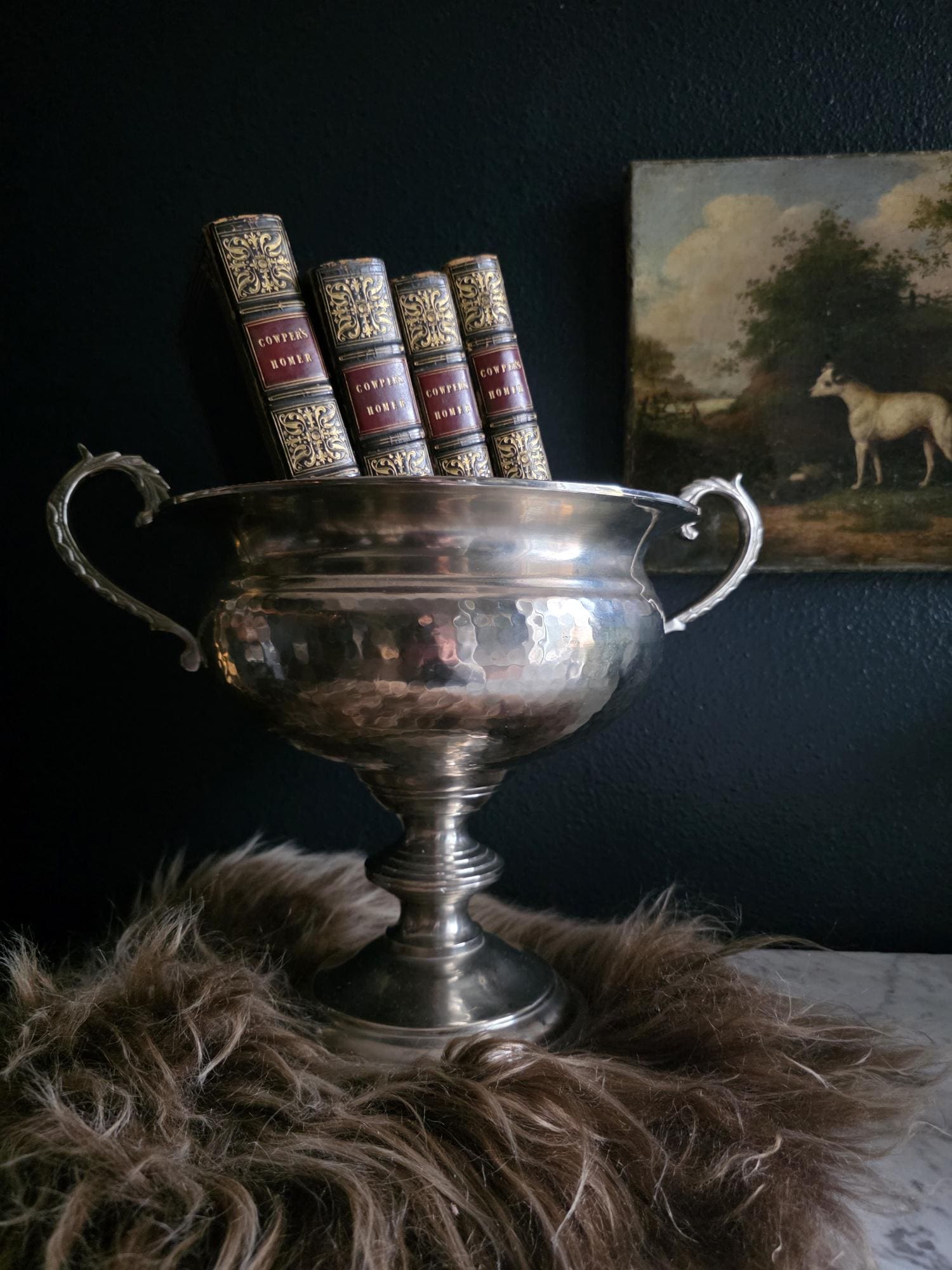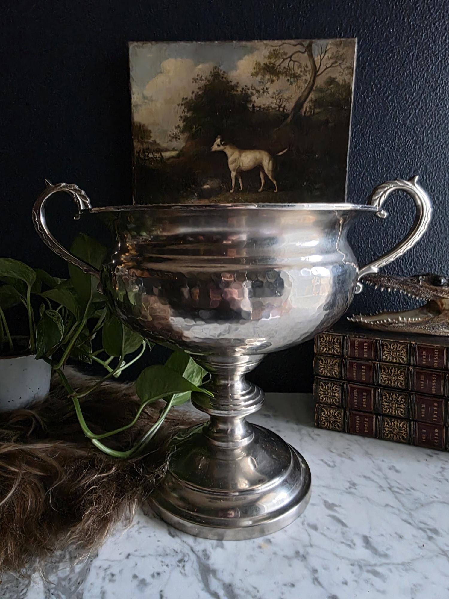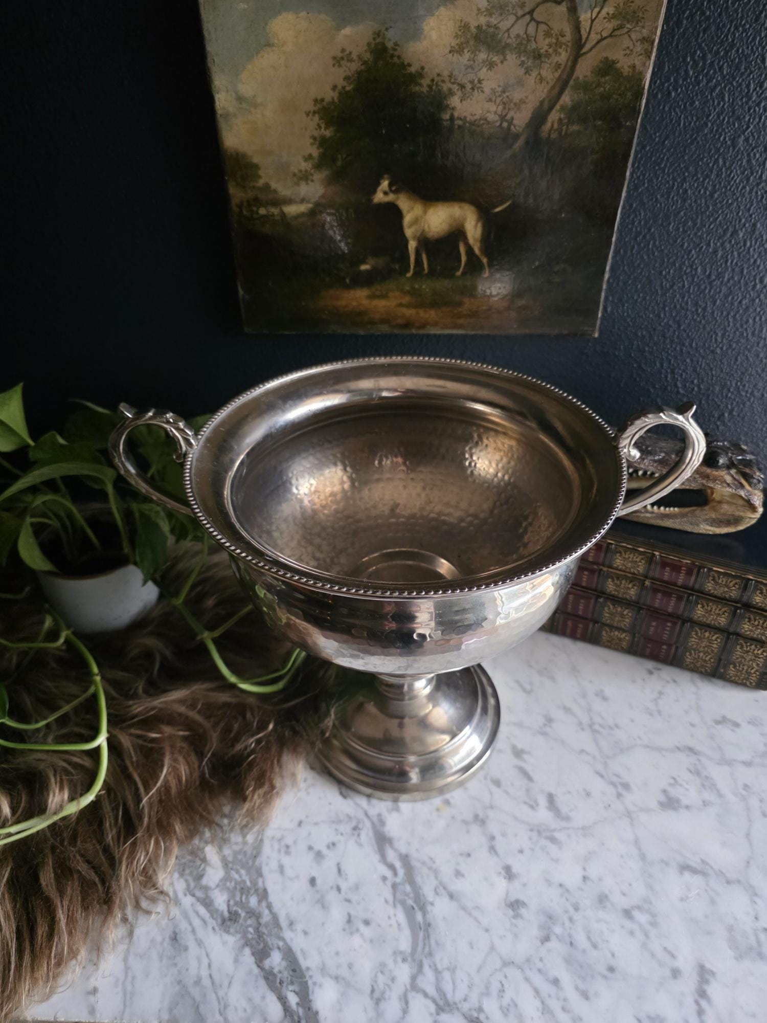 This Bombay Company Silver Plate Pedestal Bowl is a refined statement piece from the distinguished Bombay Holloware line. This specific design is a sought-after Scalloped and Hammered Centerpiece Bowl, characterized by its artisanal hand-hammered texture that creates a sophisticated play of light across its surface. The bowl’s classic silhouette is elevated by ornate, scrolled handles and a delicate beaded rim, embodying the "grandmillennial" and traditional English estate aesthetic that the brand is known for.