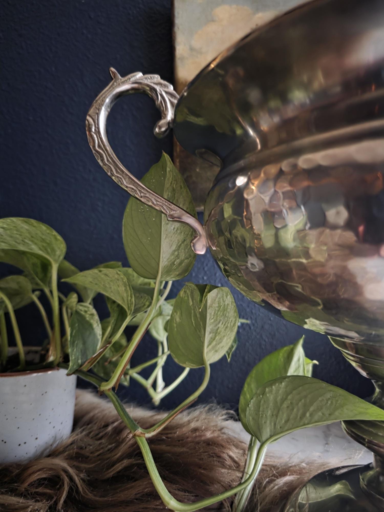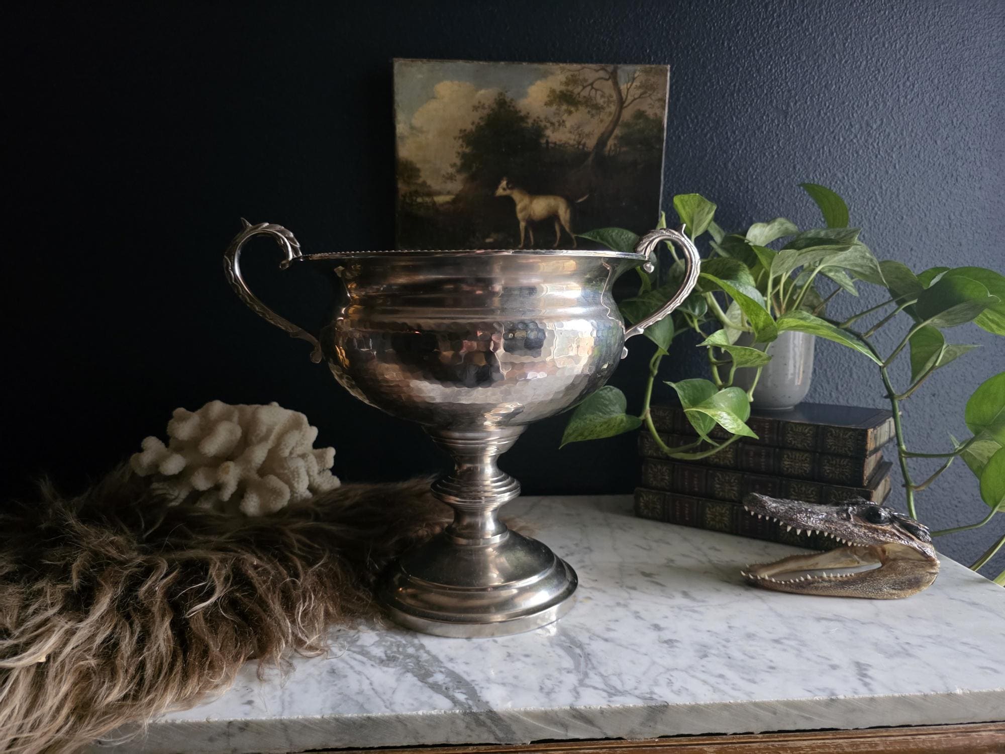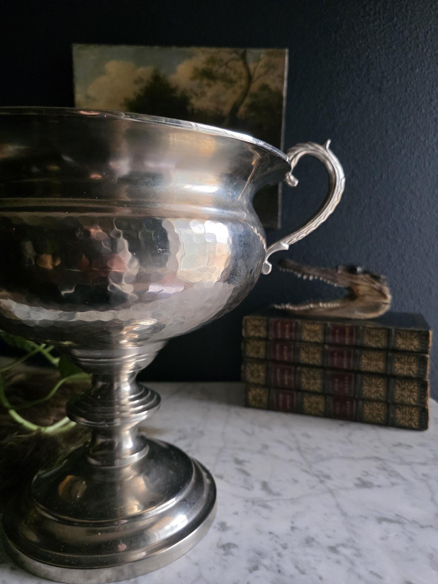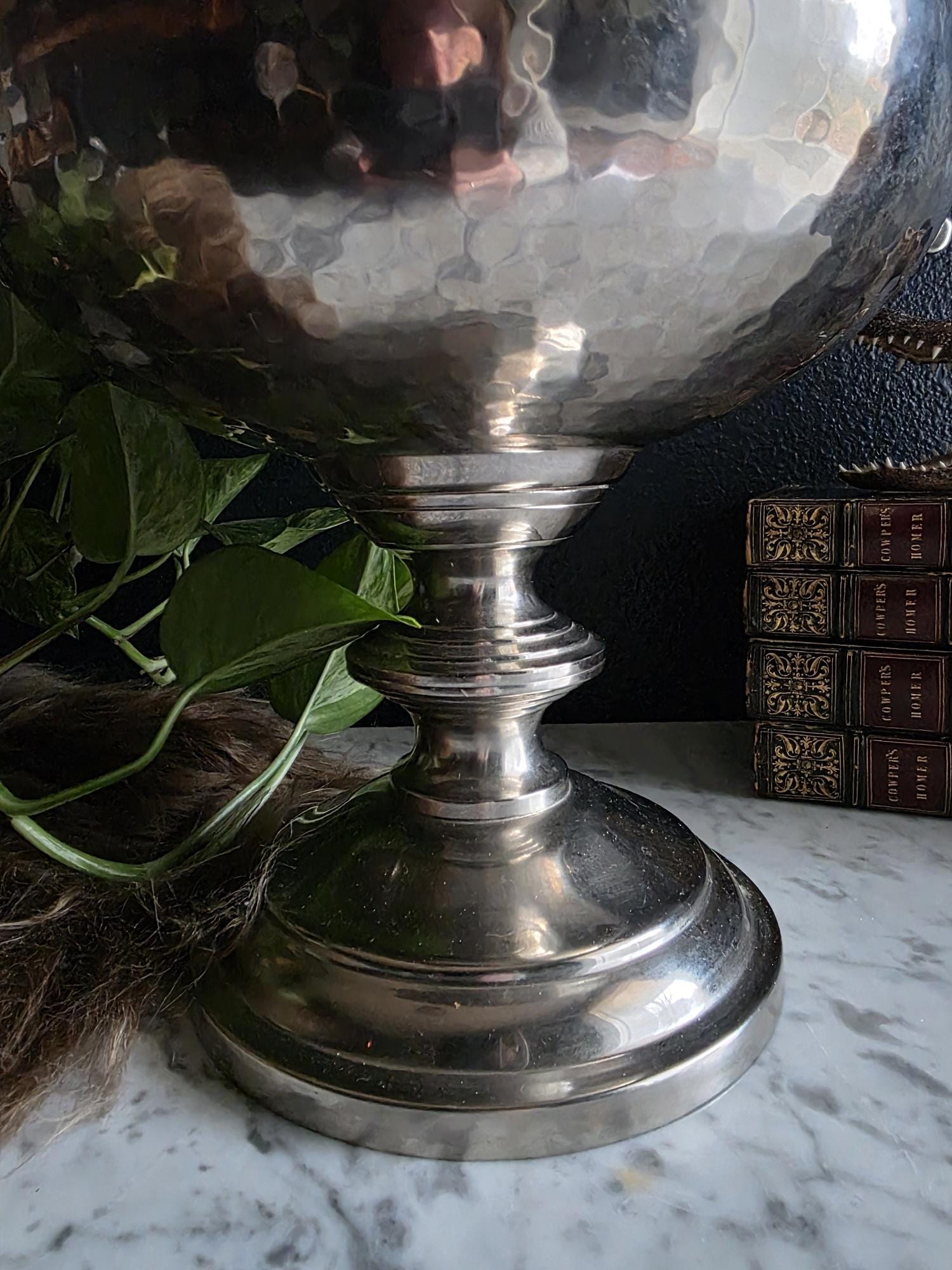 This Bombay Company Silver Plate Pedestal Bowl is a refined statement piece from the distinguished Bombay Holloware line. This specific design is a sought-after Scalloped and Hammered Centerpiece Bowl, characterized by its artisanal hand-hammered texture that creates a sophisticated play of light across its surface. The bowl’s classic silhouette is elevated by ornate, scrolled handles and a delicate beaded rim, embodying the "grandmillennial" and traditional English estate aesthetic that the brand is known for.