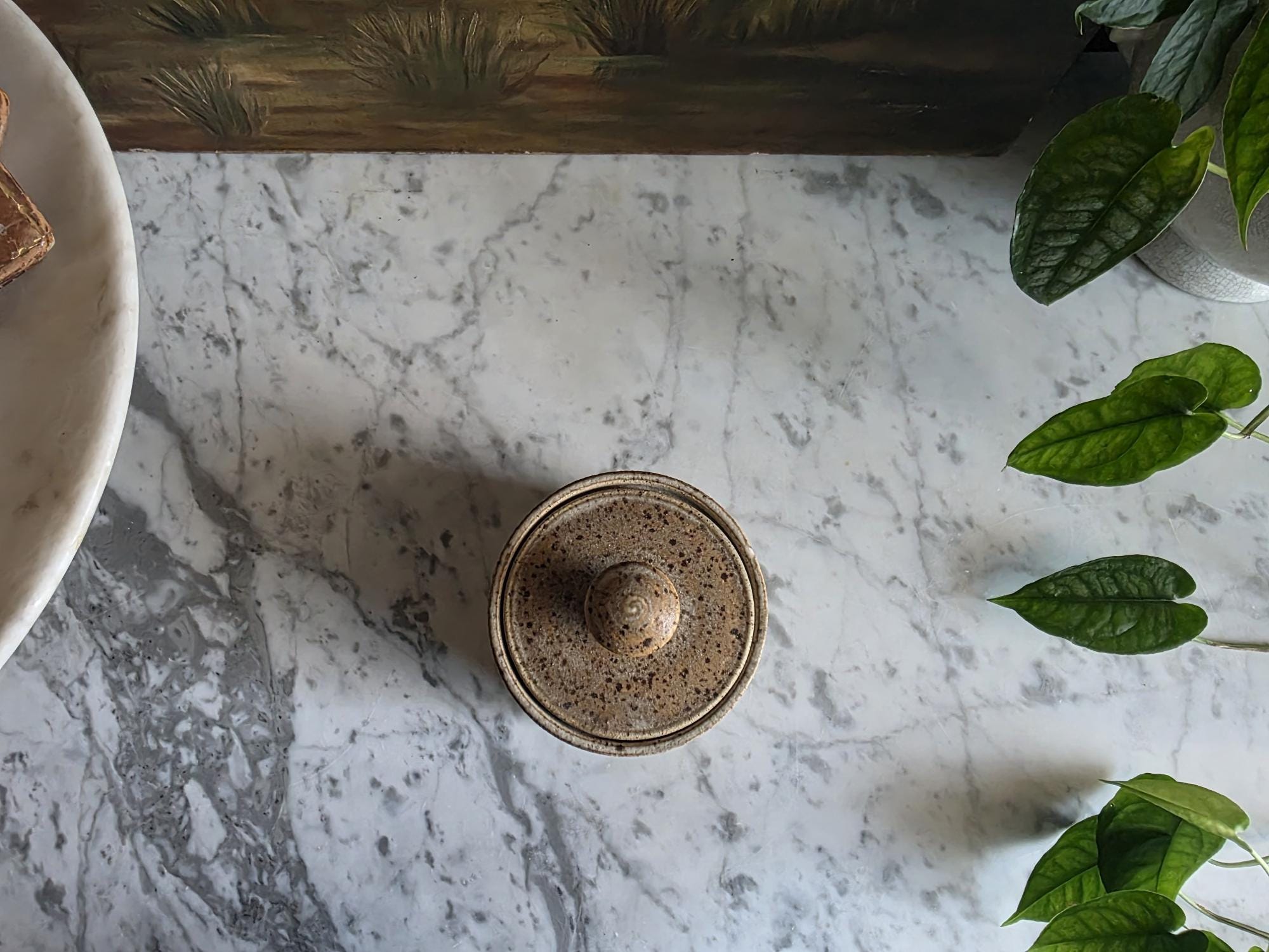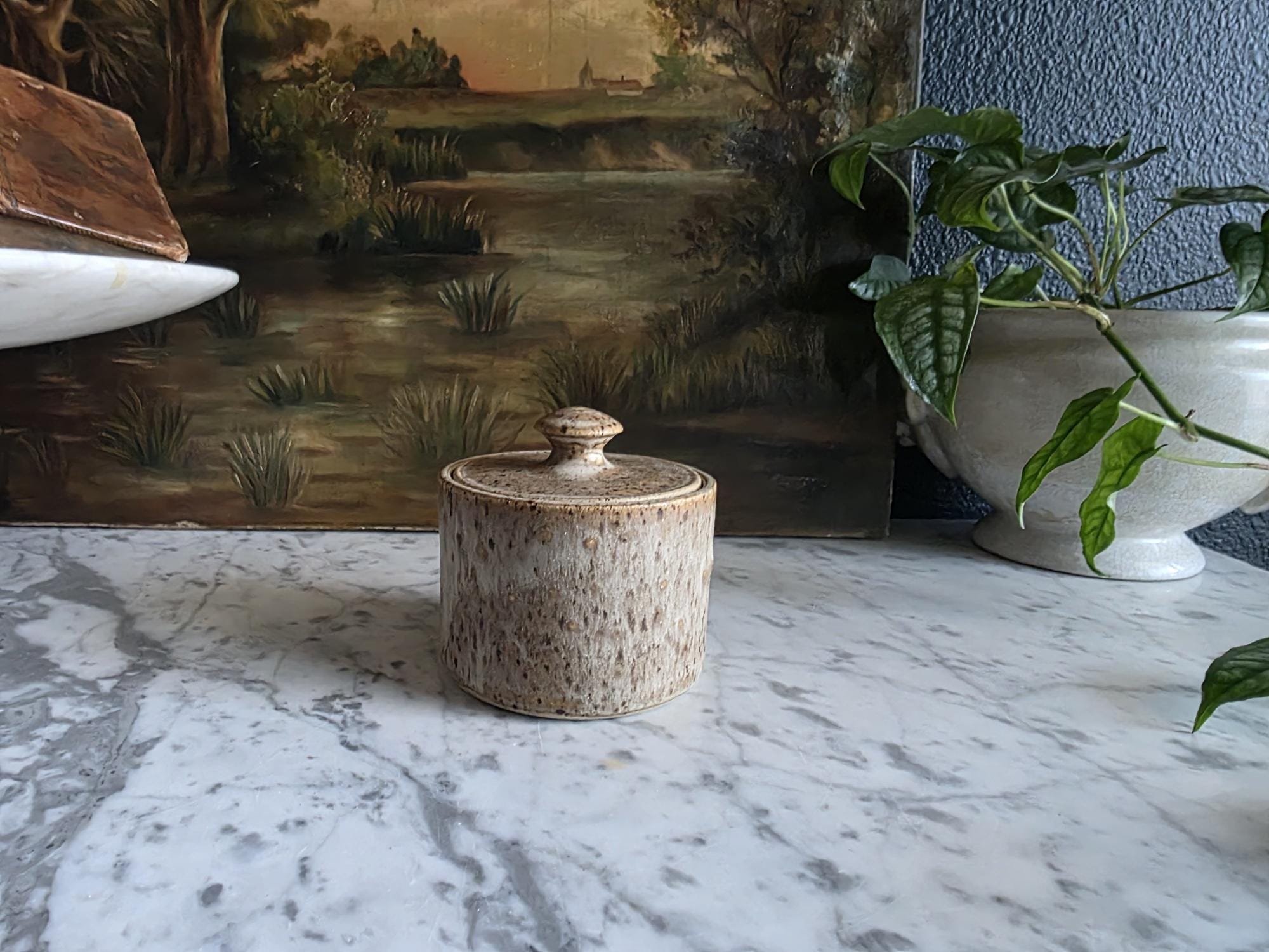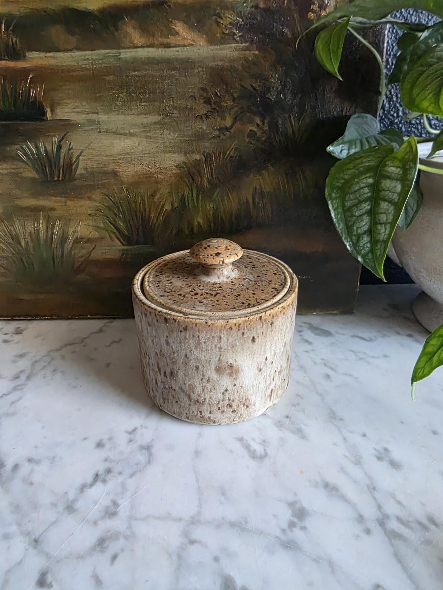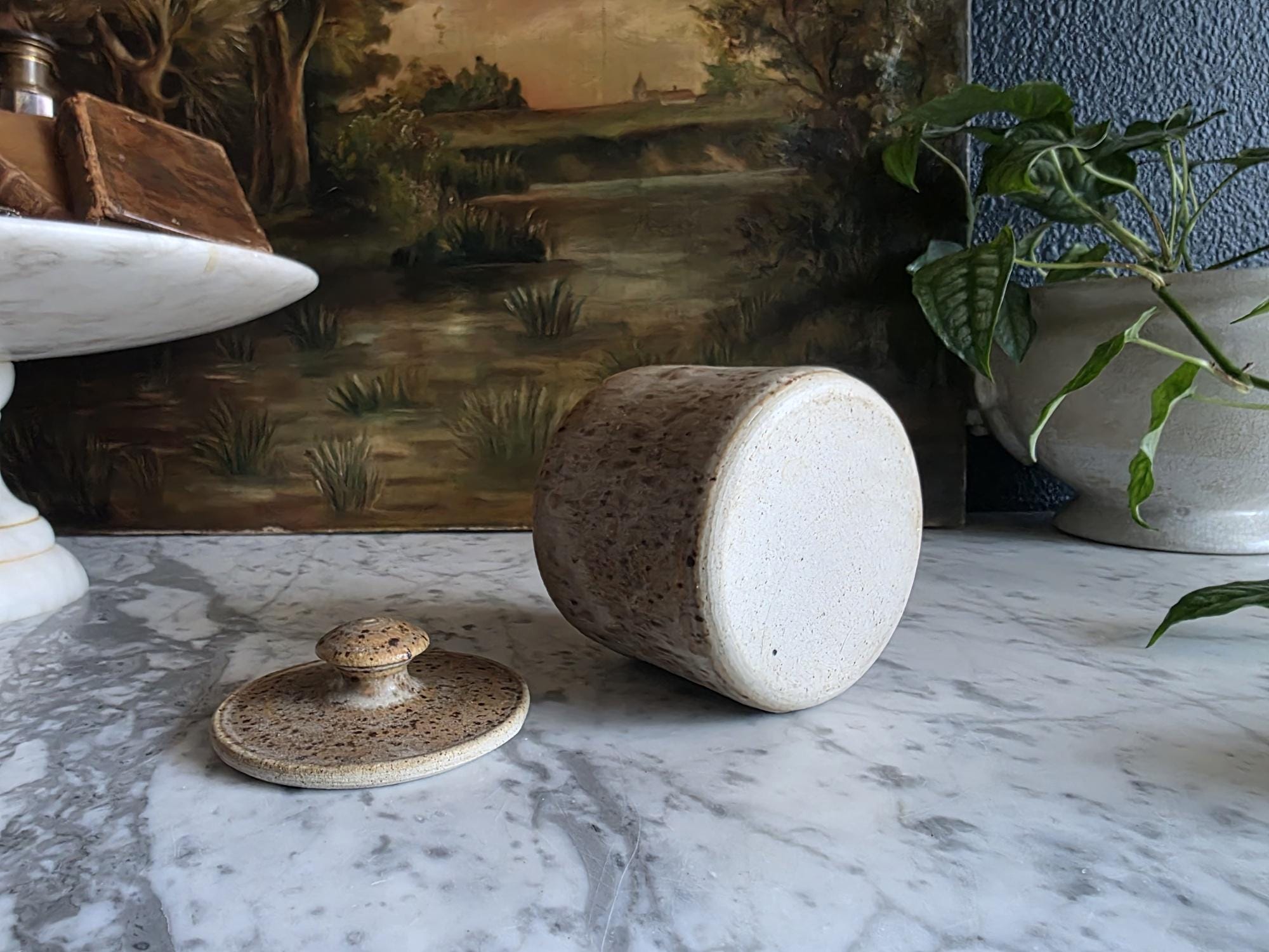 This charming vintage lidded jar is a quintessential example of mid-century inspired studio pottery, blending organic textures with a clean, functional silhouette. Handcrafted from a substantial, high-fired stoneware, the piece features a captivating "oatmeal" glaze characterized by dense rust toned spotting and a variegated, vertical drip effect that gives the surface a tactile, earthy feel. The minimalist cylindrical body is topped with a perfectly fitted flat lid, accented by a hand-turned button knob that showcases a delicate spiral detail on the crown.
