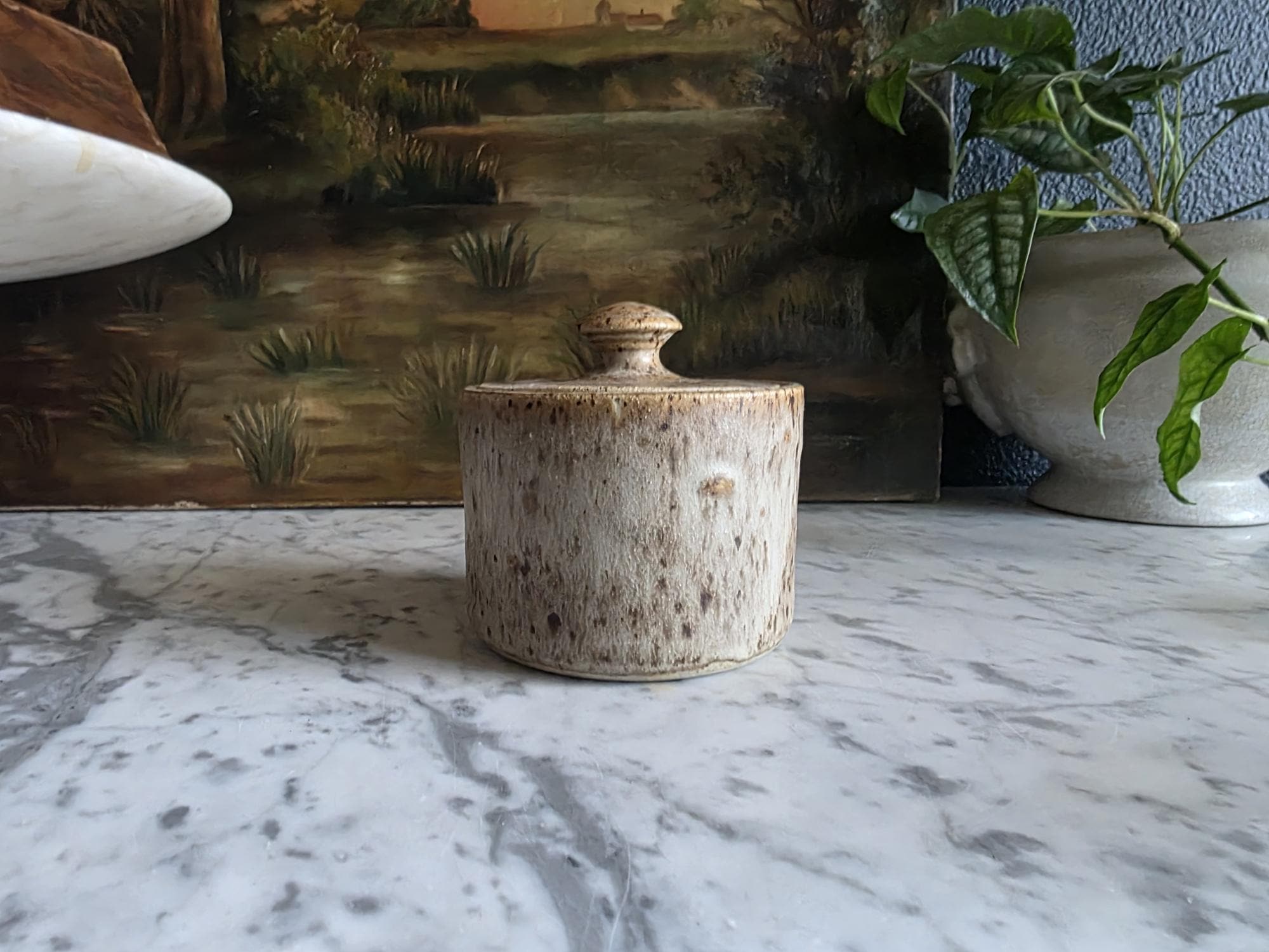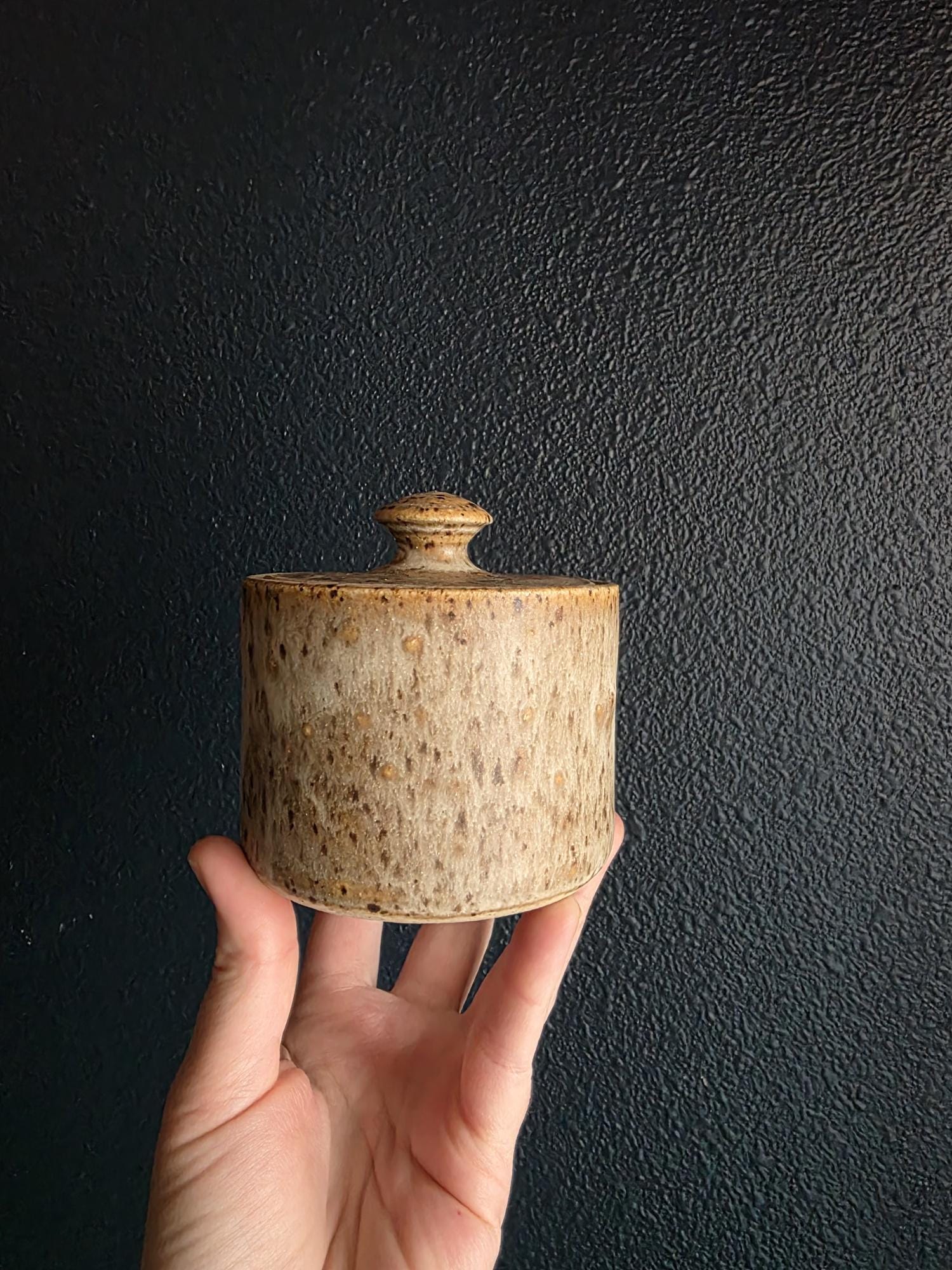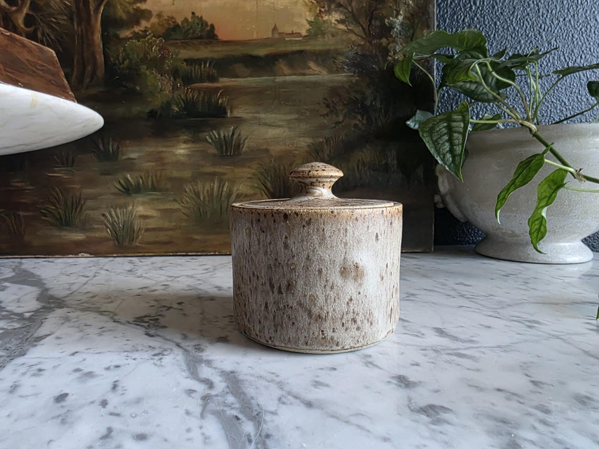 This charming vintage lidded jar is a quintessential example of mid-century inspired studio pottery, blending organic textures with a clean, functional silhouette. Handcrafted from a substantial, high-fired stoneware, the piece features a captivating "oatmeal" glaze characterized by dense rust toned spotting and a variegated, vertical drip effect that gives the surface a tactile, earthy feel. The minimalist cylindrical body is topped with a perfectly fitted flat lid, accented by a hand-turned button knob that showcases a delicate spiral detail on the crown.