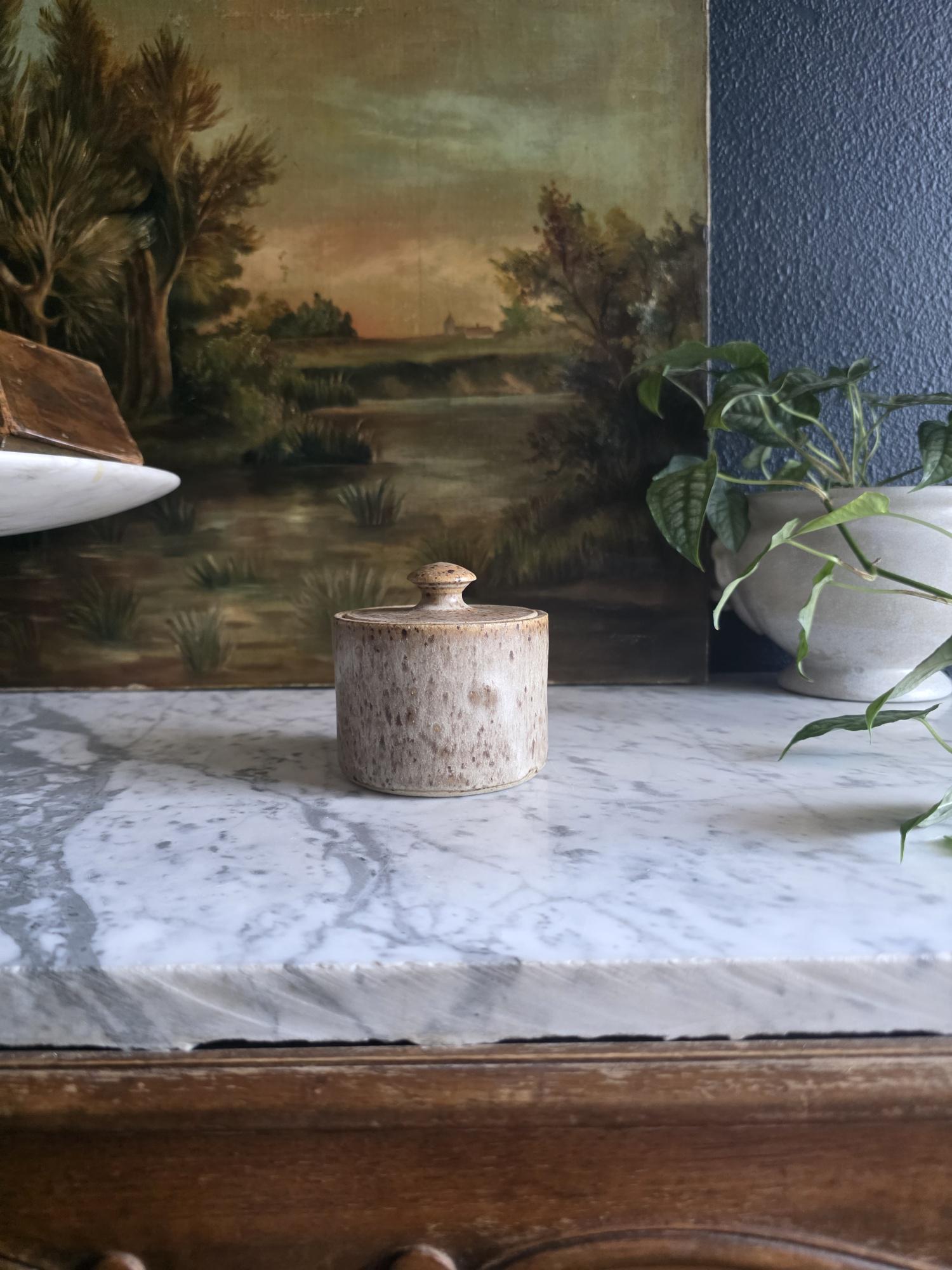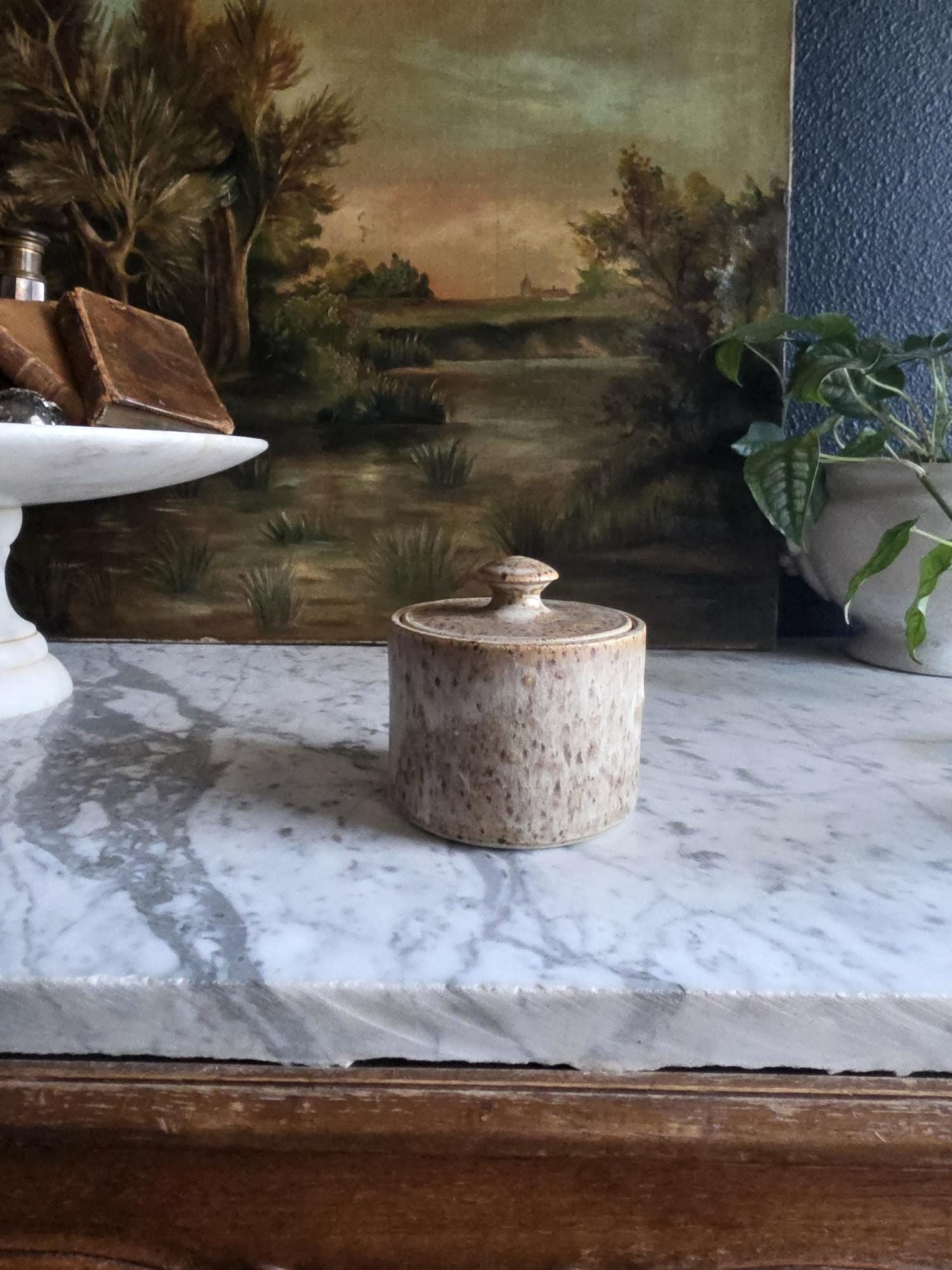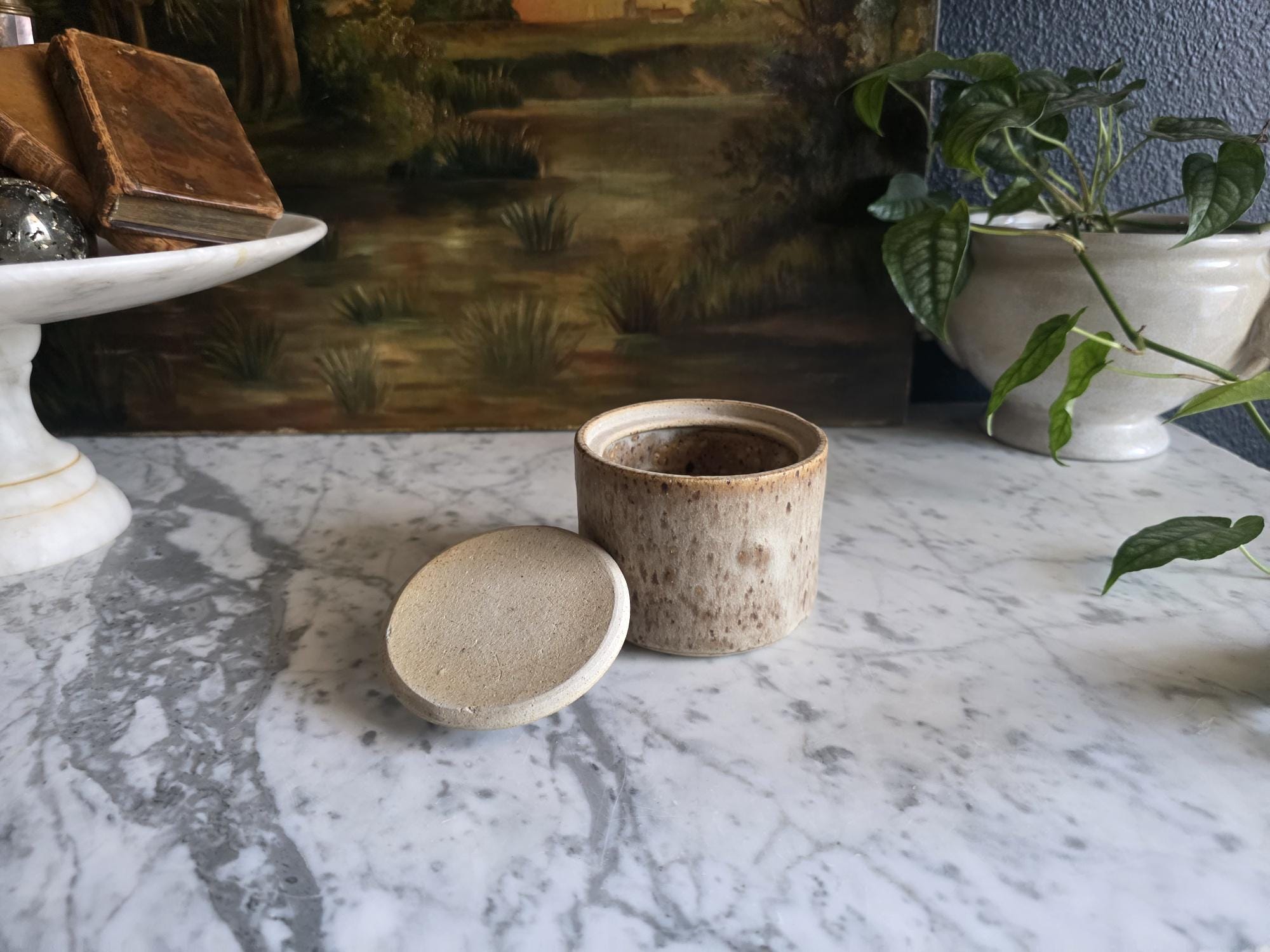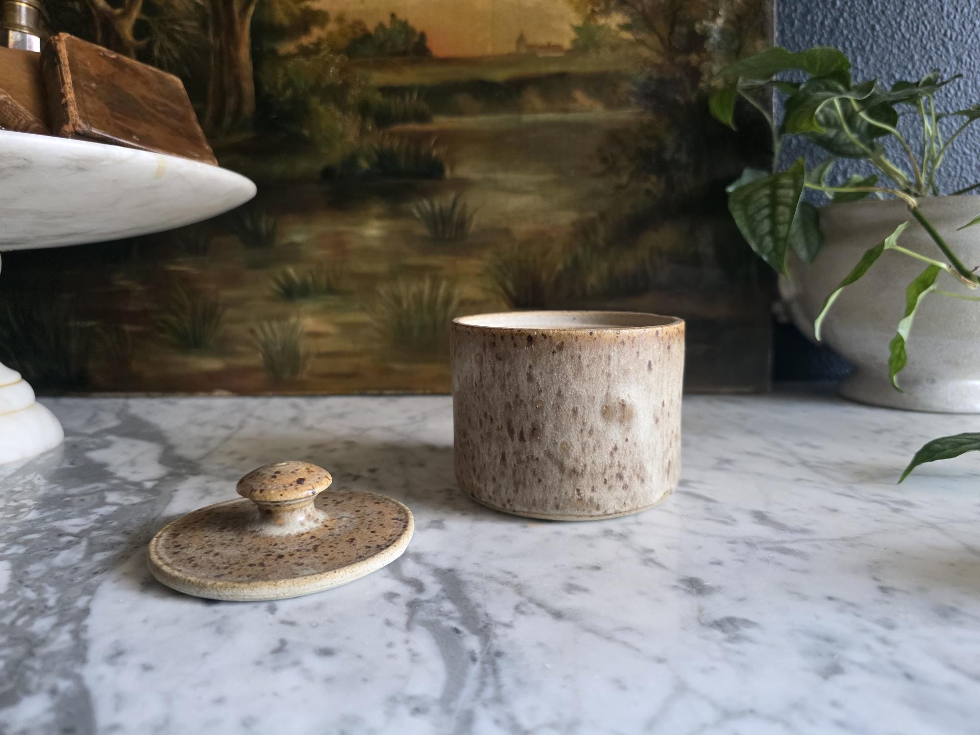 This charming vintage lidded jar is a quintessential example of mid-century inspired studio pottery, blending organic textures with a clean, functional silhouette. Handcrafted from a substantial, high-fired stoneware, the piece features a captivating "oatmeal" glaze characterized by dense rust toned spotting and a variegated, vertical drip effect that gives the surface a tactile, earthy feel. The minimalist cylindrical body is topped with a perfectly fitted flat lid, accented by a hand-turned button knob that showcases a delicate spiral detail on the crown.