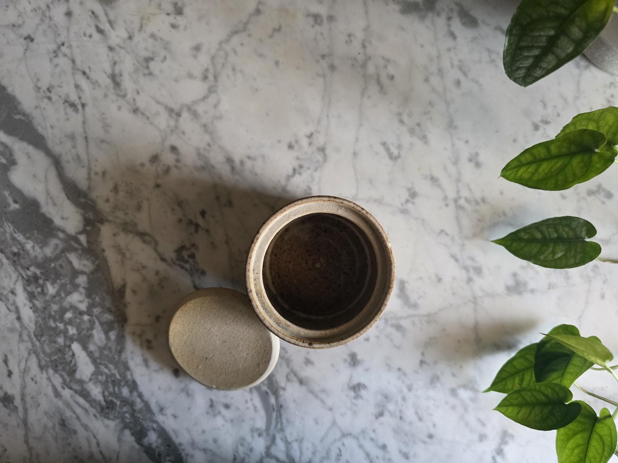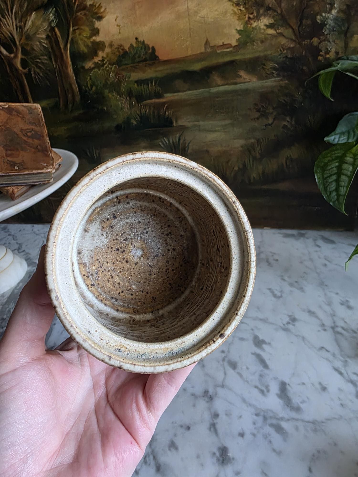 The jar’s interior is fully glazed for easy cleaning, while the base remains unglazed, revealing the natural cream-colored clay body. This versatile vessel is in excellent vintage condition with no chips or cracks. Whether used as a sophisticated salt cellar in the kitchen, a decorative jewelry stash on a vanity, or a standalone accent on a bookshelf, this one-of-a-kind ceramic piece adds a warm, artisanal touch to any interior.