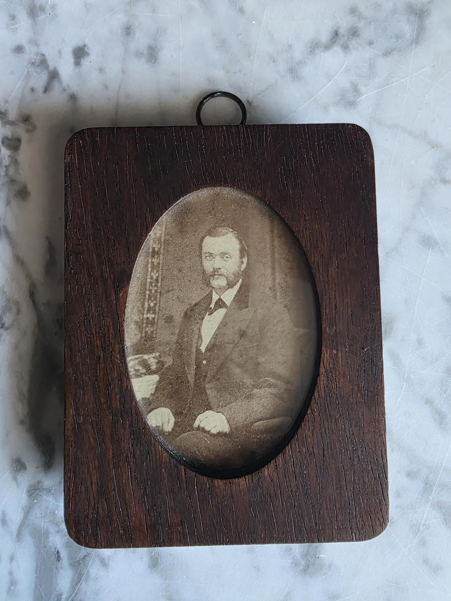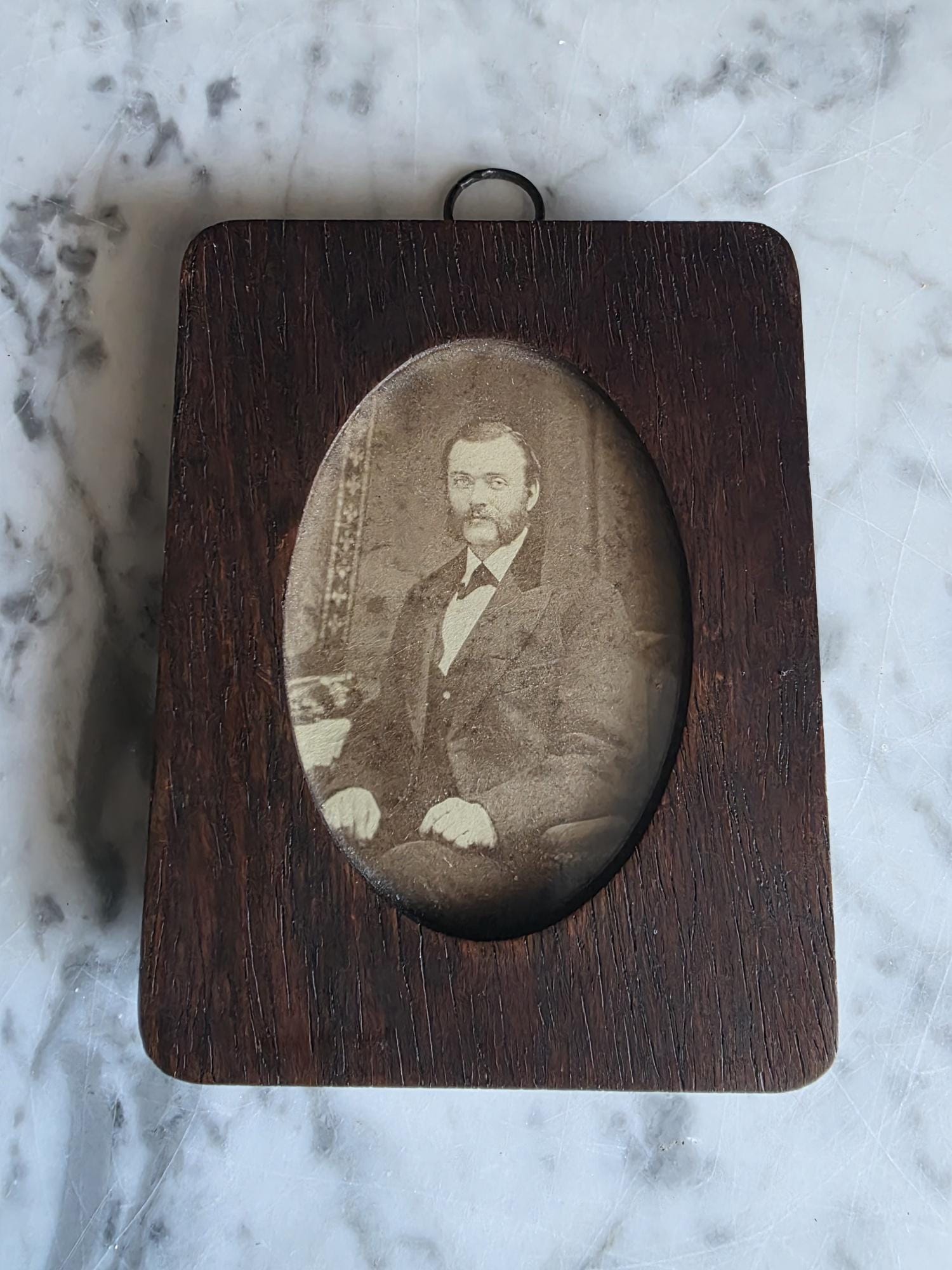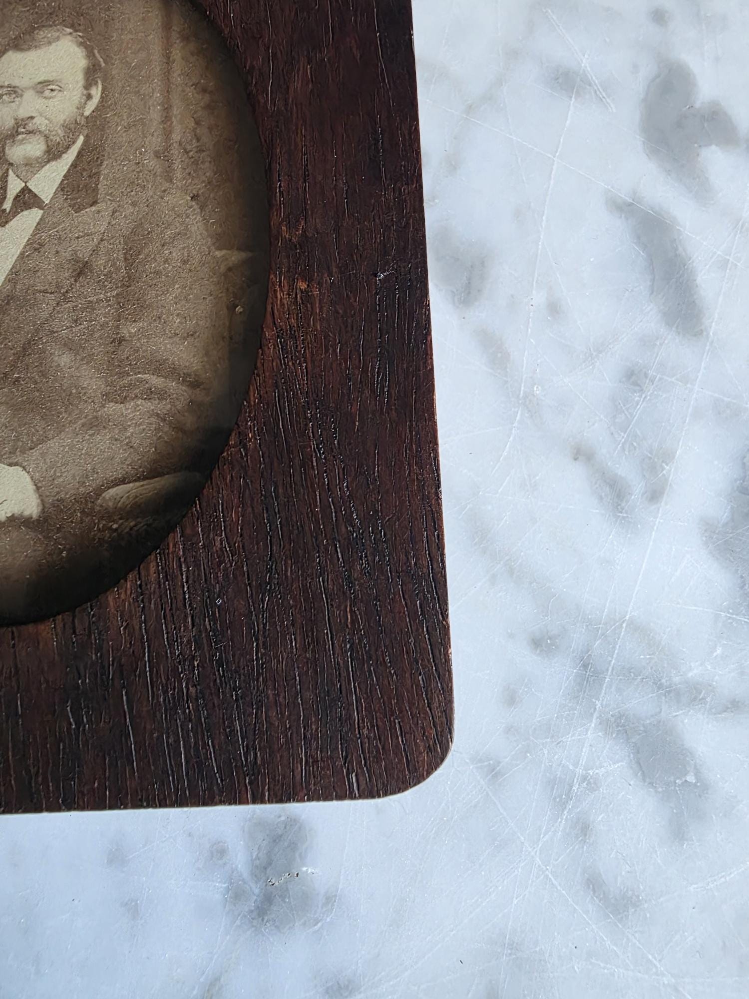This striking antique piece marries a substantial, rustic wooden frame with a distinguished period portrait. The frame itself is unusual and compelling, crafted from a thick block of dark-stained wood, possibly walnut or chestnut, featuring soft, rounded corners and a deep-set oval aperture that creates significant depth. It possesses a rich, time-worn patina with honest signs of age, surface wear, and handling that add tremendously to its historical character. Nestled deep within the recess is a soft sepia-toned photograph of a bearded gentleman dressed in formal late-19th-century attire, his steady gaze captured from another era. The reverse retains its original textured backing paper secured by age-darkened brads, along with a small metal loop for wall hanging. With its robust presence and authentic charm, this framed portrait would make a handsome addition to a library shelf, a curated gallery wall, a vintage-inspired study, or a small, curated vignette.