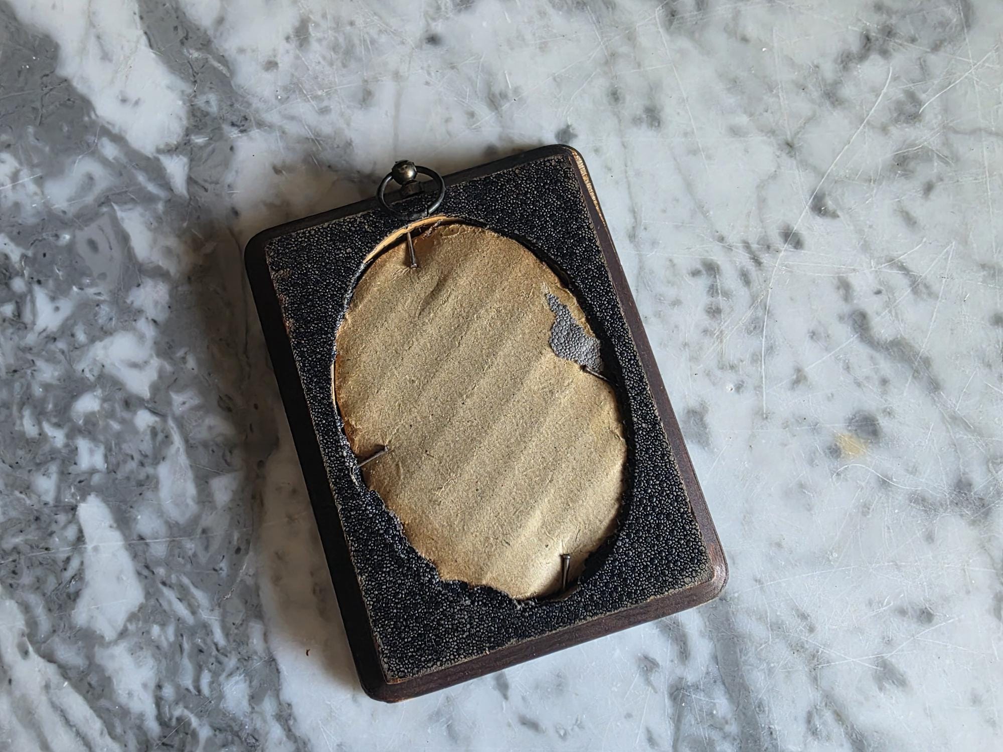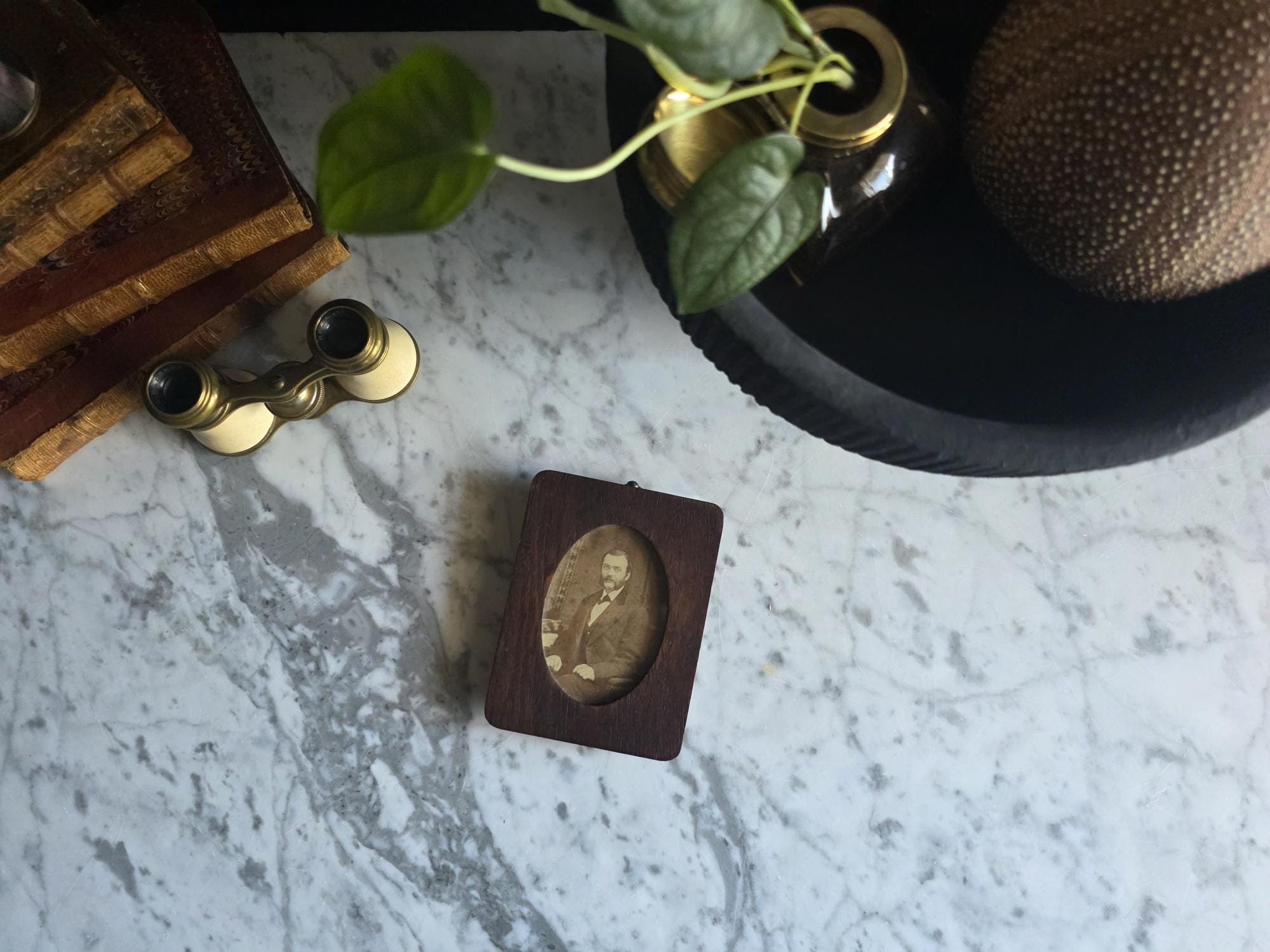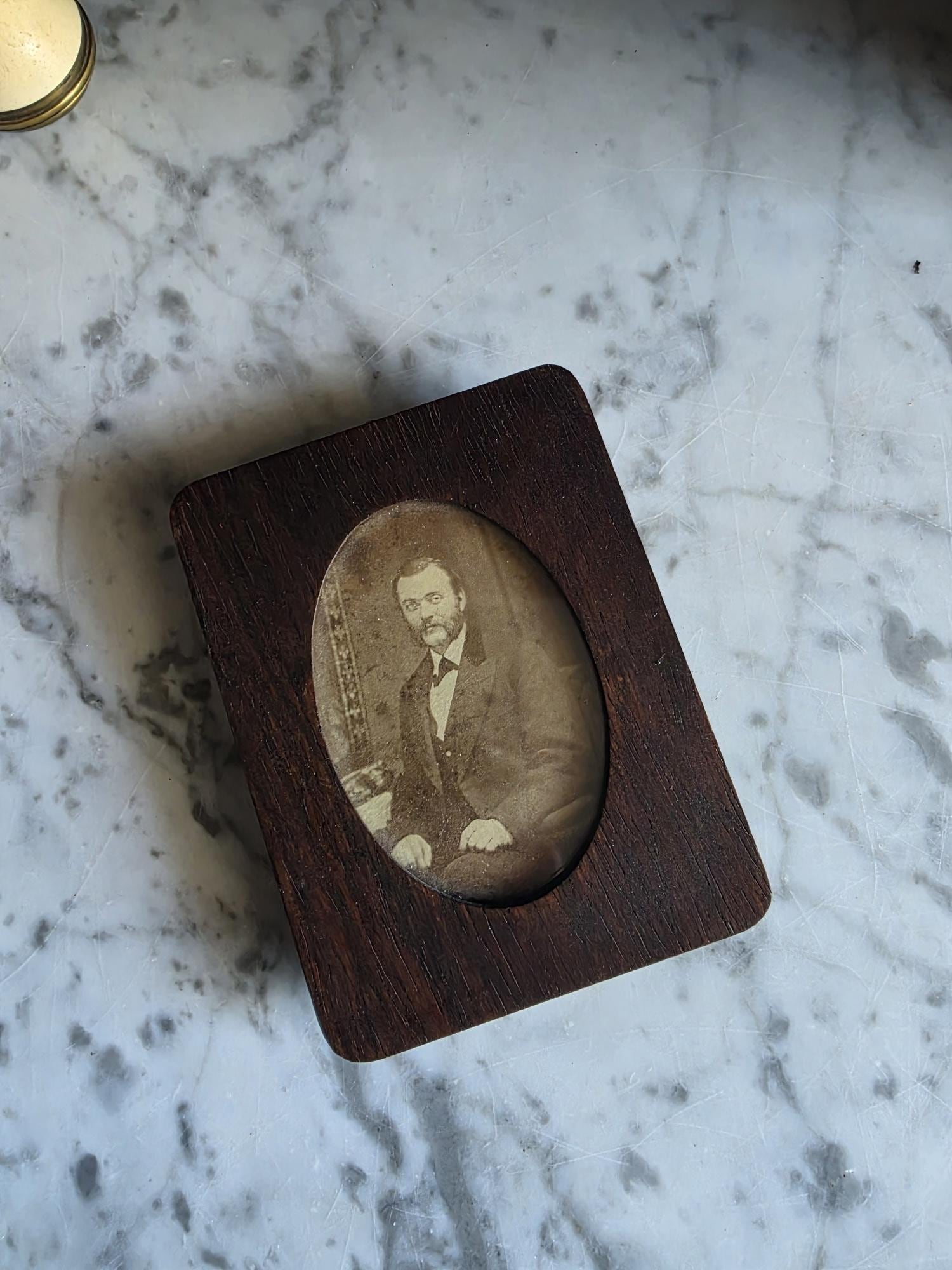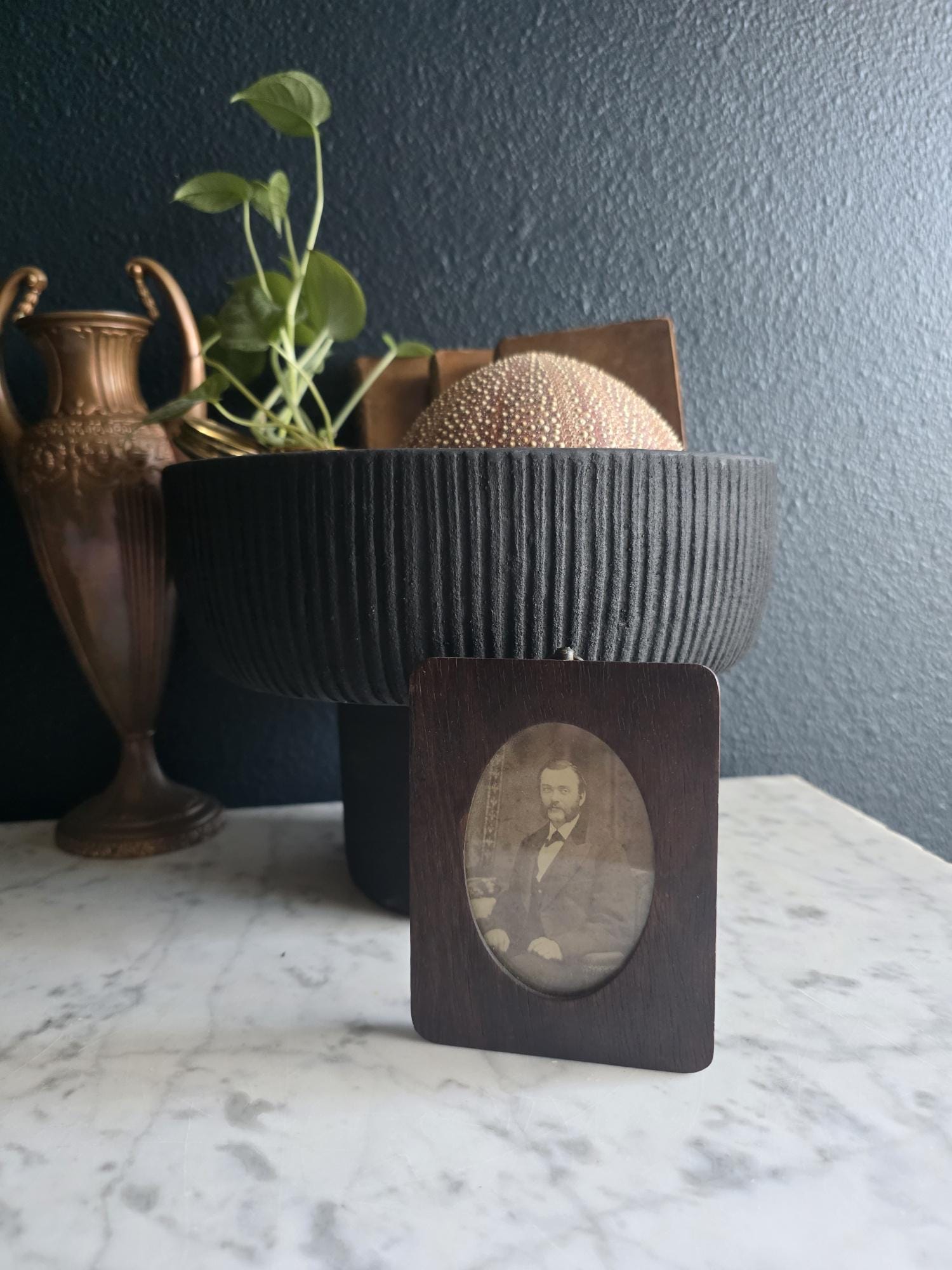 This striking antique piece marries a substantial, rustic wooden frame with a distinguished period portrait. The frame itself is unusual and compelling, crafted from a thick block of dark-stained wood, possibly walnut or chestnut, featuring soft, rounded corners and a deep-set oval aperture that creates significant depth. It possesses a rich, time-worn patina with honest signs of age, surface wear, and handling that add tremendously to its historical character. Nestled deep within the recess is a soft sepia-toned photograph of a bearded gentleman dressed in formal late-19th-century attire, his steady gaze captured from another era. The reverse retains its original textured backing paper secured by age-darkened brads, along with a small metal loop for wall hanging. With its robust presence and authentic charm, this framed portrait would make a handsome addition to a library shelf, a curated gallery wall, a vintage-inspired study, or a small, curated vignette.