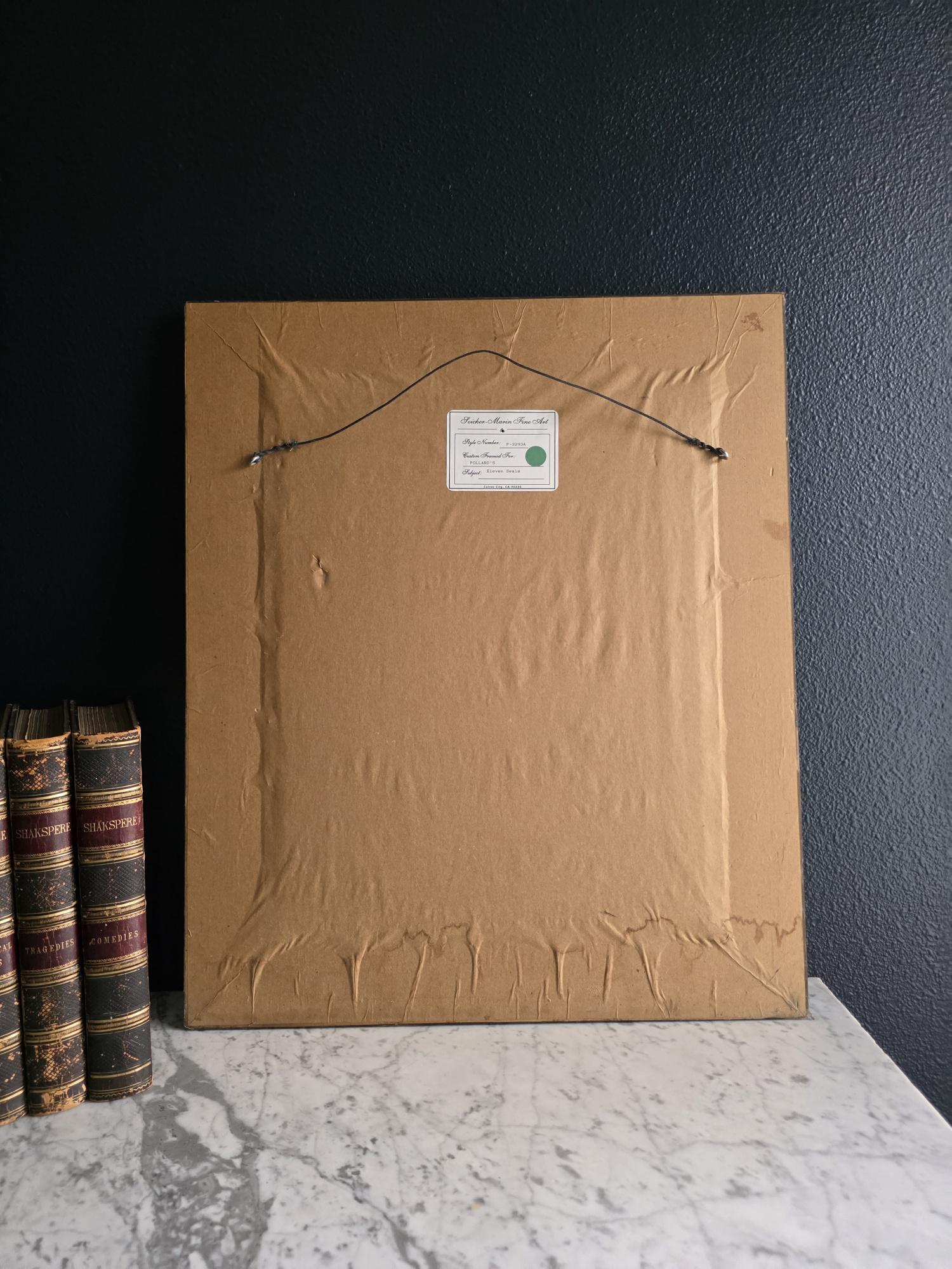 This piece remains in very good vintage condition and carries a prestigious pedigree, featuring the original Soicher-Marin Fine Art label on the reverse, which identifies it as a custom-framed work titled "Eleven Seals" (Style P-3293A). While the frame shows significant surface scuffs and character-building wear consistent with its age, the structural integrity and visual impact remain excellent. Measuring as a prominent statement piece, this framed set serves as a stately focal point, perfect for adding a sense of history and intellectual curiosity to a library, study, or gallery wall. When up close to the glass fibers from the textile backing have clung to the inside of the glass. Only noticeable upon close inspection, not noticeable when hung for display.