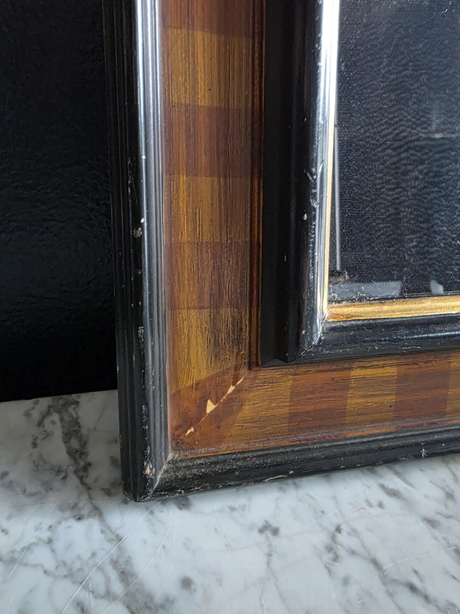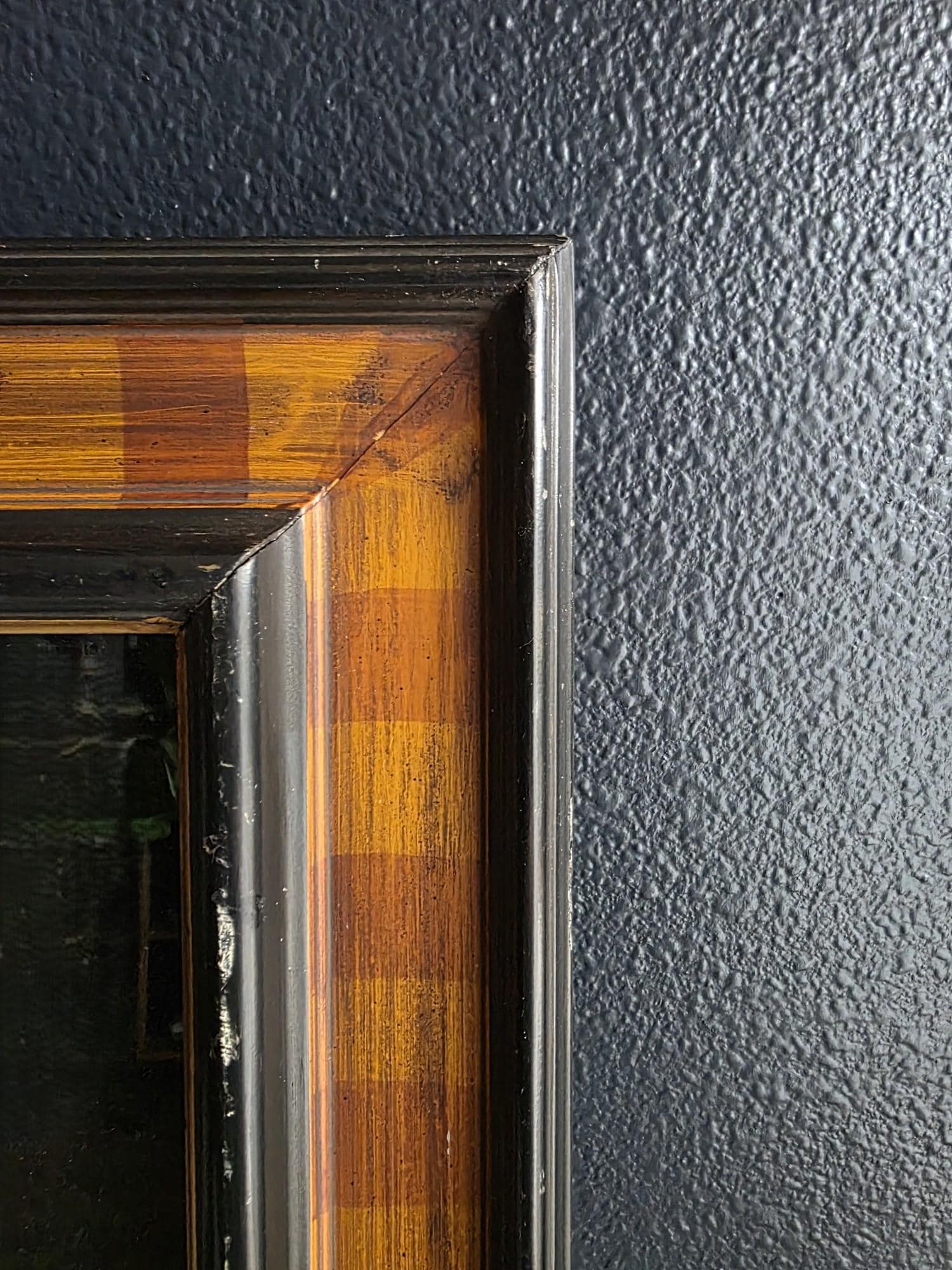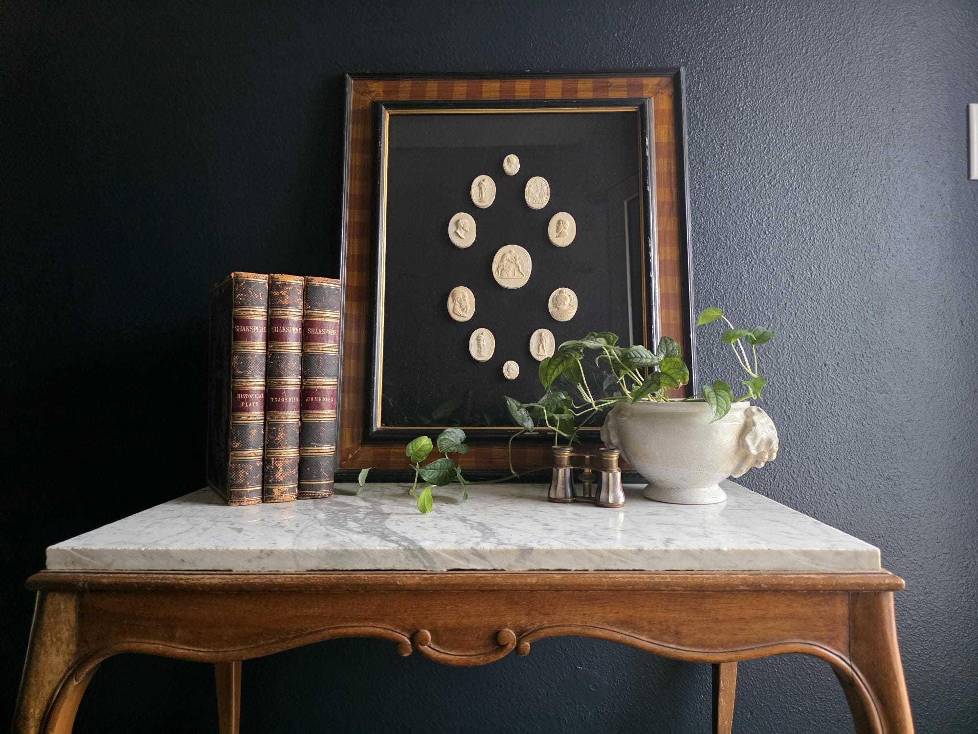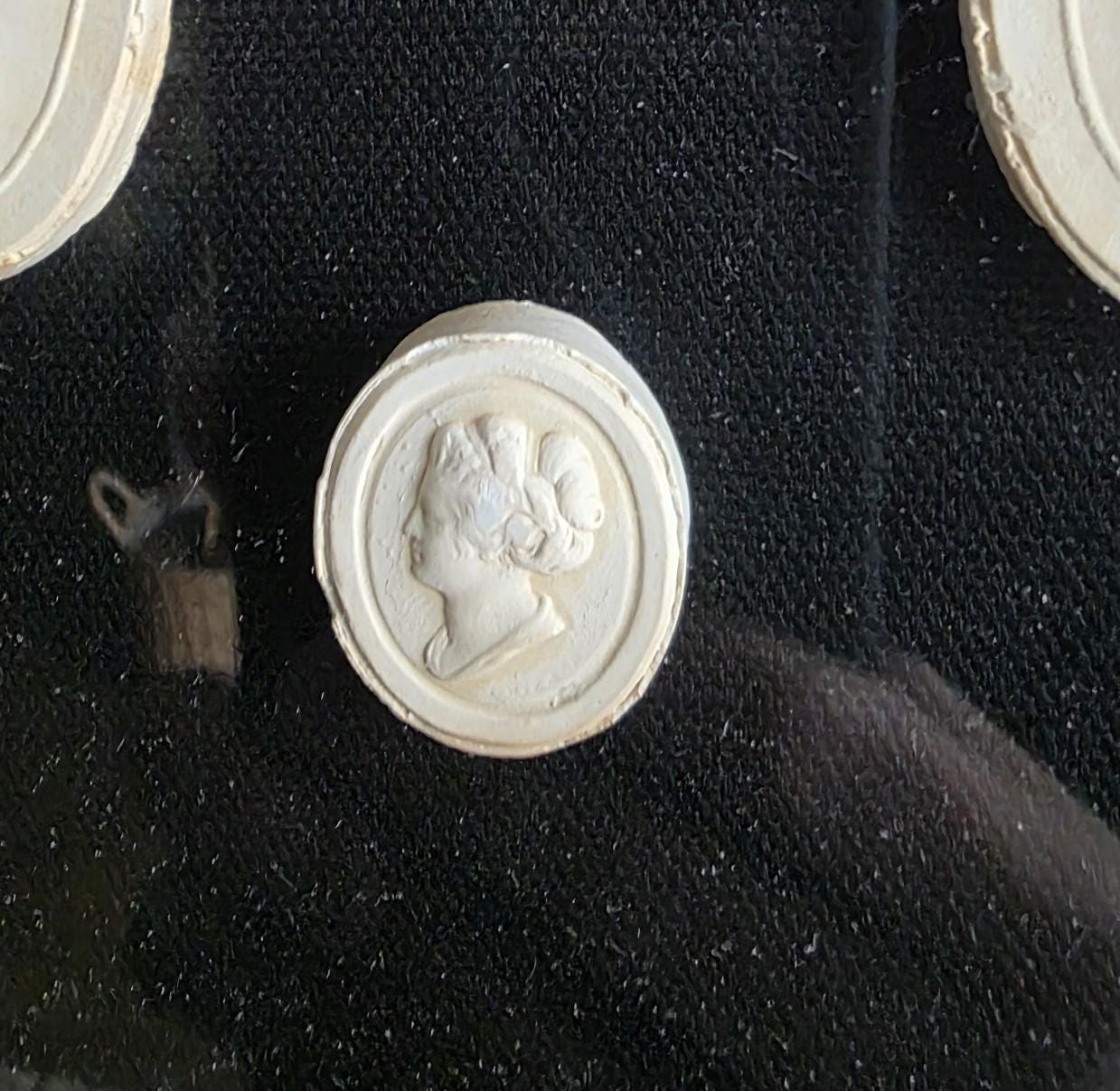 Elevate your interior with this sophisticated vintage shadowbox collection of eleven Vintage Reproduction Grand Tour Intaglio seals, a refined nod to the classic 19th-century European academic tradition. These meticulously detailed cream-colored medallions are artfully mounted against a stark black background, highlighting a diverse array of neoclassical scenes, mythological figures, and noble profiles in crisp relief. Each intaglio bear signs of wear, discoloration and general age. The collection is housed in a substantial, high-quality wood frame featuring a striking faux-bois striped pattern in warm amber and mahogany tones, further enhanced by a delicate gold-leaf inner fillet that adds a touch of brightness to the display.