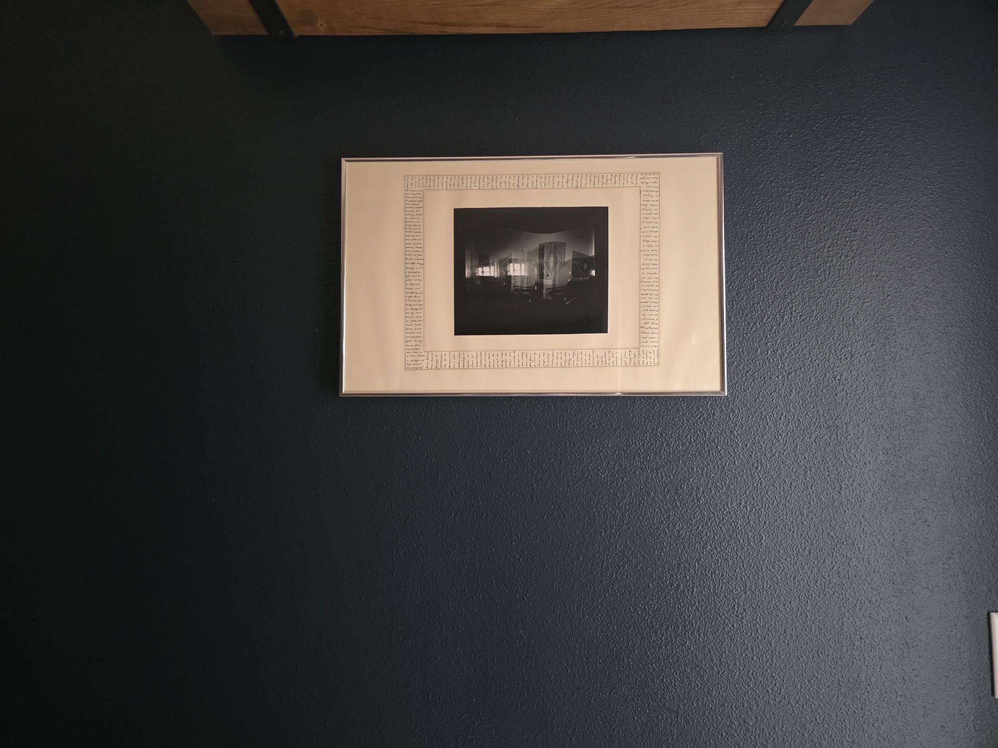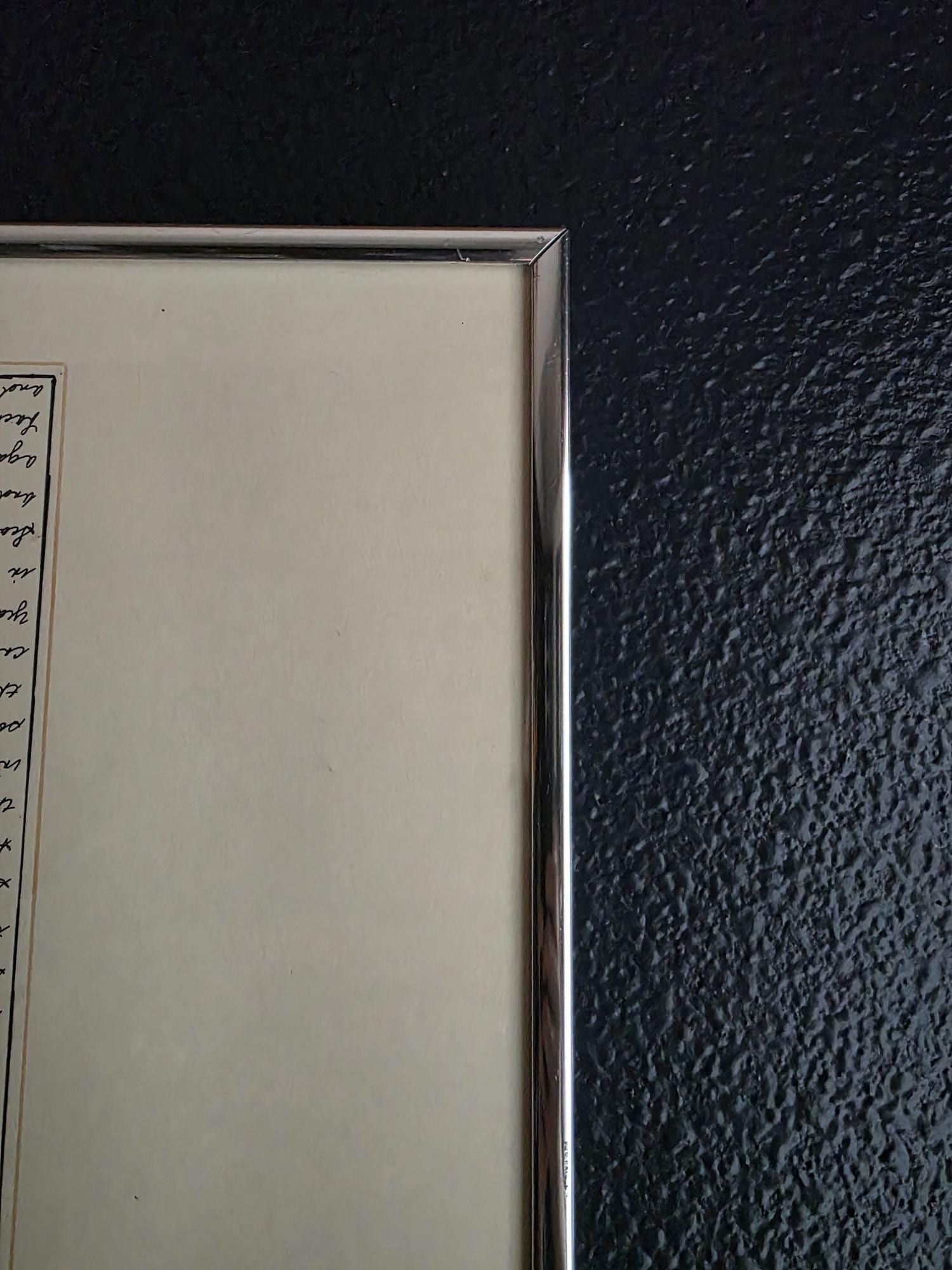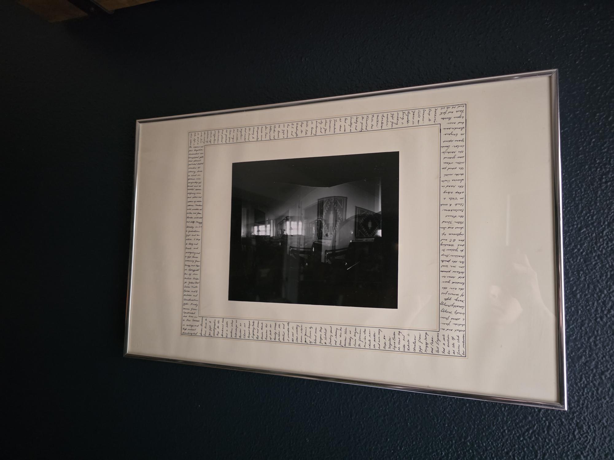 The photograph is uniquely presented within a wide, cream-colored mat that features extensive hand-written calligraphy bordering the image. This meticulous script appears to be a personal narrative or a series of observational notes, adding an intimate, diary-like dimension to the artwork and bridging the gap between visual imagery and storytelling. Housed in a minimalist silver-toned metal frame that epitomizes the aesthetic of its era, this piece is a sophisticated example of narrative photography. It would serve as a poignant focal point in a curated collection or a mid-century modern interior, offering both visual depth and a sense of historical mystery.
