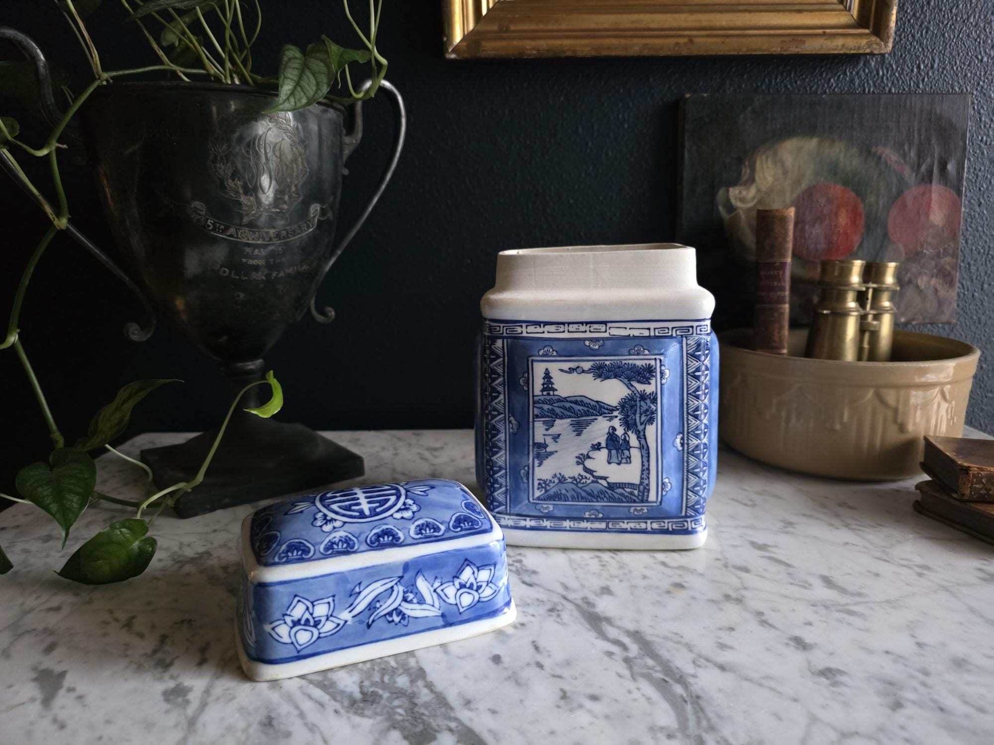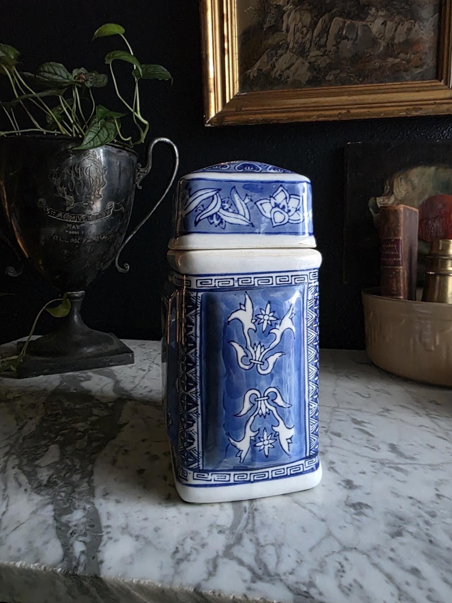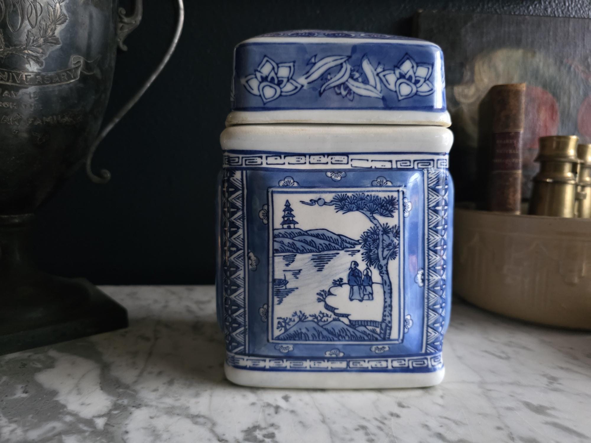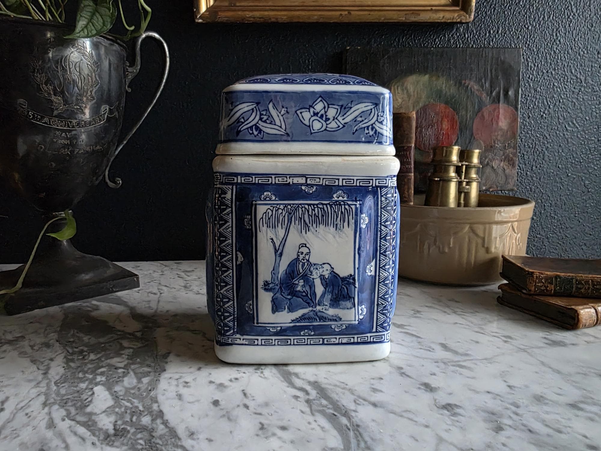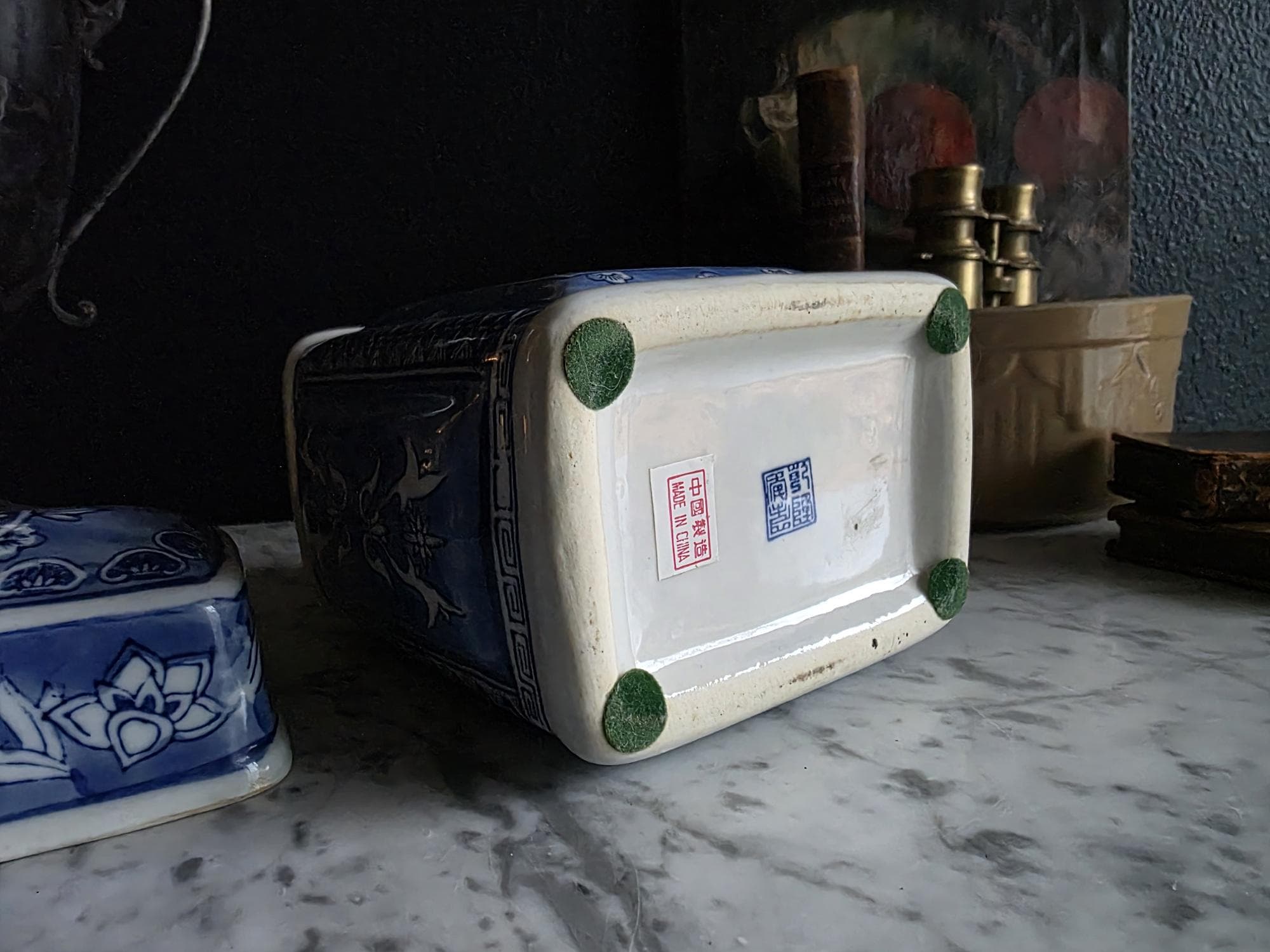 The container’s substantial, weighted feel and vibrant glaze make it a standout decorative piece for a mantel, bookshelf, or curated vignette. Its underside bears a blue underglaze four-character mark alongside a vintage "Made in China" sticker, indicative of mid-20th-century craftsmanship. Measuring with a clean, squared silhouette and finished with protective felt pads on the base, this porcelain jar is in excellent vintage condition, ready to serve as a functional storage piece or a sophisticated accent in a classic or grandmillennial-style home.