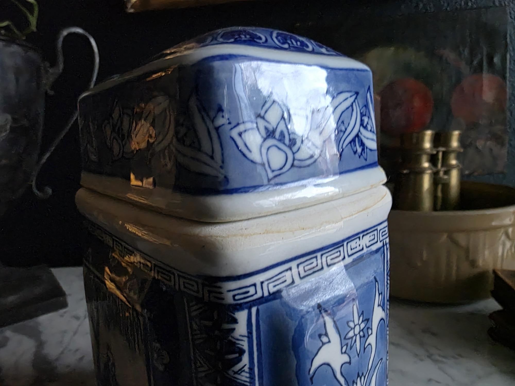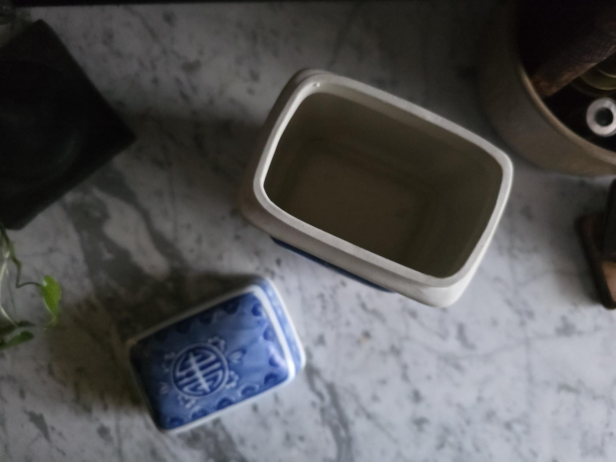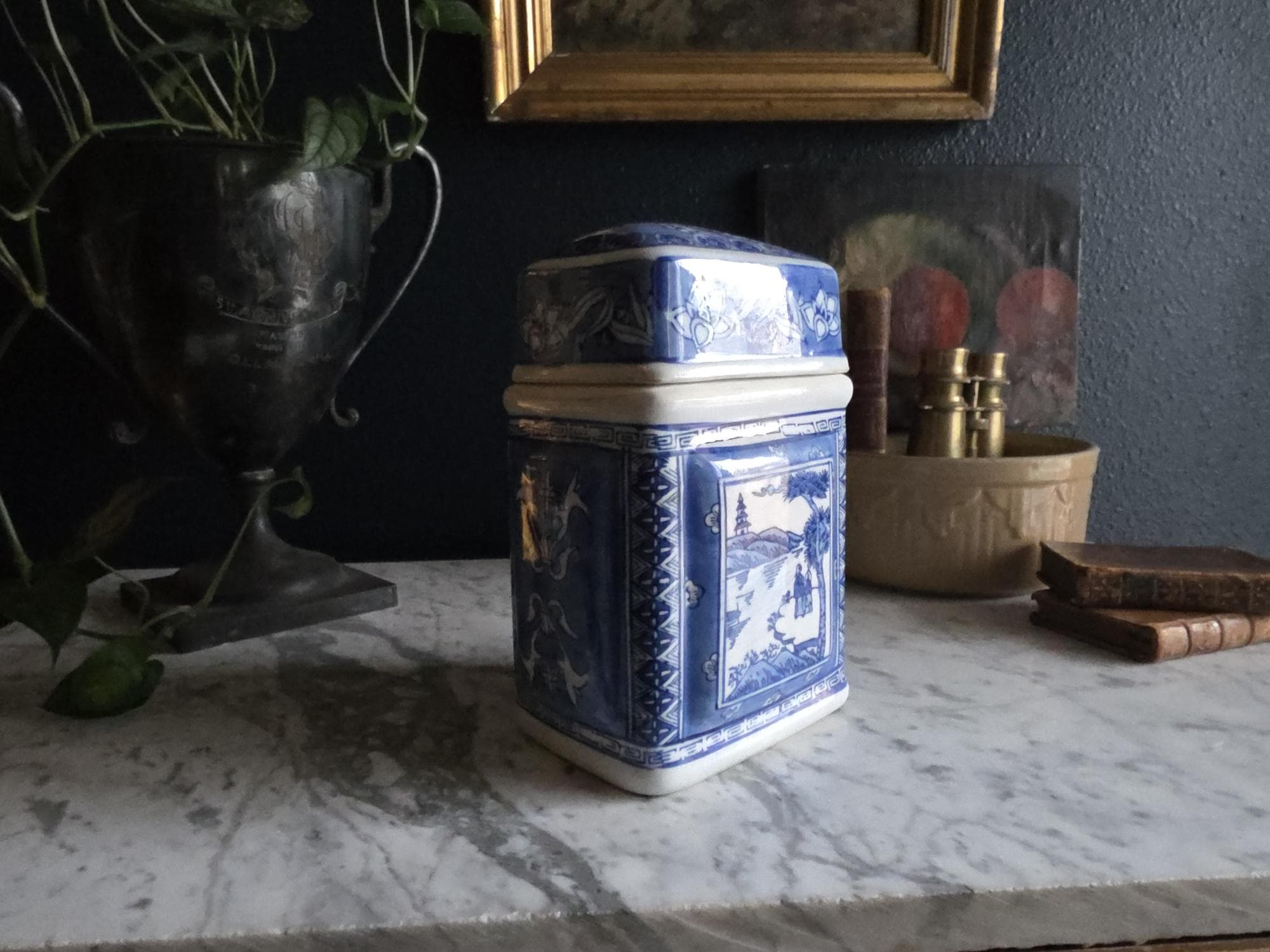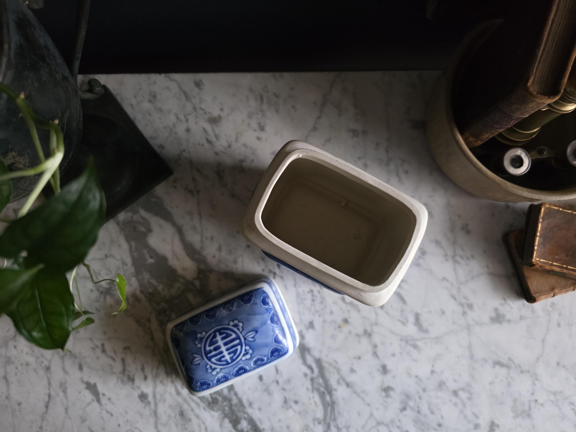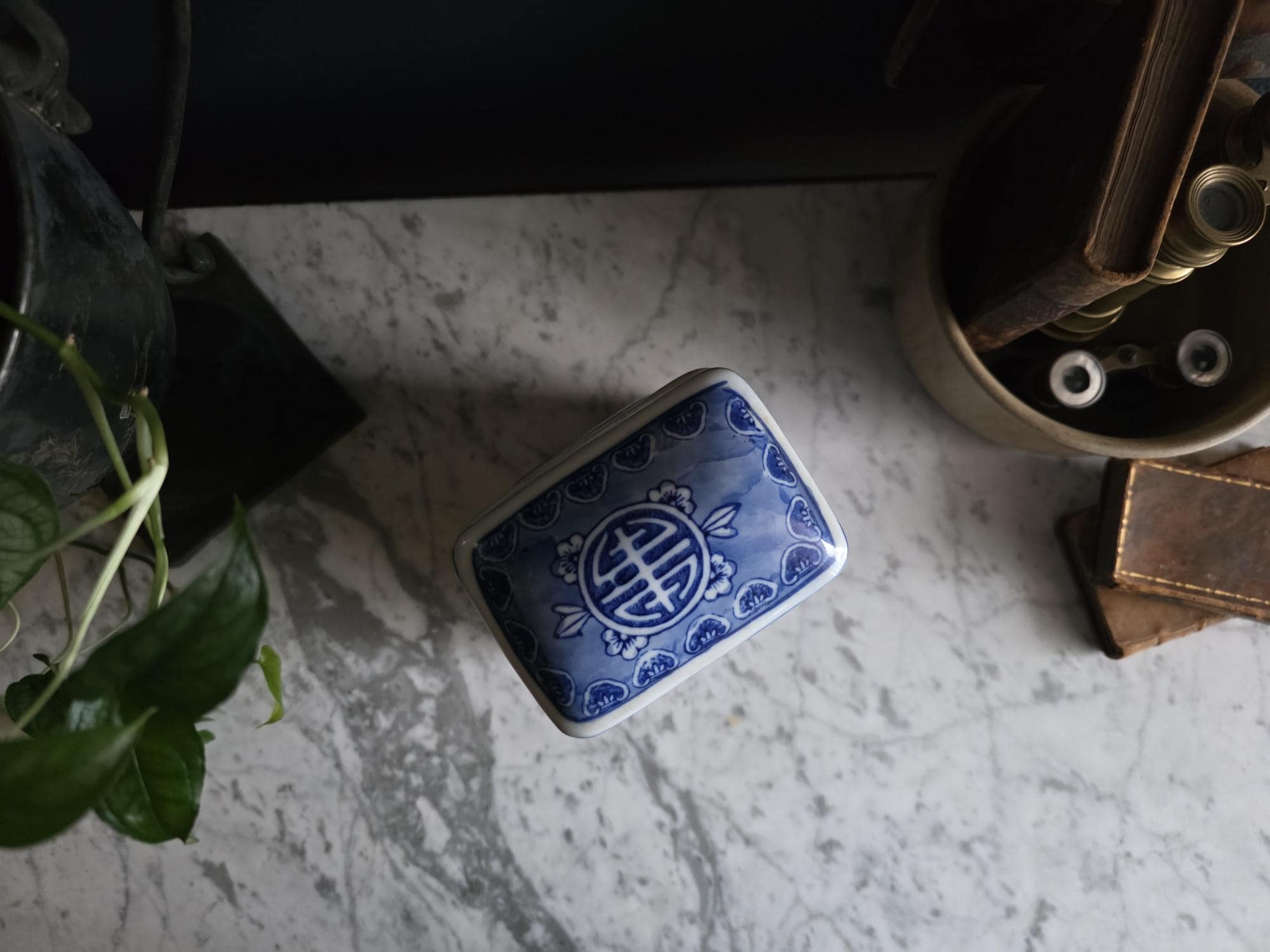 The container’s substantial, weighted feel and vibrant glaze make it a standout decorative piece for a mantel, bookshelf, or curated vignette. Its underside bears a blue underglaze four-character mark alongside a vintage "Made in China" sticker, indicative of mid-20th-century craftsmanship. Measuring with a clean, squared silhouette and finished with protective felt pads on the base, this porcelain jar is in excellent vintage condition, ready to serve as a functional storage piece or a sophisticated accent in a classic or grandmillennial-style home.