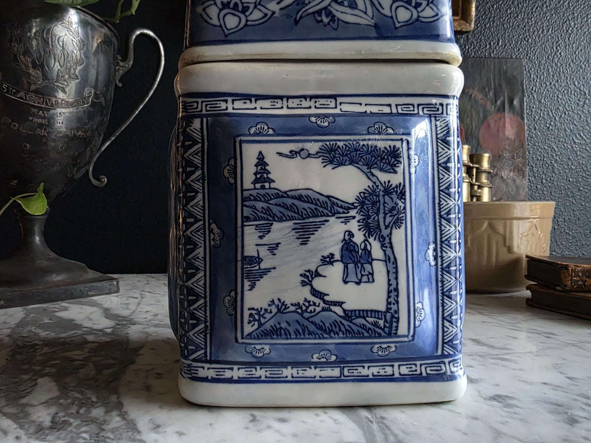 This exquisite Chinese blue and white porcelain tea caddy or ginger jar offers a timeless aesthetic, blending traditional artistry with a classic rectangular form. The vessel features hand-painted cobalt blue scenes on each of its four inset panels, depicting serene landscapes with scholars, pagodas, and lush willow trees. These vignettes are framed by intricate geometric borders and floral scrolling, while the domed, fitted lid is adorned with a central "Double Happiness" symbol—a traditional motif representing joy and good fortune—complemented by delicate lotus blossoms.