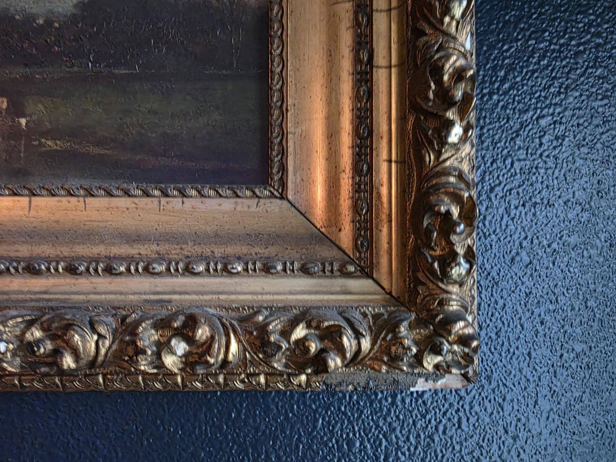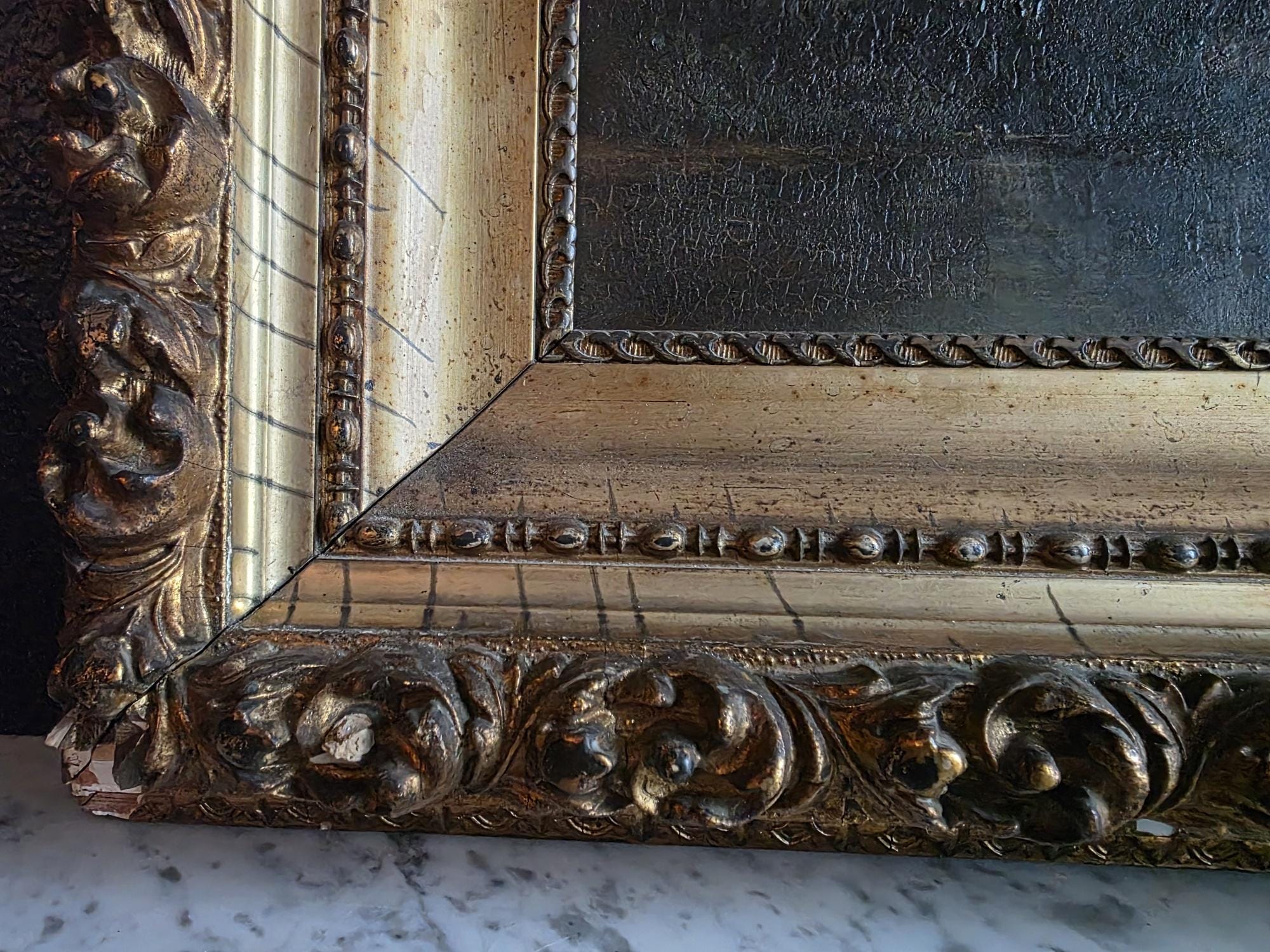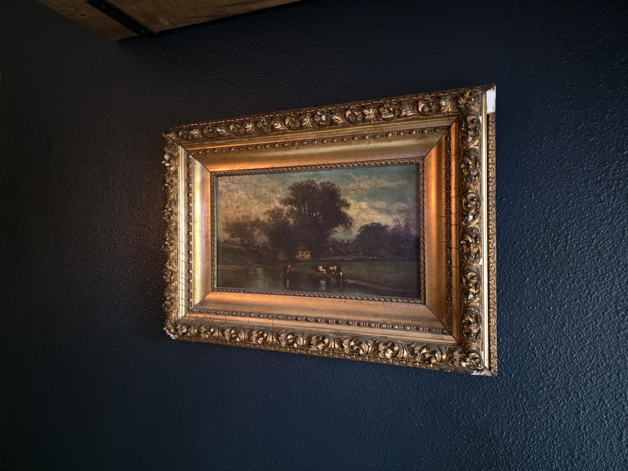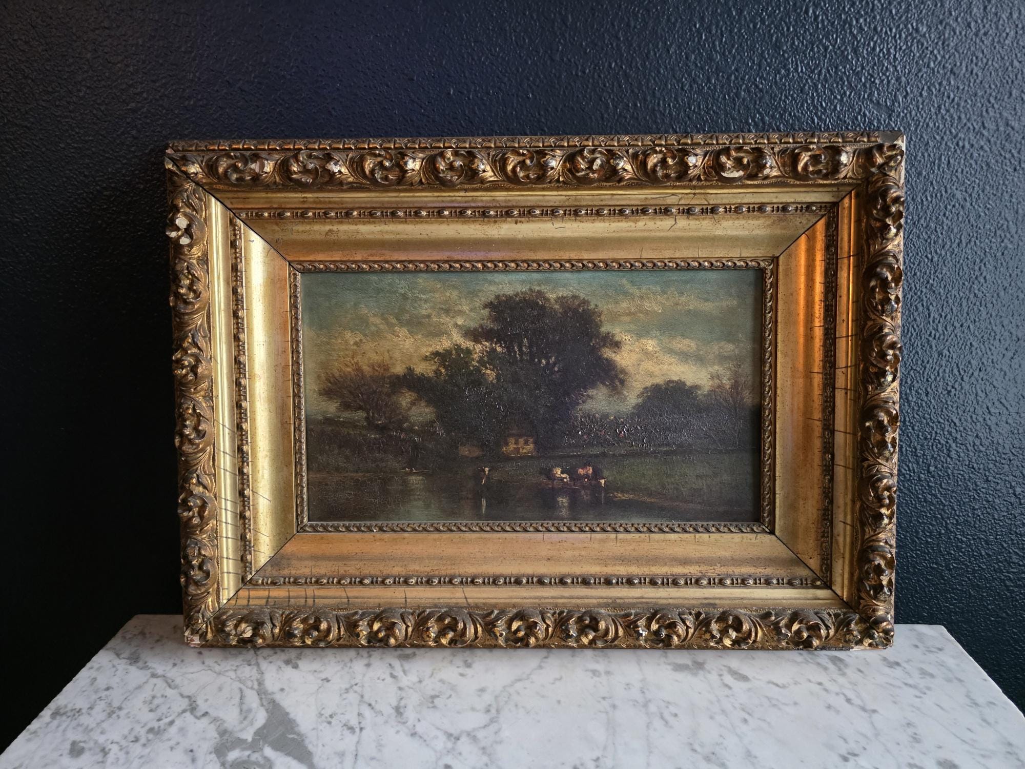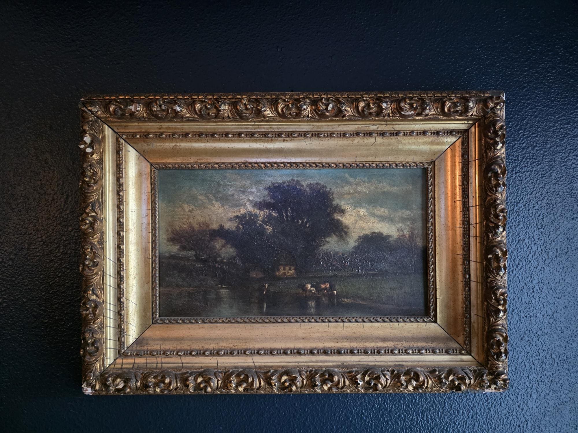 The painting is unsigned and housed in its original, heavy gilt wood and gesso frame, which features ornate scrolled corner ornaments and a classic beaded liner. While the artwork itself remains in good antique condition with a notable craquelure that adds to its charm, the frame shows its age through several chips and losses to the gesso, particularly at the corners and edges, revealing the white substrate beneath. These imperfections lend the piece a mature aesthetic, making it a perfect statement piece for those who appreciate the weathered beauty of true period antiques.