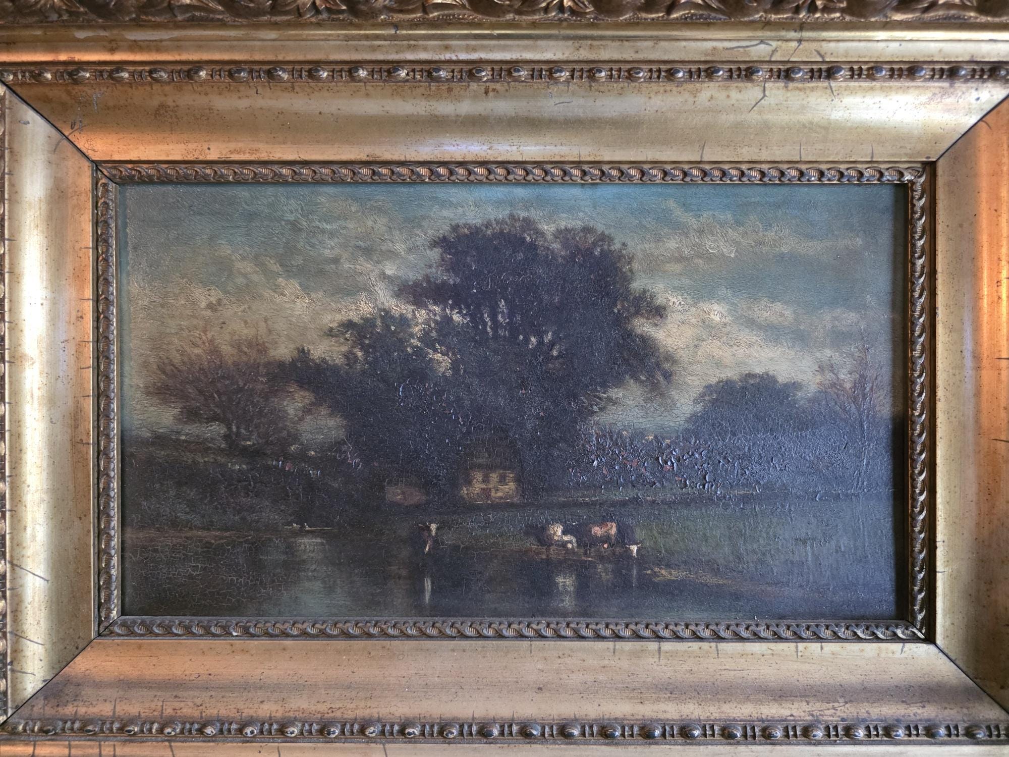 This striking antique pastoral landscape captures the tranquil essence of 19th-century rural life, rendered in oil on wooden board. The composition features a moody, atmospheric sky looming over a cluster of mature trees and a humble cottage, with cattle watering at a pond in the foreground—a classic hallmark of European pastoral art. The artist utilizes a rich, dark palette with textured brushwork that gives the scene a sense of depth and historical character. The reverse of the board shows authentic age, including hand-cut nails and a faint, hand-written inventory number, suggesting a significant domestic history.