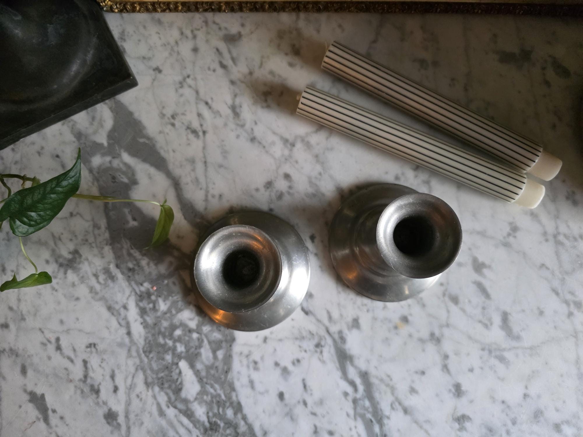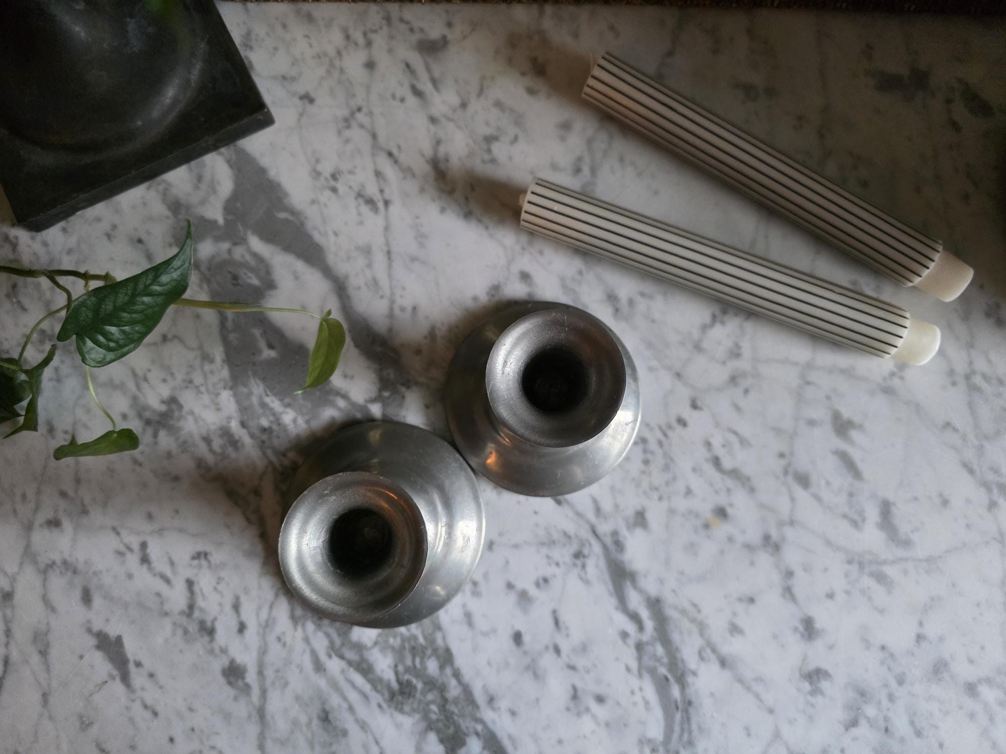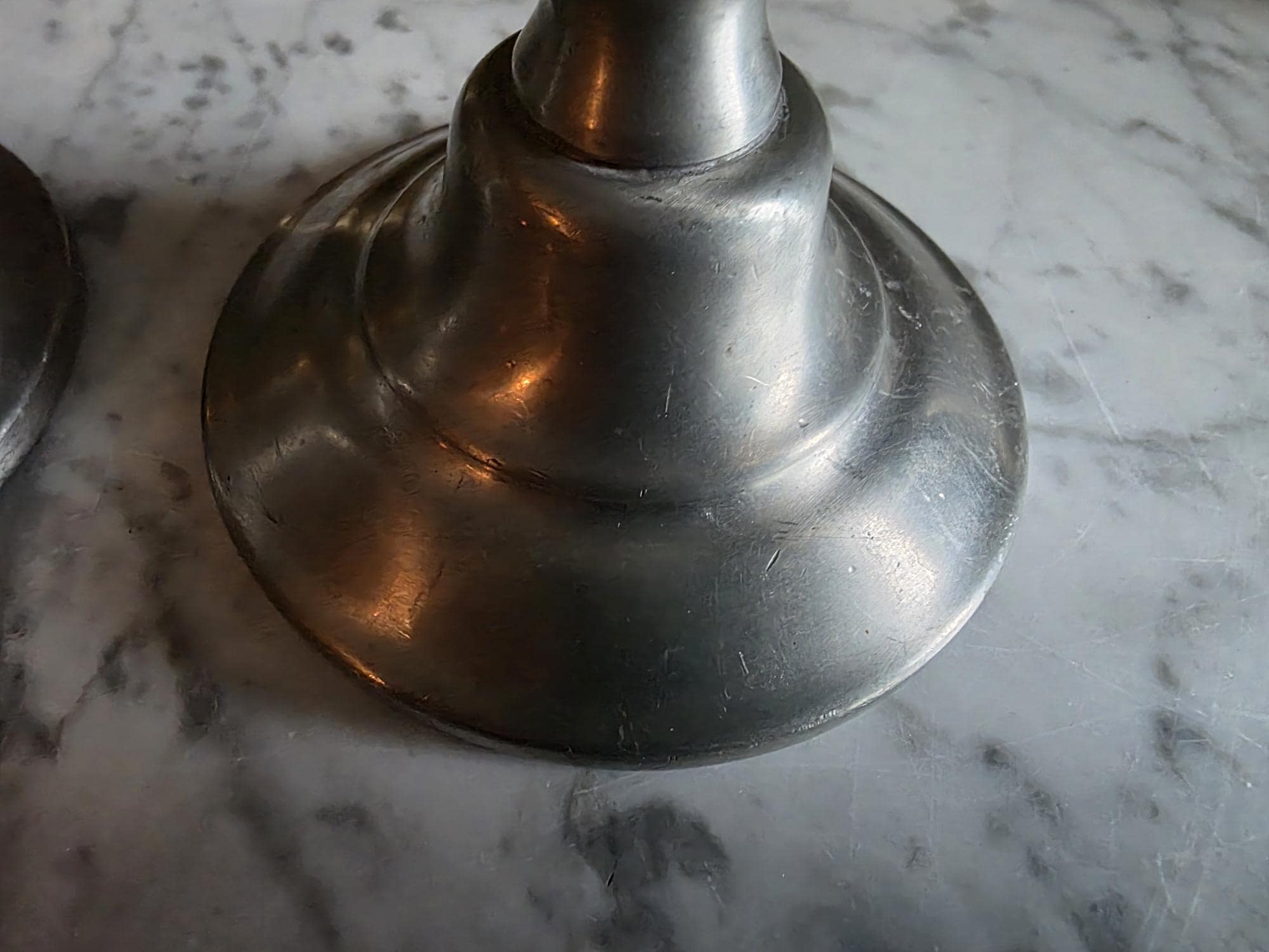 These pieces are being offered in well-loved vintage condition, showing a heavy, authentic patina consistent with decades of use. There is significant surface wear throughout, including visible scratching, scuffs, and small indentations on the metal, as well as remnants of wax in the cups. These imperfections lend the set a soulful, weathered character. Whether used to add a touch of historical charm to a dining table or styled on a mantel, these durable holders are a testament to mid-century craftsmanship.