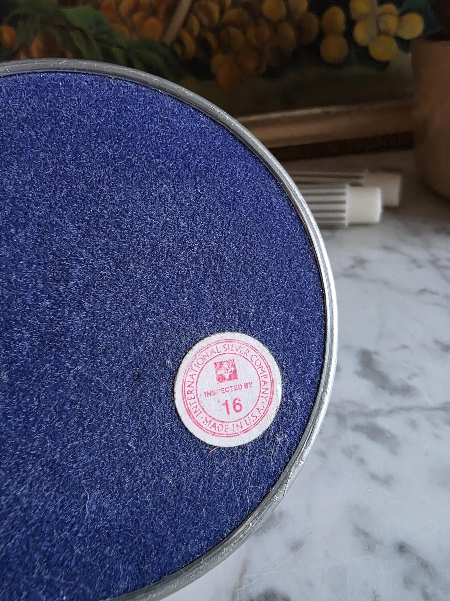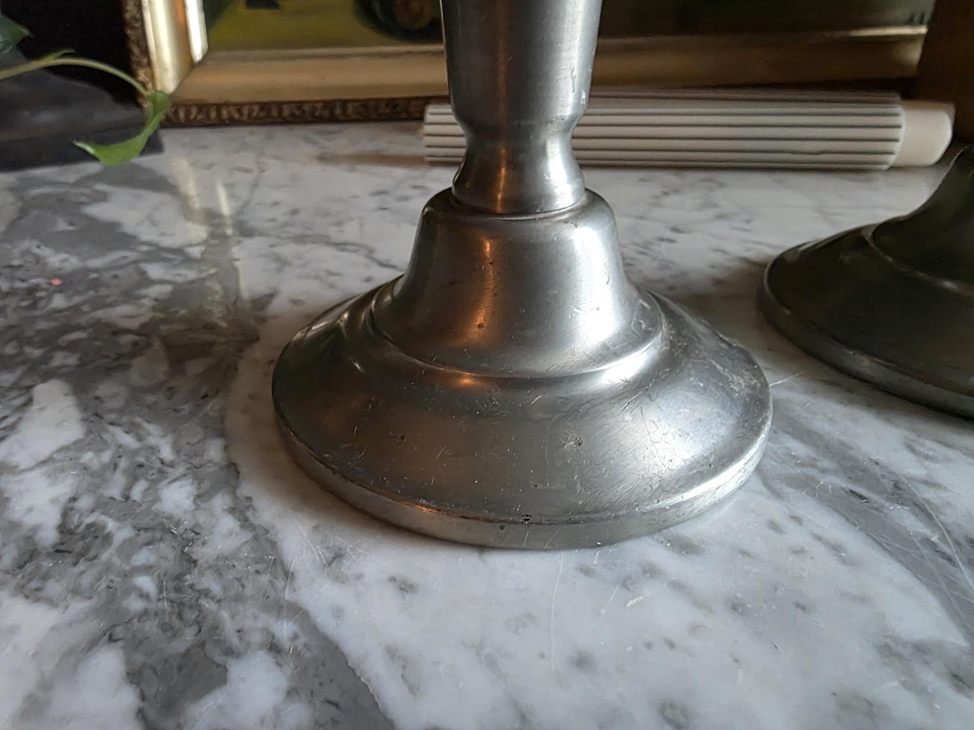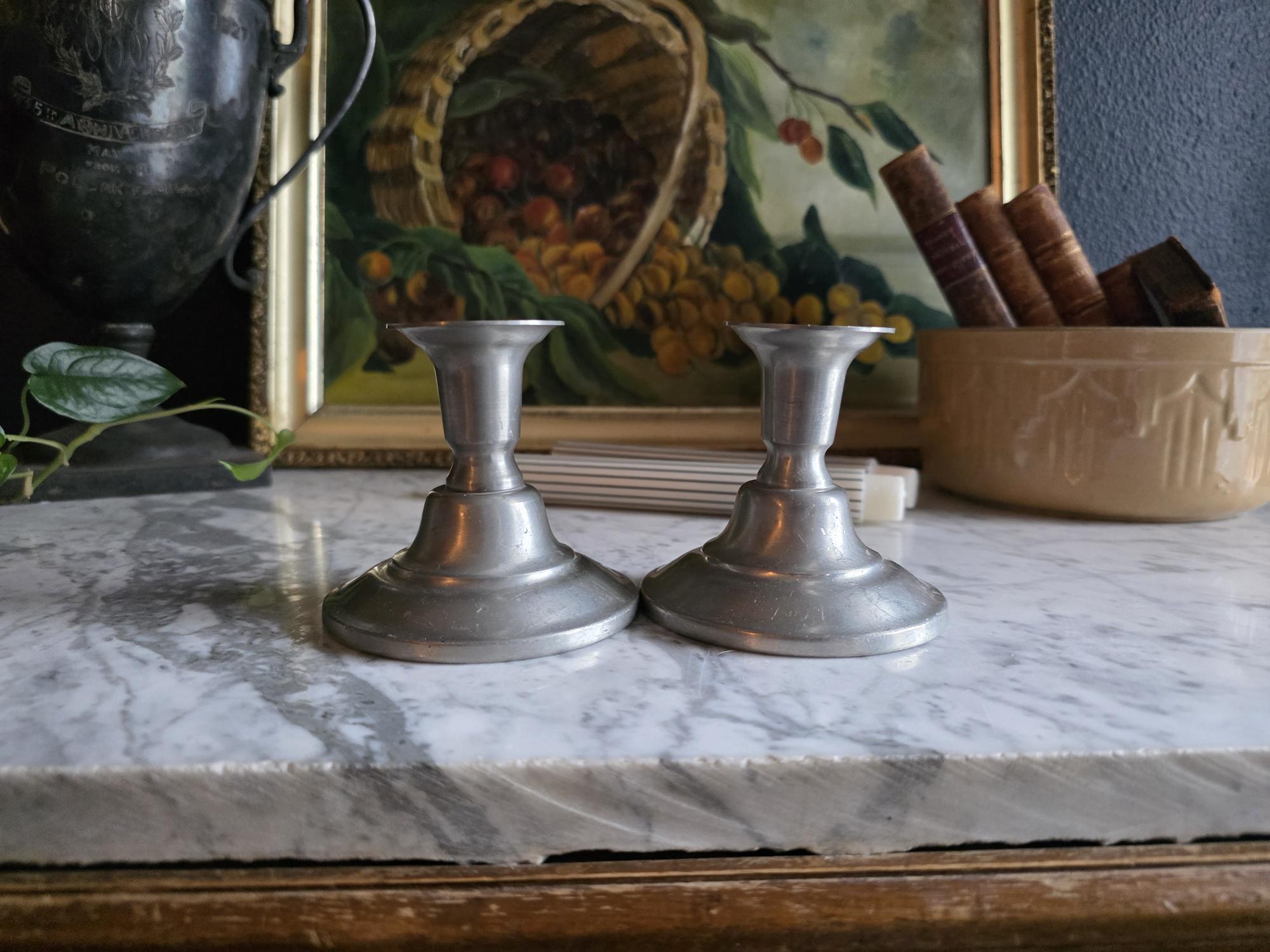 This pair of vintage pewter-finish candle holders from the International Silver Company offers a classic, understated silhouette that complements a variety of decor styles, from traditional to primitive. These weighted metal holders feature a broad, stable base and a flared rim, designed to securely hold standard taper candles. The undersides retain their original blue felt protective pads and vintage paper inspection labels, confirming their origin as authentic mid-century American-made housewares.