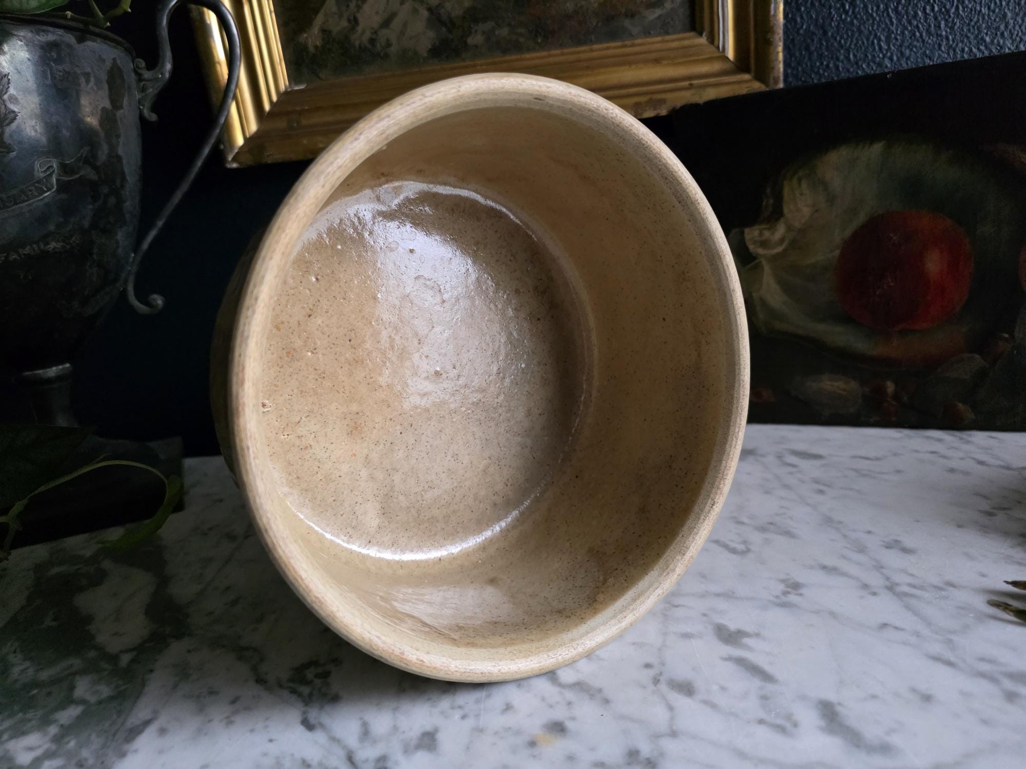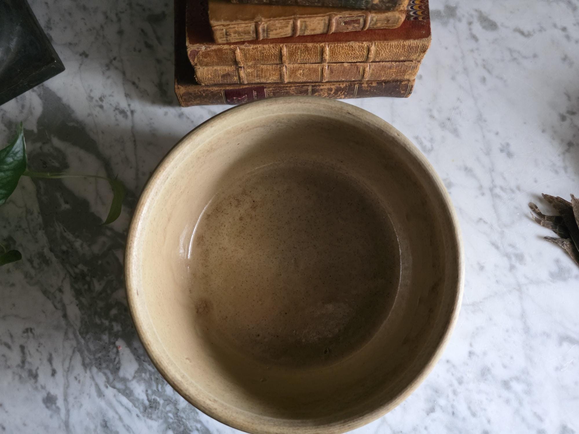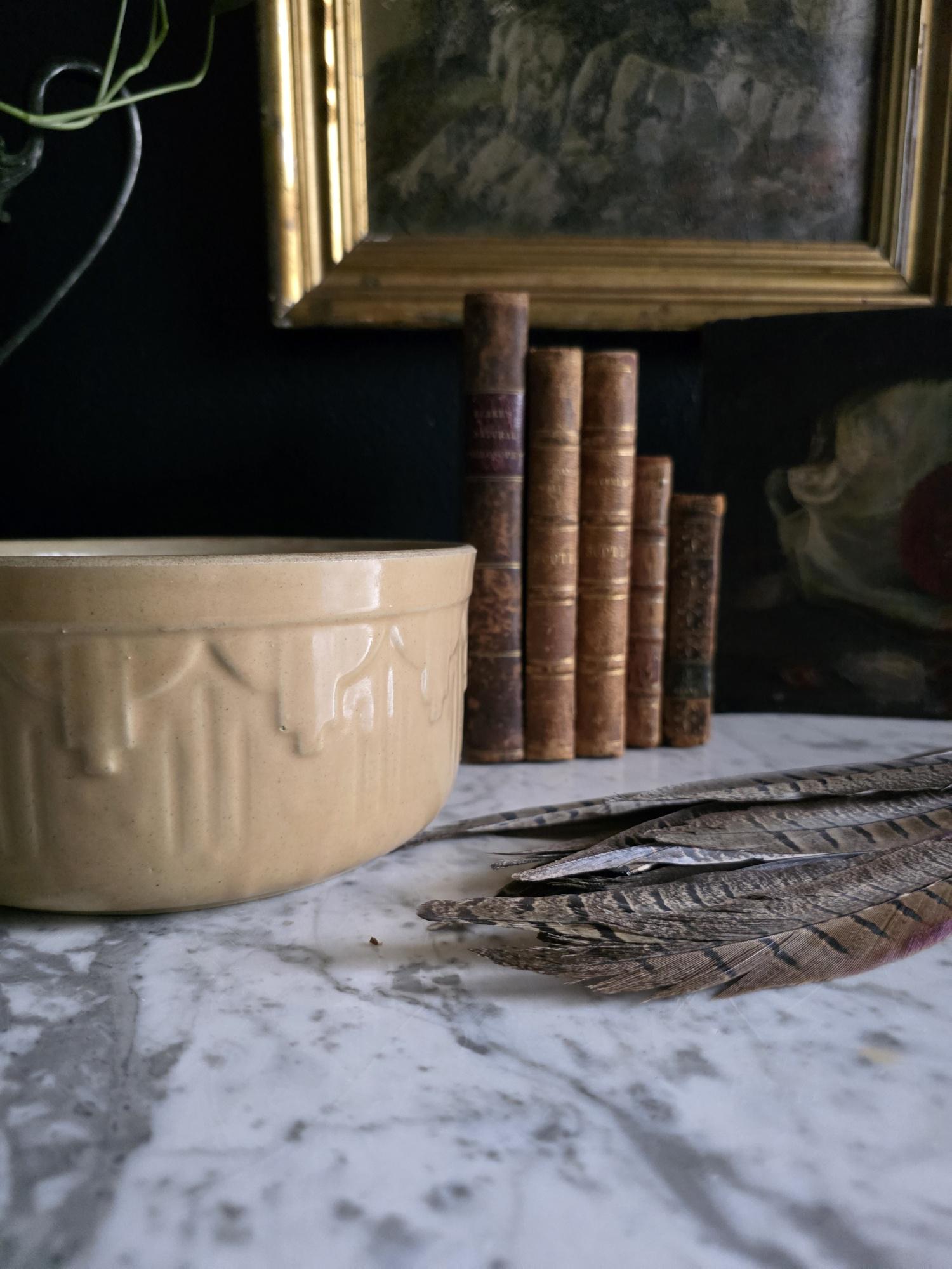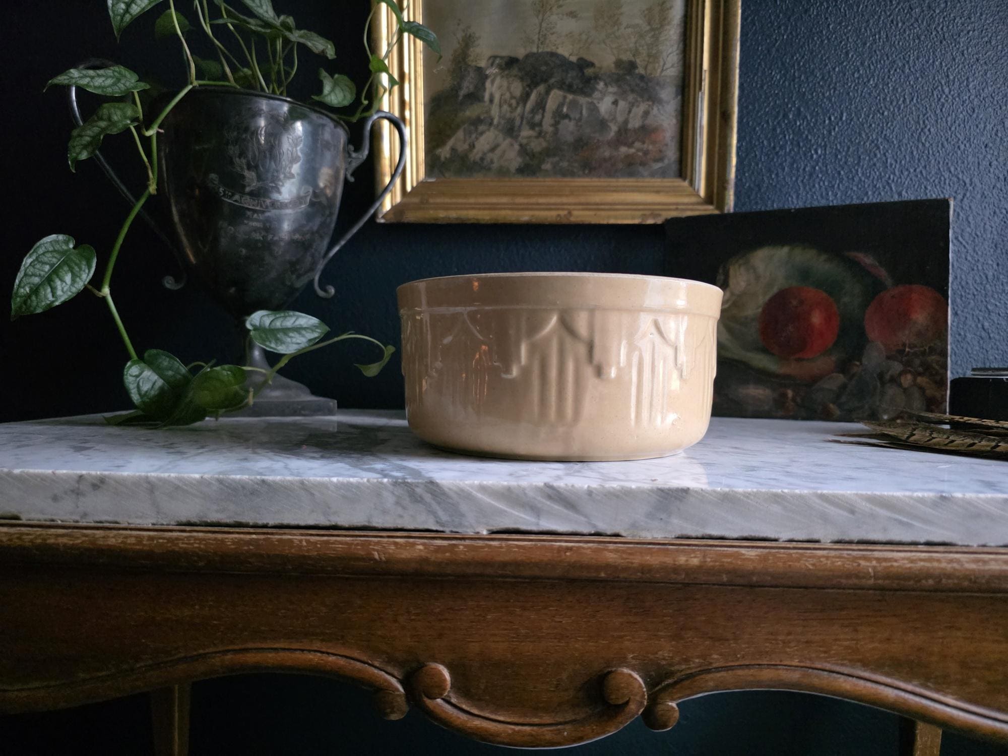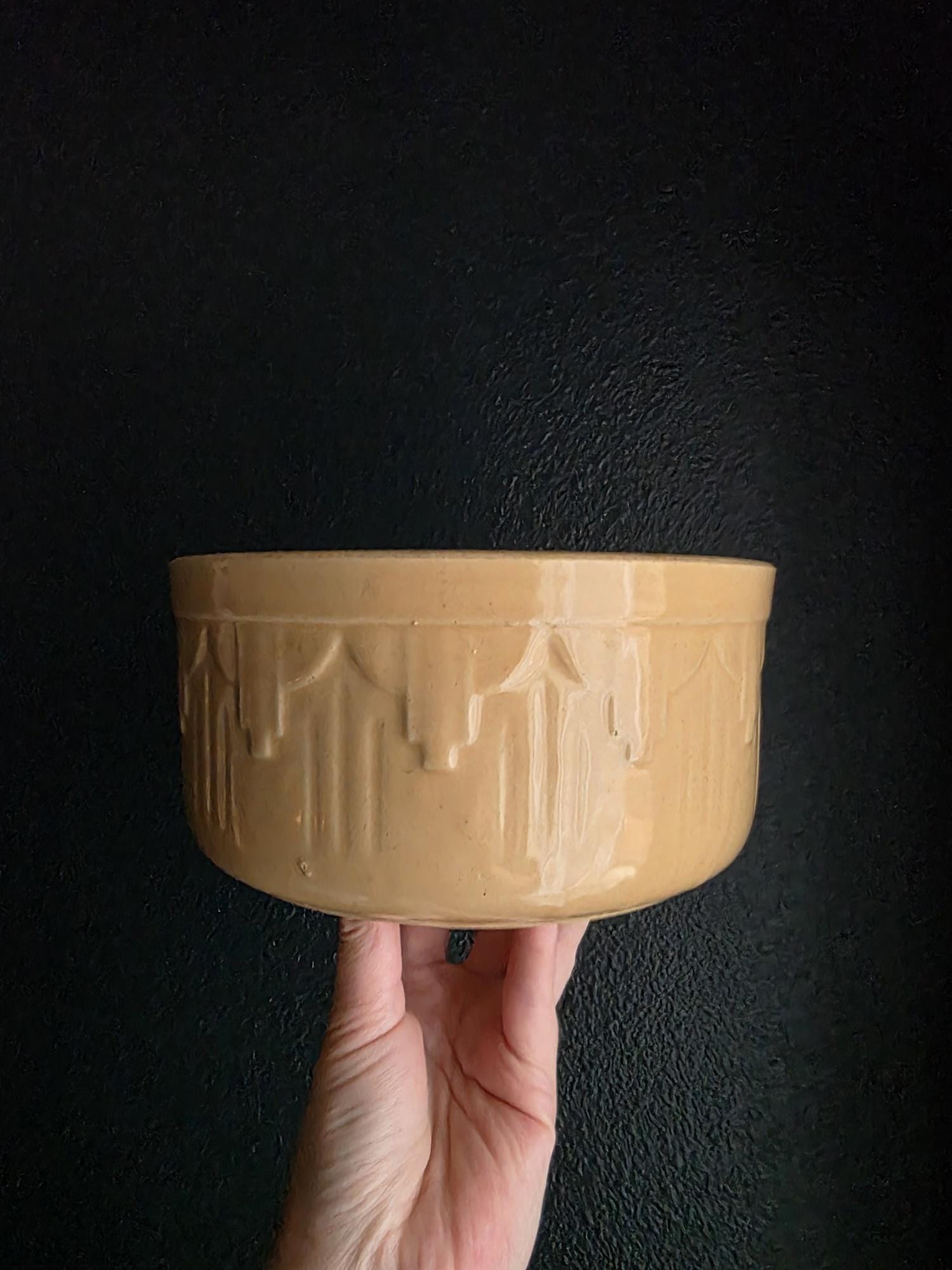 While this yellowware mixing bowl is a classic of American utility, its art deco influence is what makes it a standout piece for collectors. The geometric "paneled" or "curtain" design on the exterior is a signature hallmark of the Art Deco movement, which favored clean, vertical lines and symmetrical repeating patterns over the ornate flourishes of earlier eras.